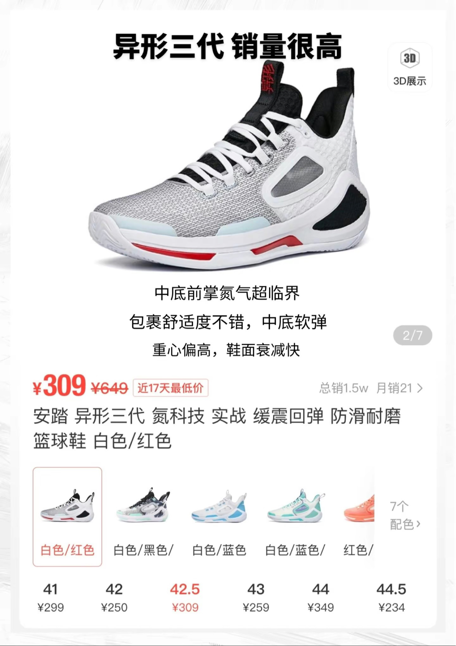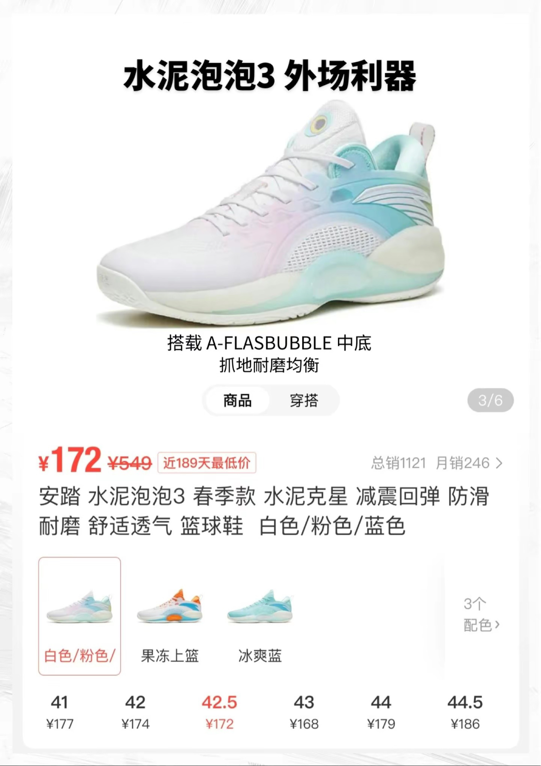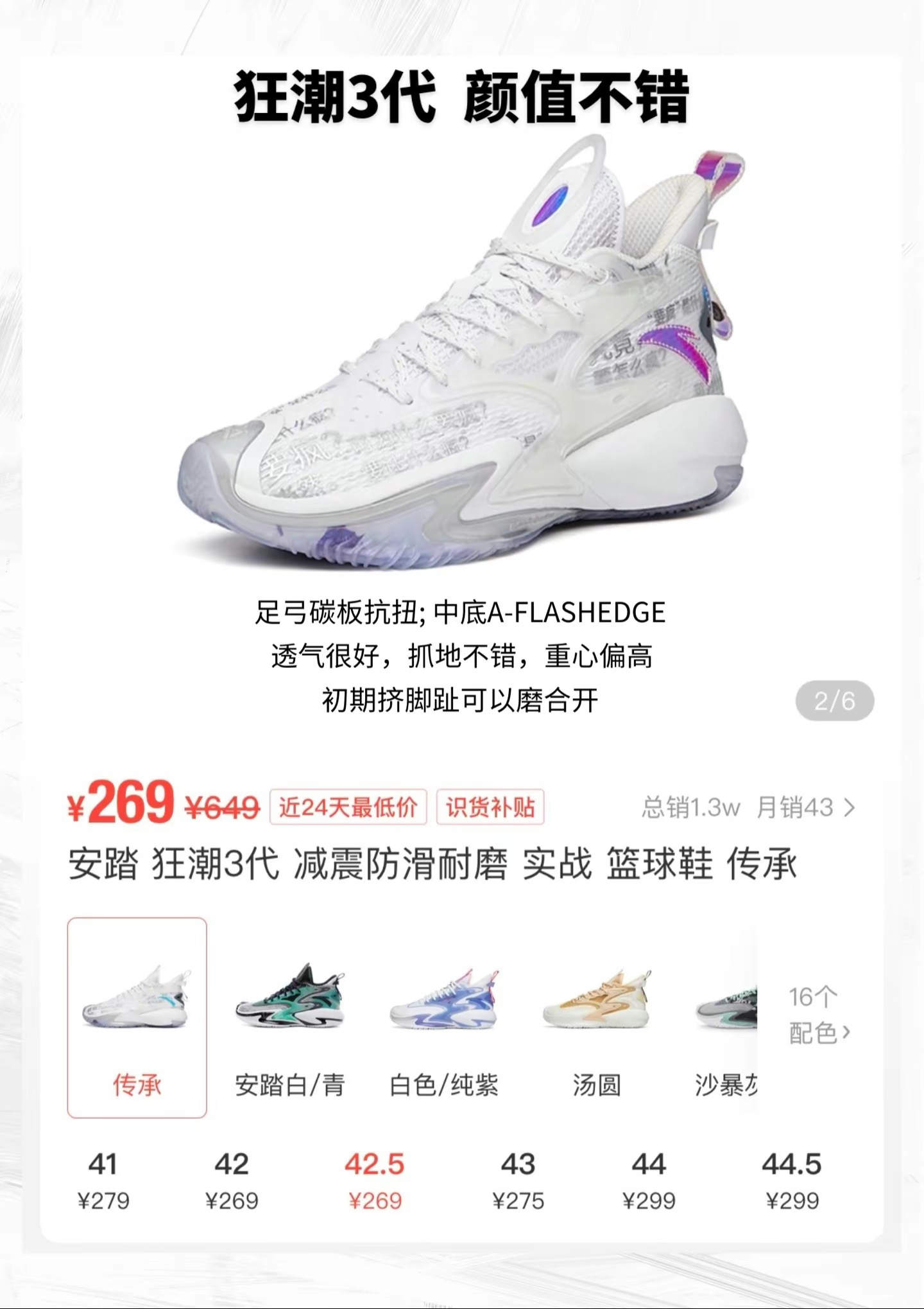 本篇笔记关联了安踏 狂潮3代 碳板 透气减震 防滑耐磨 实战 织物 篮球鞋 传承、安踏 轻狂3 氮科技 舒适减震 防滑耐磨 实战 篮球鞋 珍珠、安踏 水花5代 汤普森 篮球鞋 氮科技回弹透气防滑耐磨舒适百搭实战运动 男款/海浪蓝等商品,为用户提供真实的使用体验和购买参考。