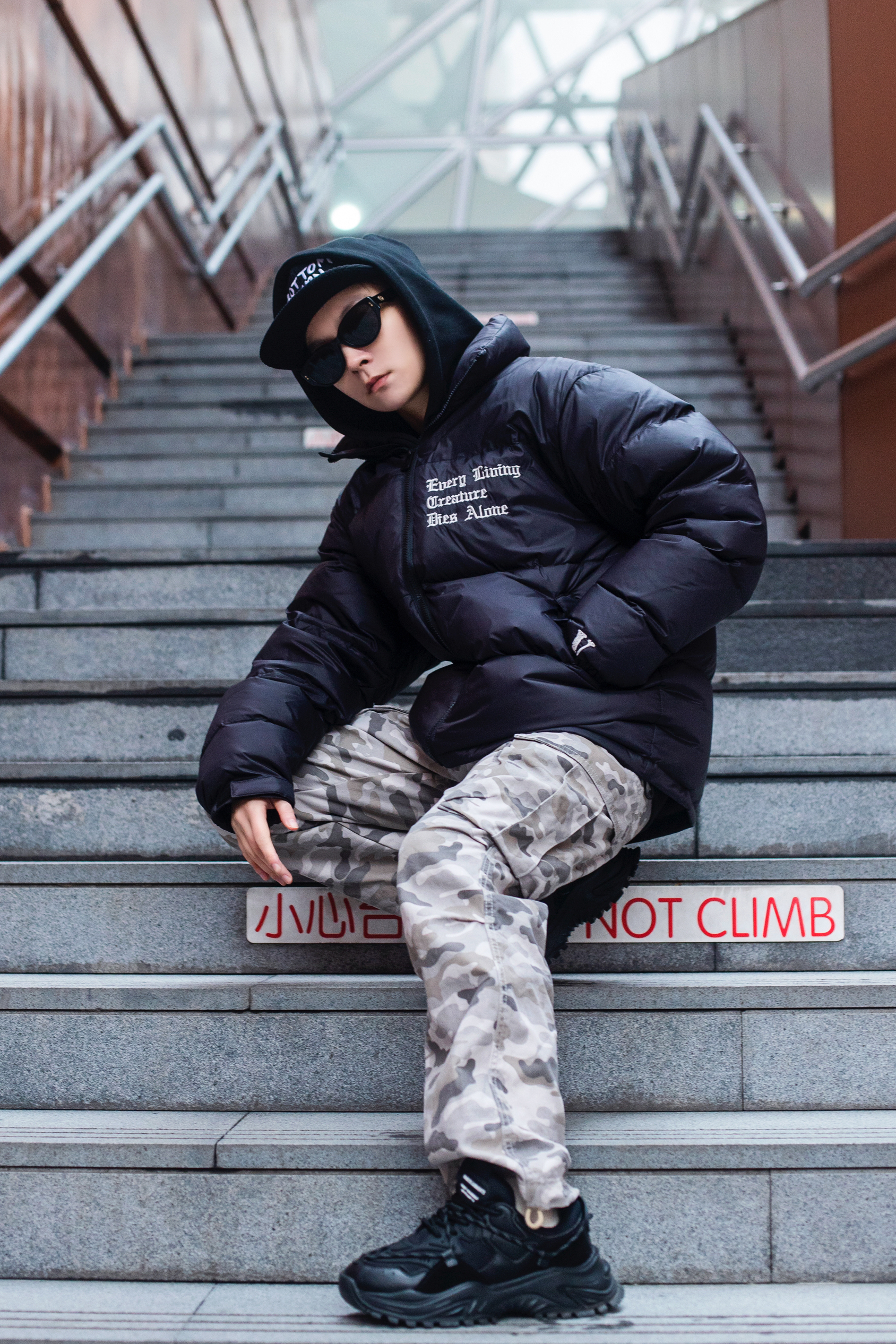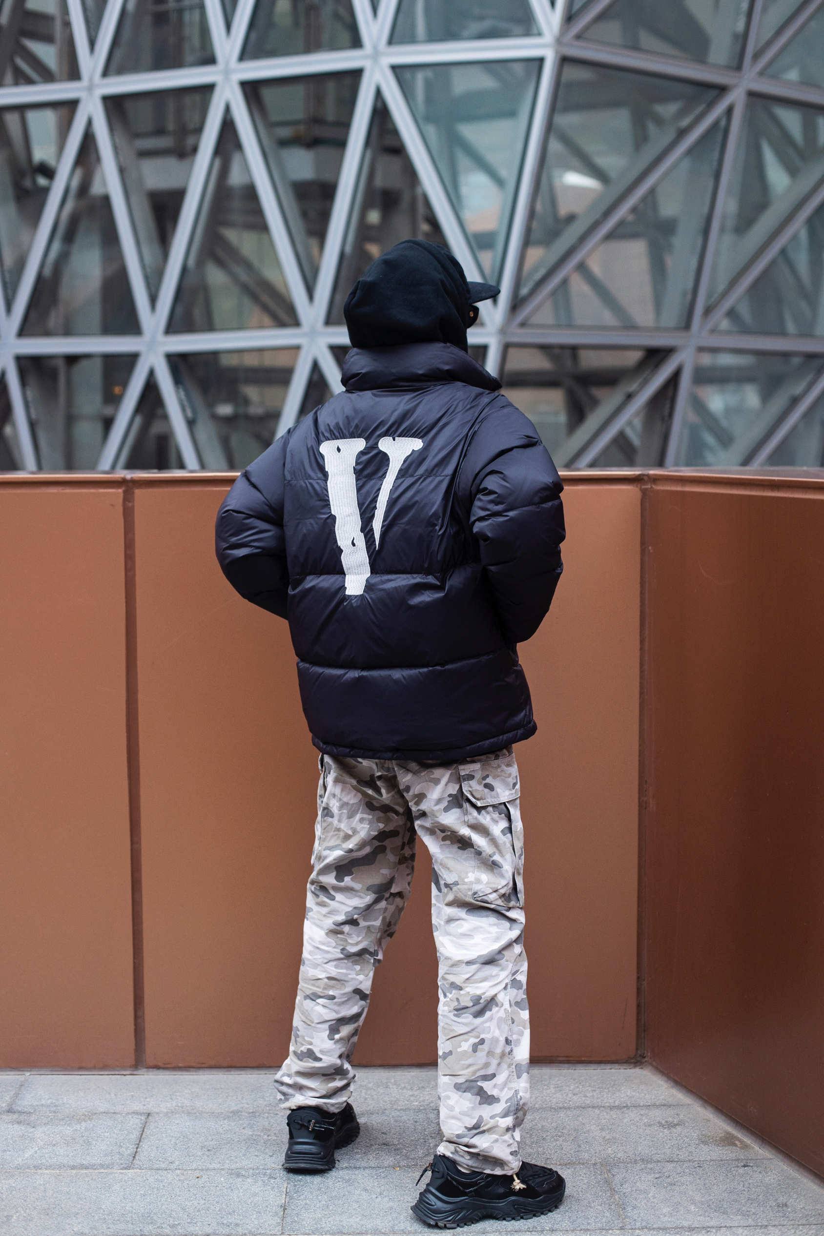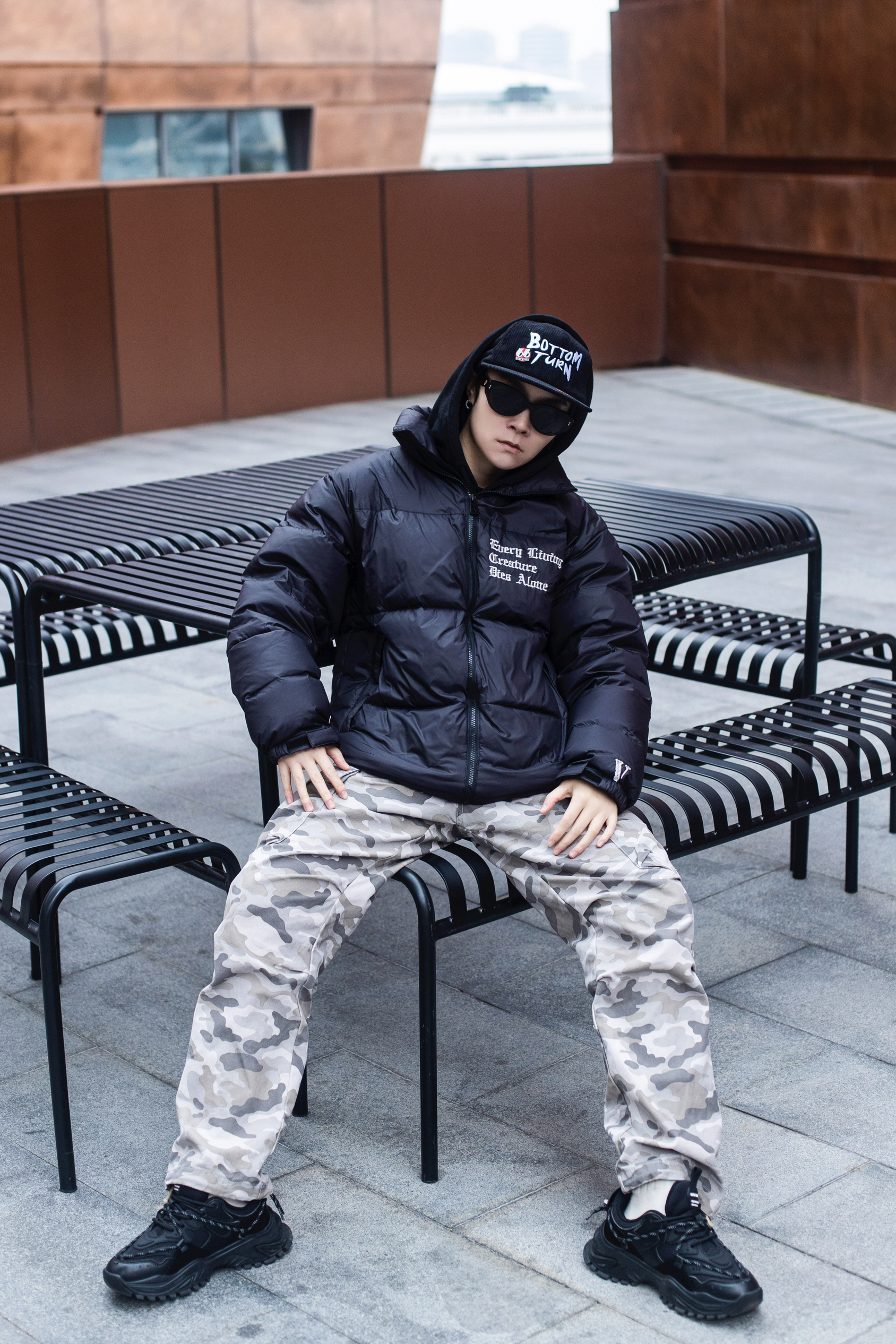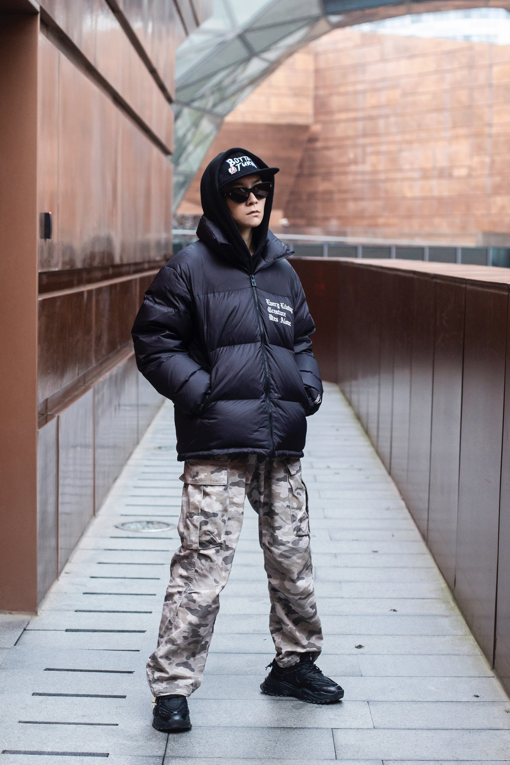 今天是羽绒服+迷彩裤 美式保暖小穿搭 穿搭指南: 上身一件黑色加绒连帽卫衣 外搭一件黑色拉链羽绒服 胸口刺绣和背后大logo街头感拉满 卫衣和羽绒服叠穿 轻松营造冬日慵懒氛围 下身一条白灰色迷彩裤 多口袋直筒工装版型百搭有型 整体宽松休闲 很有美式街头感 压一顶灯芯绒平檐帽 冬天这么穿是真的帅