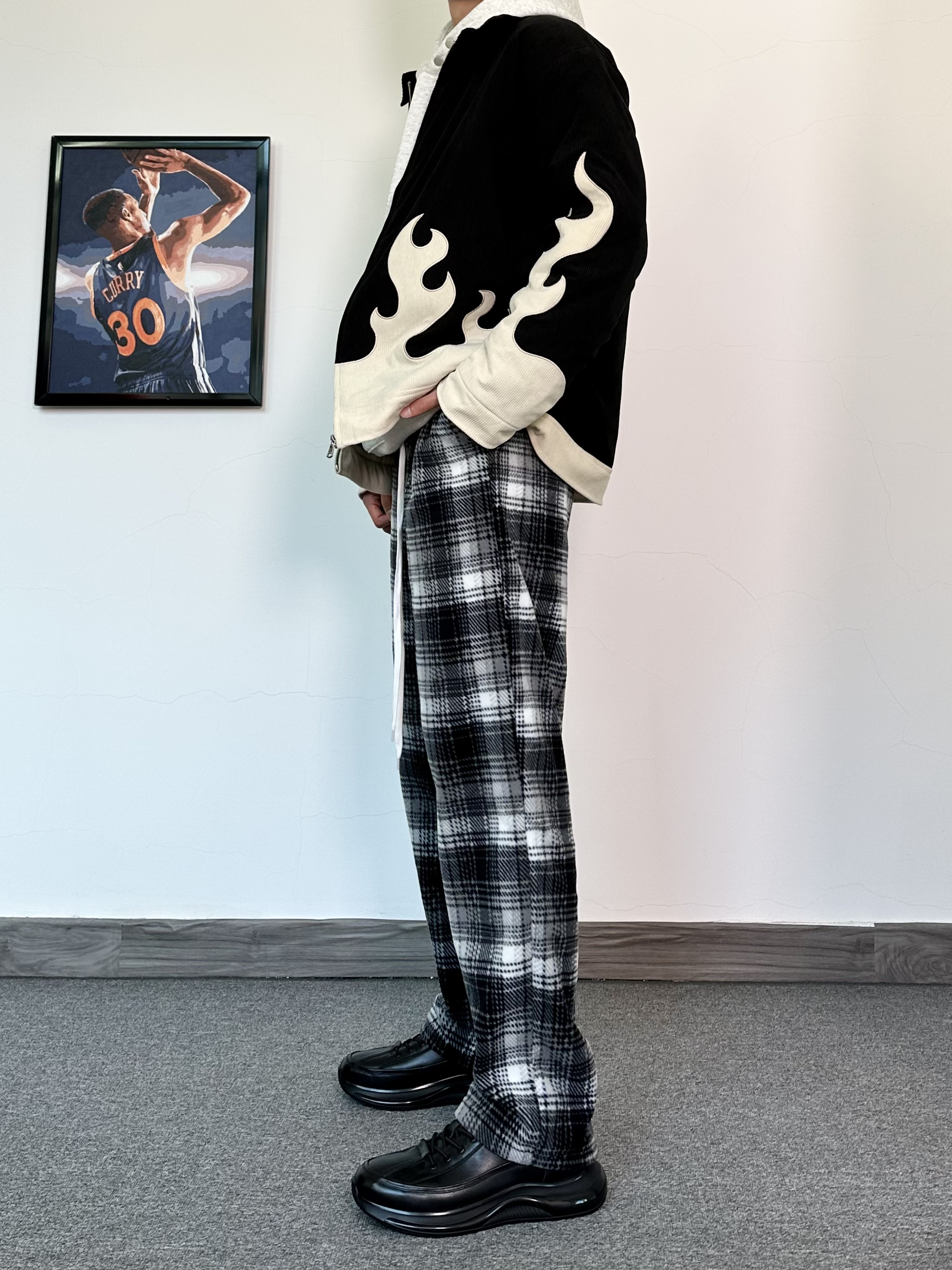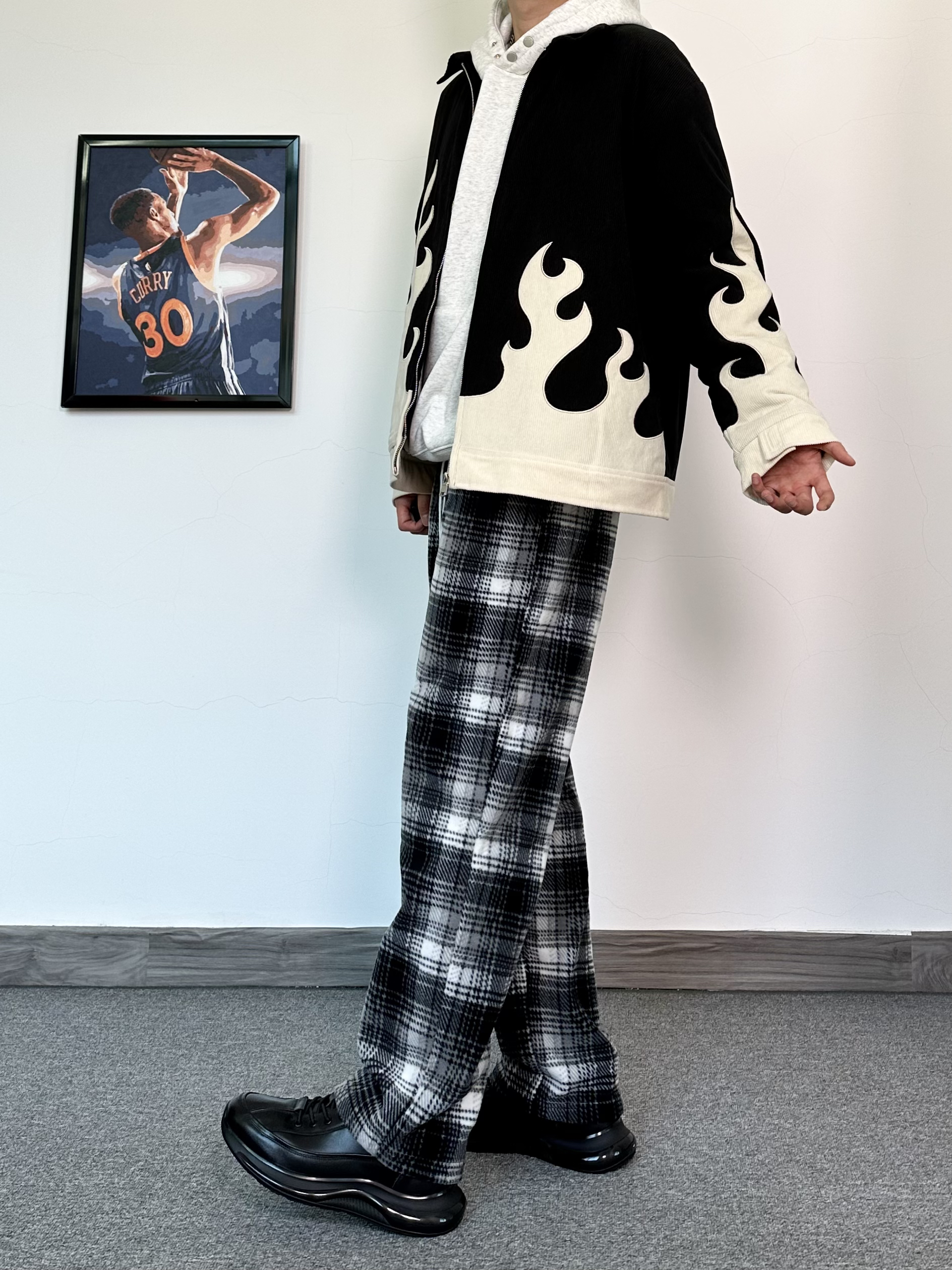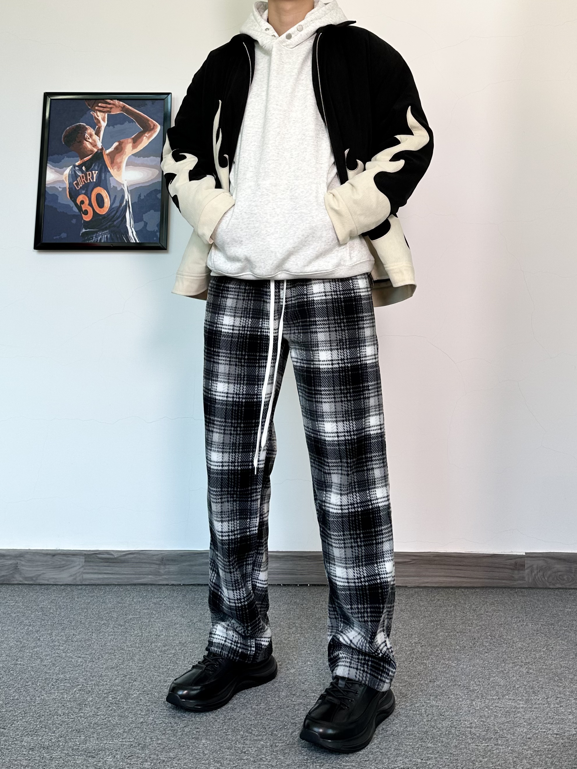 这个季节叠穿真的很加分保暖又帅气,层次感十足 一件火焰印花设计外套内搭一件花灰色卫衣 再搭配一条黑白格休闲裤,加绒真的很舒服~ 给我狠狠的美式起来! 最后再来一双纯黑配色的运动休闲鞋 黑武士配色很百搭! 鞋面采用牛皮革的材质质感真的很不错
