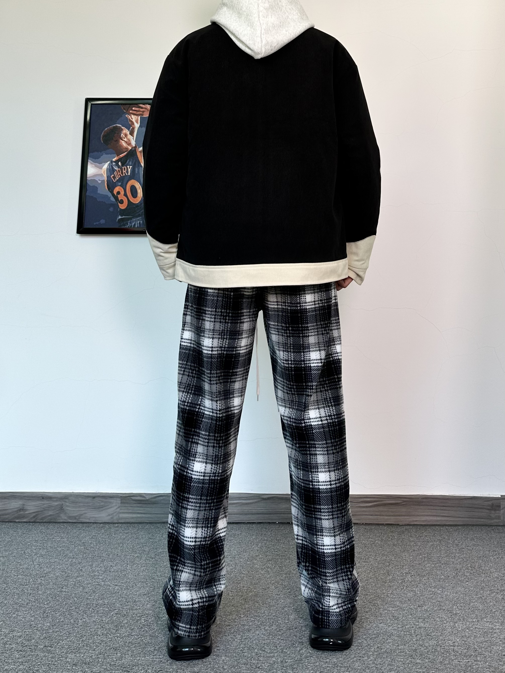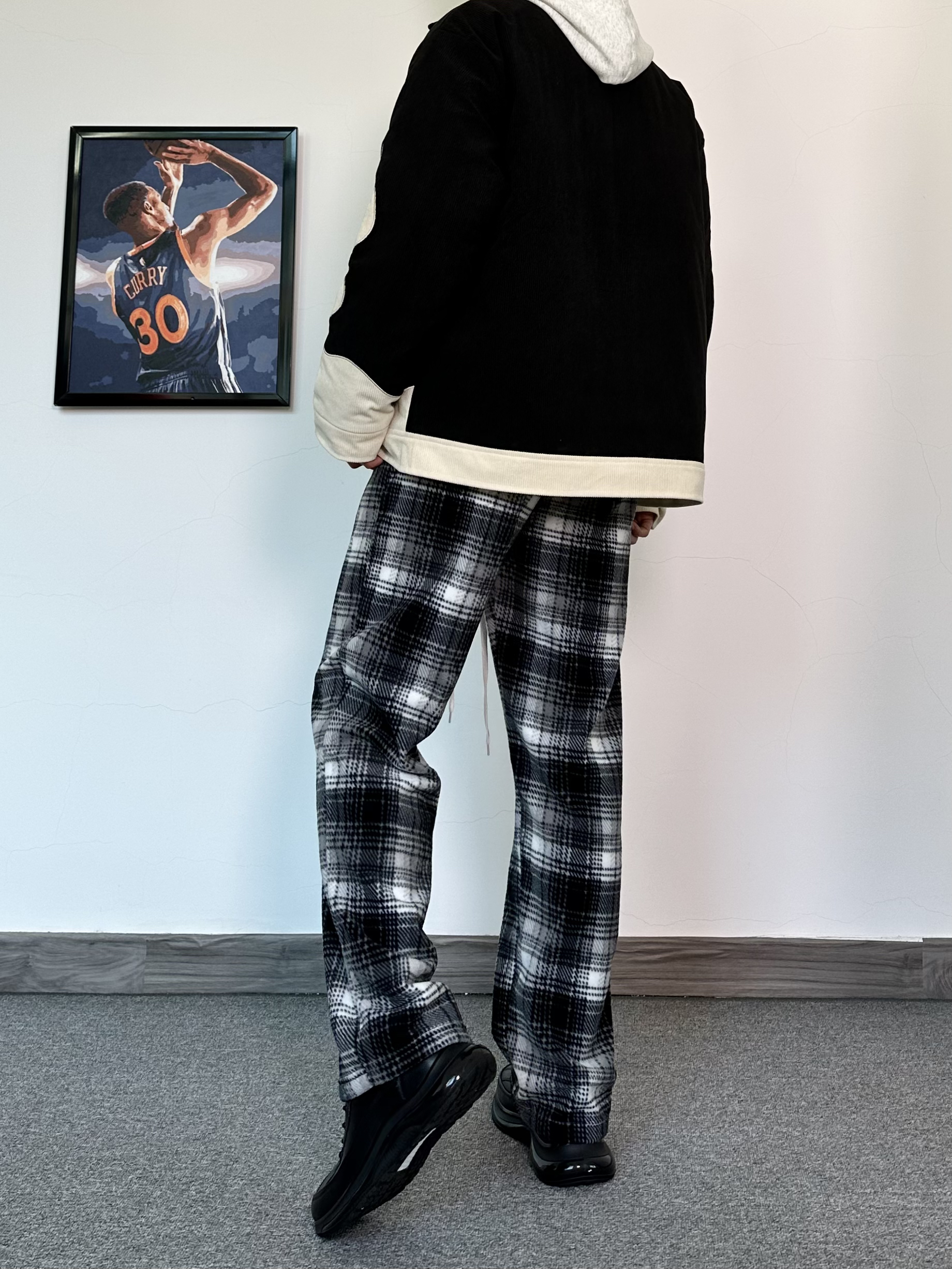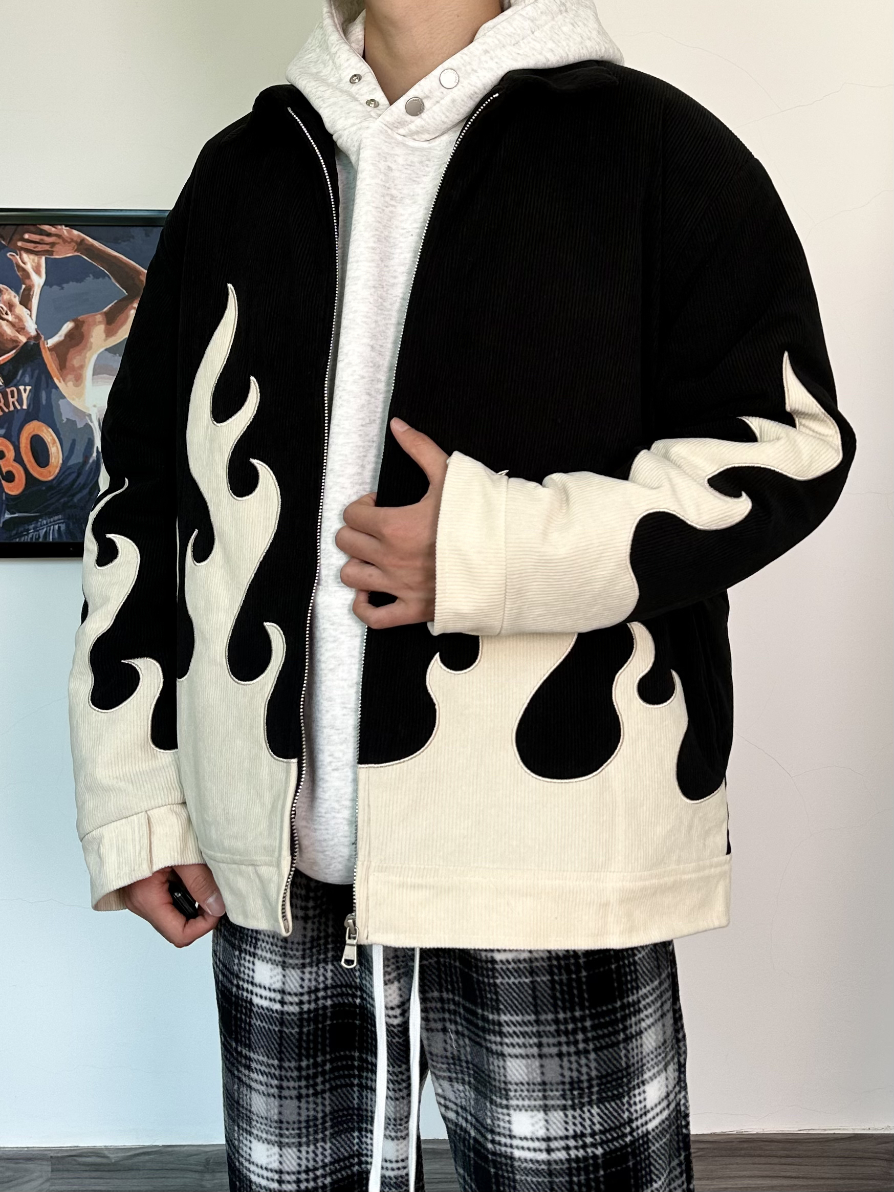 这个季节叠穿真的很加分保暖又帅气,层次感十足 一件火焰印花设计外套内搭一件花灰色卫衣 再搭配一条黑白格休闲裤,加绒真的很舒服~ 给我狠狠的美式起来! 最后再来一双纯黑配色的运动休闲鞋 黑武士配色很百搭! 鞋面采用牛皮革的材质质感真的很不错