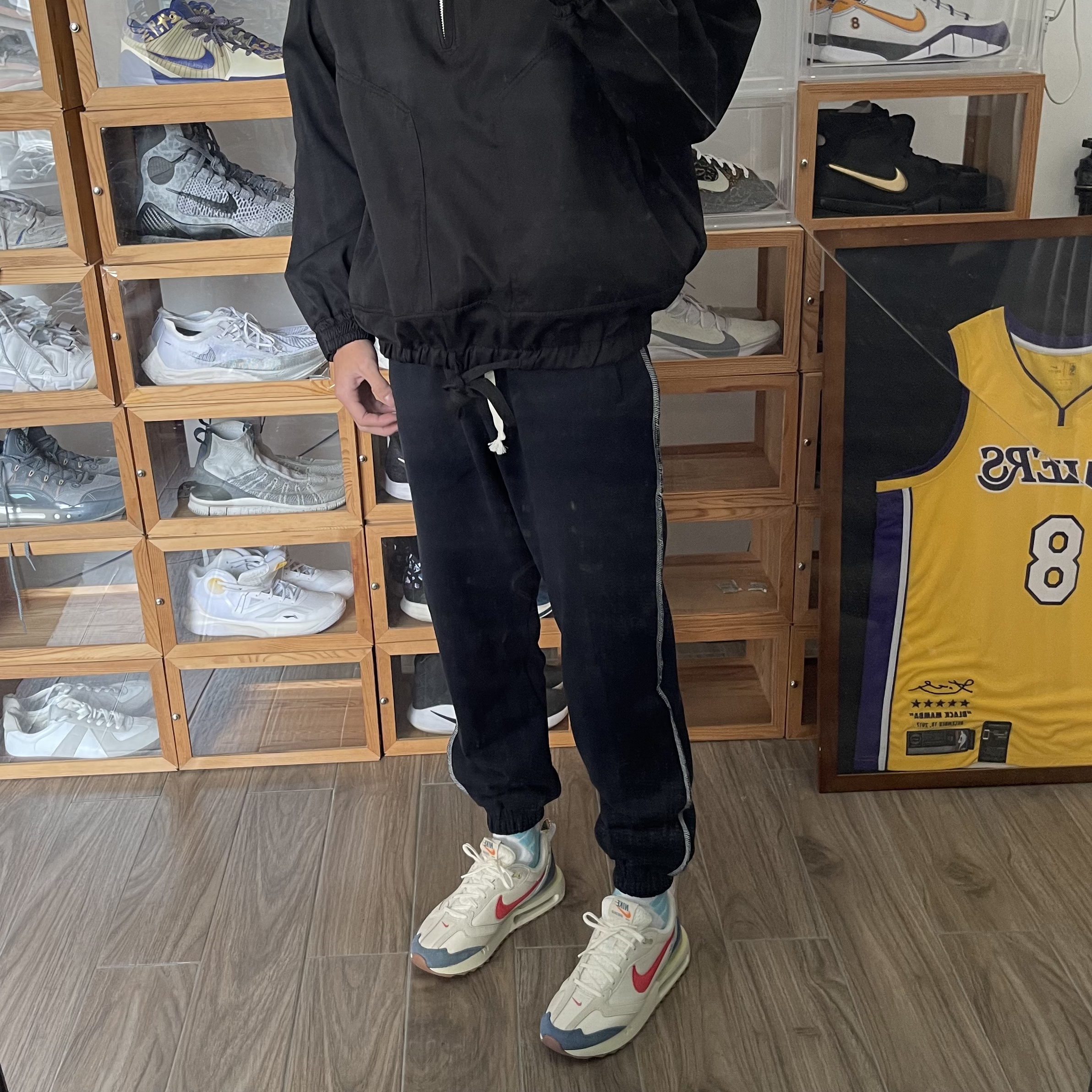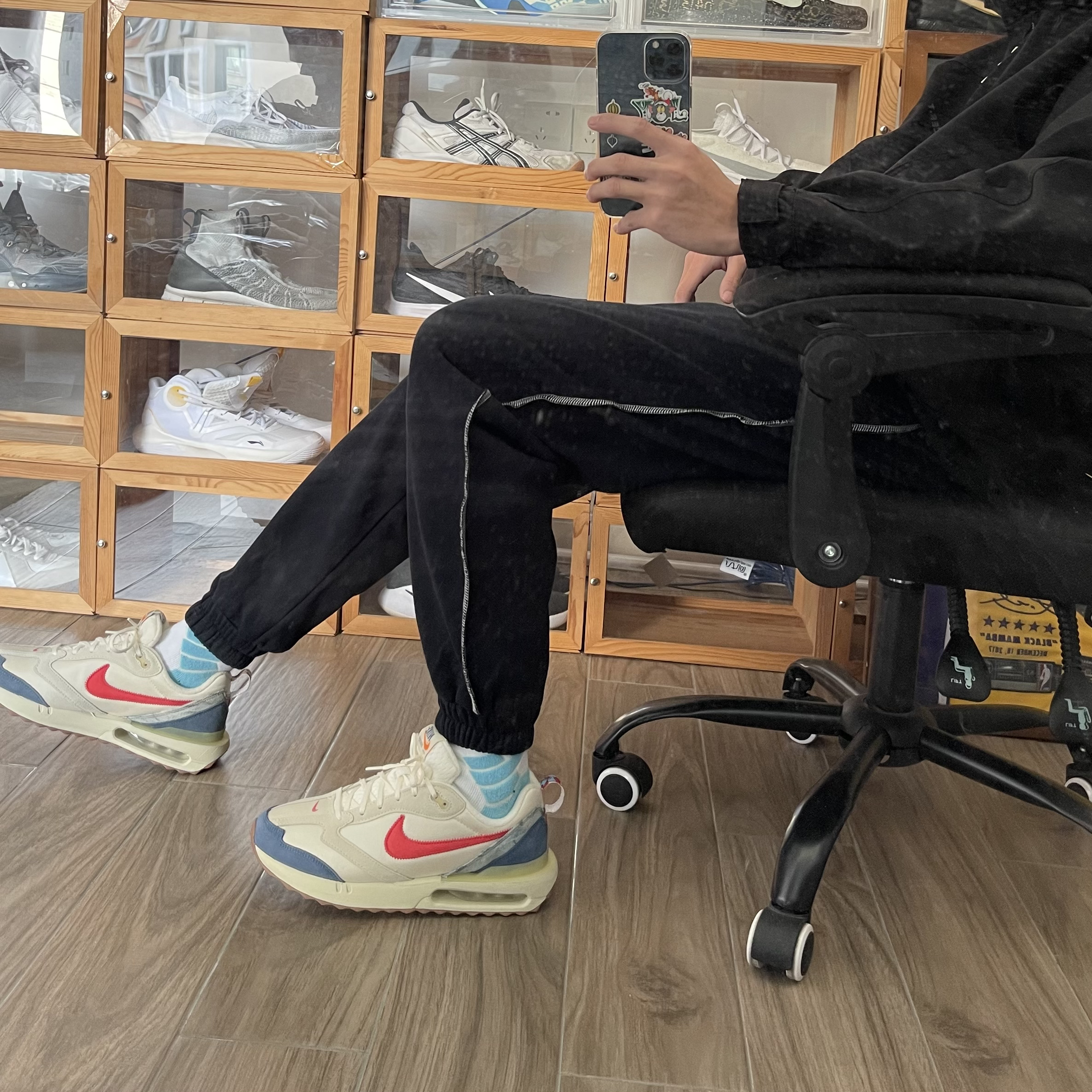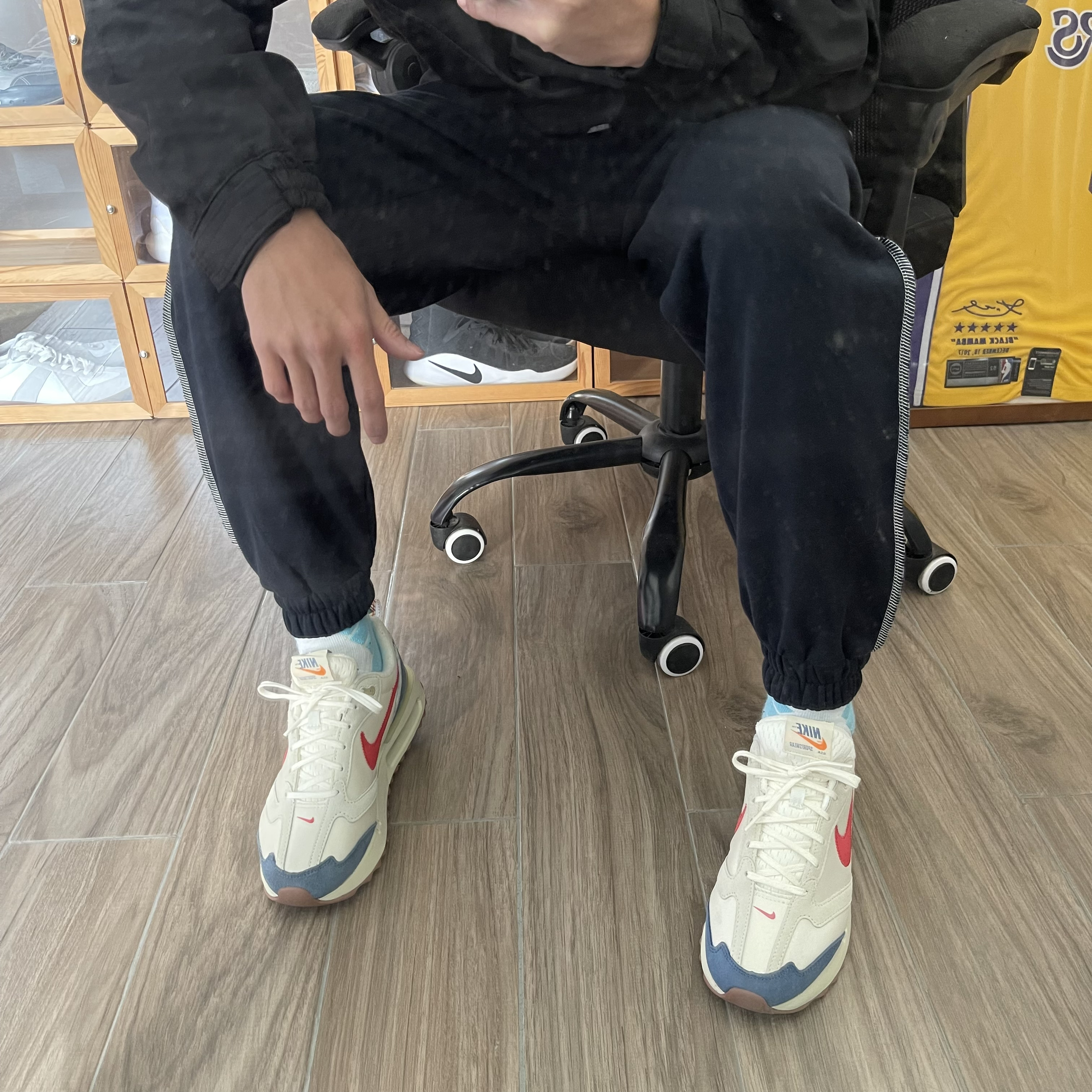 米色织物鞋面搭配红勾及蓝色点缀鞋面,醒目又动感十足,后跟可视 Air 缓震配置搭载泡棉中底,上脚真的是很轻很软,后跟花卉提拉设计,穿脱方便还好看,波浪形外底,提升耐磨性 👕上衣:PDCT冲锋衣 👖裤子:PDCT 撞线卫裤 🧦袜子:PDCT精英袜 👟鞋子:Nike max dawn