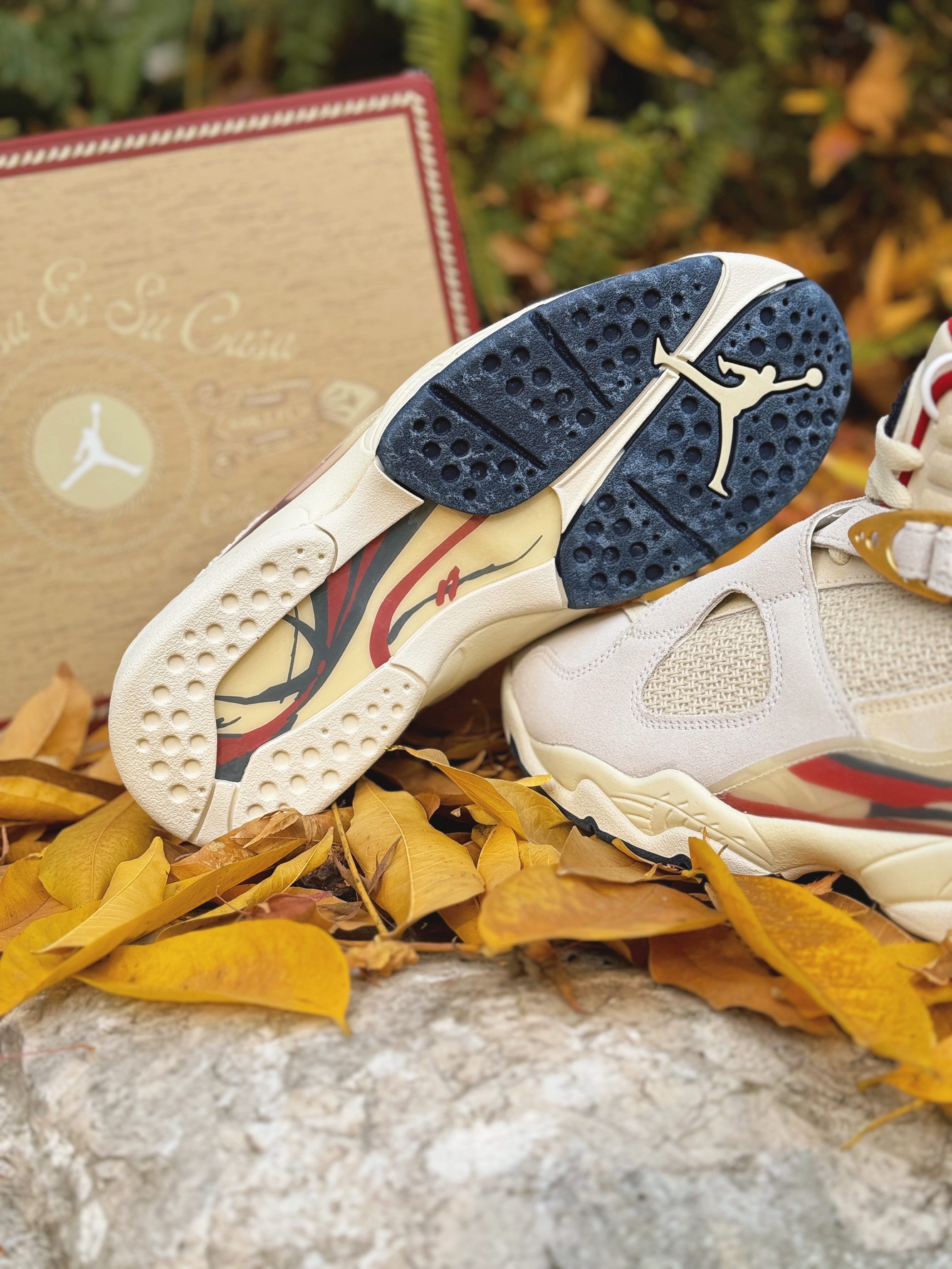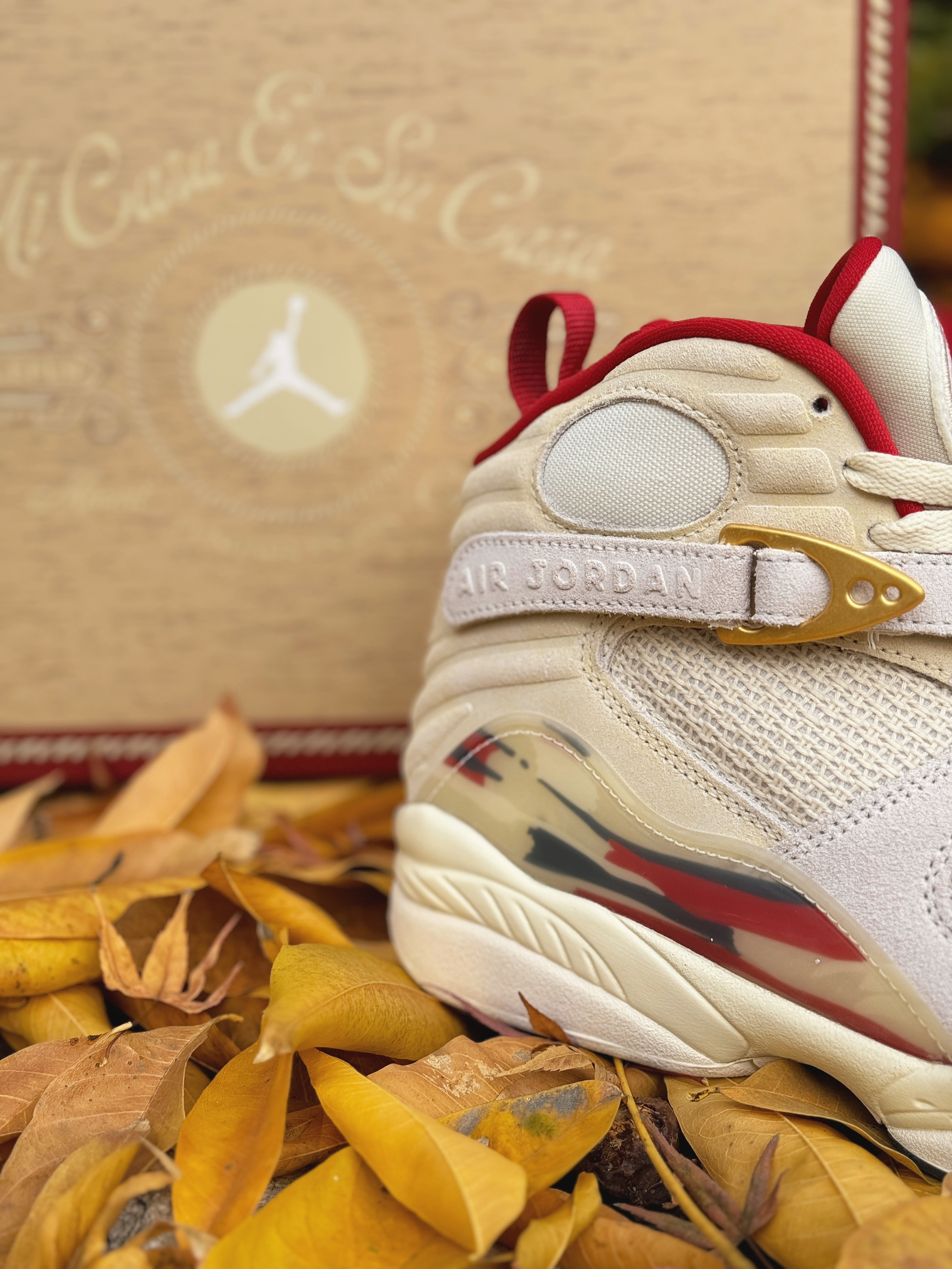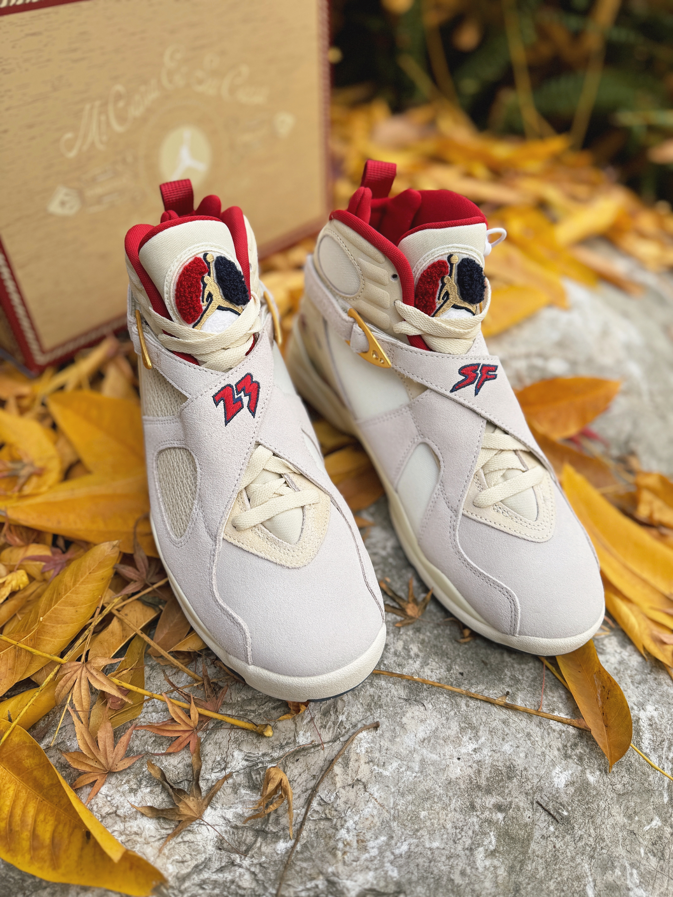 号称“天价联名制造机”的SoleFly与Jordan Brand又整新活儿啦!这次带回的AJ8 相对冷门但依旧不失奢华感! 浅色系搭配让我想起了之前的AJ10“十周年” 这次以“雪茄”为灵感设计 整体米白色为主 金色与红色点缀细节 简约高级!采用麂皮、网面材质打造的鞋身 质感也是很不错的 很适合现在冬季穿着!AJ8标识性的绑带上分别是数字“23”和字母“SF” 彰显联名身份!鞋盒包装采用了木质配...