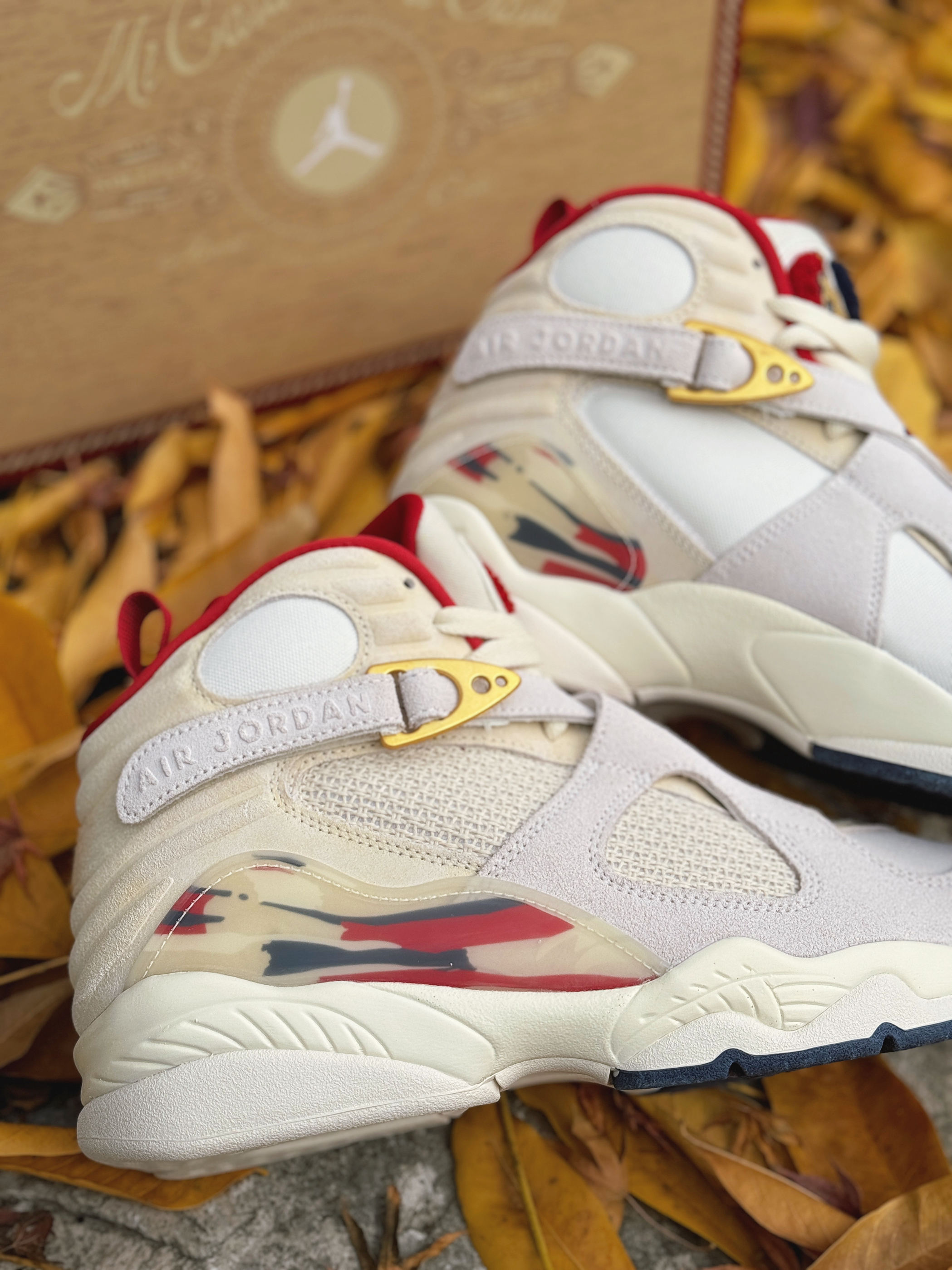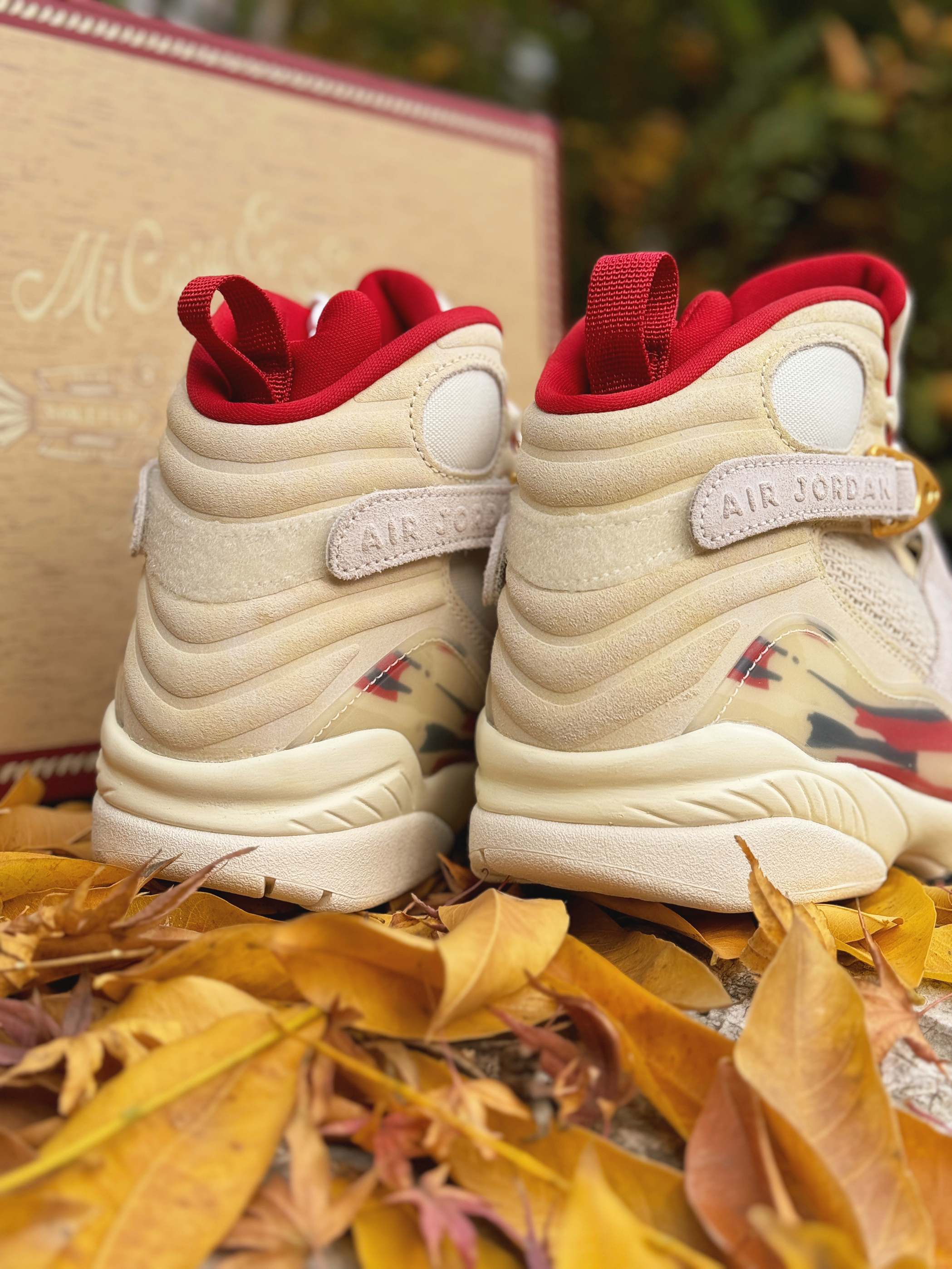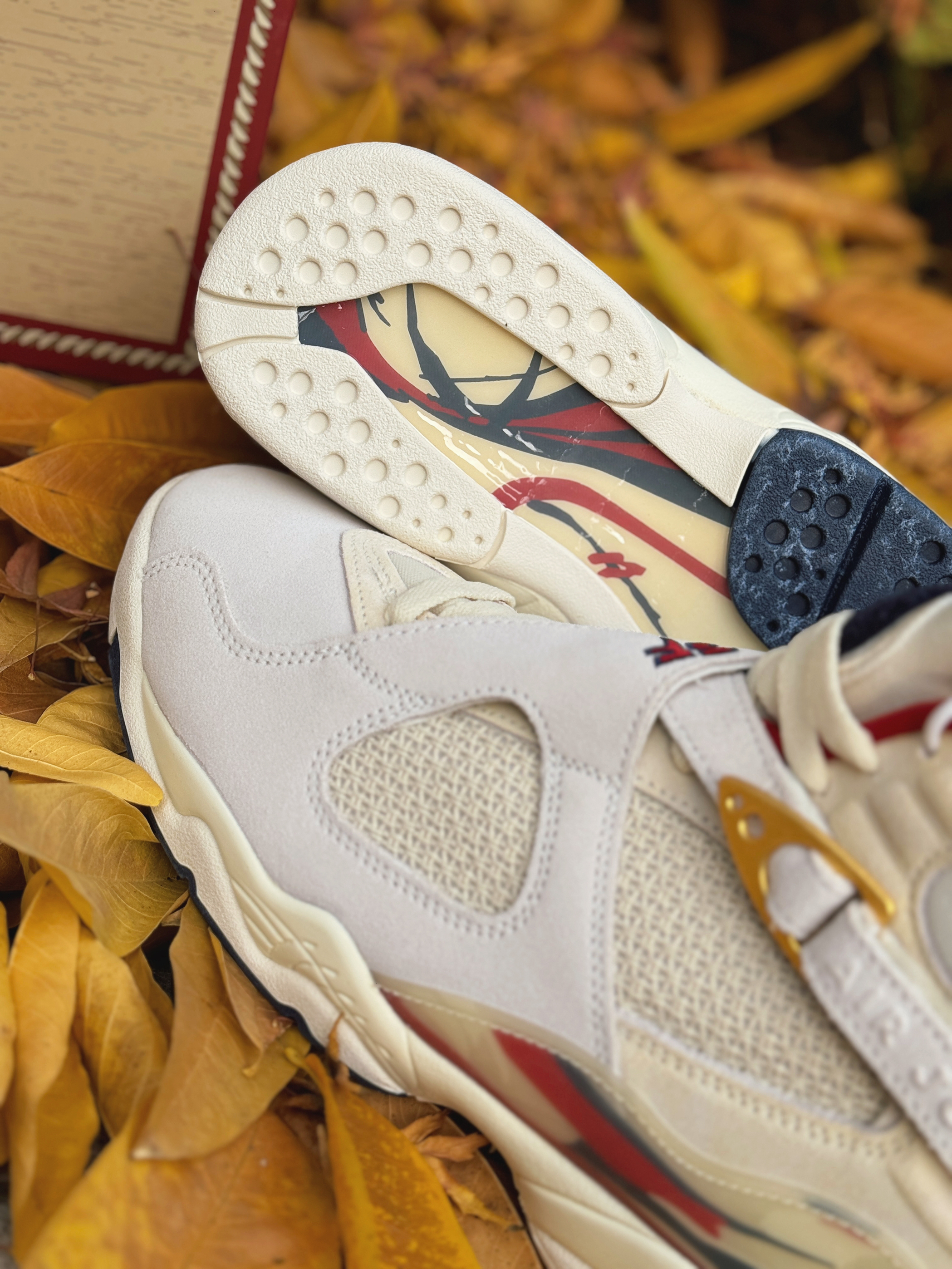 号称“天价联名制造机”的SoleFly与Jordan Brand又整新活儿啦!这次带回的AJ8 相对冷门但依旧不失奢华感! 浅色系搭配让我想起了之前的AJ10“十周年” 这次以“雪茄”为灵感设计 整体米白色为主 金色与红色点缀细节 简约高级!采用麂皮、网面材质打造的鞋身 质感也是很不错的 很适合现在冬季穿着!AJ8标识性的绑带上分别是数字“23”和字母“SF” 彰显联名身份!鞋盒包装采用了木质配...