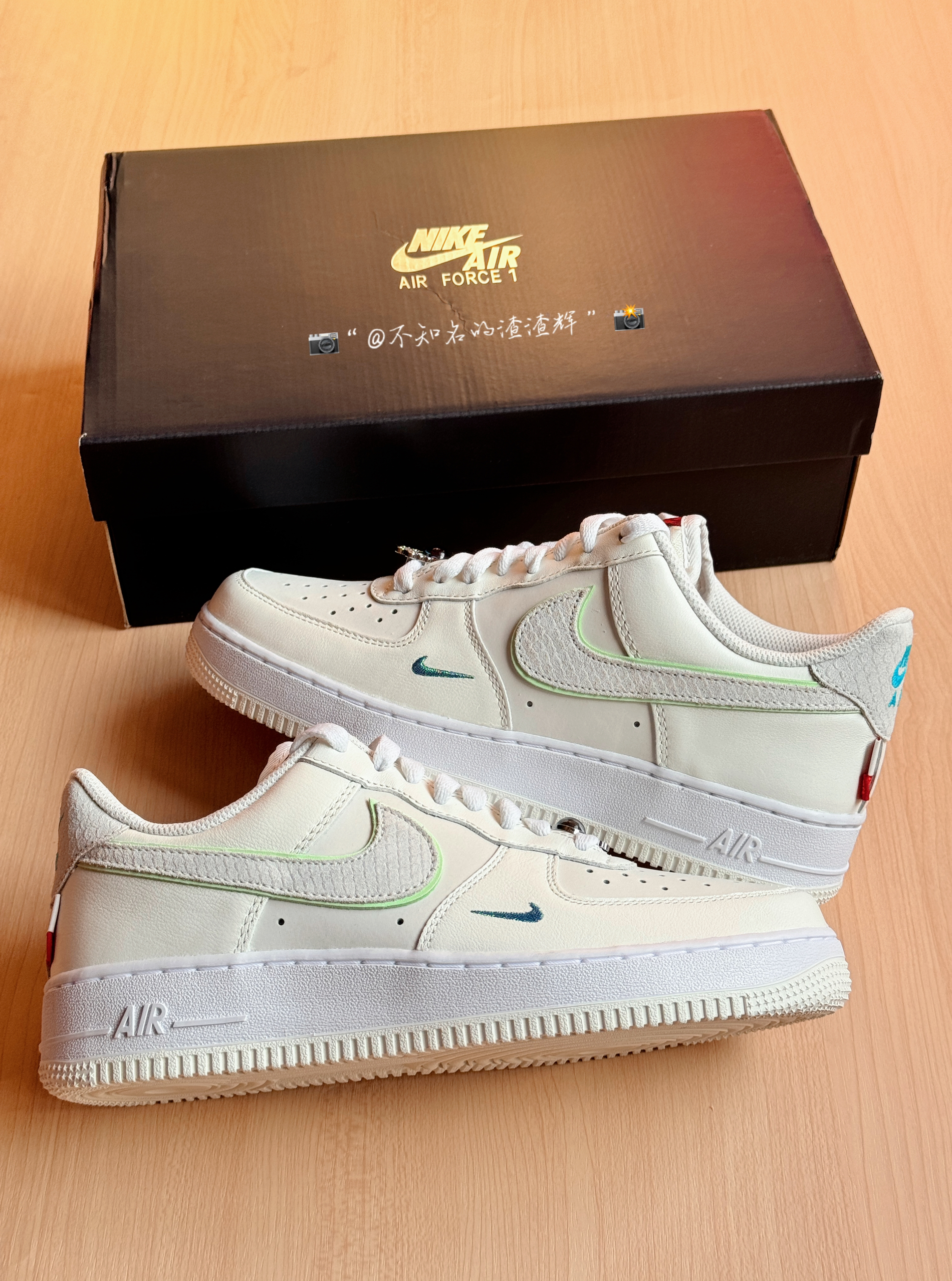 🐲:Nike Air Force 1Low“龙年”耐磨 低帮 板鞋 男女同款 米白 🐲:这双鞋子整体以米白色为主色调,很耐看的配色,Swoosh和后跟采用“龙纹”设计,个性时尚,鞋带扣“龙珠 龙爪”设计也是这双鞋子的一大亮点,鞋面采用优质皮革材质,质感细腻舒适,中底Air Sole气垫为鞋子提供舒适脚感 🐲:实物很好看的新款空军一号,元旦出街首选!百搭出众的宝藏鞋 🐲:尺码推荐:建议买小半码