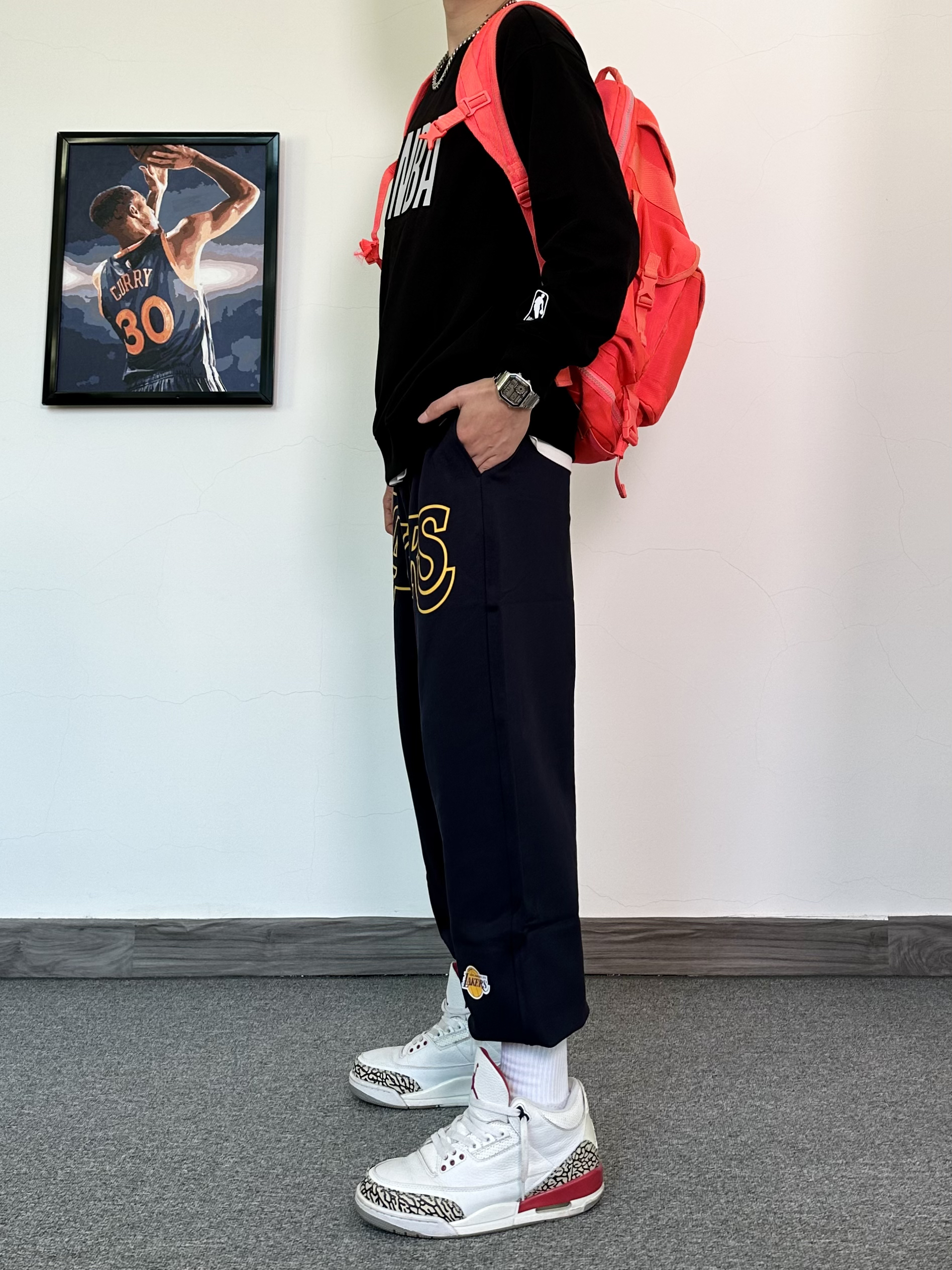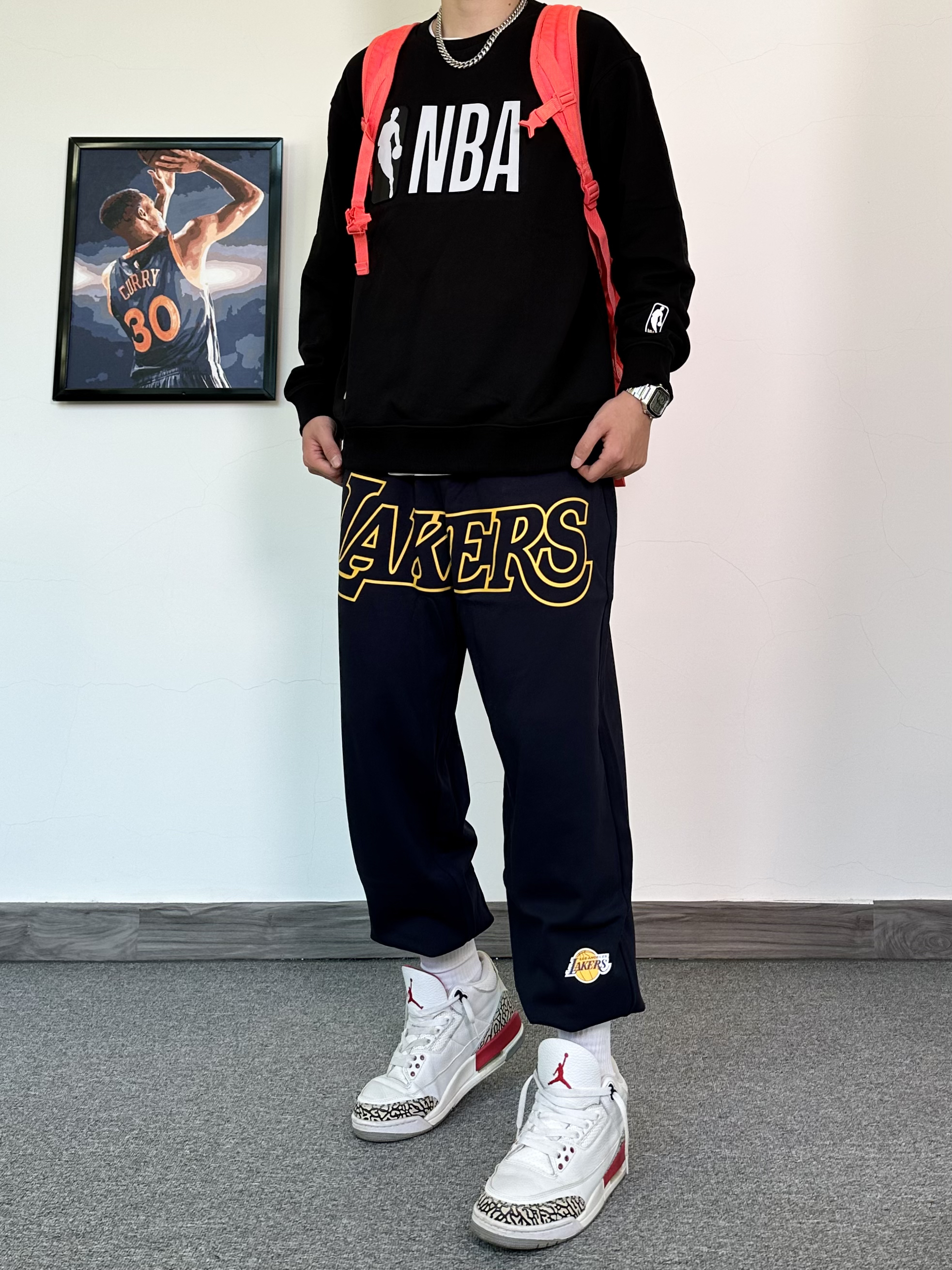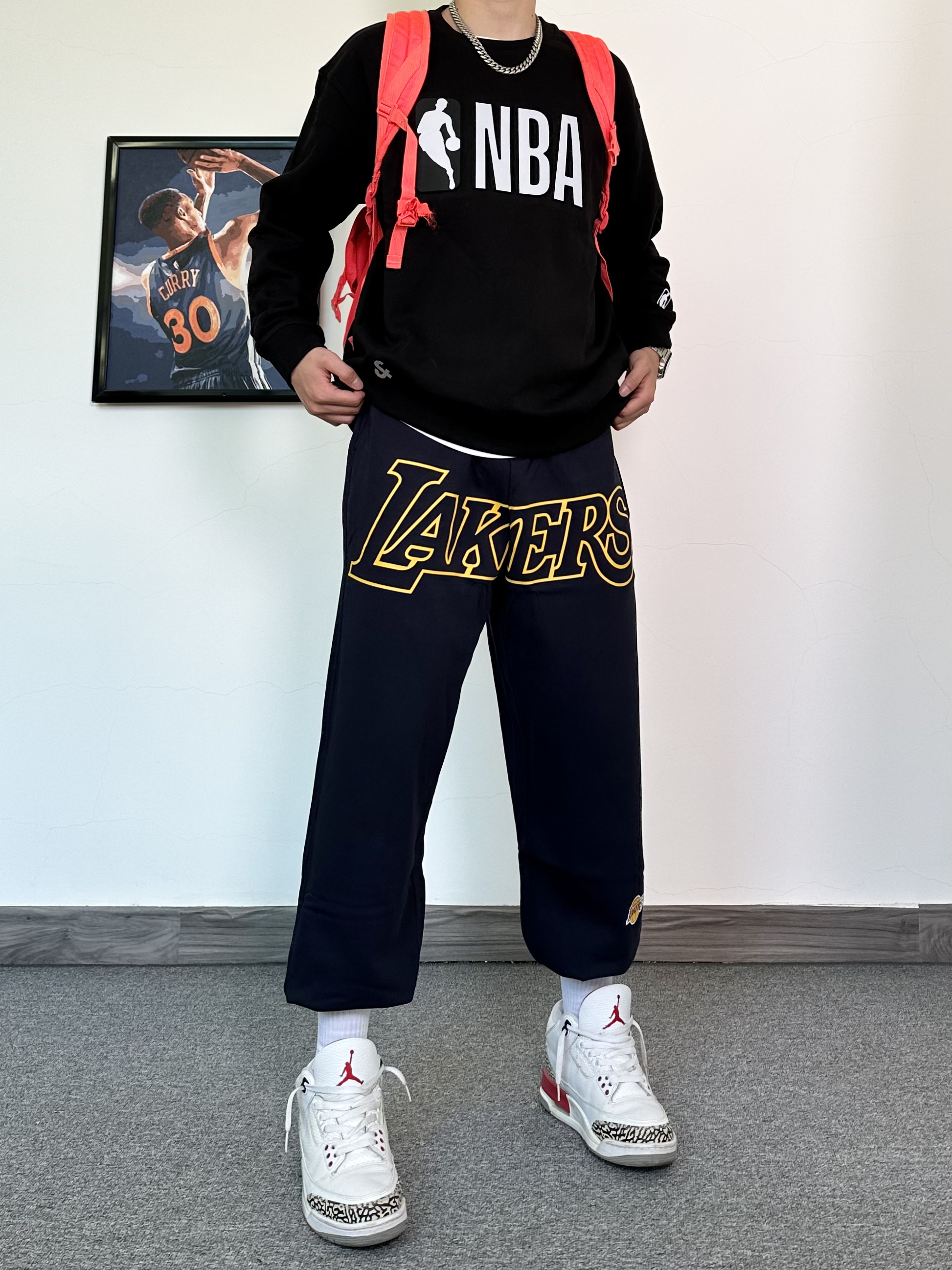 这件圆领卫衣我真的毫无抵抗力! NBA联名款卫衣,纯黑色的设计印上logo 打篮球的男孩子真的无法拒绝X 版型特别版正,用料上身就知道很足! 搭配一条同品牌的洛杉矶湖人队的联名款束脚卫裤 冬季打球运动休闲都可穿! 这一身穿搭必须搭配一双百搭的运动鞋 我选择了这款白红配色的aj3,搭配起来真不错!