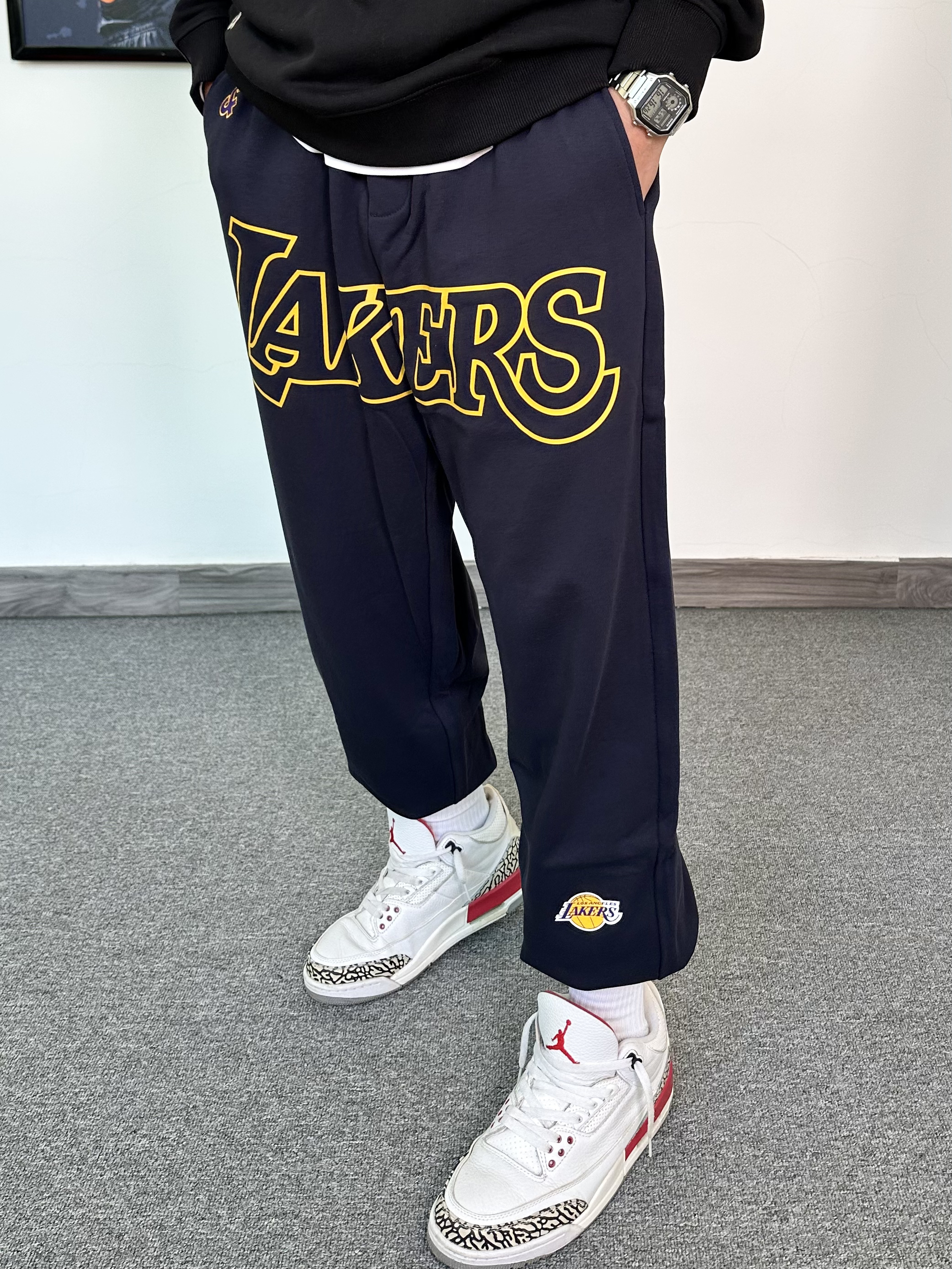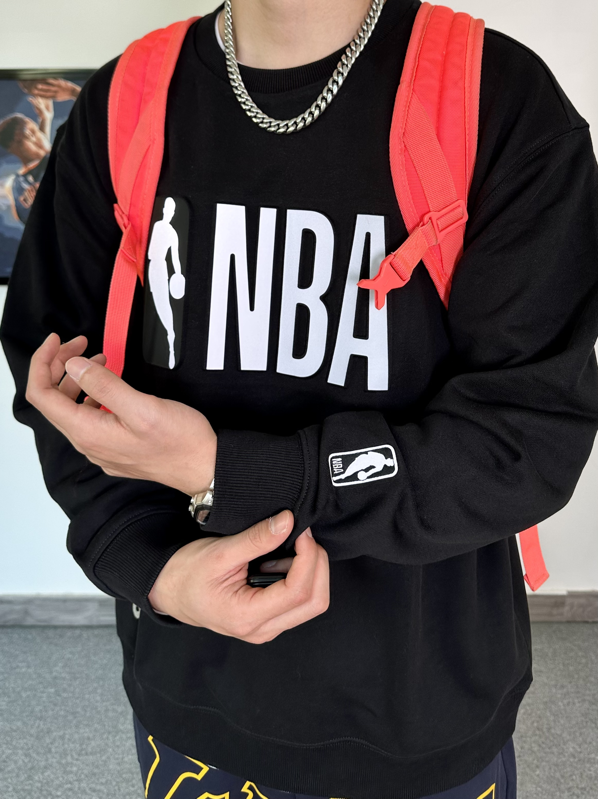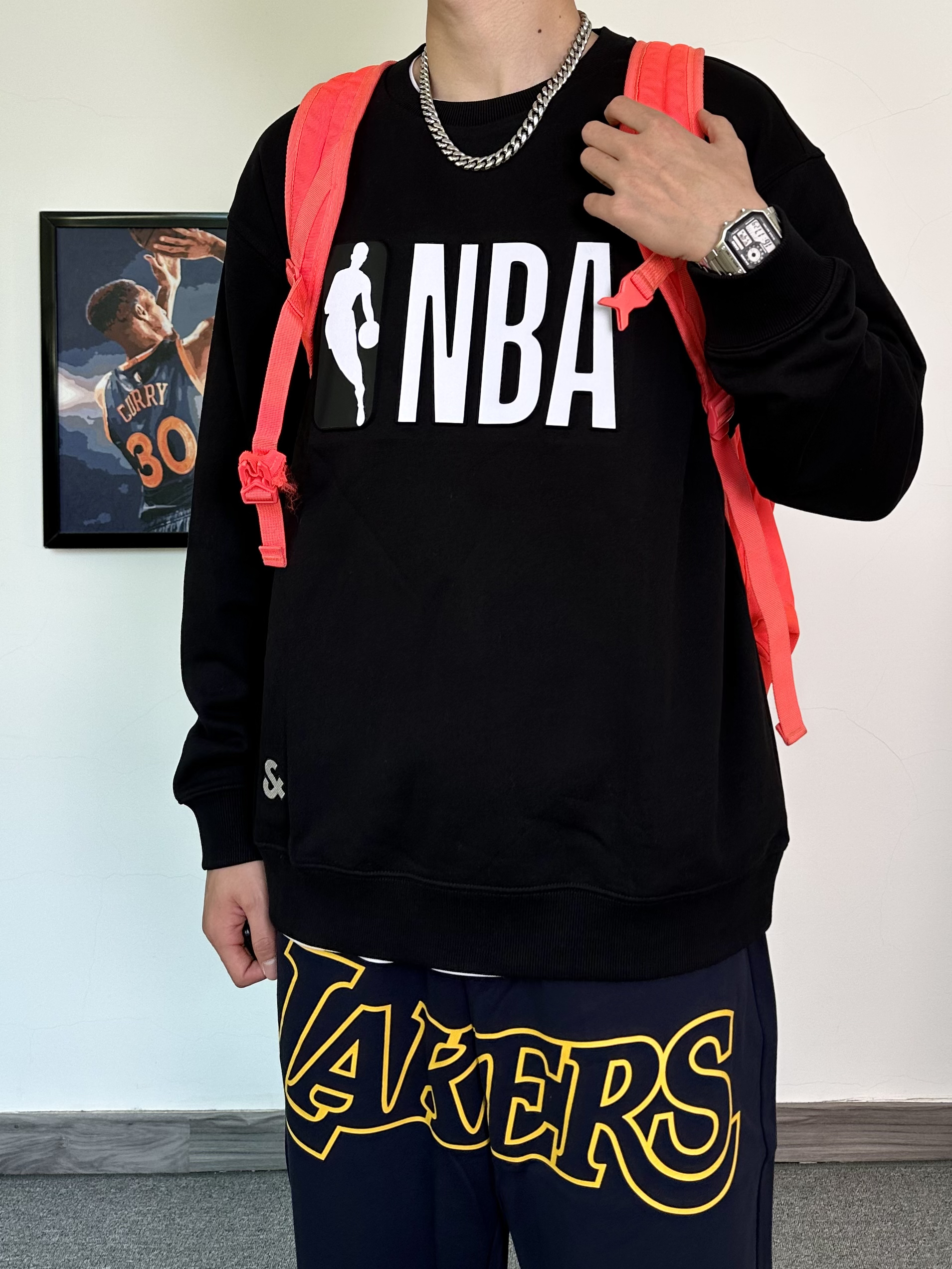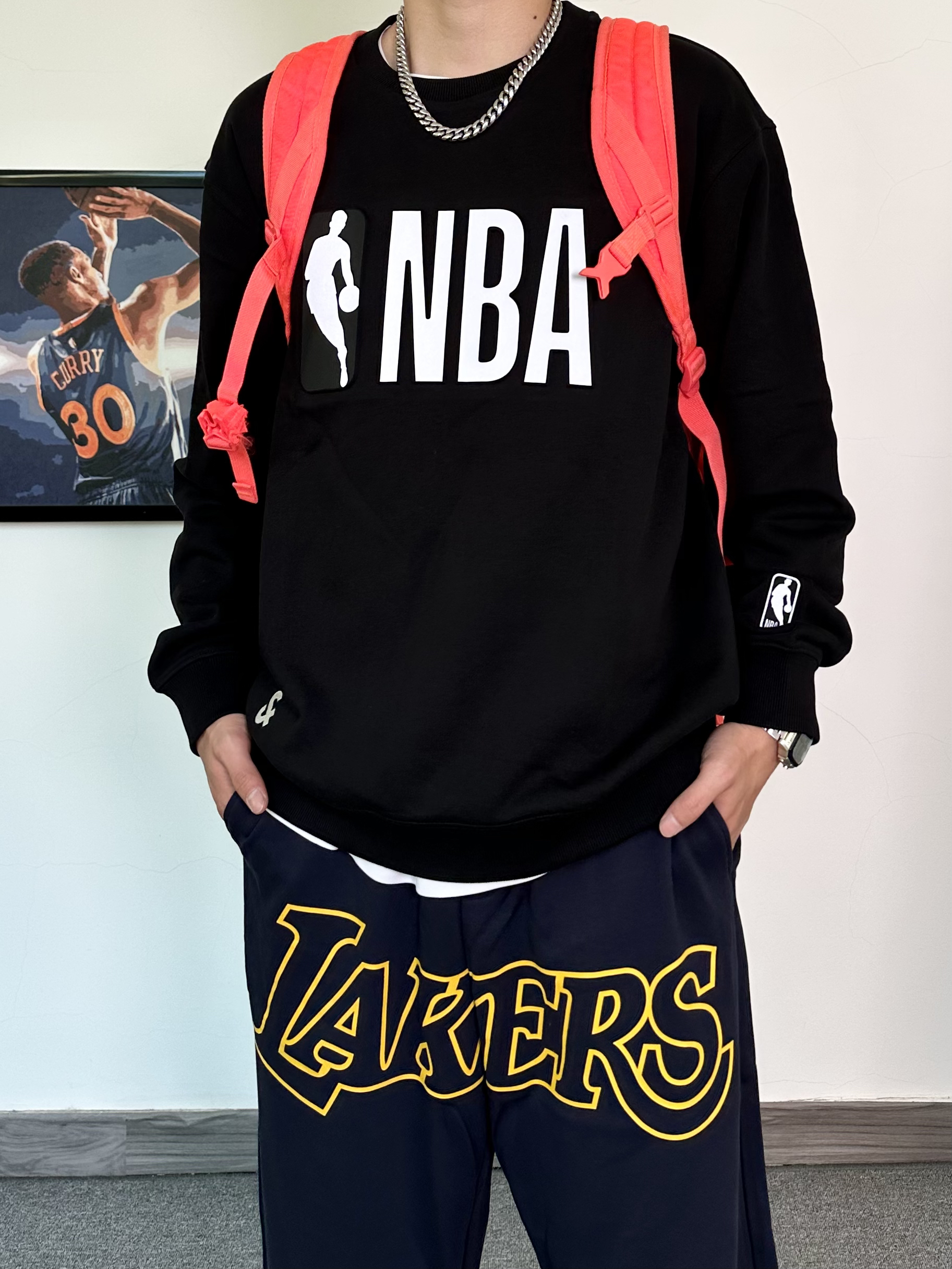 这件圆领卫衣我真的毫无抵抗力! NBA联名款卫衣,纯黑色的设计印上logo 打篮球的男孩子真的无法拒绝X 版型特别版正,用料上身就知道很足! 搭配一条同品牌的洛杉矶湖人队的联名款束脚卫裤 冬季打球运动休闲都可穿! 这一身穿搭必须搭配一双百搭的运动鞋 我选择了这款白红配色的aj3,搭配起来真不错!