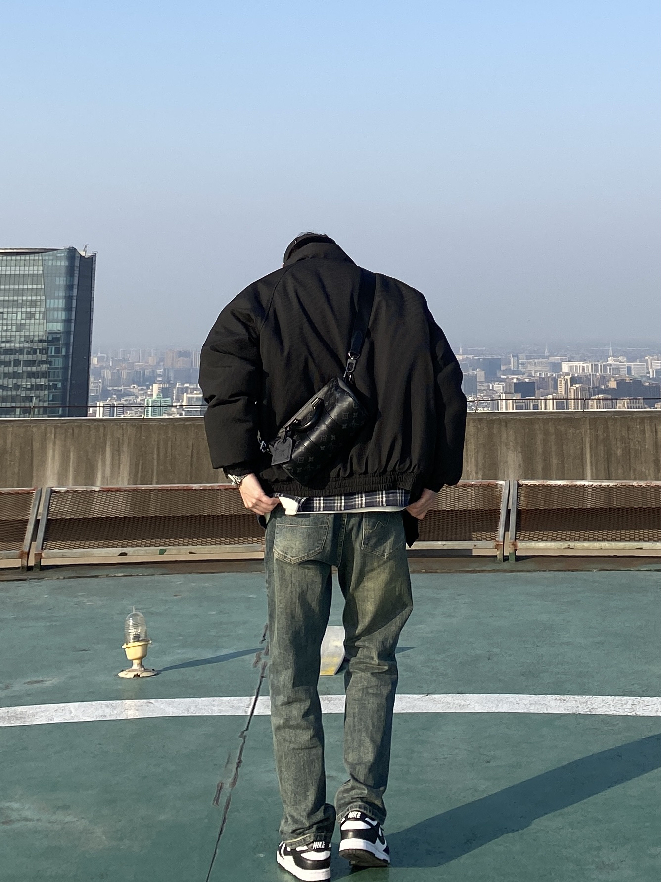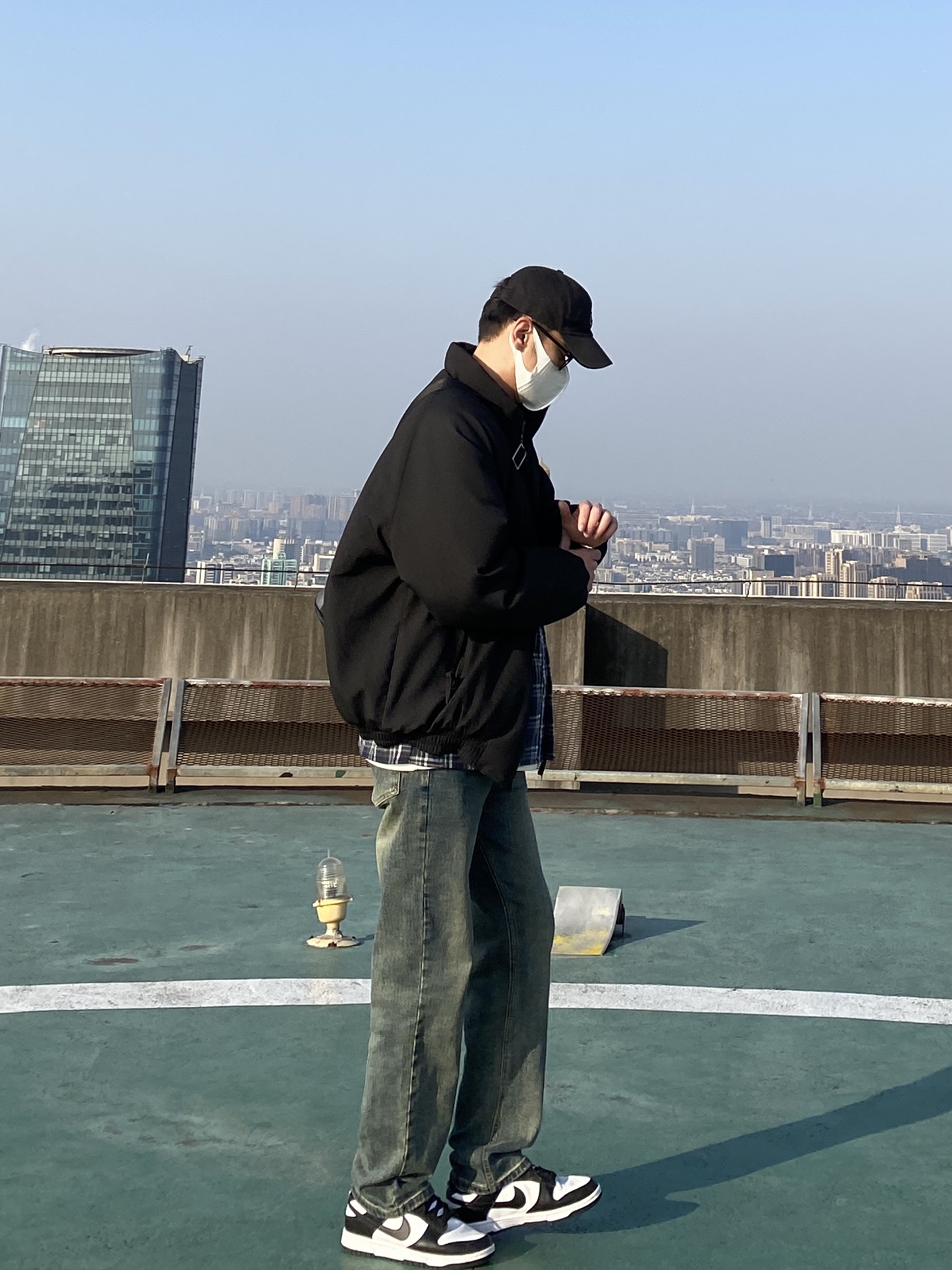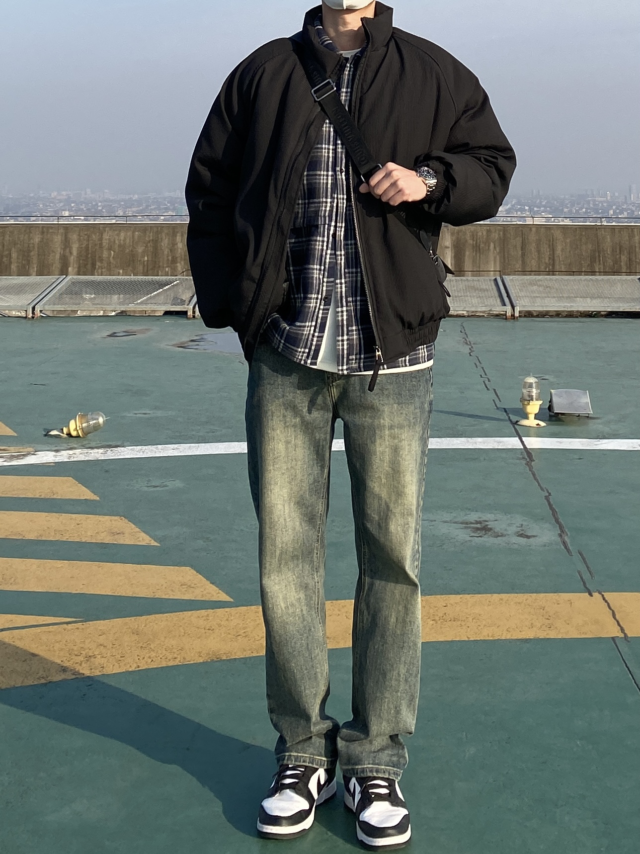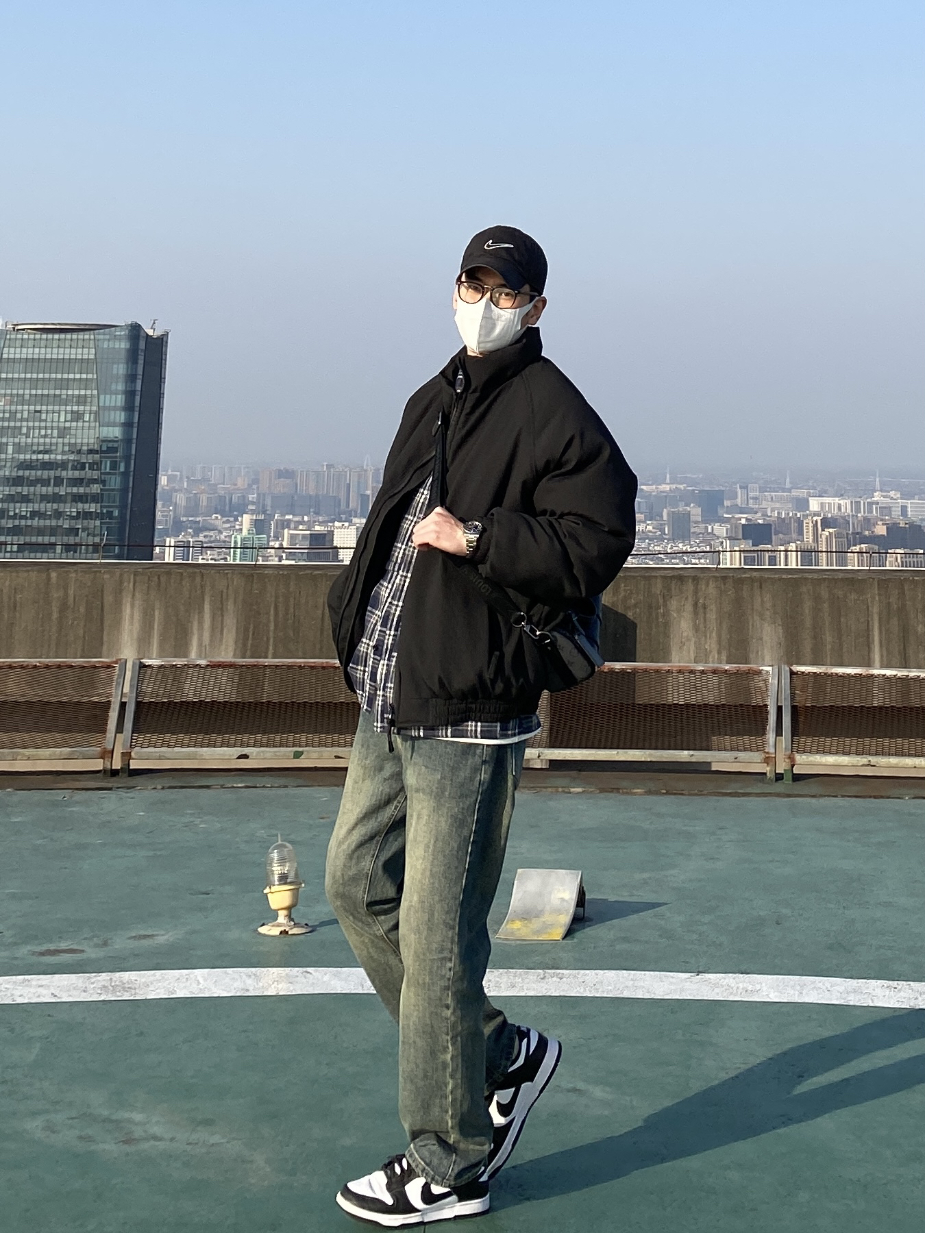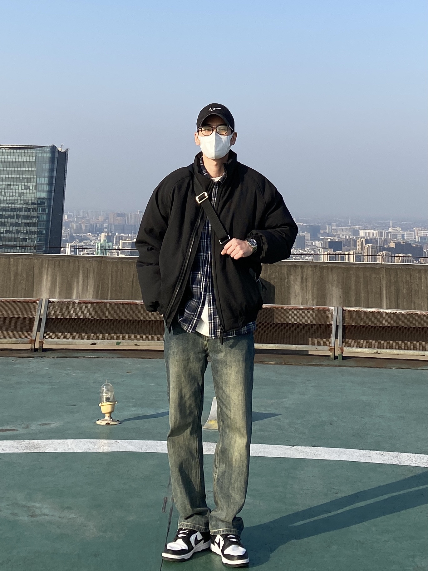 今天这套先用蓝色磨毛加绒格子衬衫做内搭,裤子选择不挑腿型的水洗直筒牛仔裤,鞋子上脚经典百搭的黑白熊猫dunk,接着套上重磅宽松阔版插肩袖立领棉服,最后背一个精致的皮质斜挎包,OK,出门看看搭配效果吧! - 今日穿搭 衣服裤子:NICE LILI 鞋子:NIKE DUNK黑白