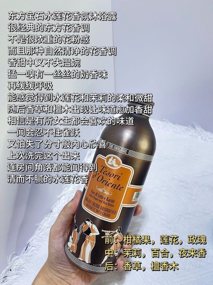 本篇笔记关联了Tesori d’Oriente/东方宝石 香氛沐浴露 滋润嫩肤 白麝香 水莲花 海洋香型等商品,为用户提供真实的使用体验和购买参考。