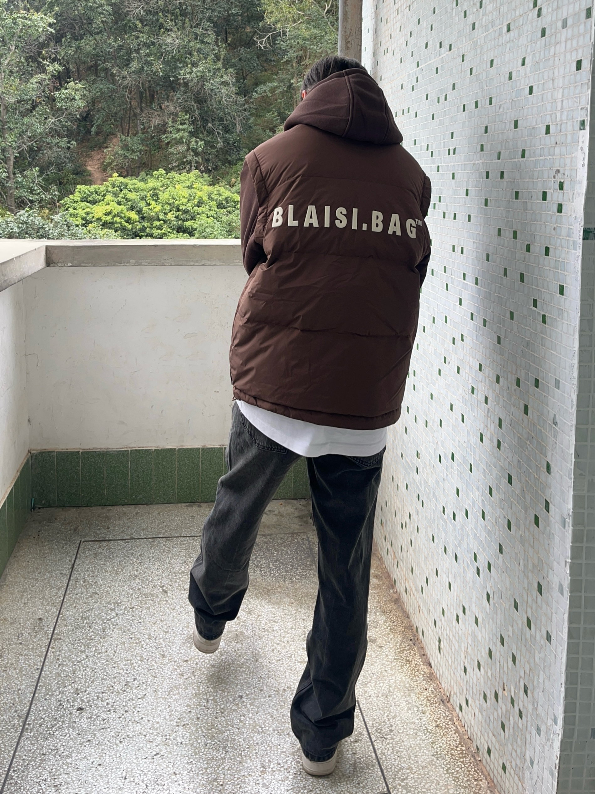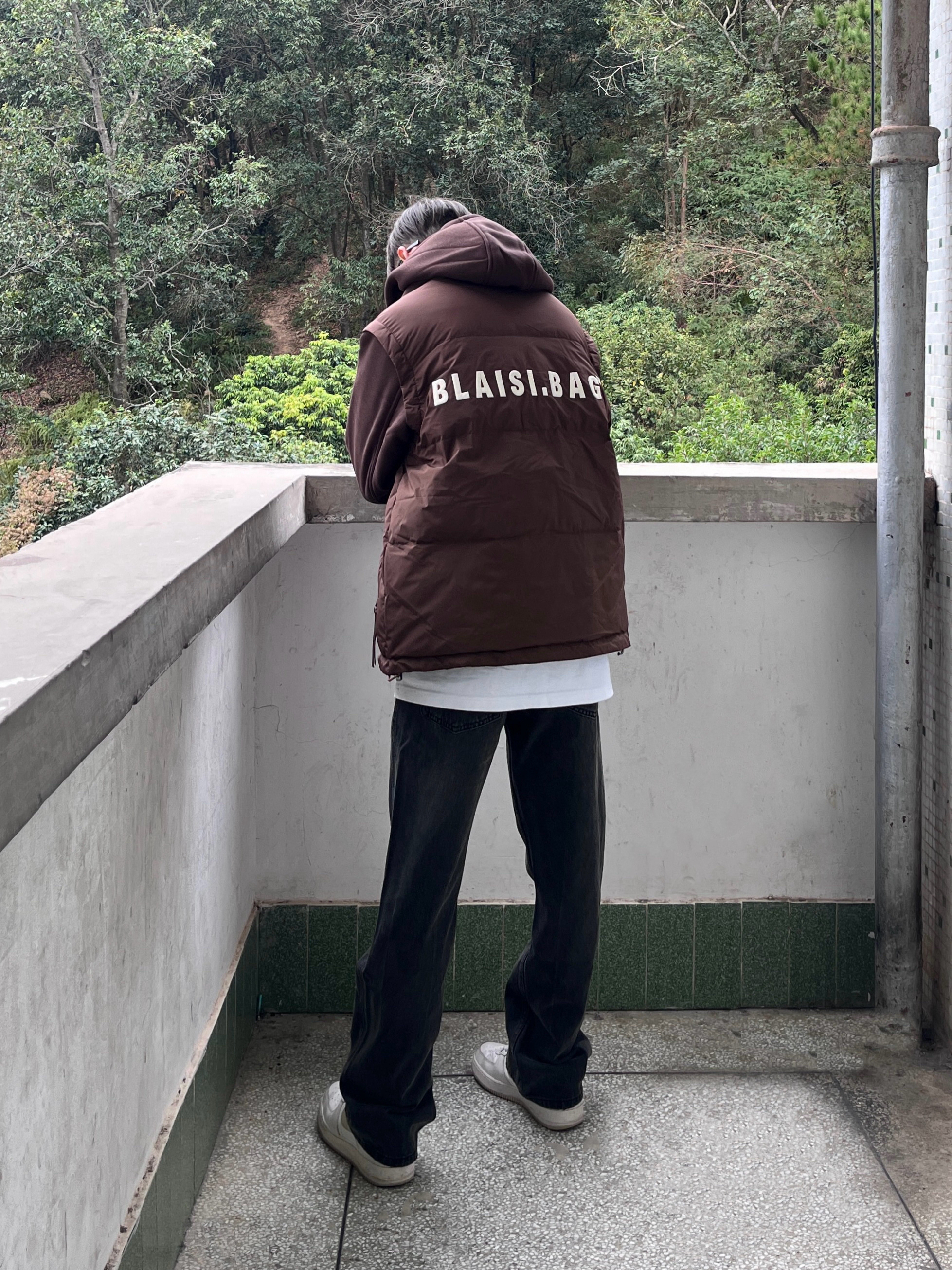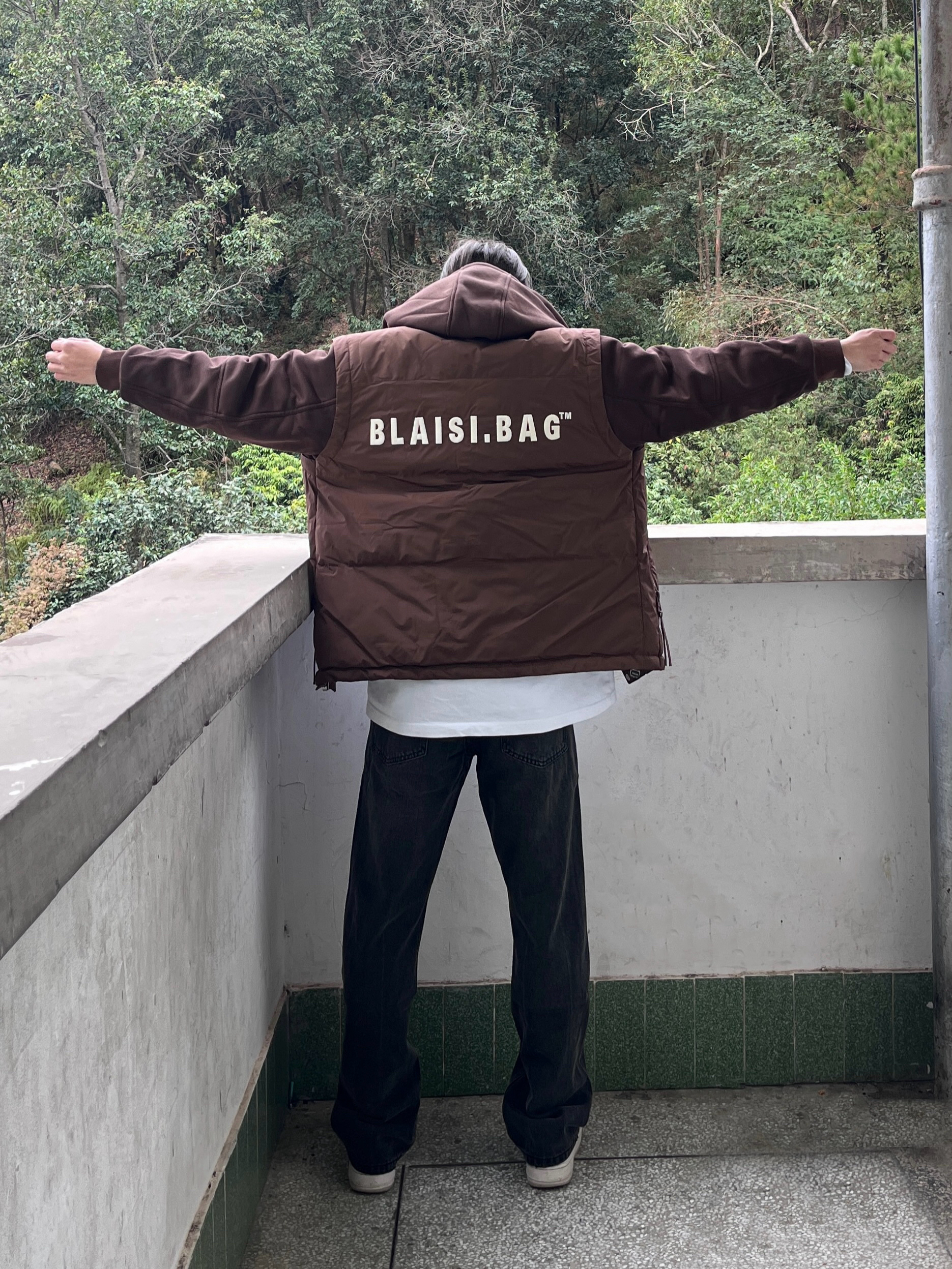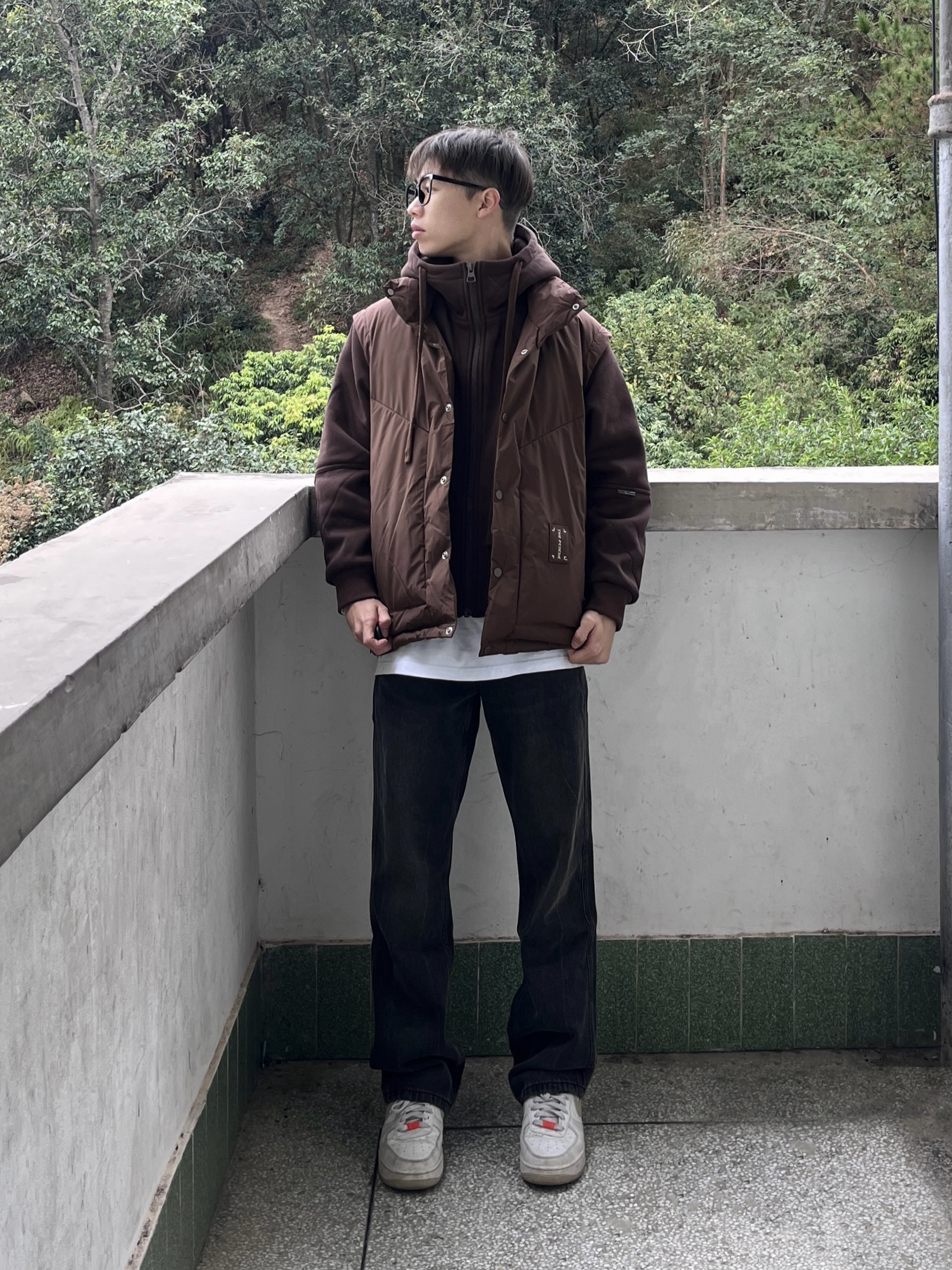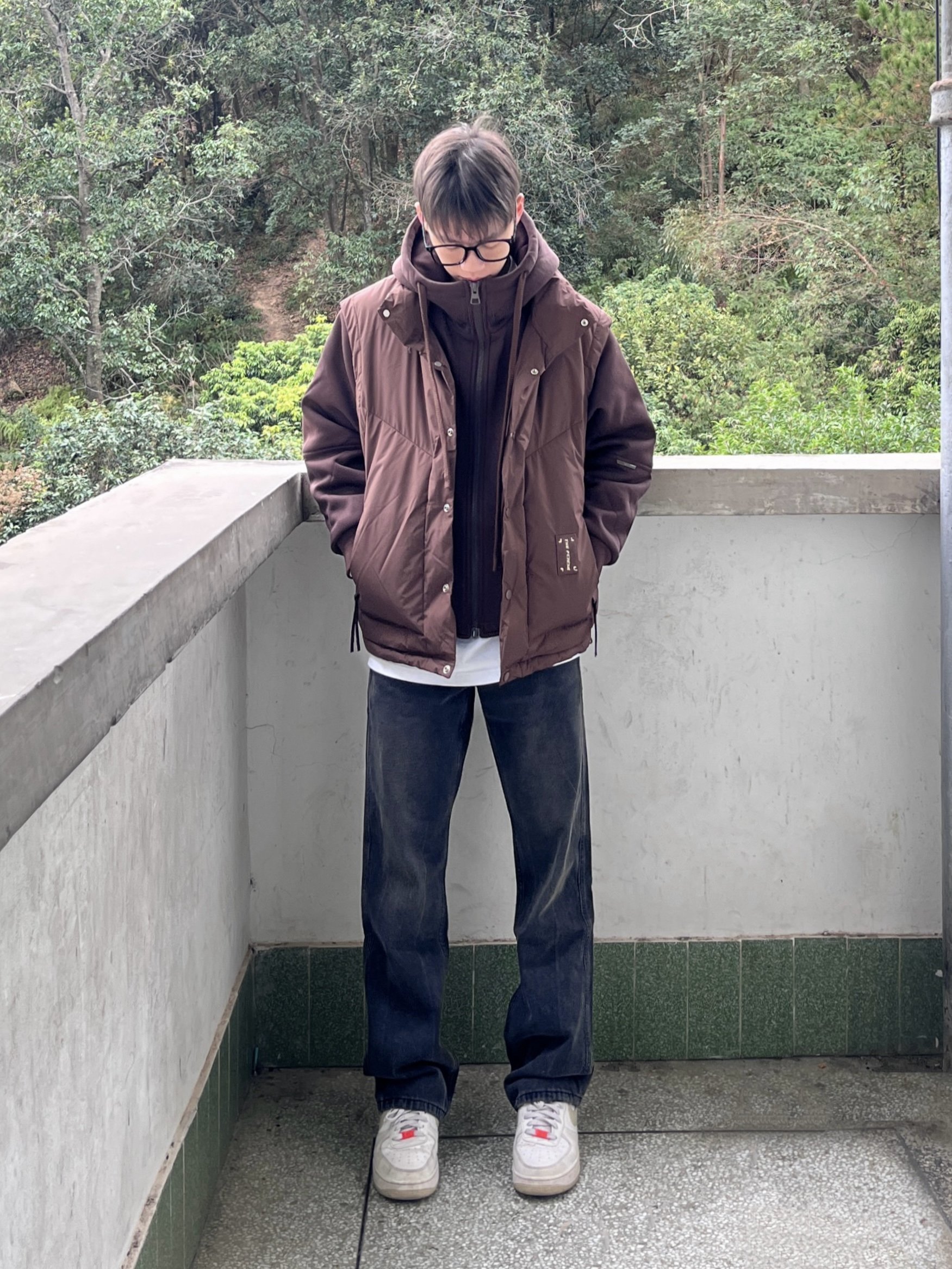 今日份穿搭look👀 衣服是咖啡色的潮款羽绒潮牌棉服 假两件的设计简约时尚 鸭绒量很足 穿上后保暖厚实 搭配上一条黑色美式微喇牛仔裤 版型宽松显瘦 再上脚一双经典白藤黄配色空军一号板鞋点缀 一套搭配下来 百搭又好看