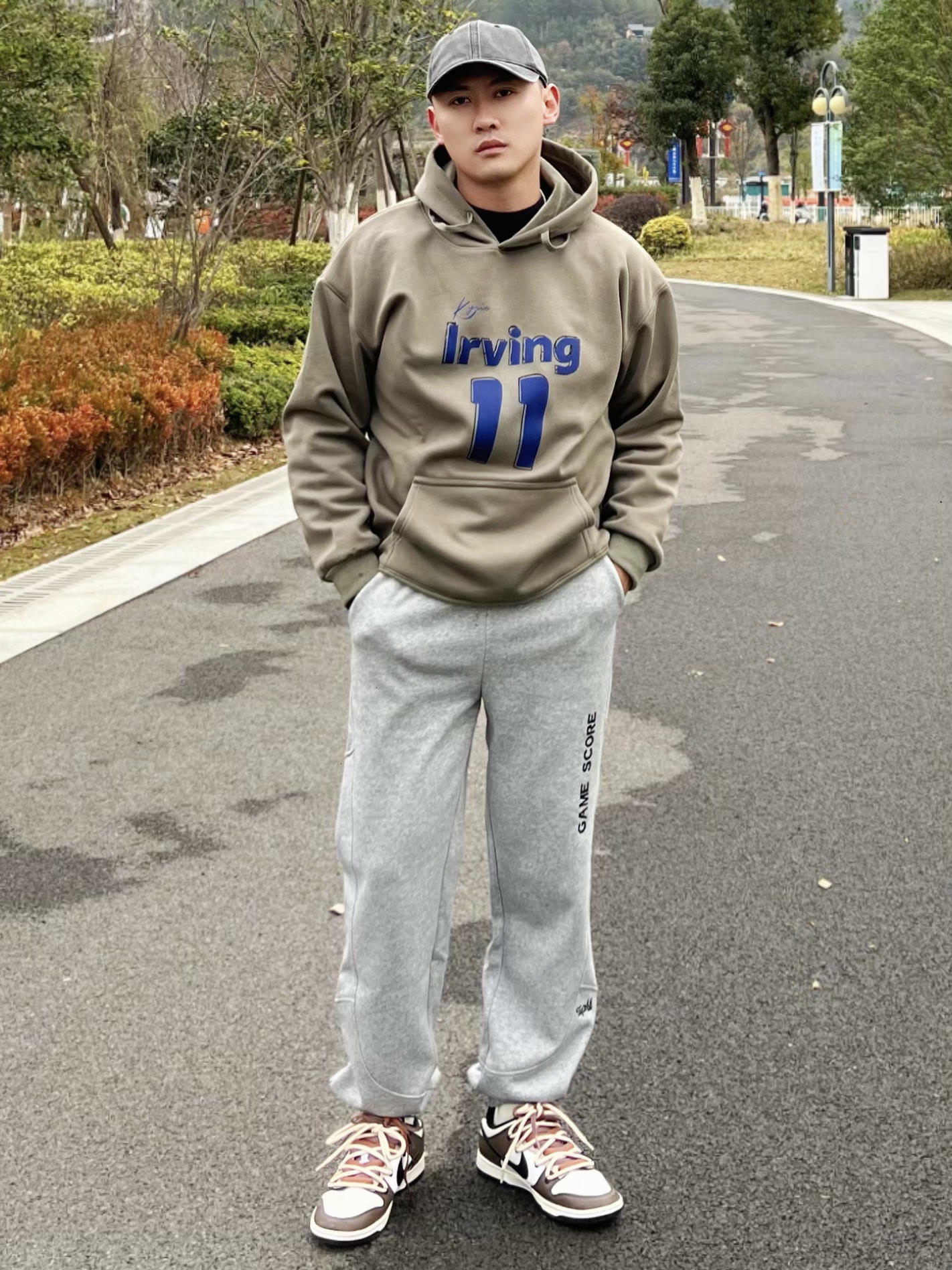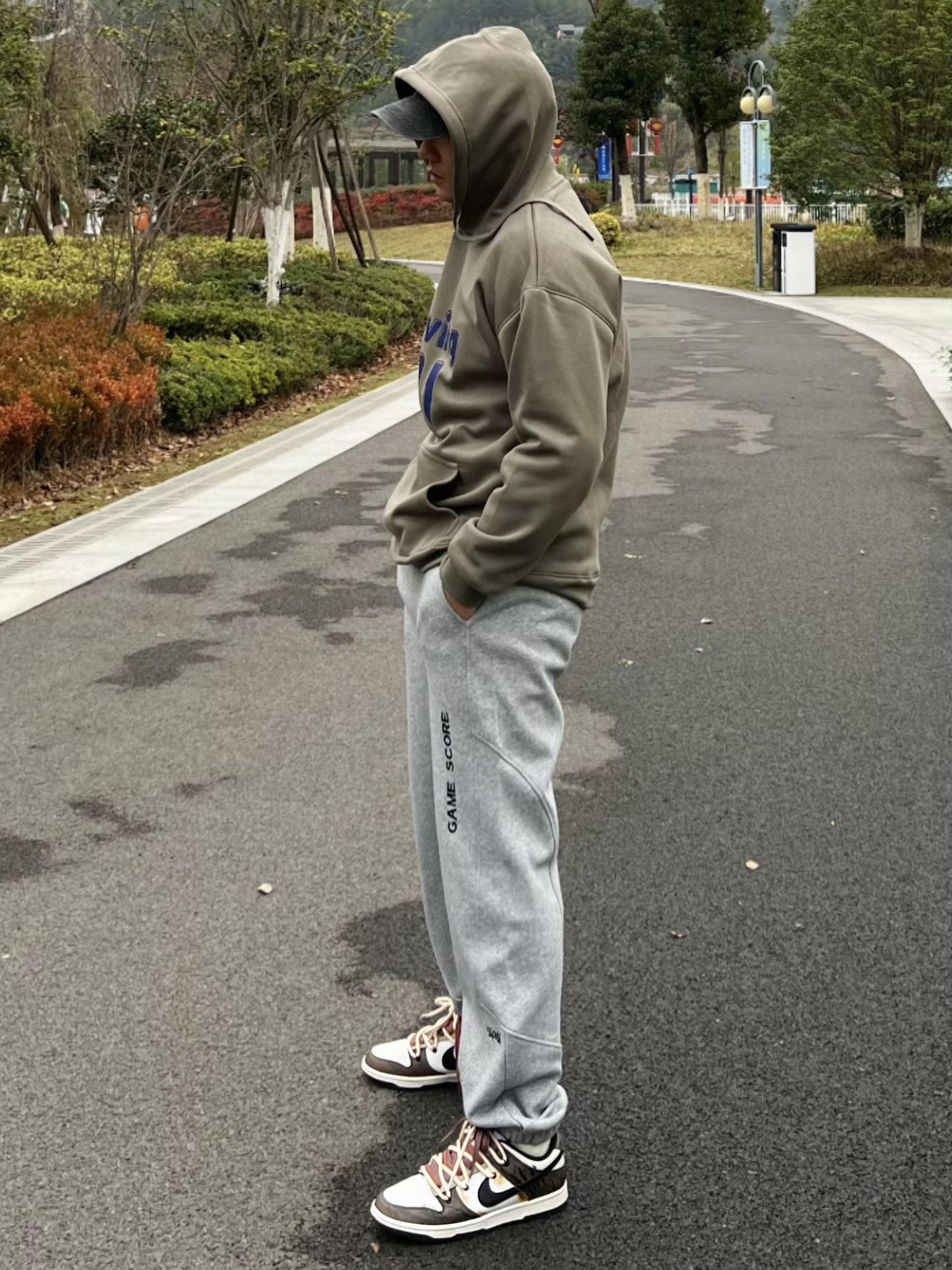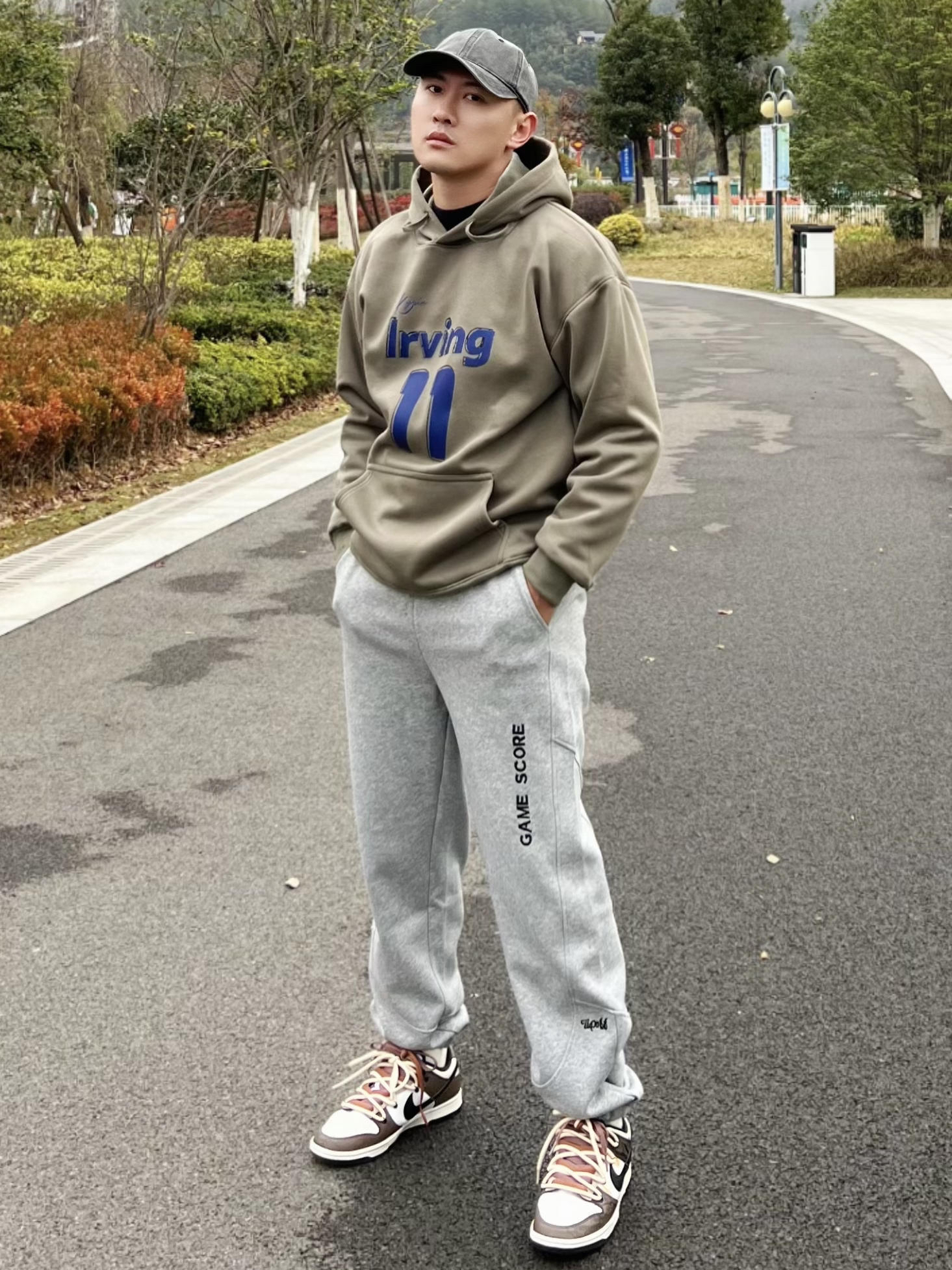 学了一年,袜子🧦扎裤脚这招实在不会 只能来点dunk压压惊了[RESPECT] 康康👀今日穿搭⬇️ 灰绿色欧文卫衣搭配浅灰色卫裤👖挺不错的 裤子比较厚也适合出门~ 冷的话加件羽绒服😜在外面也很不错呀! 半场3V3和没事儿投投篮我也这么穿。 👔/👖: TIP-OFF