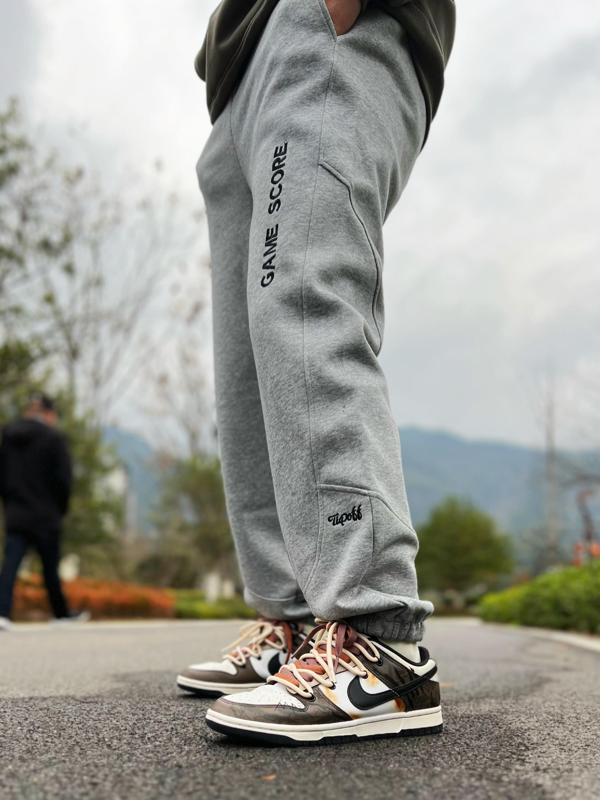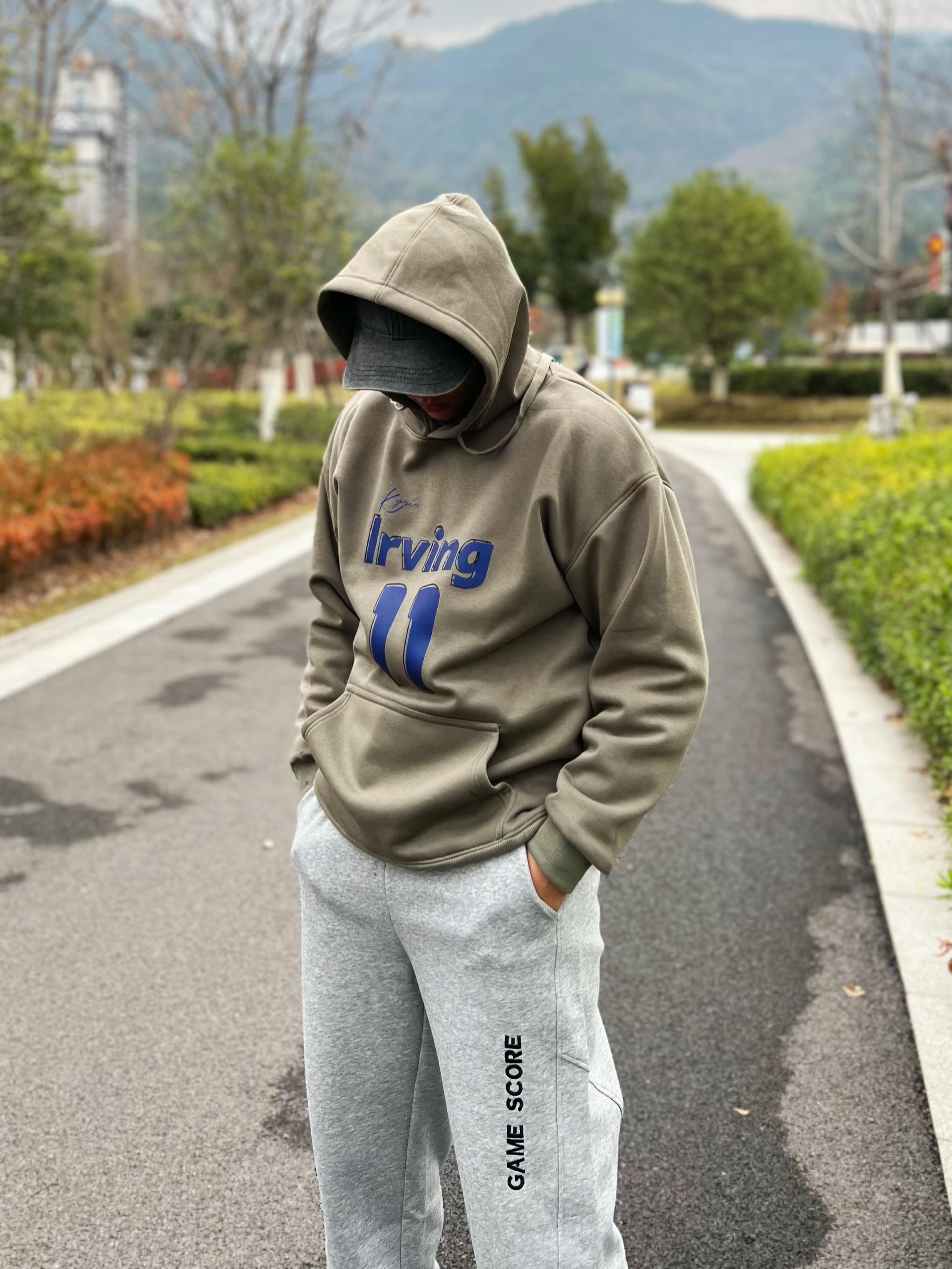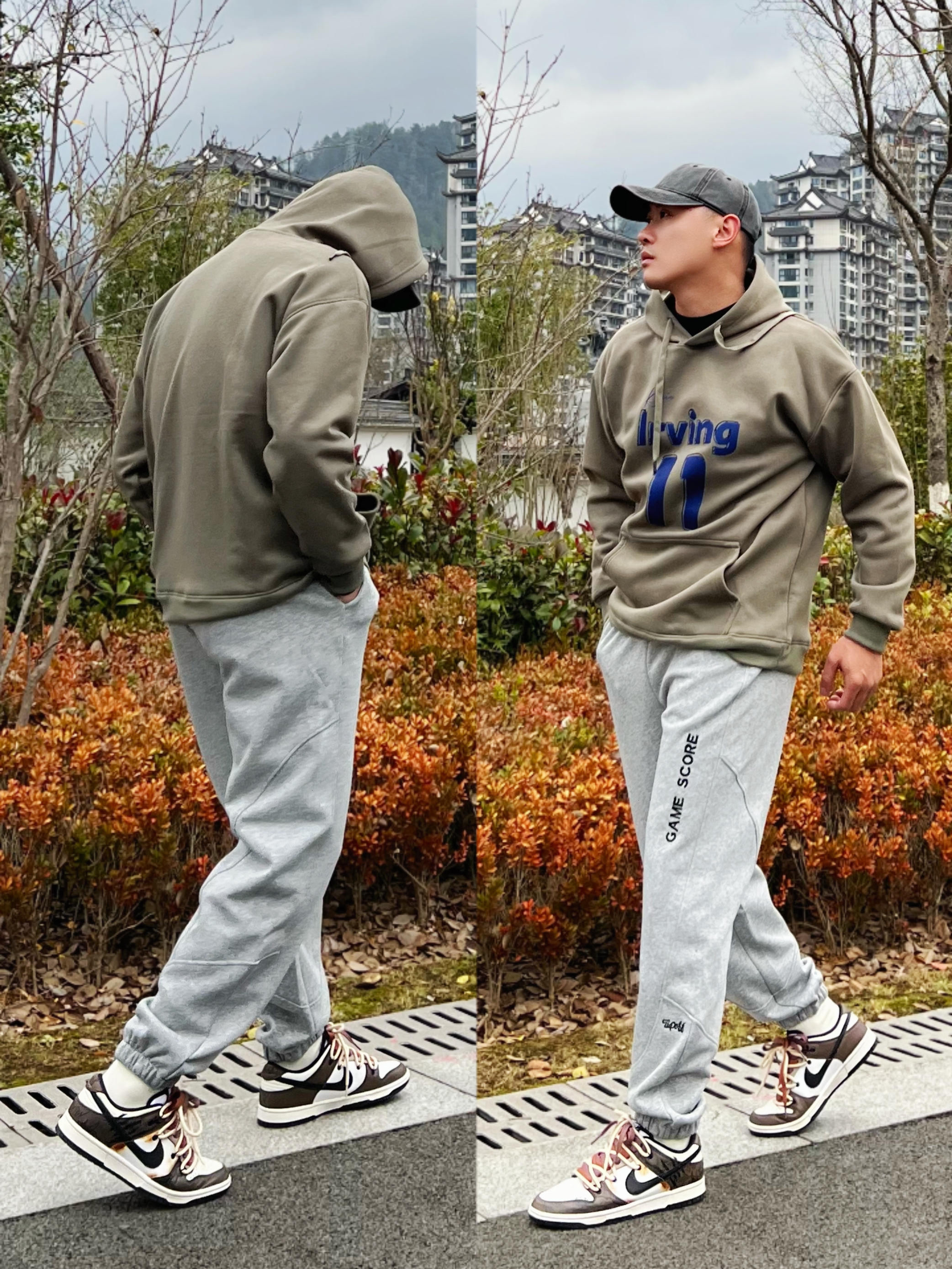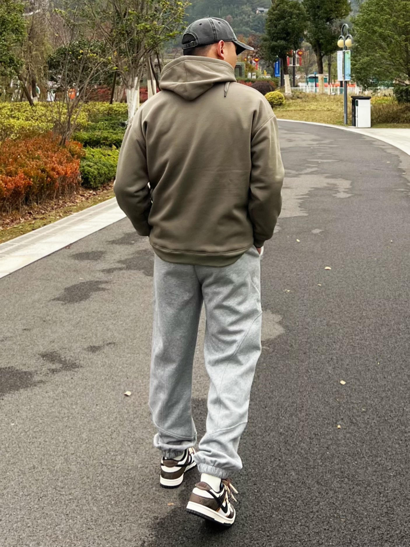 学了一年,袜子🧦扎裤脚这招实在不会 只能来点dunk压压惊了[RESPECT] 康康👀今日穿搭⬇️ 灰绿色欧文卫衣搭配浅灰色卫裤👖挺不错的 裤子比较厚也适合出门~ 冷的话加件羽绒服😜在外面也很不错呀! 半场3V3和没事儿投投篮我也这么穿。 👔/👖: TIP-OFF