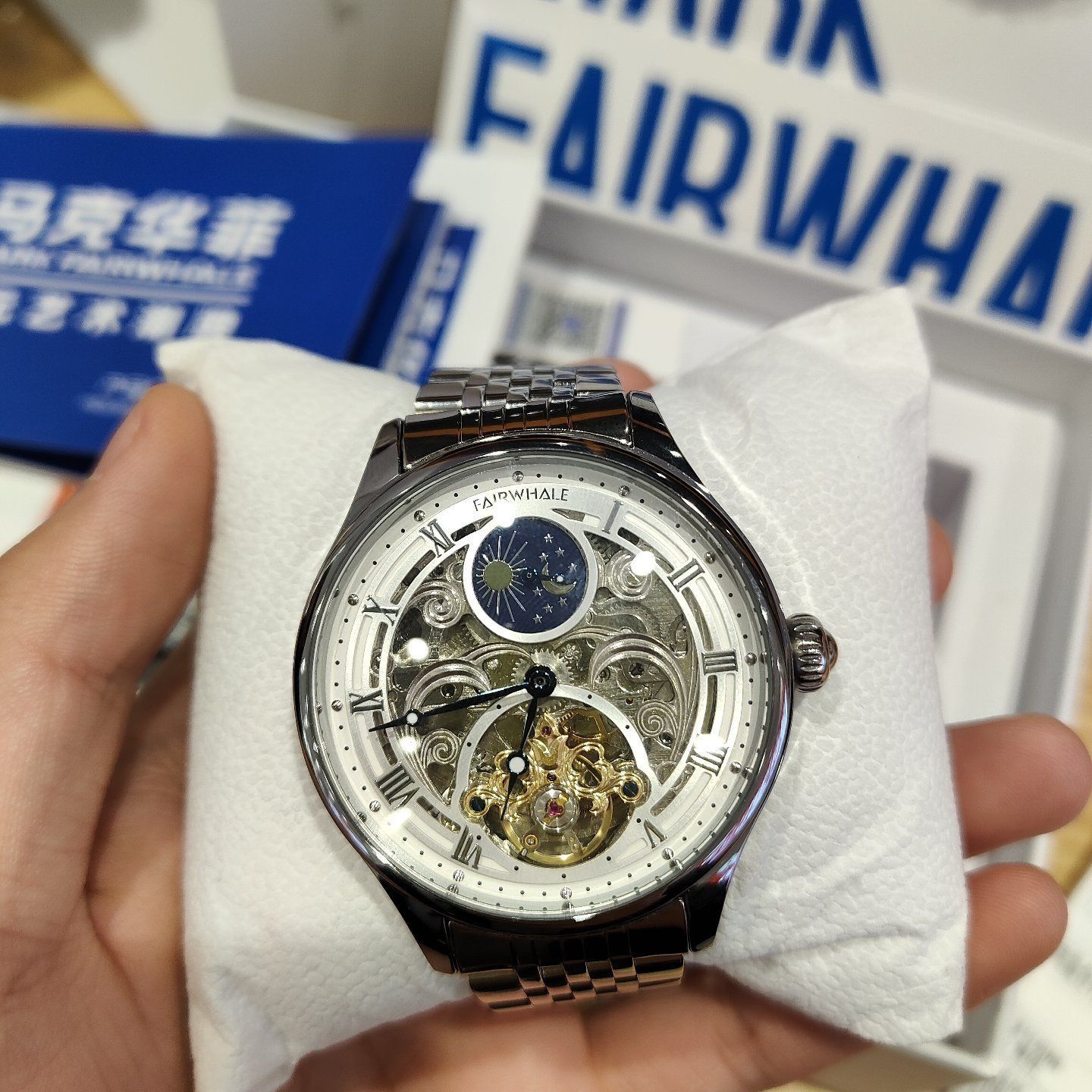 本篇笔记关联了Mark Fairwhale/马克华菲 日月星辰多层次镂空陀飞轮大表盘精钢雕花夜光防水自动机械男士手表 银壳白面钢带 等商品,为用户提供真实的使用体验和购买参考。