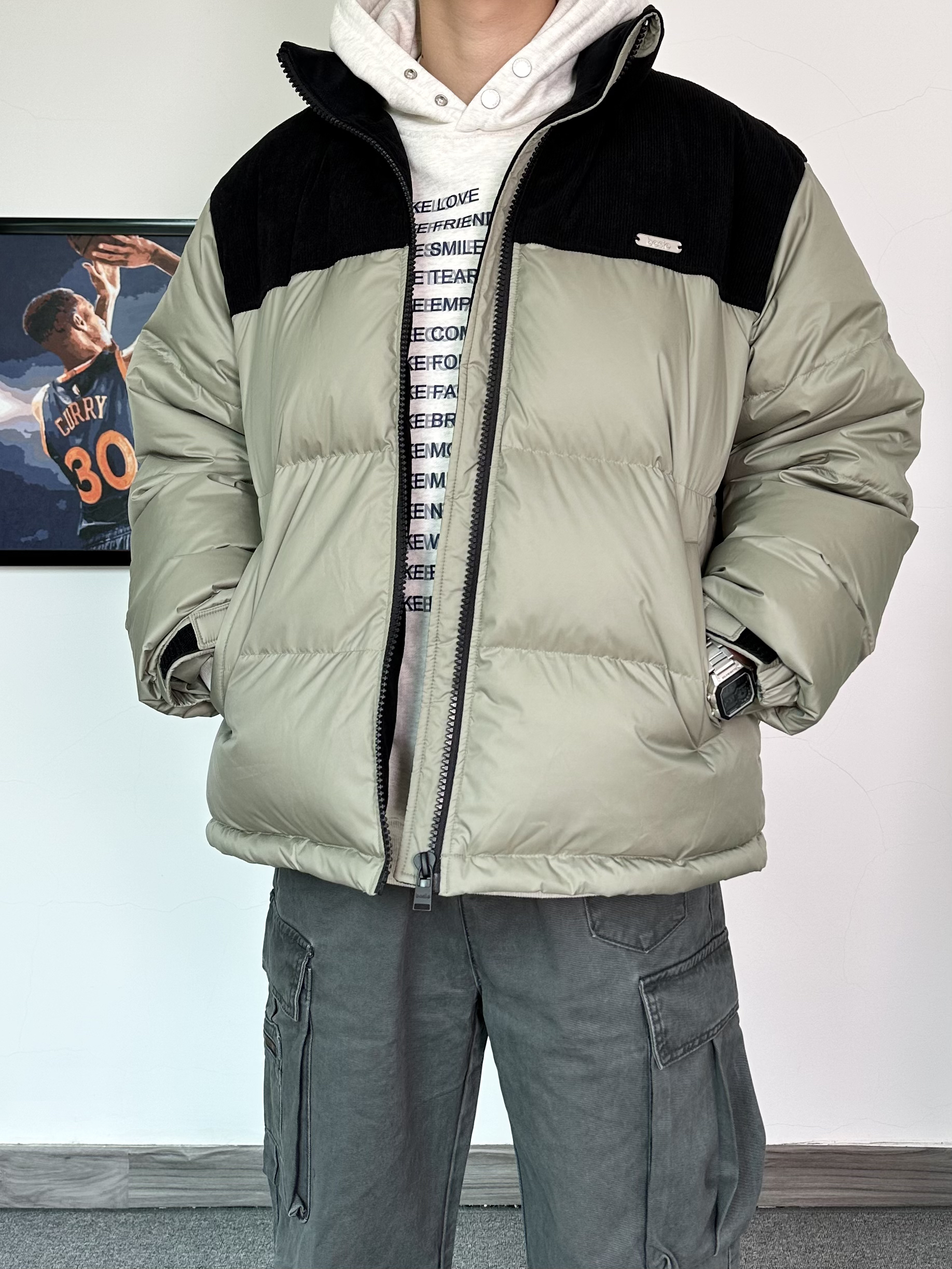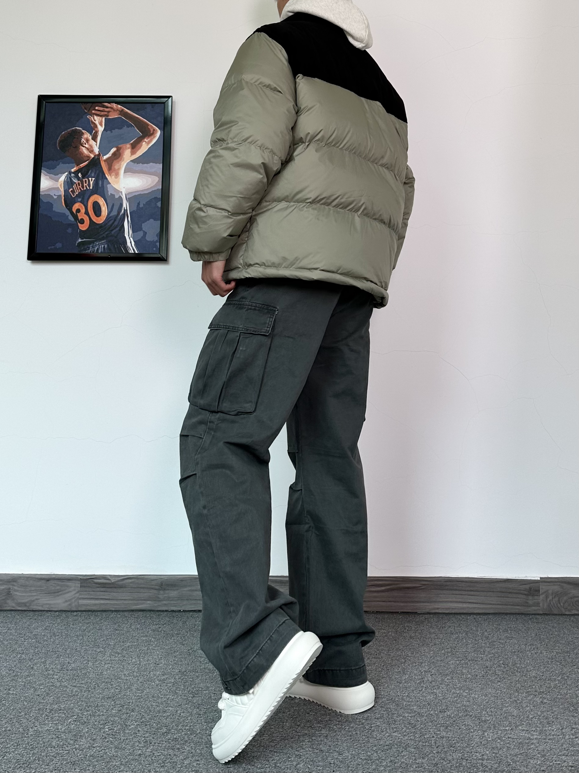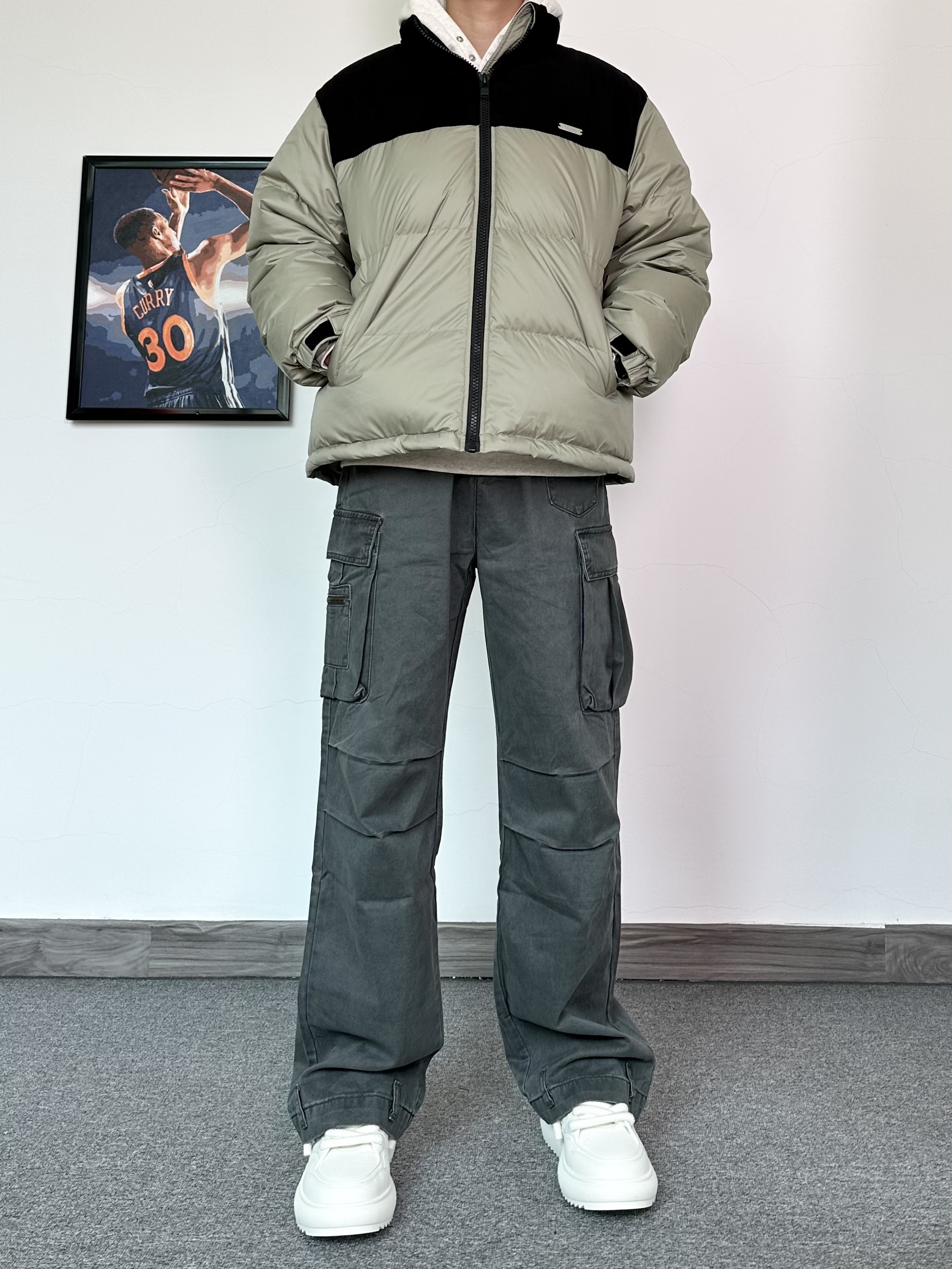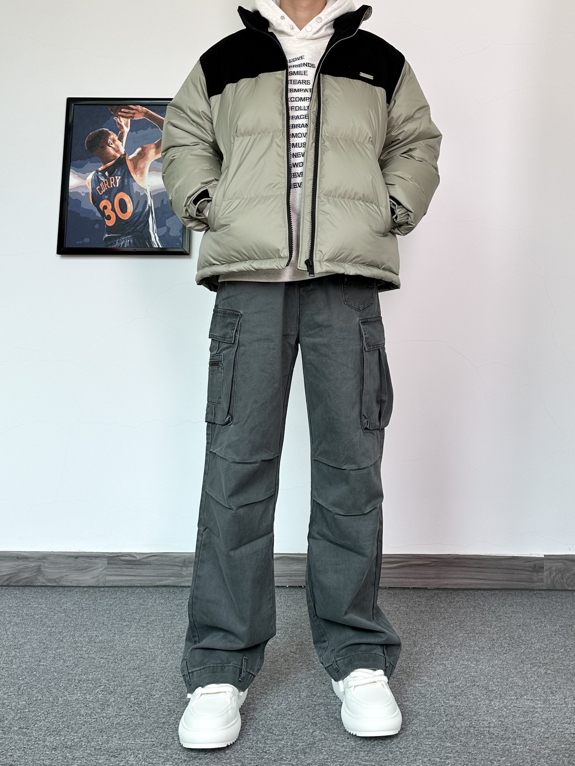 经典的拼接配色羽绒服 上身效果真的很绝肩部灯芯绒材质 拼接羽绒设计感十足 整体的蓬松度很不错,立体饱满!内搭一件连帽卫衣,叠穿yyds搭配一条同色系的阔腿工装裤 膝盖位置还有褶皱设计,街头氛围感满满 最后再来一双纯白面包鞋 搭配工装裤还挺好看的,超轻厚底的设计 让你高上几公分 对矮个子太友好啦!