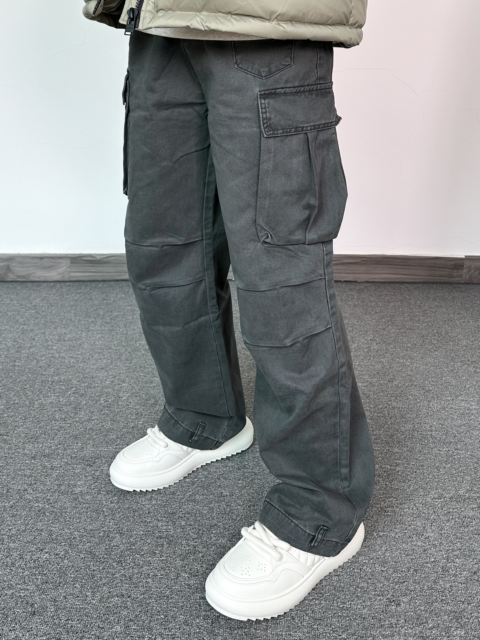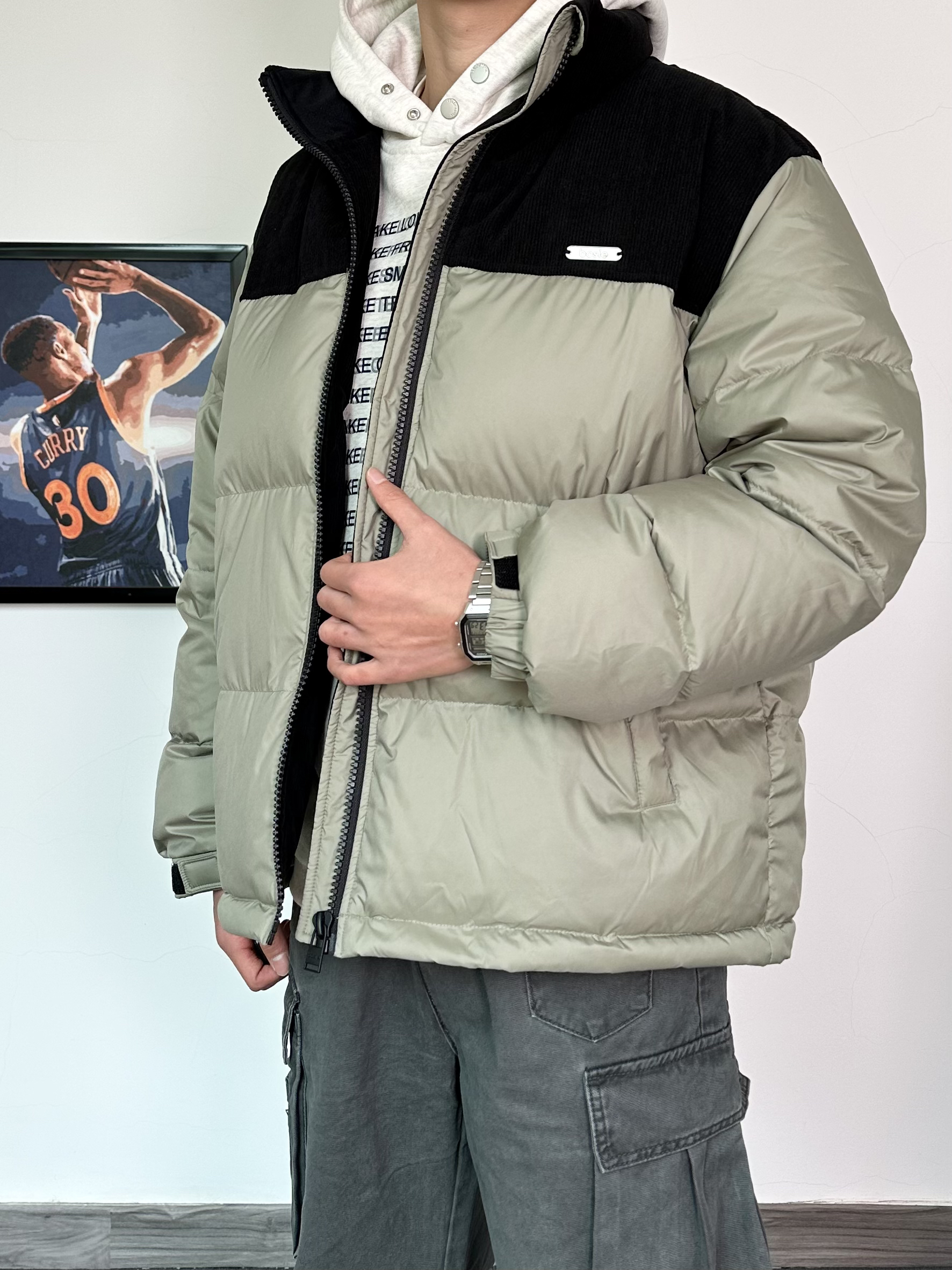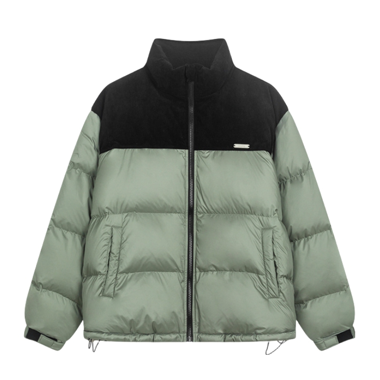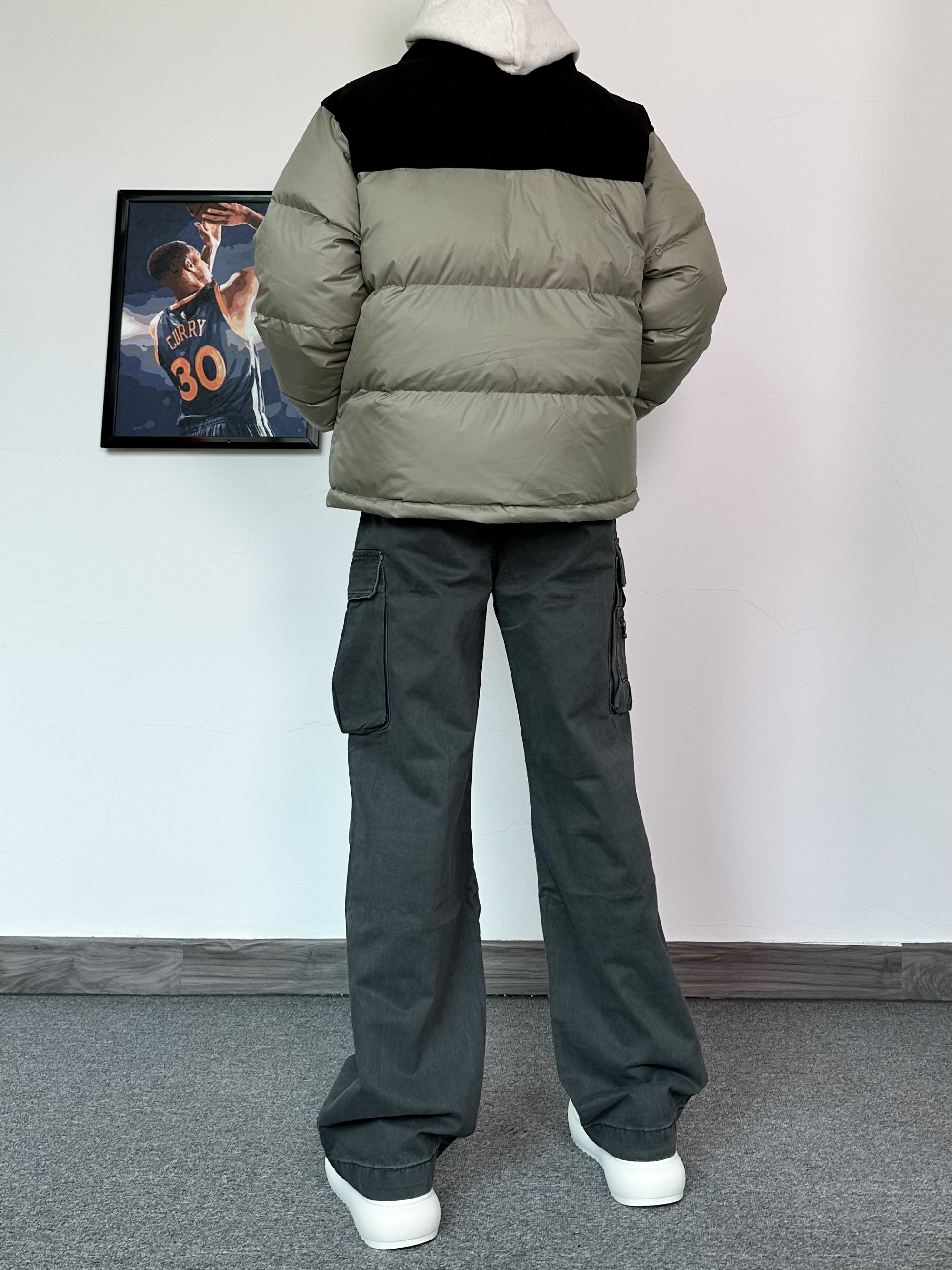 经典的拼接配色羽绒服 上身效果真的很绝肩部灯芯绒材质 拼接羽绒设计感十足 整体的蓬松度很不错,立体饱满!内搭一件连帽卫衣,叠穿yyds搭配一条同色系的阔腿工装裤 膝盖位置还有褶皱设计,街头氛围感满满 最后再来一双纯白面包鞋 搭配工装裤还挺好看的,超轻厚底的设计 让你高上几公分 对矮个子太友好啦!
