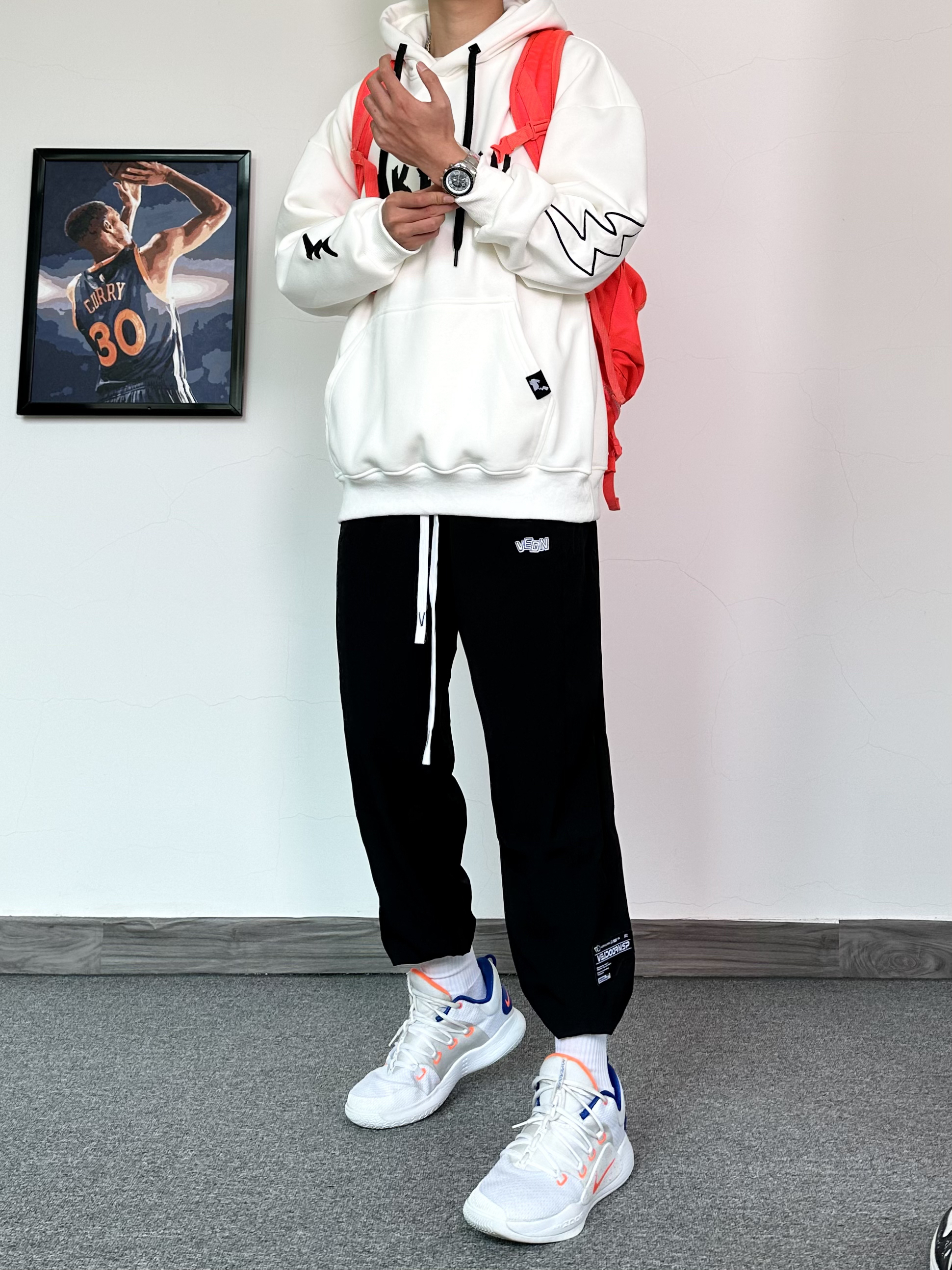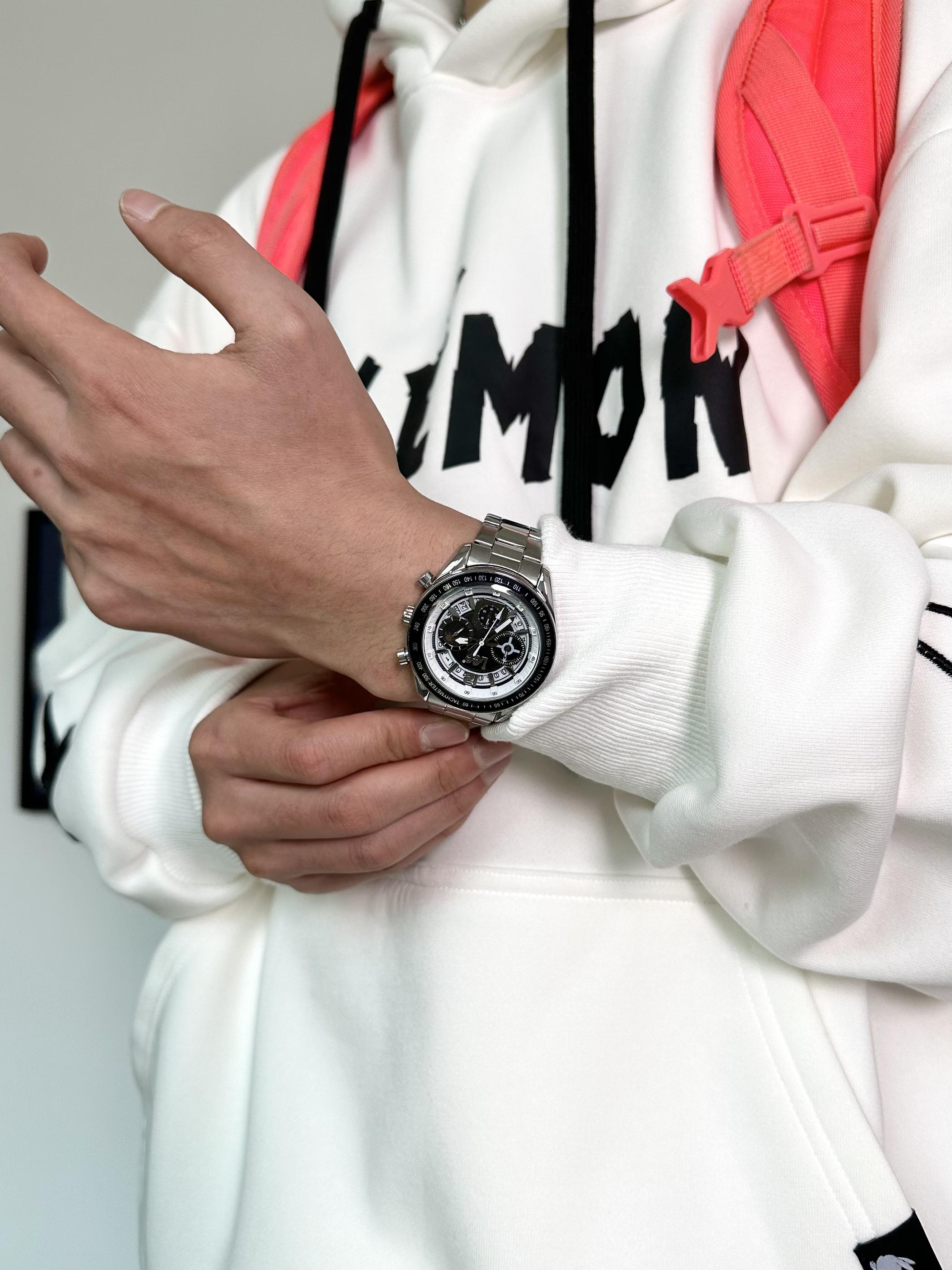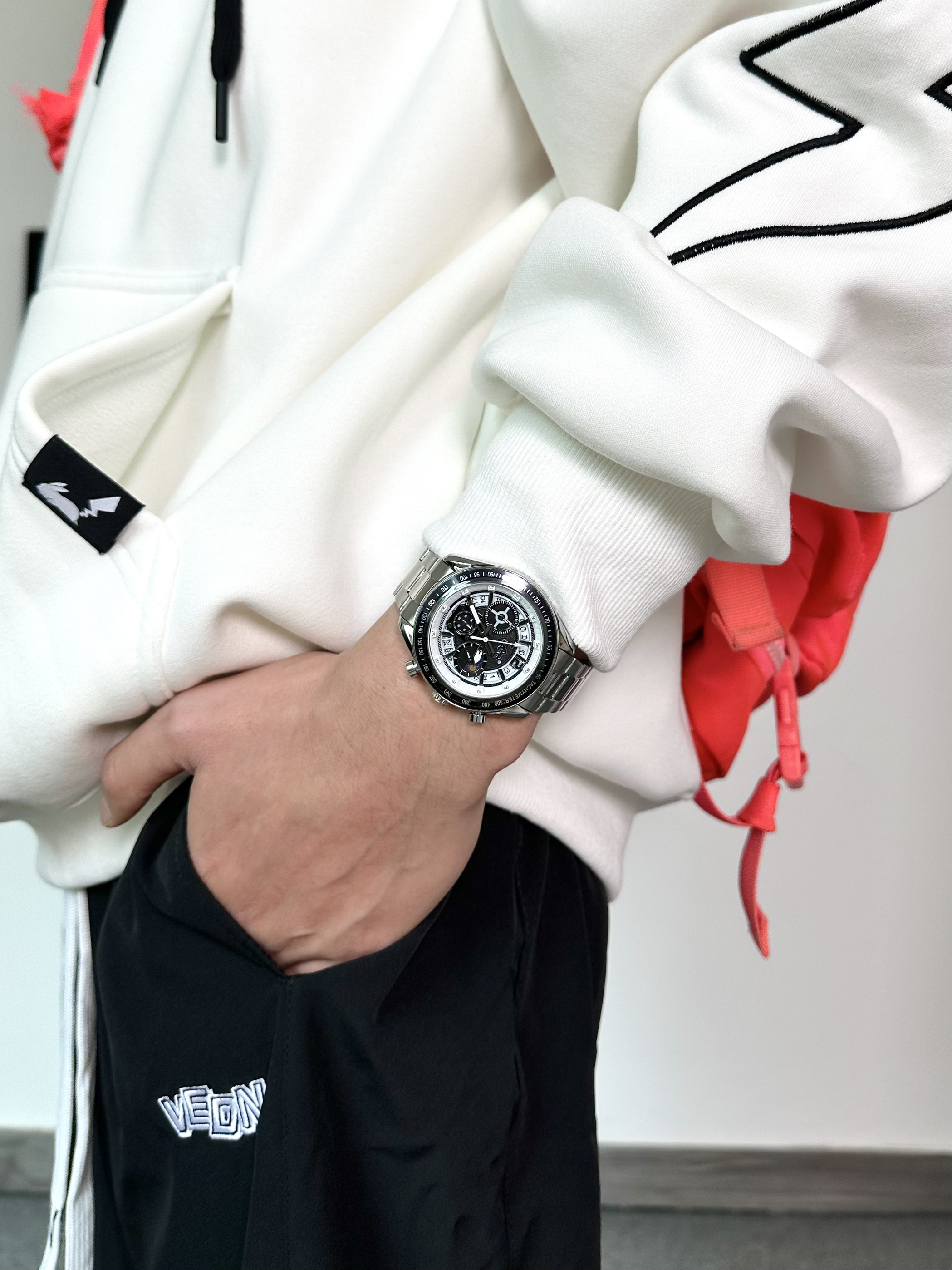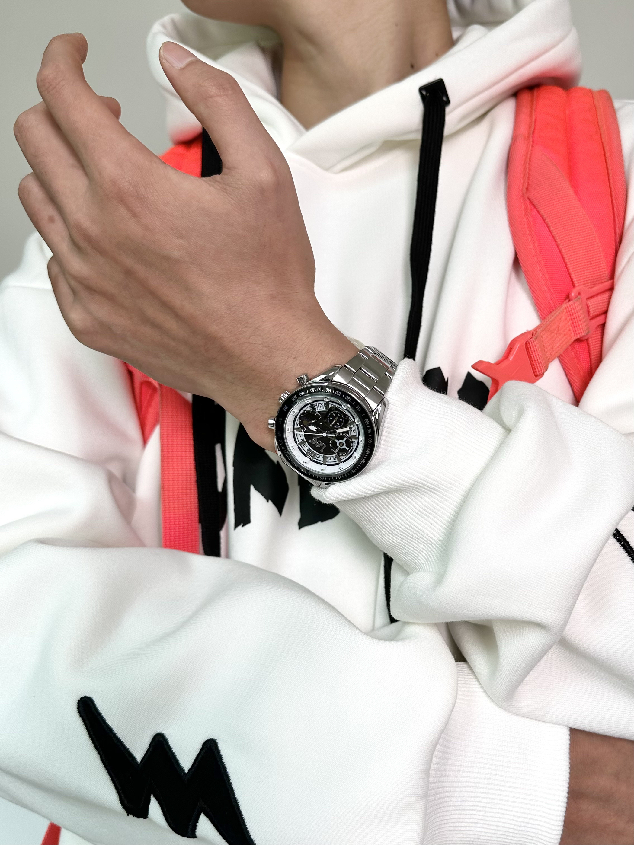今天一身运动风美式穿搭 重磅卫衣➕运动卫裤➕运动鞋尊嘟很爱 配饰方面一定不能忽略了 精心挑选了一款石英腕表,真的很帅! 跟今天这一身穿搭好配 黑色的表盘搭配上银色的钢带质感满满 表盘的细节设计颜值拉满~ 穿搭选择一身黑白搭配,和手表很搭 整体的搭配契合度还是不错的,冬天这样穿准没错儿!