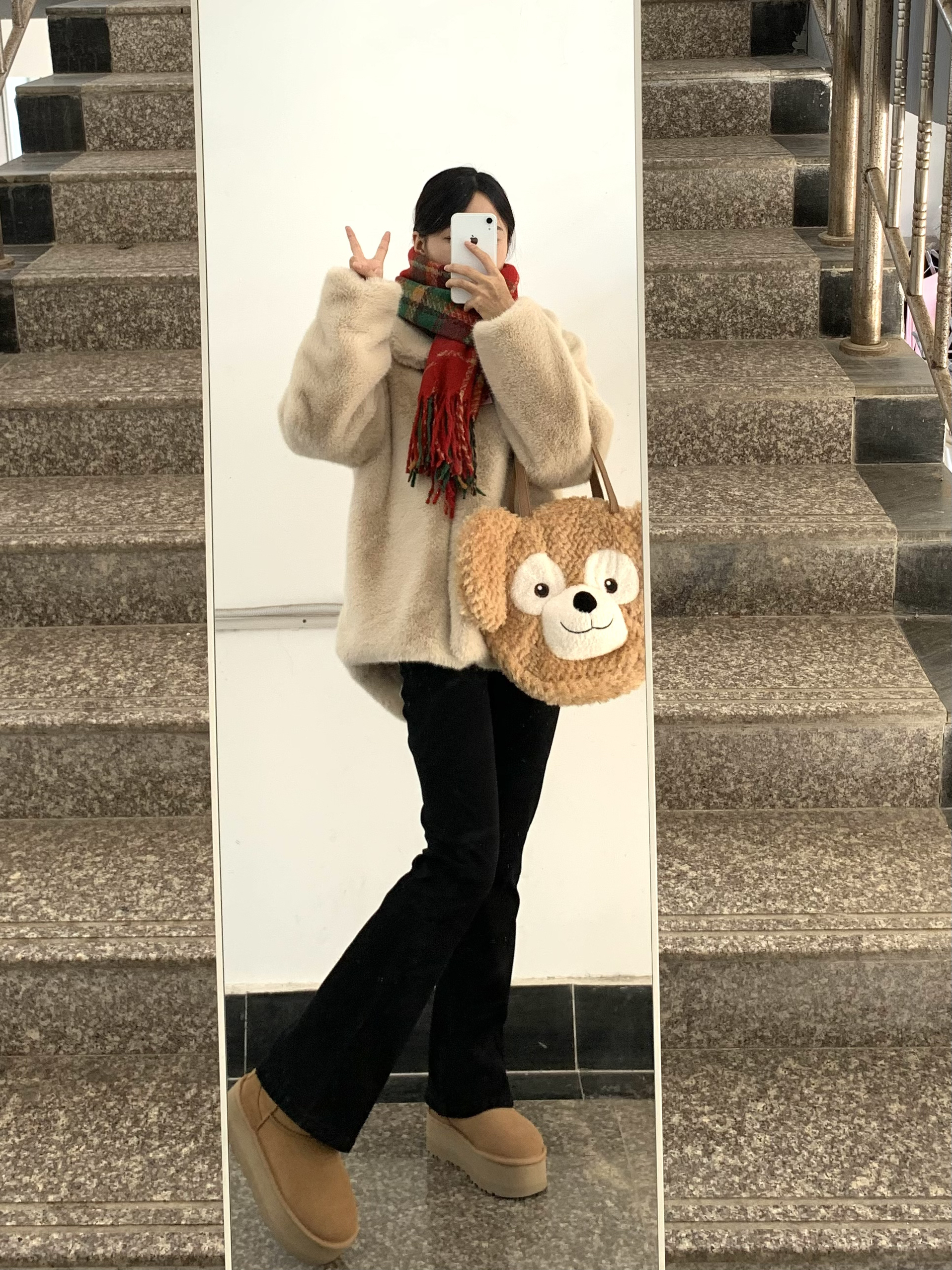 身高|体重:160 88 穿搭风格:日常休闲风 👔 上衣:今天的上衣穿的是一件毛茸茸外套,面料很柔软,特别舒服,整体也很好看,版型特别好!买回来的时候就很惊喜~ 👖 下装:黑色喇叭裤真的很爱~穿上去显得腿又细又直,真的很喜欢穿! 👟 鞋子:搭配的是今年特别火的厚底靴!真的很百搭,搭配裤子裙子都可以~ 🎒配饰:围了一条围巾🧣然后搭配了大脸包,整体一套我真的很喜欢,早八党直接就可以出门!
