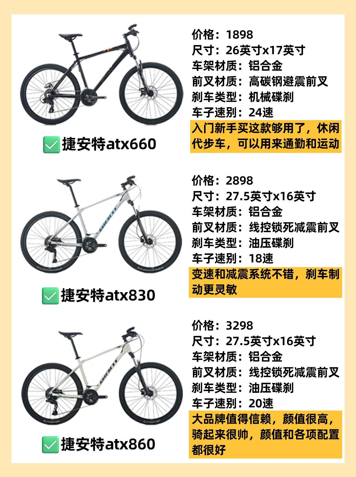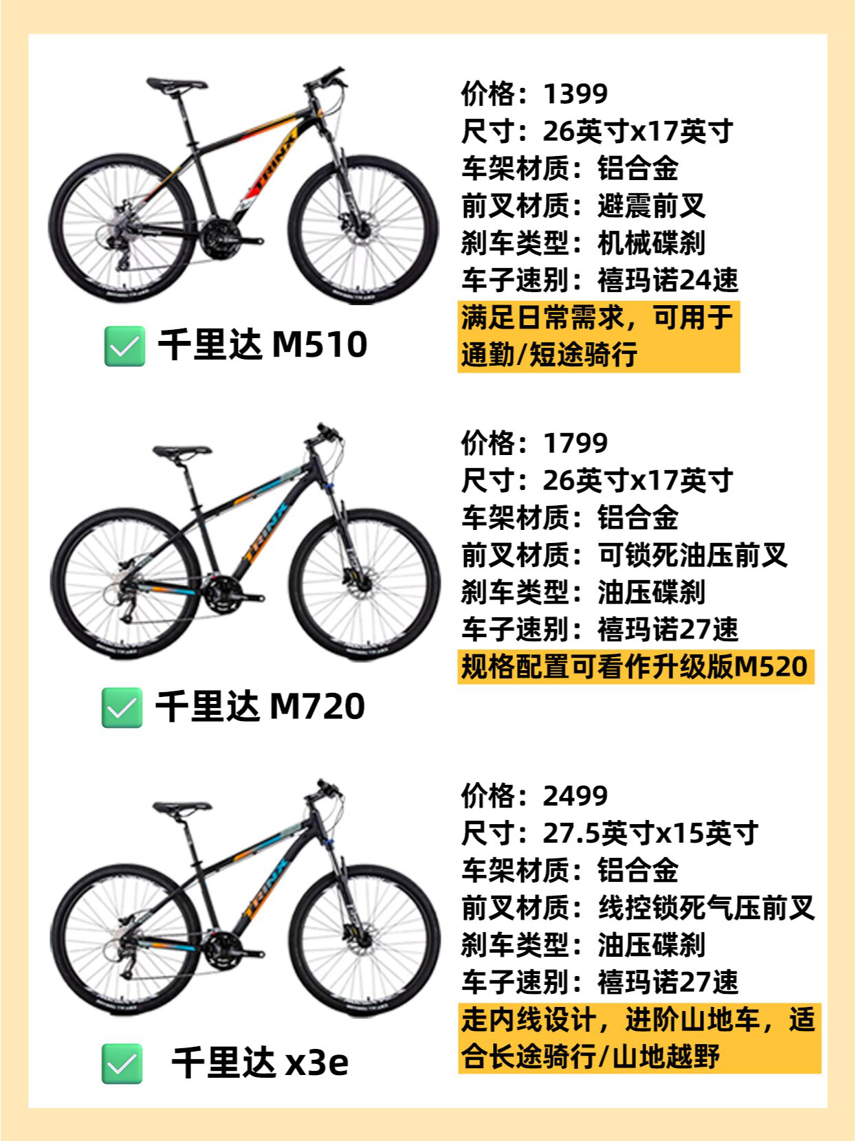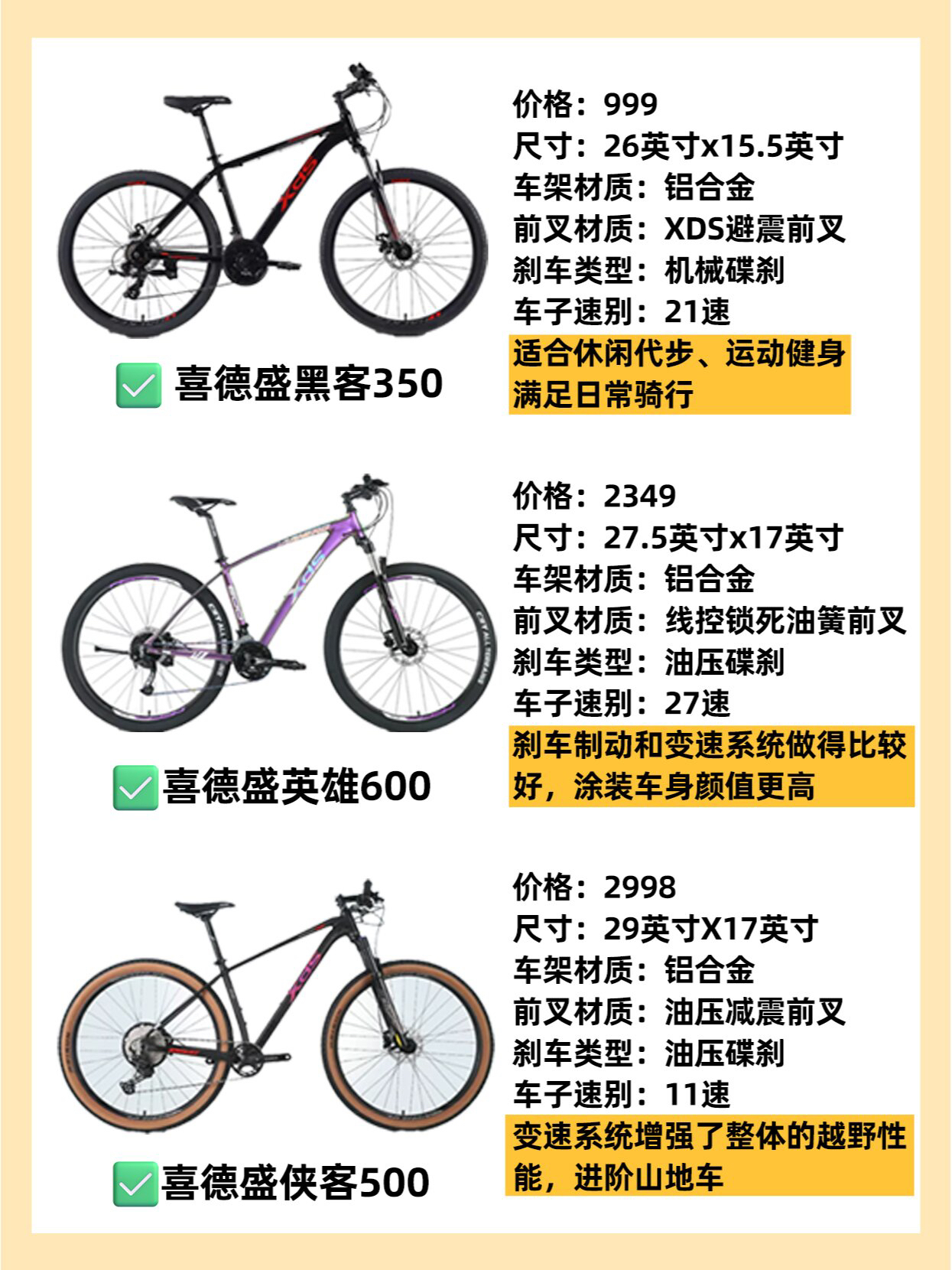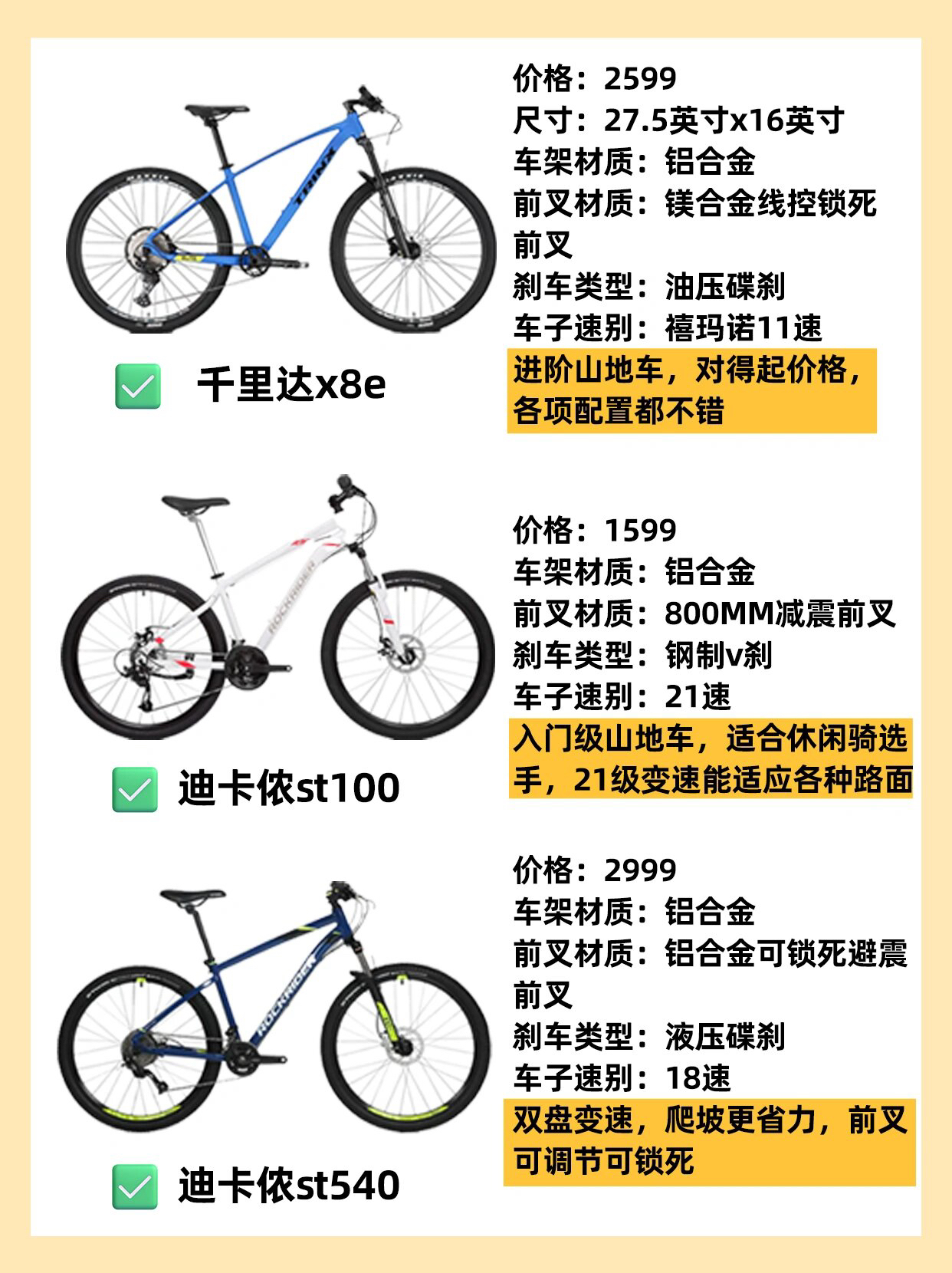🚴🏻♀️骑行圈目前是越来越火热啦,更多人体验到了骑行的快乐加入了骑行大家庭! 🙋🏻♀️那么骑行新手的第一辆山地车怎么选?如果是学生党的话,选择山地车是性价比比较高的,在一定的预算下可以有更多的选择范围,颜值也杠杠的~ 👉🏻今天和大家安利12款千元山地车,价格位于1000-3500不等,希望对大家有所帮助~ ①喜德盛黑客350(999) ②千里达 M510(1399) ③迪卡侬st100(159...