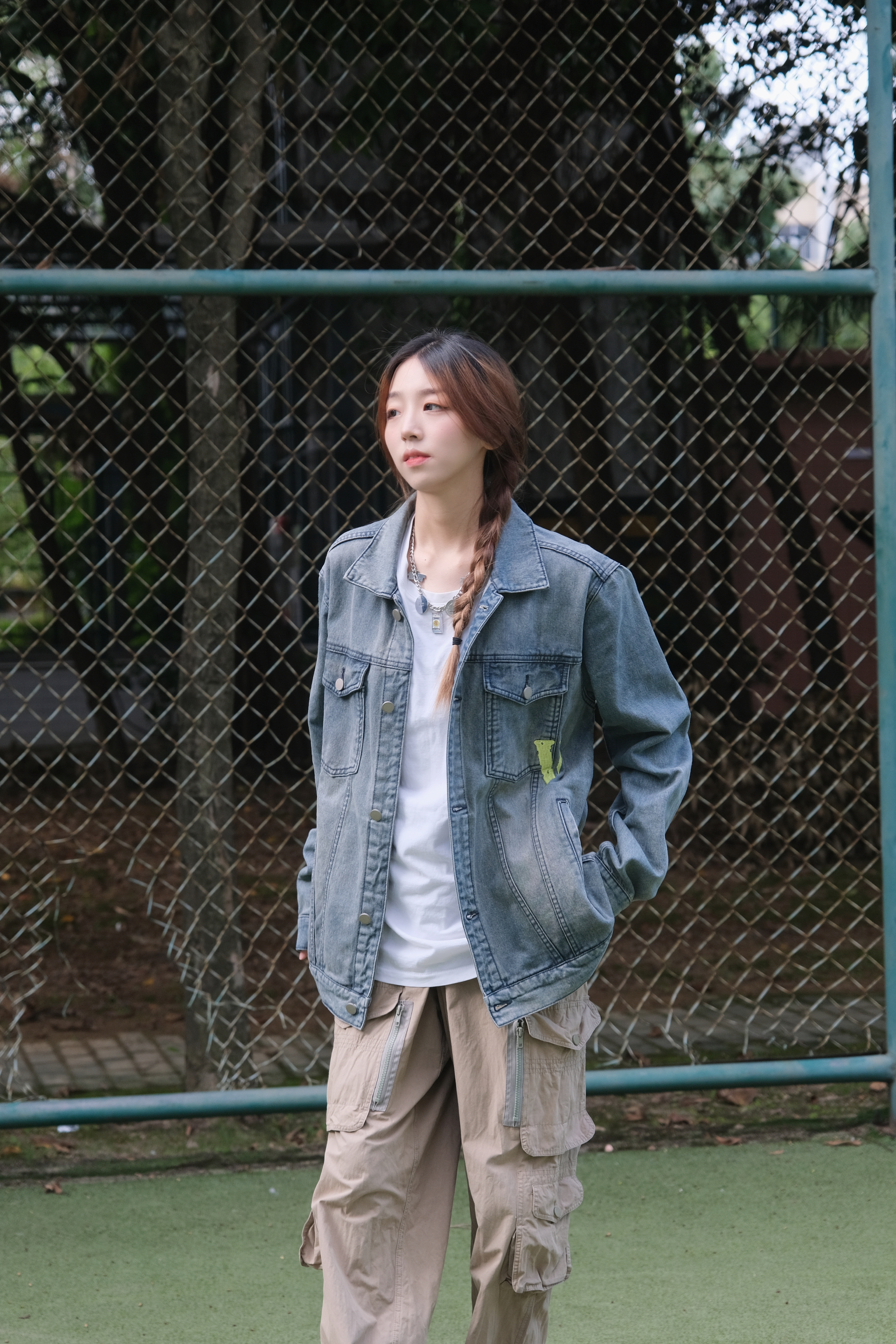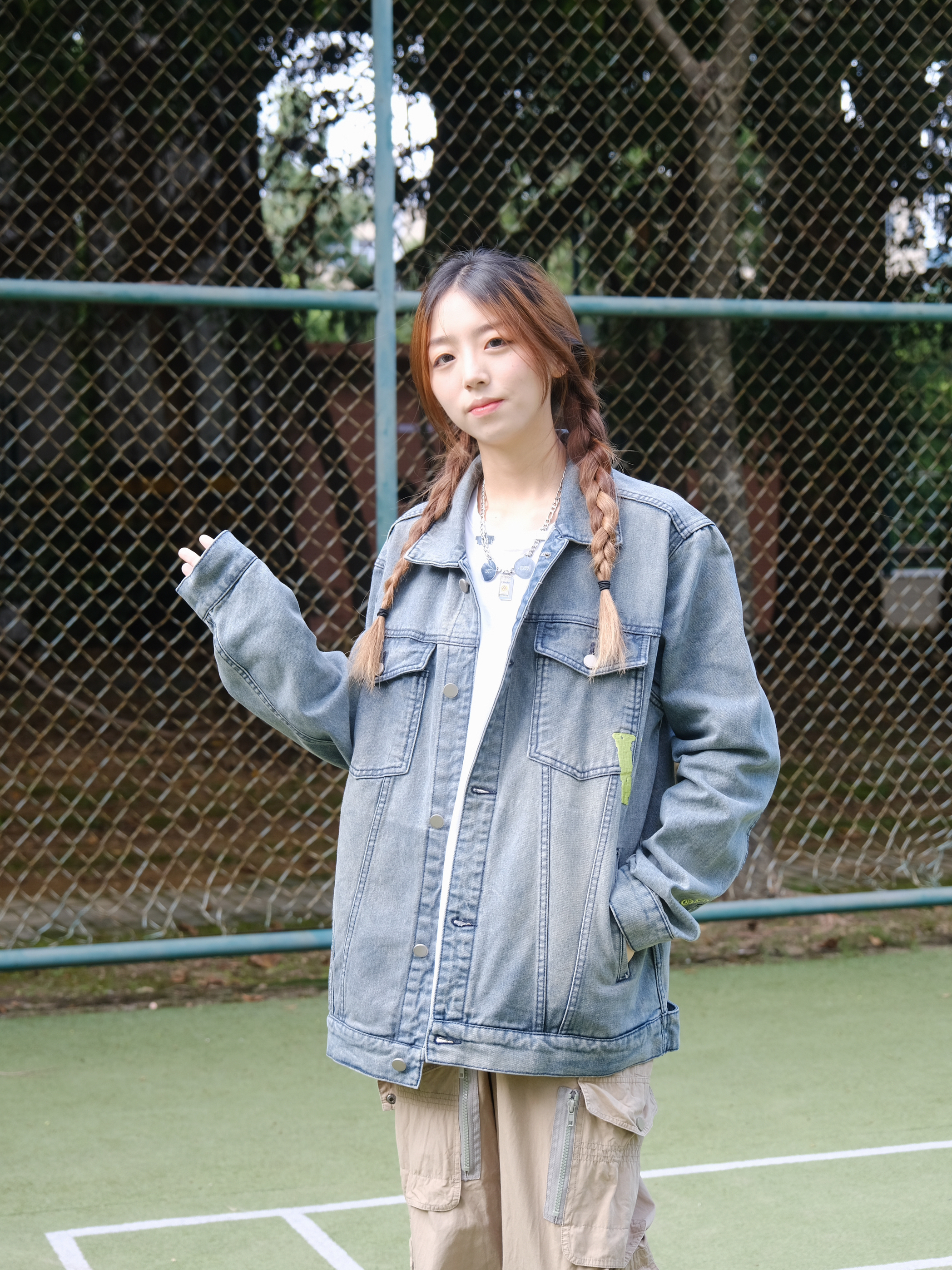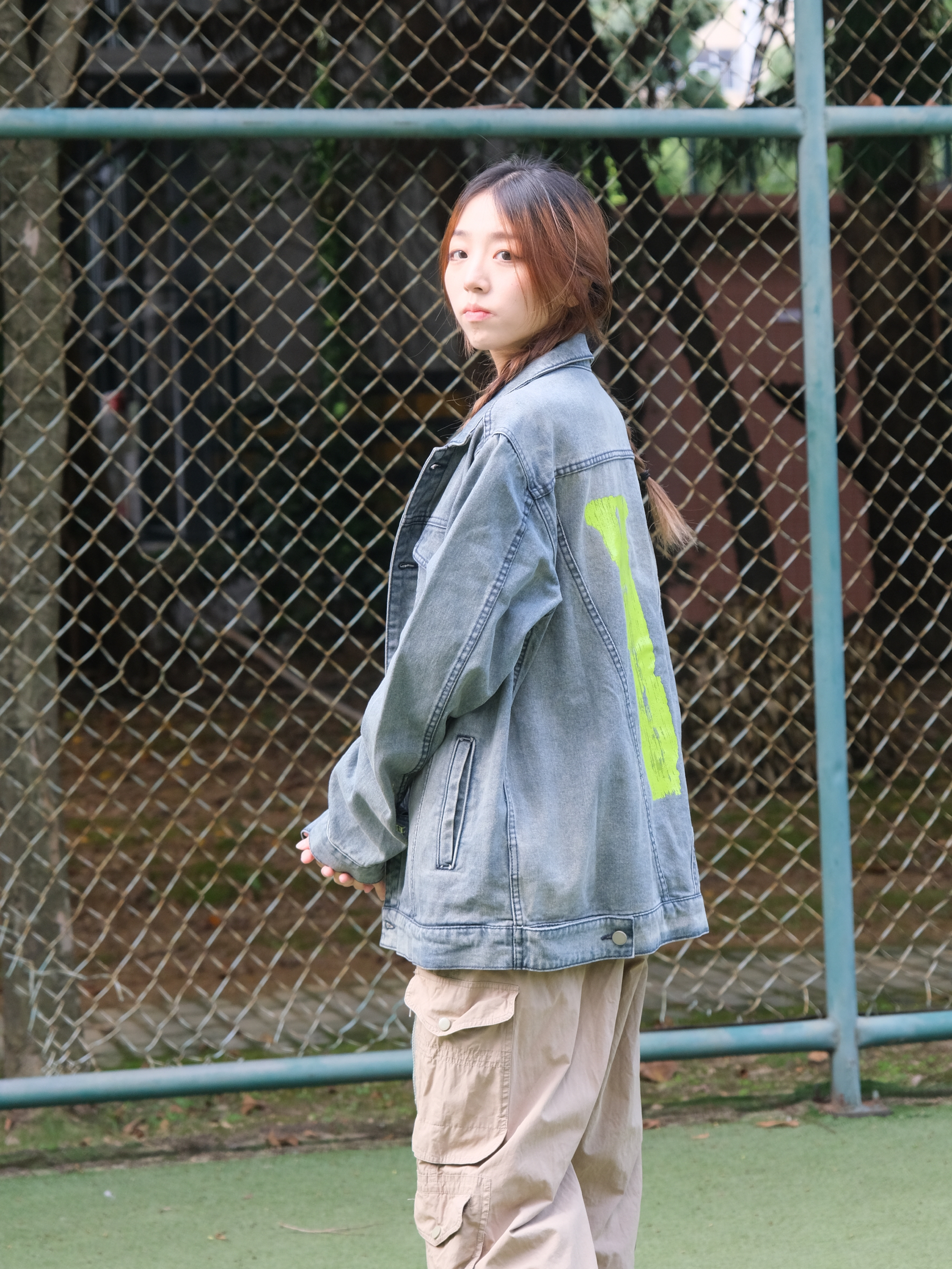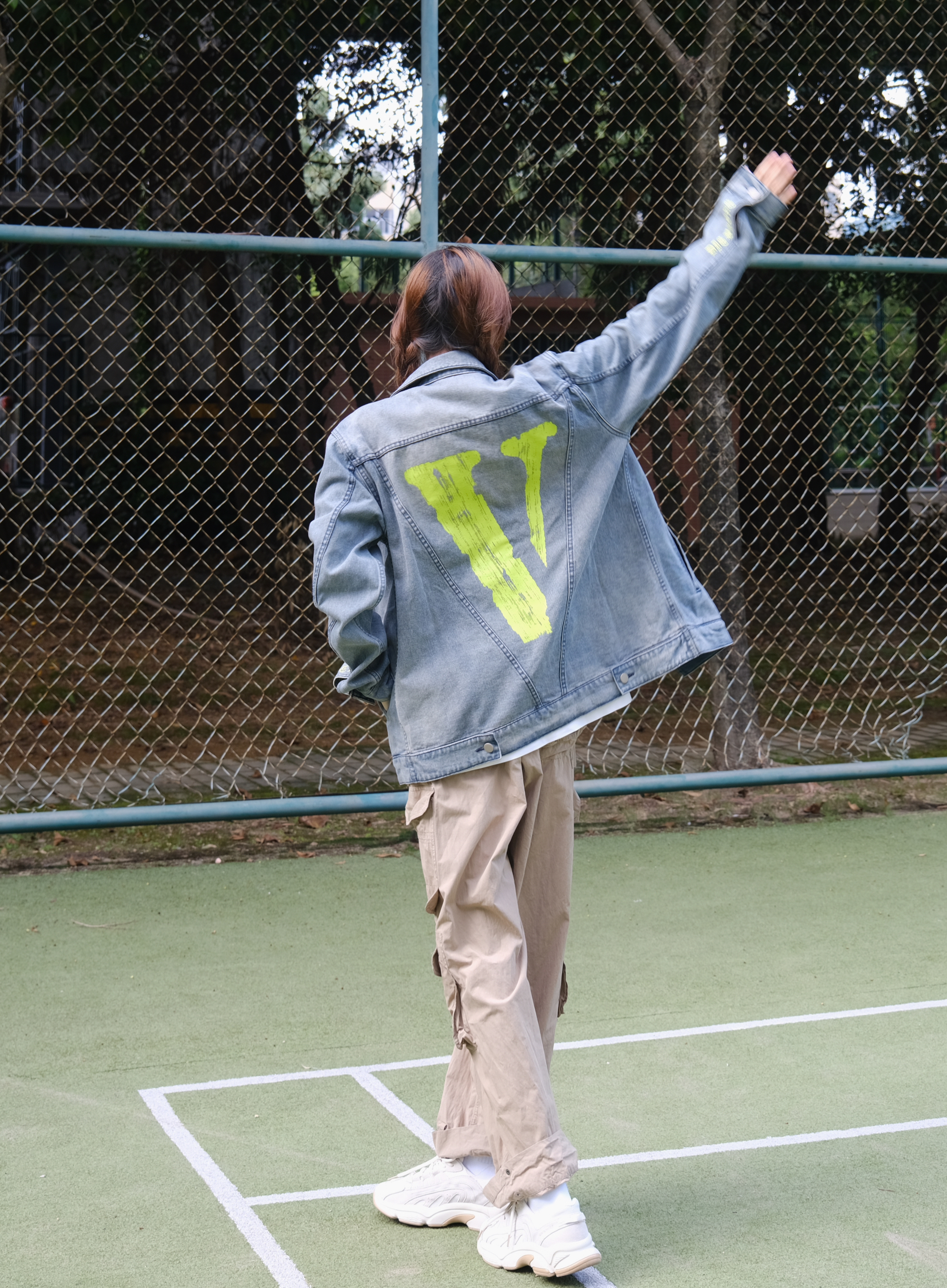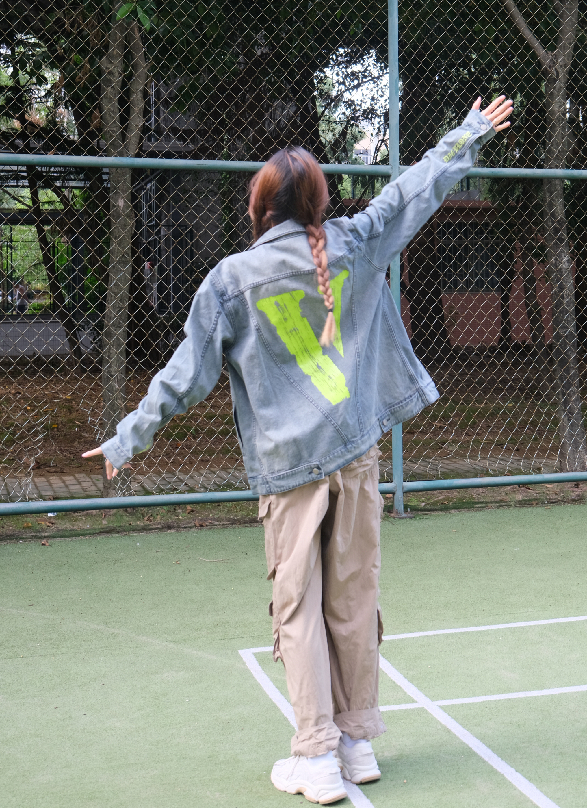 Halo!这里是小铭同学的穿搭分享频道📺 身高:168 体重:44 天气开始慢慢转凉啦~秋天🍂的氛围也有了 又到了最适合叠穿的季节! 喜欢街头感穿搭的友友们😗 衣橱里少不了一件百搭的牛仔衣啦~ 荧光绿的大“V”logo 潮流感十足 整体的版型俺也很喜欢!oversises 爱惨啦! 搭配上一条宽松军绿色工装裤 休闲又时尚~出街look我选这套☑️☑️☑️