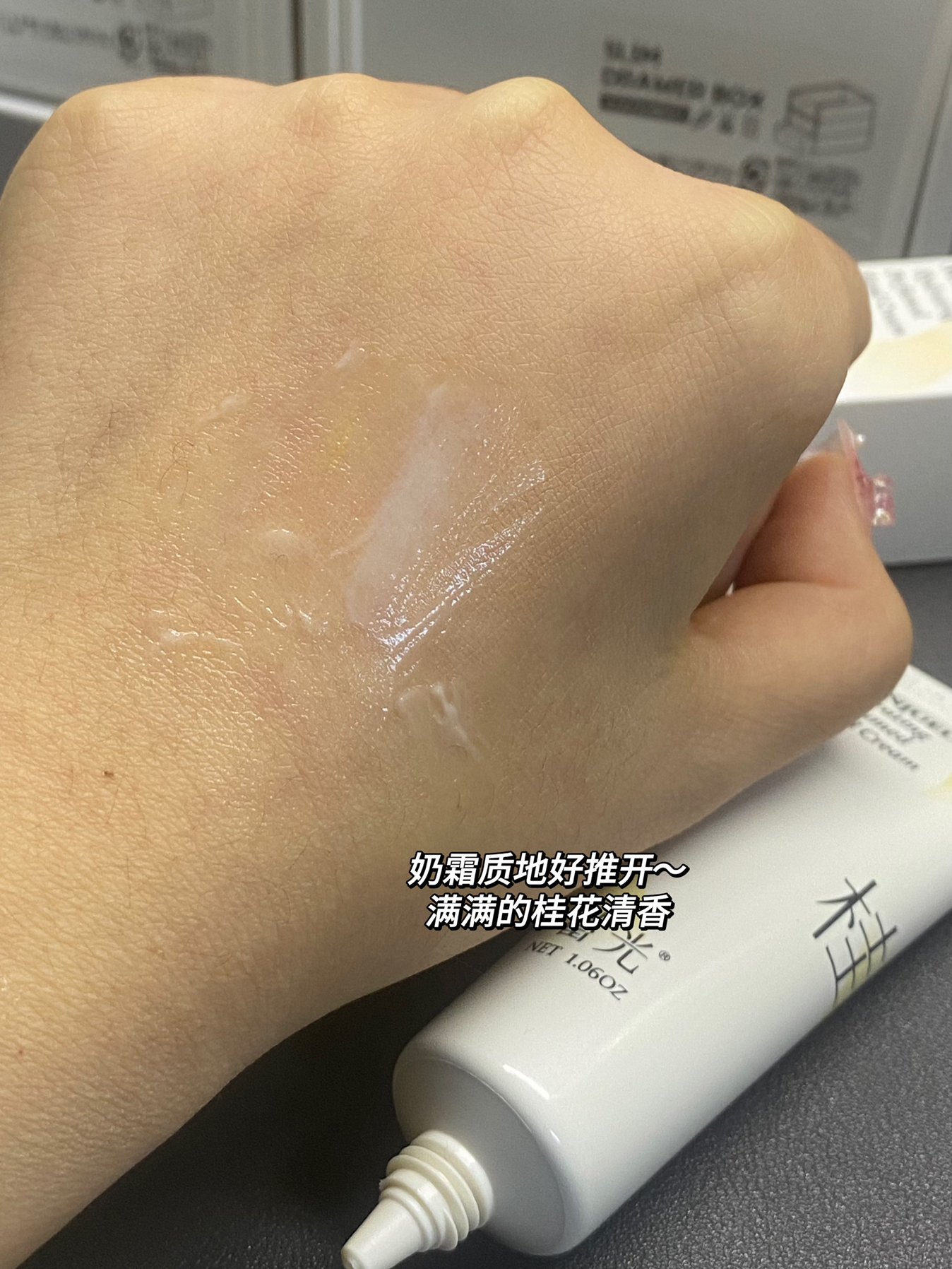 蓄光不愧是全球合作调香 味道真的很绝 面霜级的成分 很好推开吸收 还可以看到有维e爆珠哦! 满满的桂花香 闻起来也不会太腻 涂上真的很滋润 木质调桂花香 很好吸收 真的很难拒绝高颜值味道又好闻的护手霜 小小一只携带很方便 冬天离不开它啰