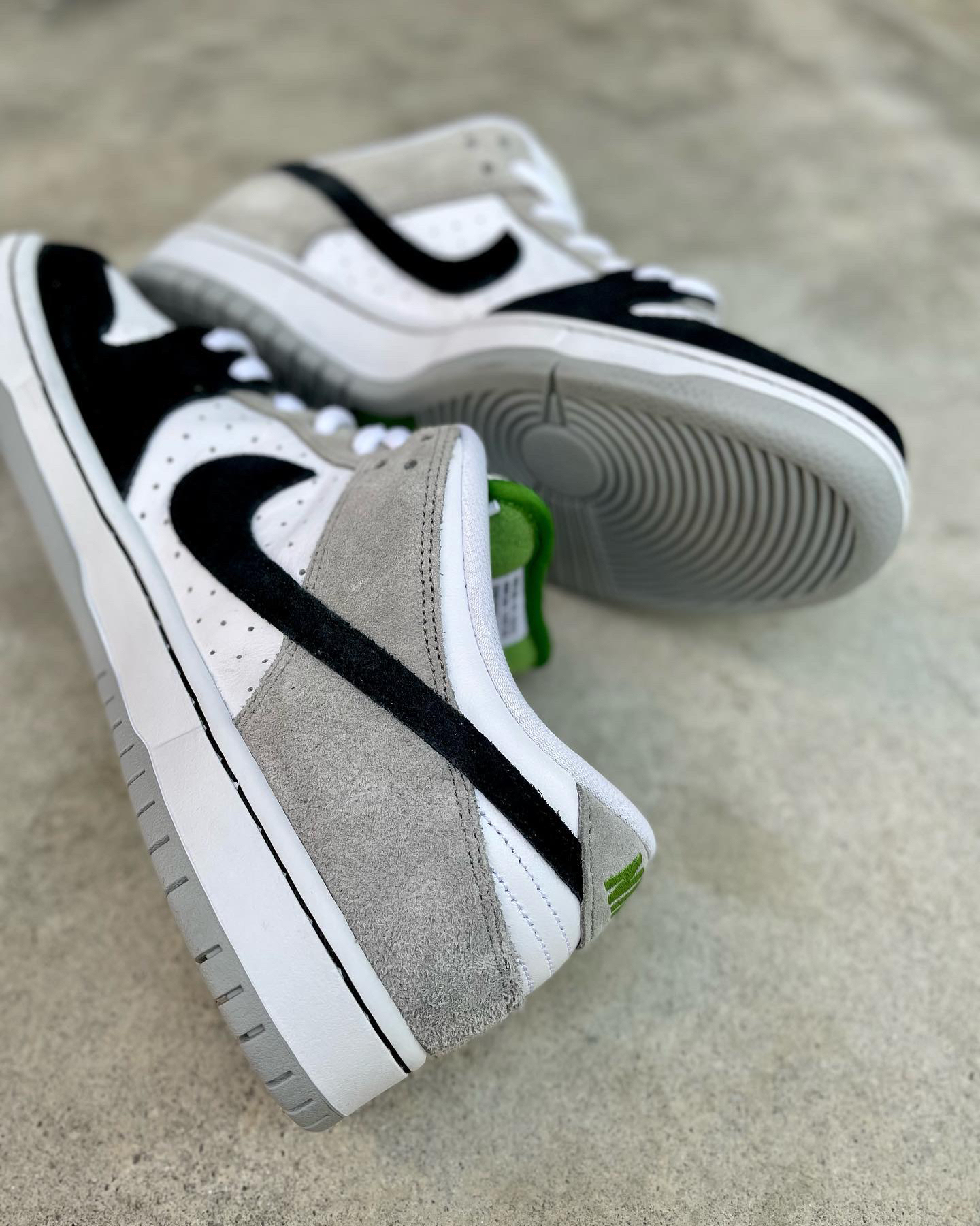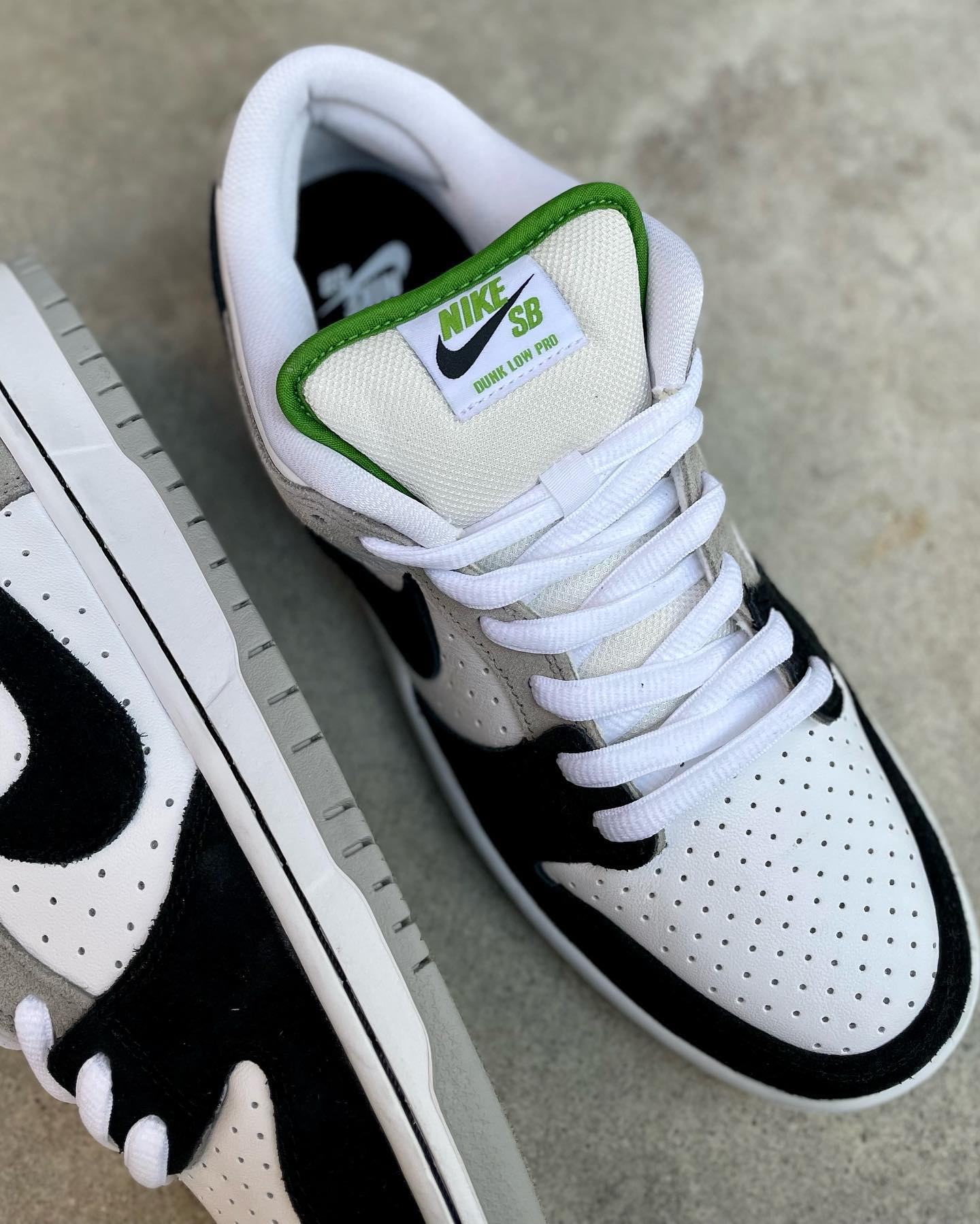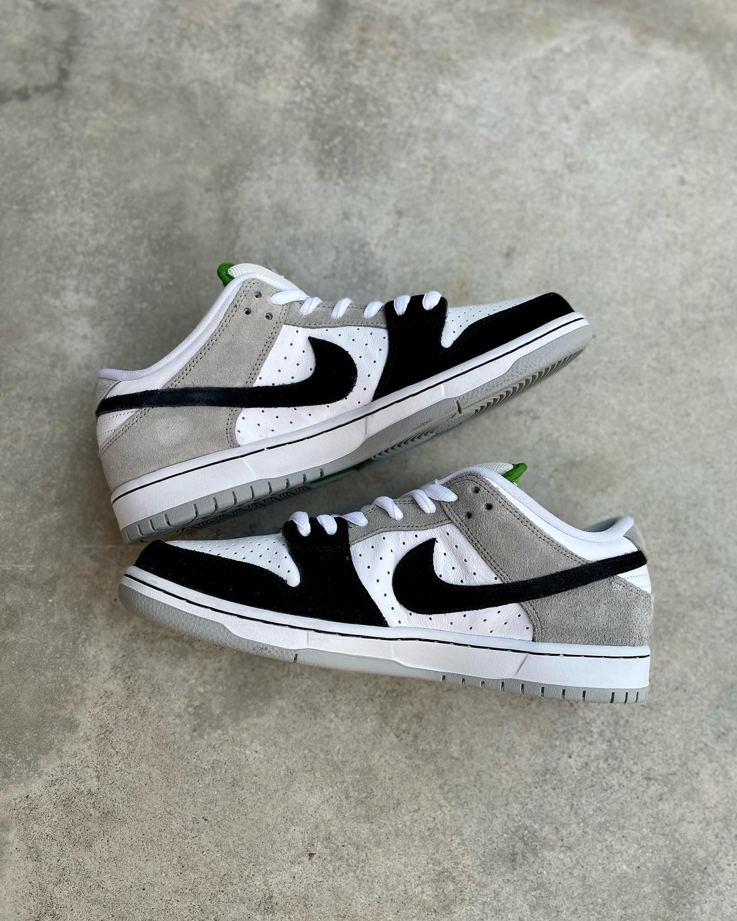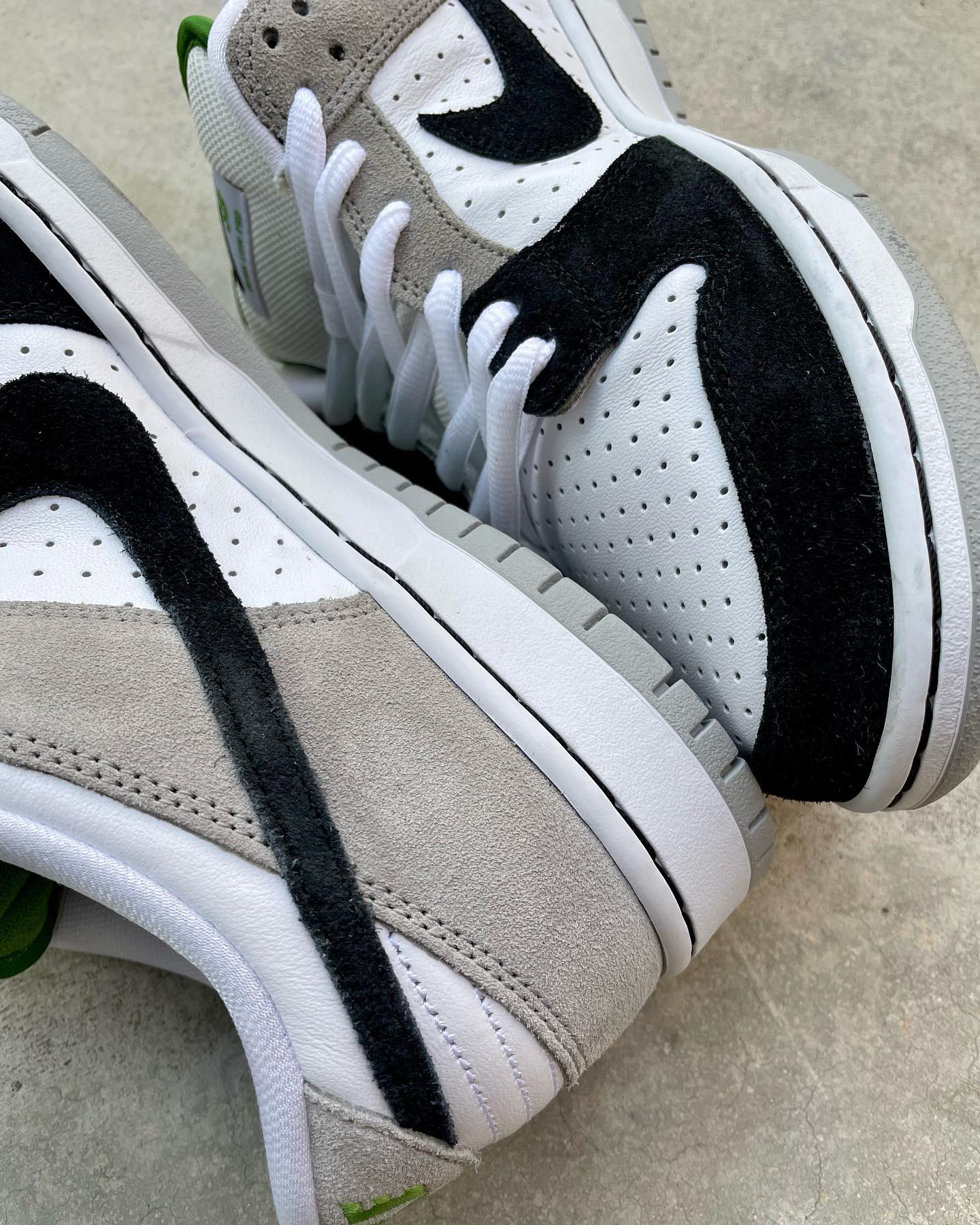 鞋名:SB Dunk Low Pro "chlorophyll"灰白黑 外观及细节: 鞋子是有不错脚感的SB系列滑板鞋,从外观上看比较亮眼的地方在于它鞋舌内里及后跟的耐克刺绣,都是使用了绿色来表现,鞋面上但是以比较保守的黑白灰三色组合,鞋面上大面积使用了白色的打孔皮革,让鞋子的散热功能比较的不错,鞋头上使用黑色麂皮包覆,增加耐磨性,与后跟位置上的灰色麂皮对比明显,两边的swoosh logo...