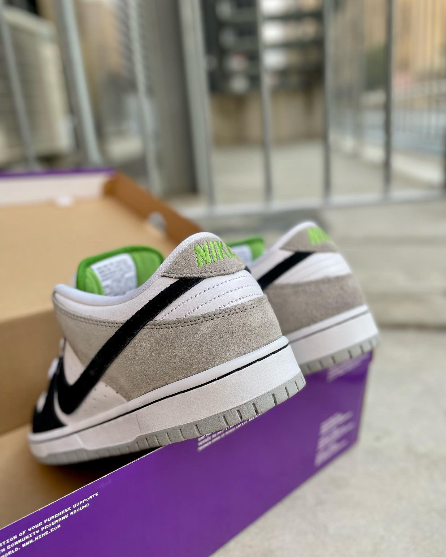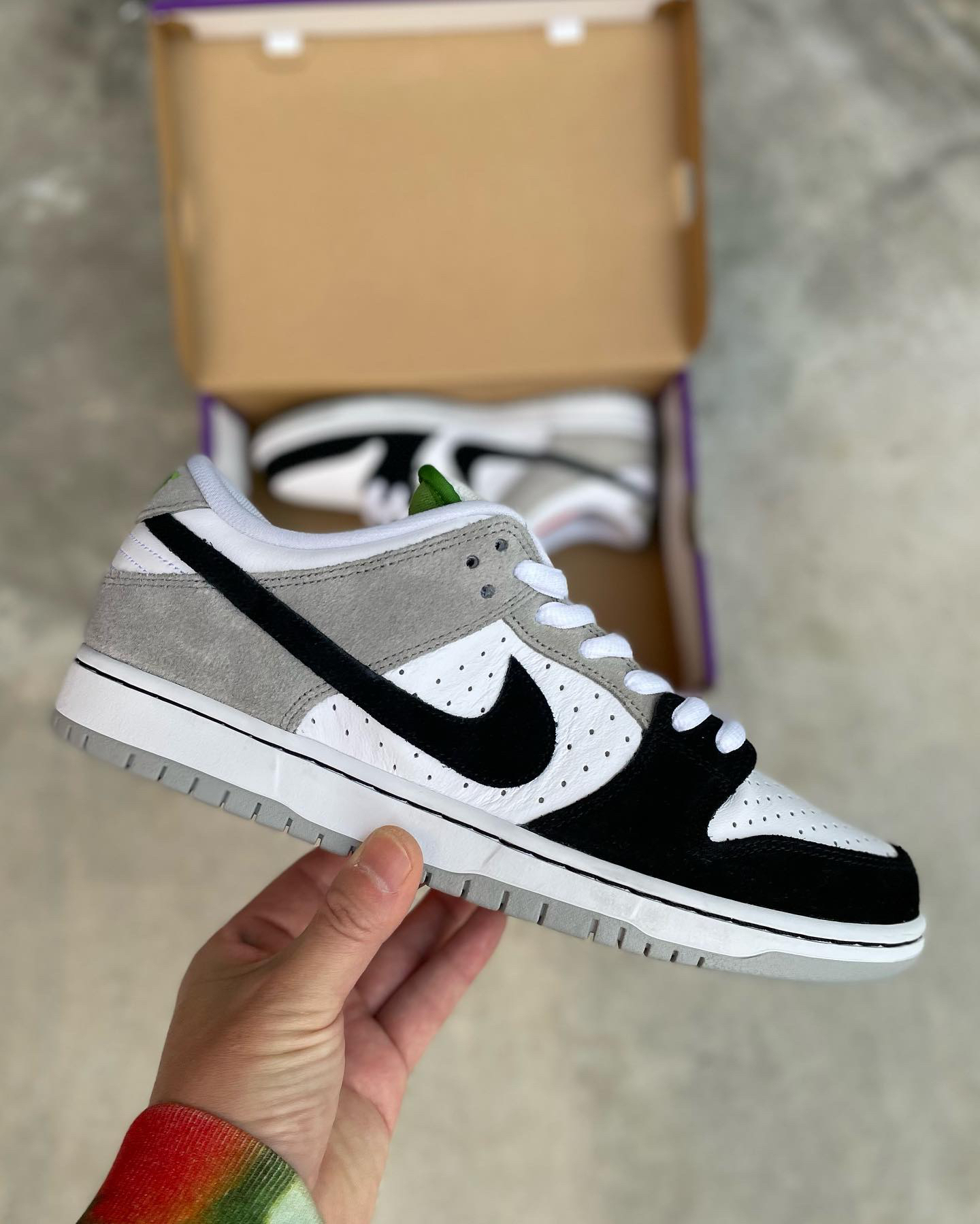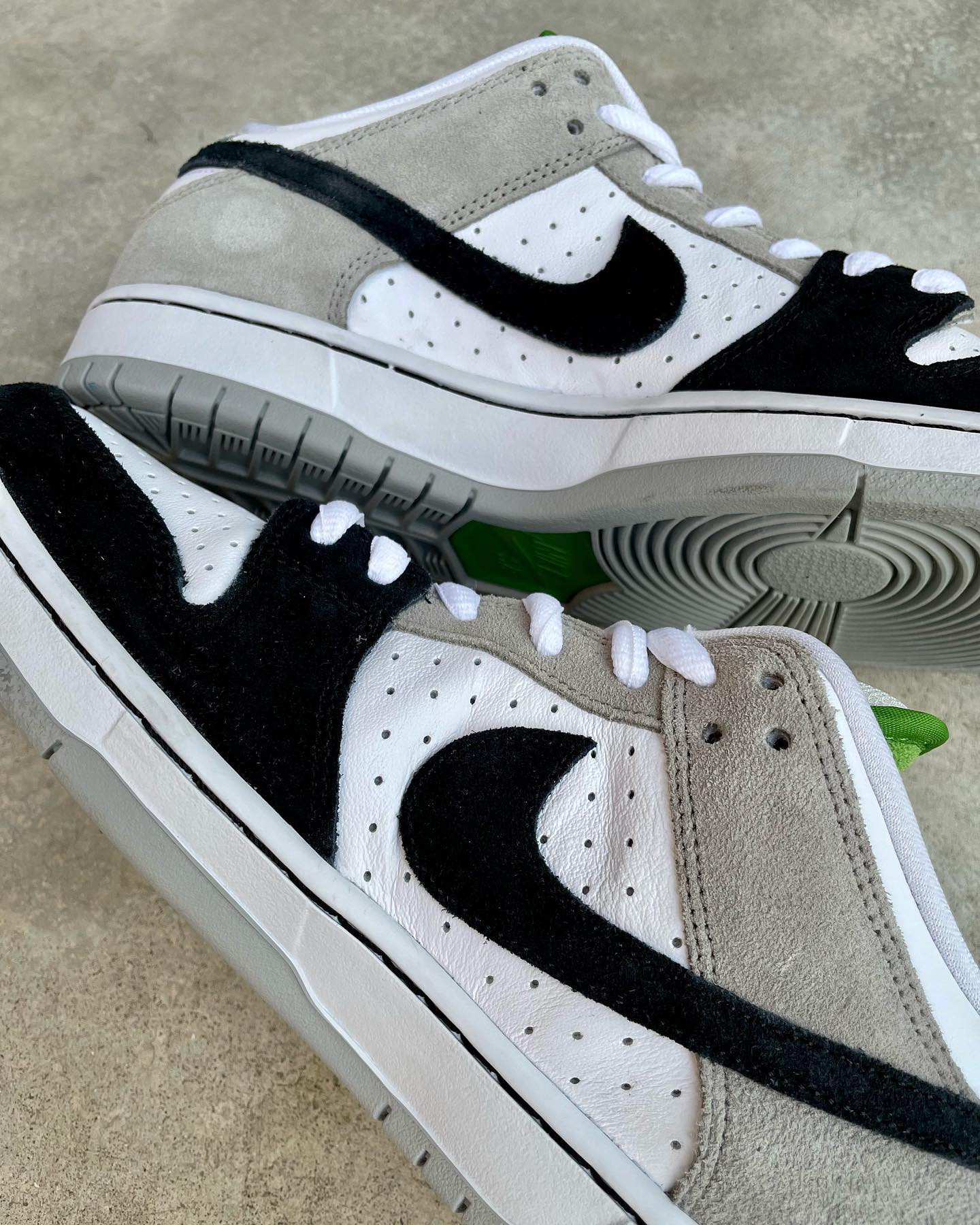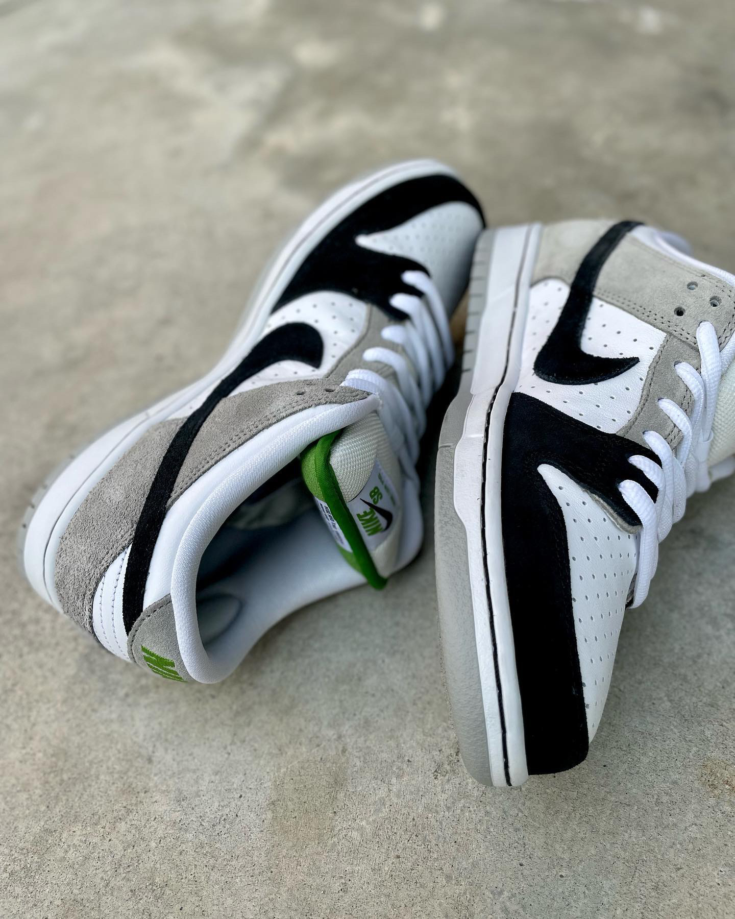 鞋名:SB Dunk Low Pro "chlorophyll"灰白黑 外观及细节: 鞋子是有不错脚感的SB系列滑板鞋,从外观上看比较亮眼的地方在于它鞋舌内里及后跟的耐克刺绣,都是使用了绿色来表现,鞋面上但是以比较保守的黑白灰三色组合,鞋面上大面积使用了白色的打孔皮革,让鞋子的散热功能比较的不错,鞋头上使用黑色麂皮包覆,增加耐磨性,与后跟位置上的灰色麂皮对比明显,两边的swoosh logo...