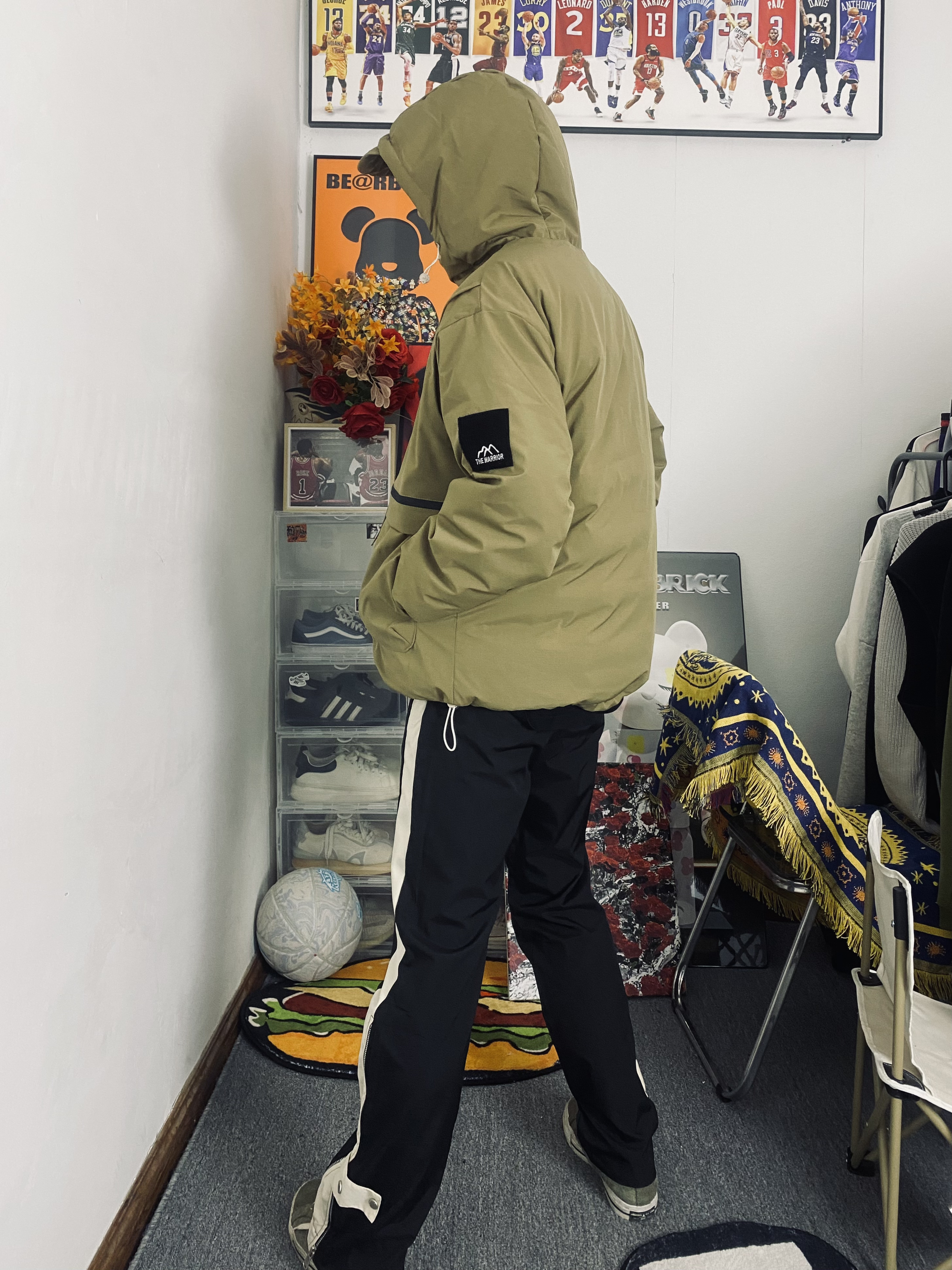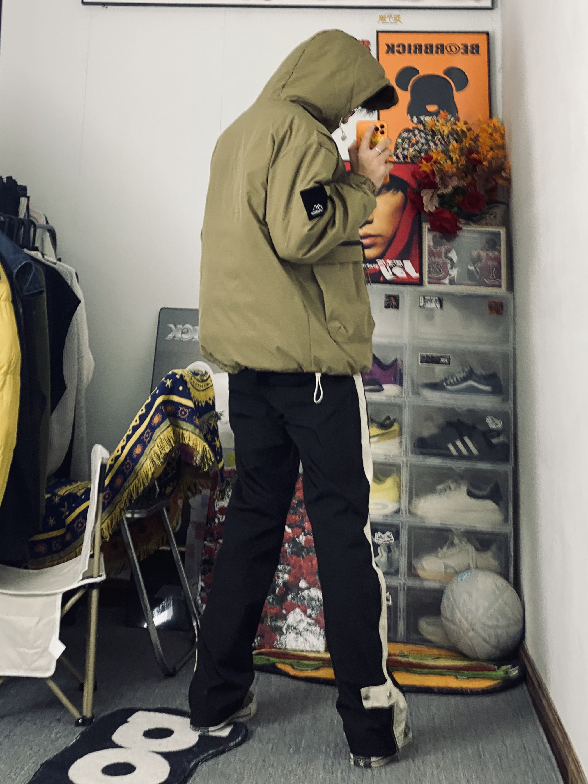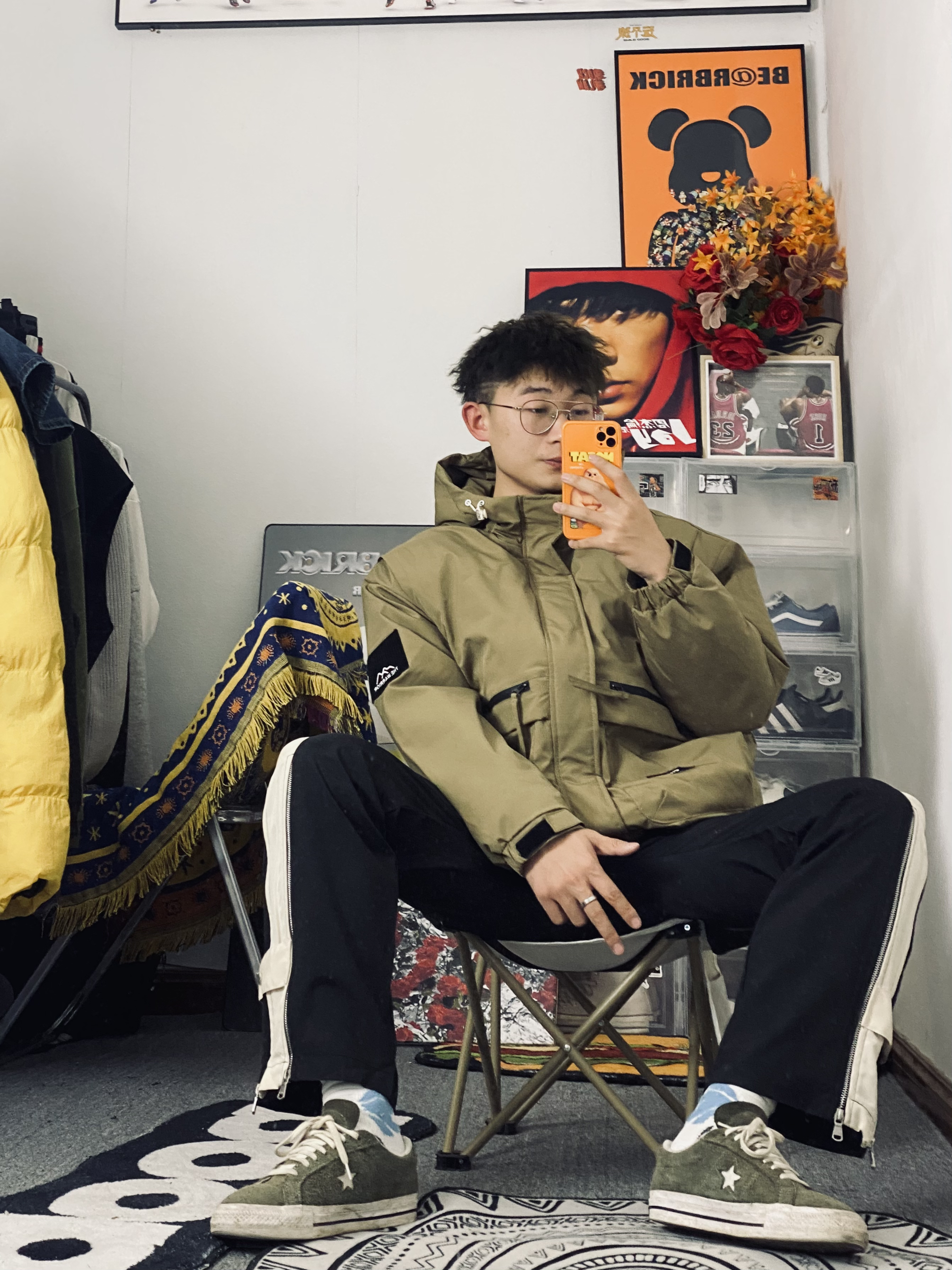 🎱今日冰美式穿搭 👔衣服穿了一件基础色工装棉服 加厚的厚度抗寒性是没问题的 袖口和拉链都有魔术贴的设计防风性还是不错的🧑🌾 宽松的版型里面在内搭点衣服也不会太壮🔥 — 👖裤子是一条侧边拼接微喇裤 黑色的裤子真的基础又百搭再加上拼接的设计又不会太单调‼️ — 👟匤威 绿 经典小板鞋
