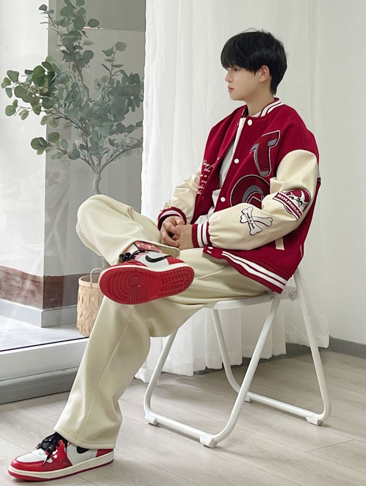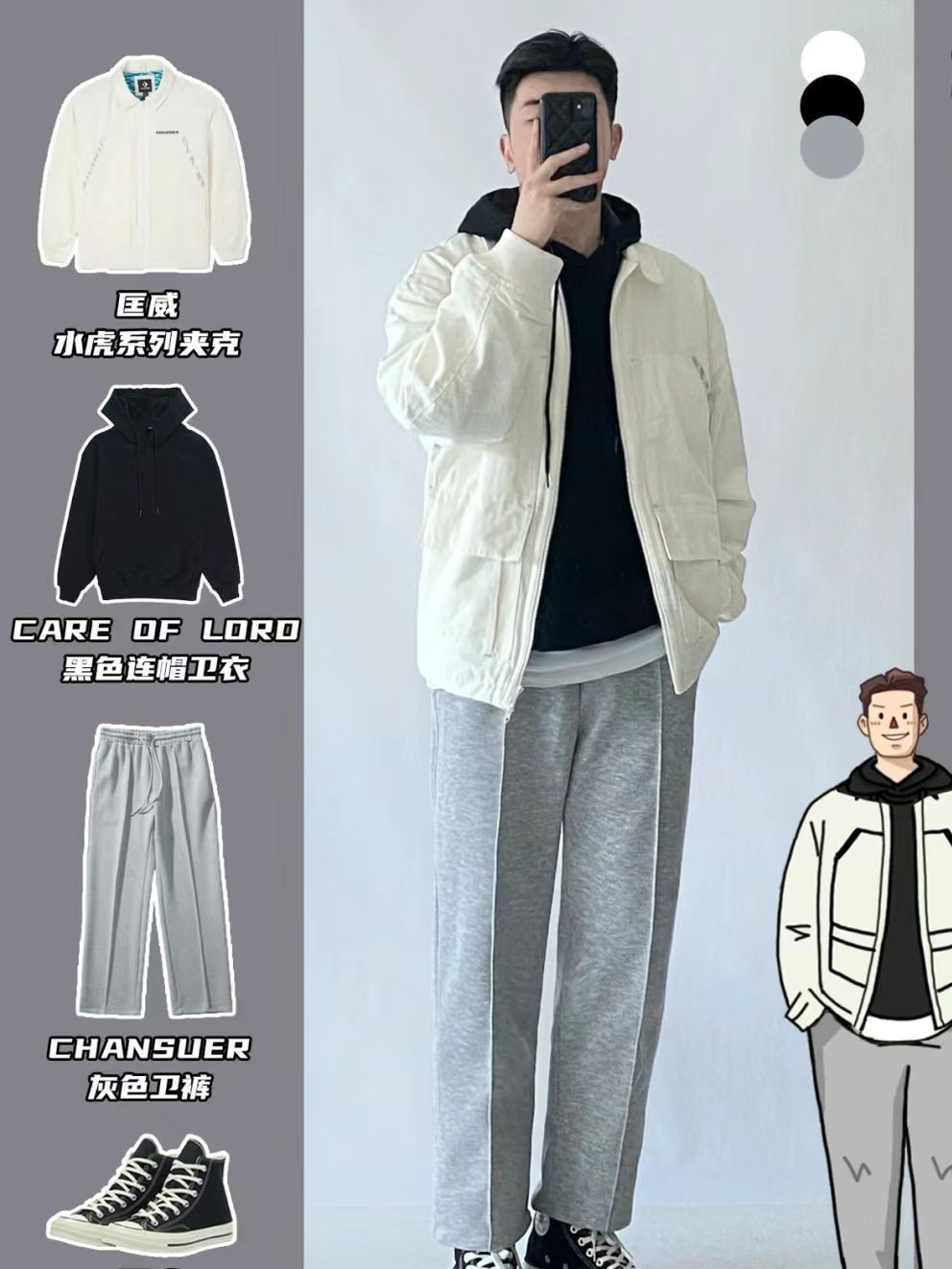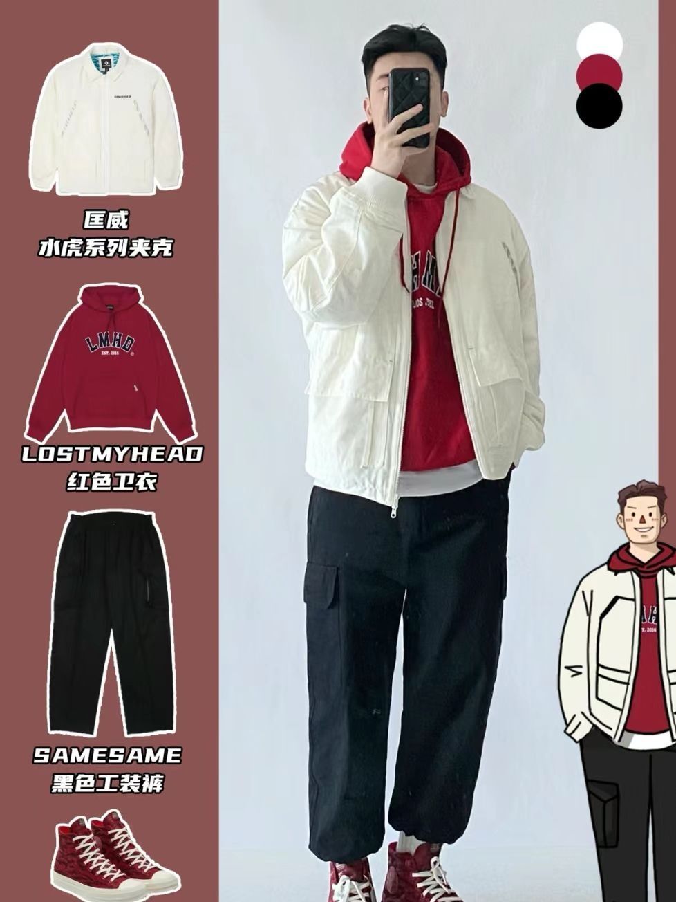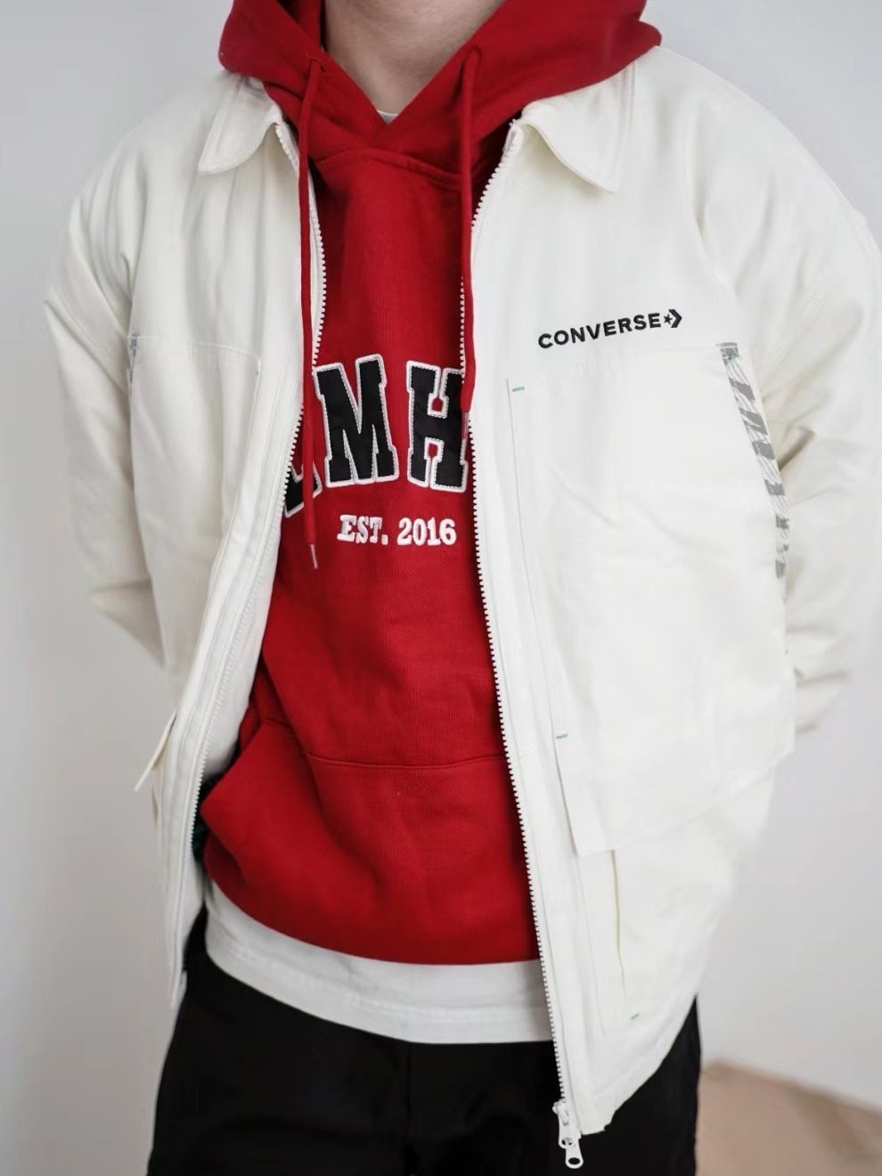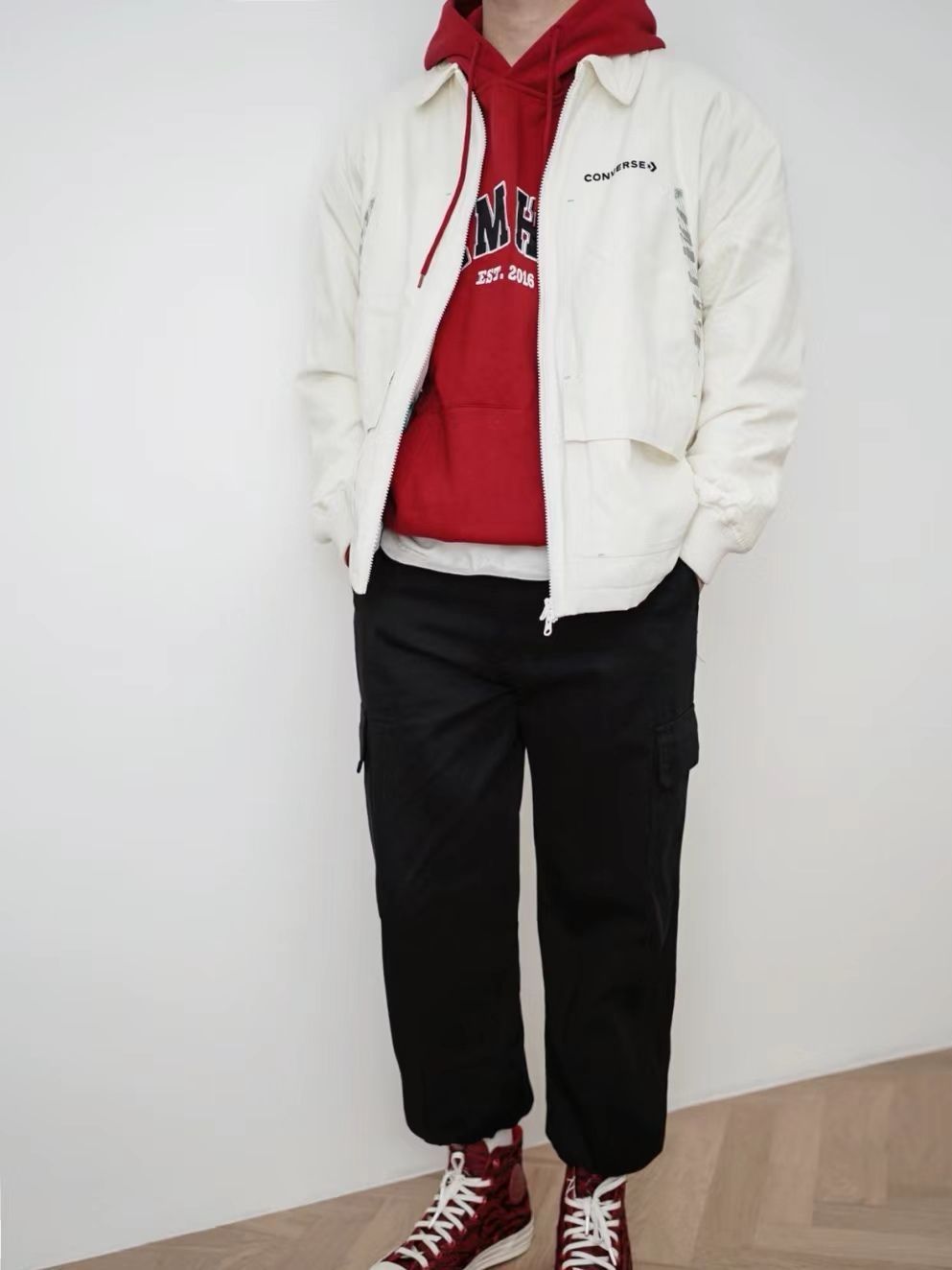 hello,穿衣显瘦脱衣有赘肉🙋来了! 转眼2024春节马上就到了‼️相信新年穿搭又把小伙伴们给难倒了,红色新年🛑元素单品安排起来!穿搭小白不妨试下运动风穿搭,帅气阳光又不容易出错✅,搭配上匡威帆布鞋+夹克,这里夸一下匡威的夹克,奶白色的夹克厚实有重量感,内搭一件卫衣就够保暖的♨️,双向的拉链设计,背面还有匡威logo的刺绣印花,摸上去手感很舒服,很适合过年穿。 穿上新衣你就是街上的氛围感焦点...
