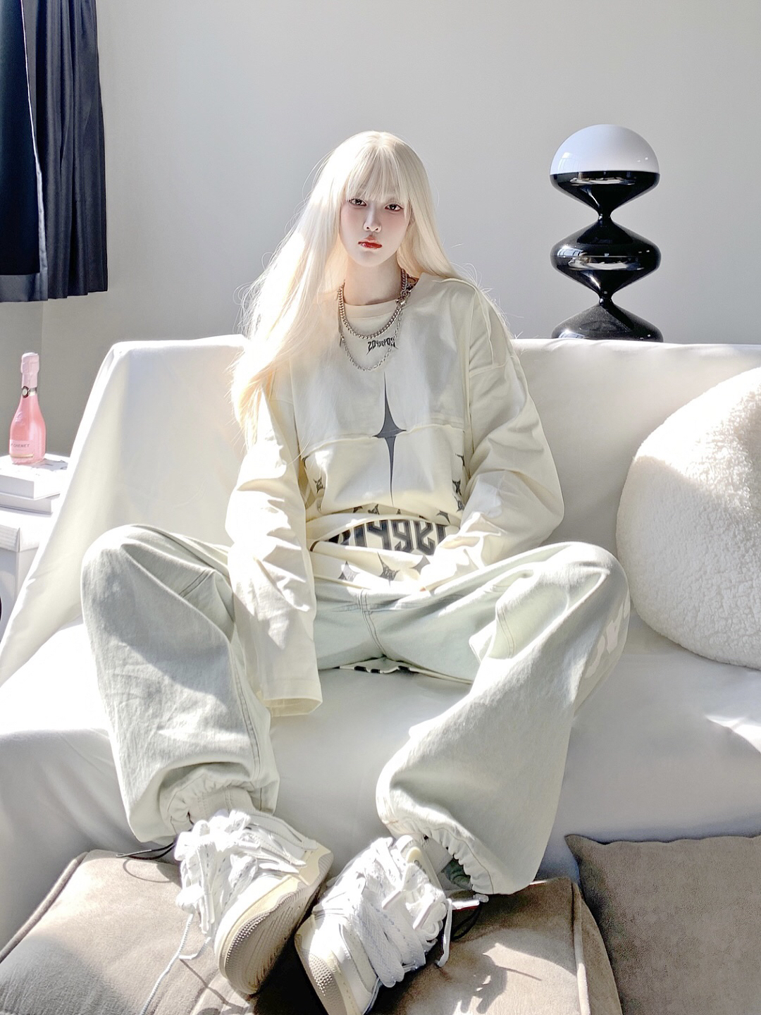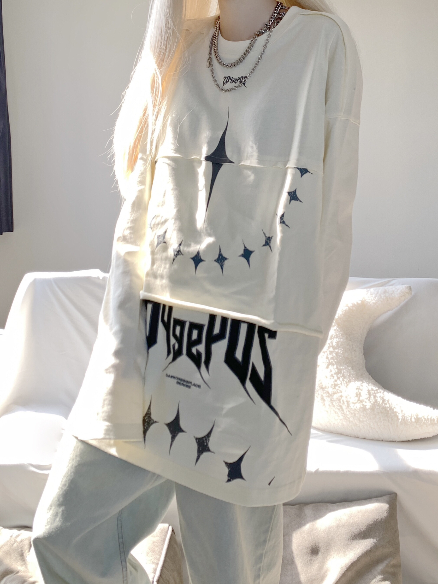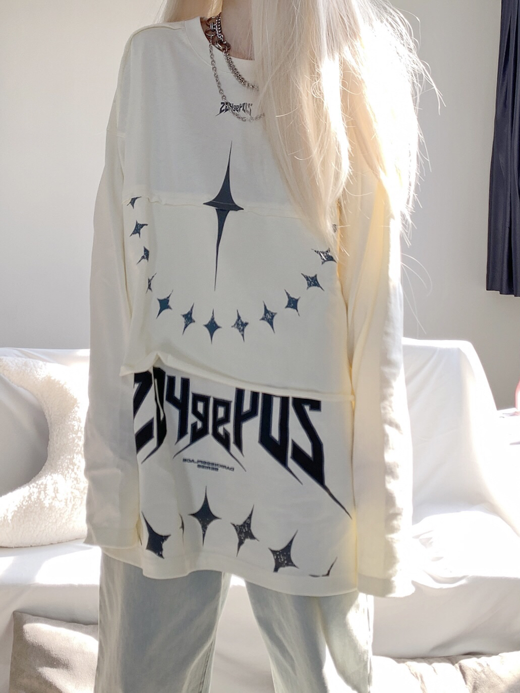 打底长袖来咯! 外套里的打底衫当然也要穿好看的 介件长袖的颜色敲好看的 浅色系的复古颜色 真嘟太舒服了 上身好显白啊 很衬肤色哦 版型宽松好显瘦呐 印花图案和三层分层的设计都敲酷的 搭配同样浅色系的裤子 色调看起来好舒服 hin好看耶 想要一件单穿和打底都适合好看又潮流的长袖 这件就是啦!