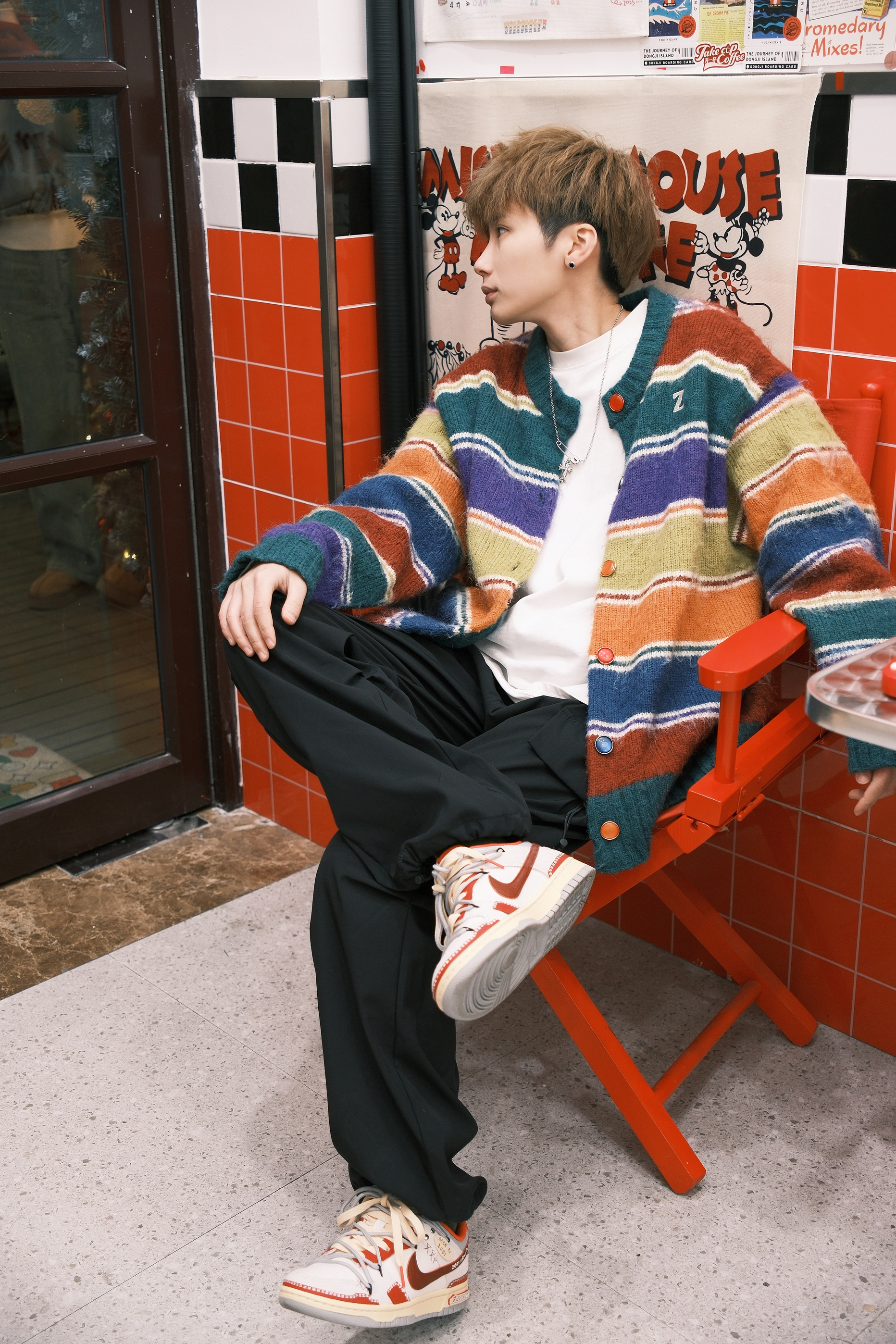 halo这里是嘎嘎的日常穿搭分享🥳 - 平安夜快乐🎅🏻 今天穿的彩虹色系的毛衣开衫 红绿黄紫的四色条纹撞色,站在圣诞树旁完美融合 下身搭配黑色工装裤,百搭又耐穿 最后来一双红白配色Dunk,和上身颜色呼应下 红色元素和圣诞节很搭哦✅
