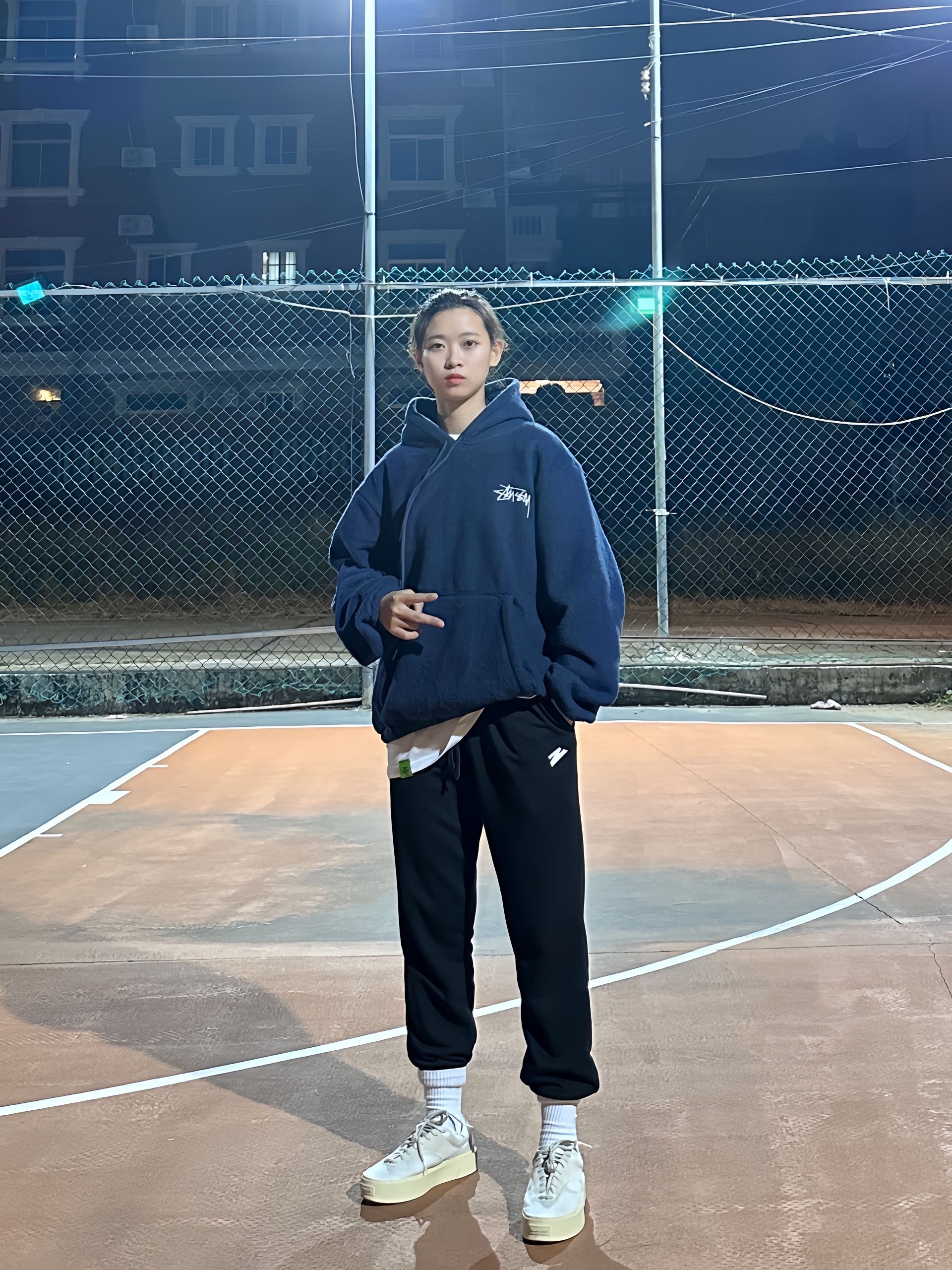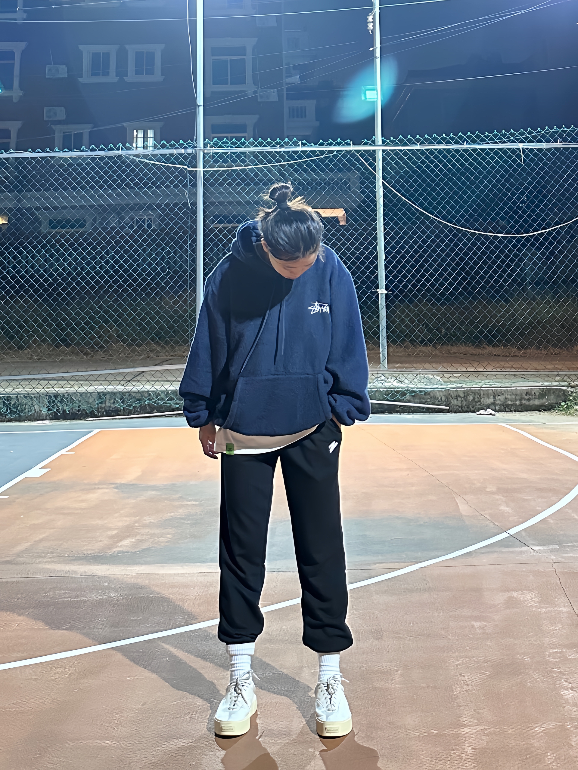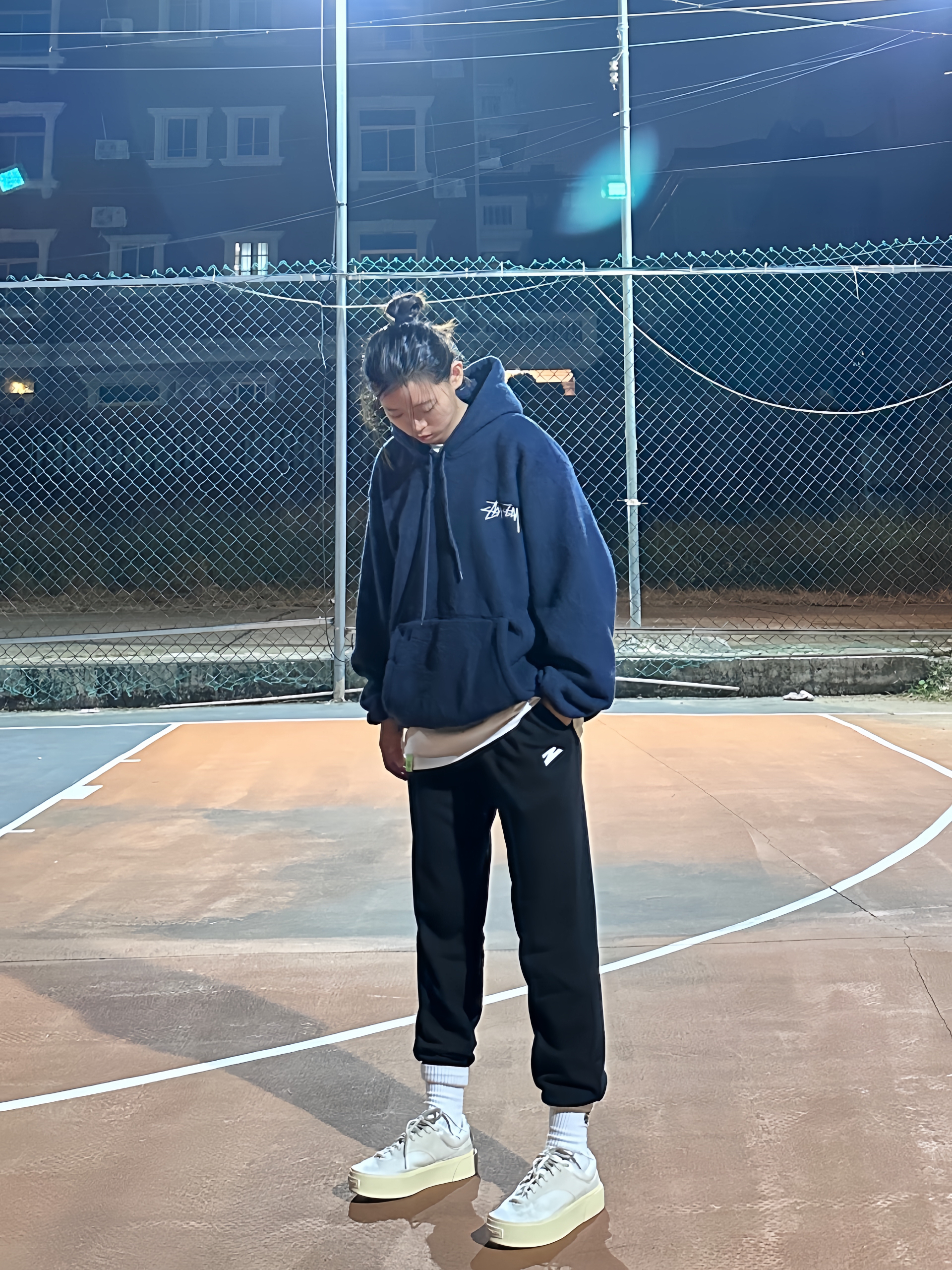 今天分享一套冬季篮球女孩美式穿搭~ - 👔:stussy 上身选择了一件蓝色卫衣 摇粒绒面料 保暖舒服 👖: 有志者UZIS ▪️裤子穿的是DNA黑色卫裤 宽松版型 面料舒服 厚度适中 柔软透气 在南方冬天打球穿足够了👌🏻 小logo设计 简约大方😍 束脚设计搭配扎袜穿搭 运动起来也不会勒 非常舒适 ▪️上衣搭配一件蓝色卫衣 妥妥的有志者美式球员风‼️ - 👧丨171cm&58kg丨👔👖丨M码