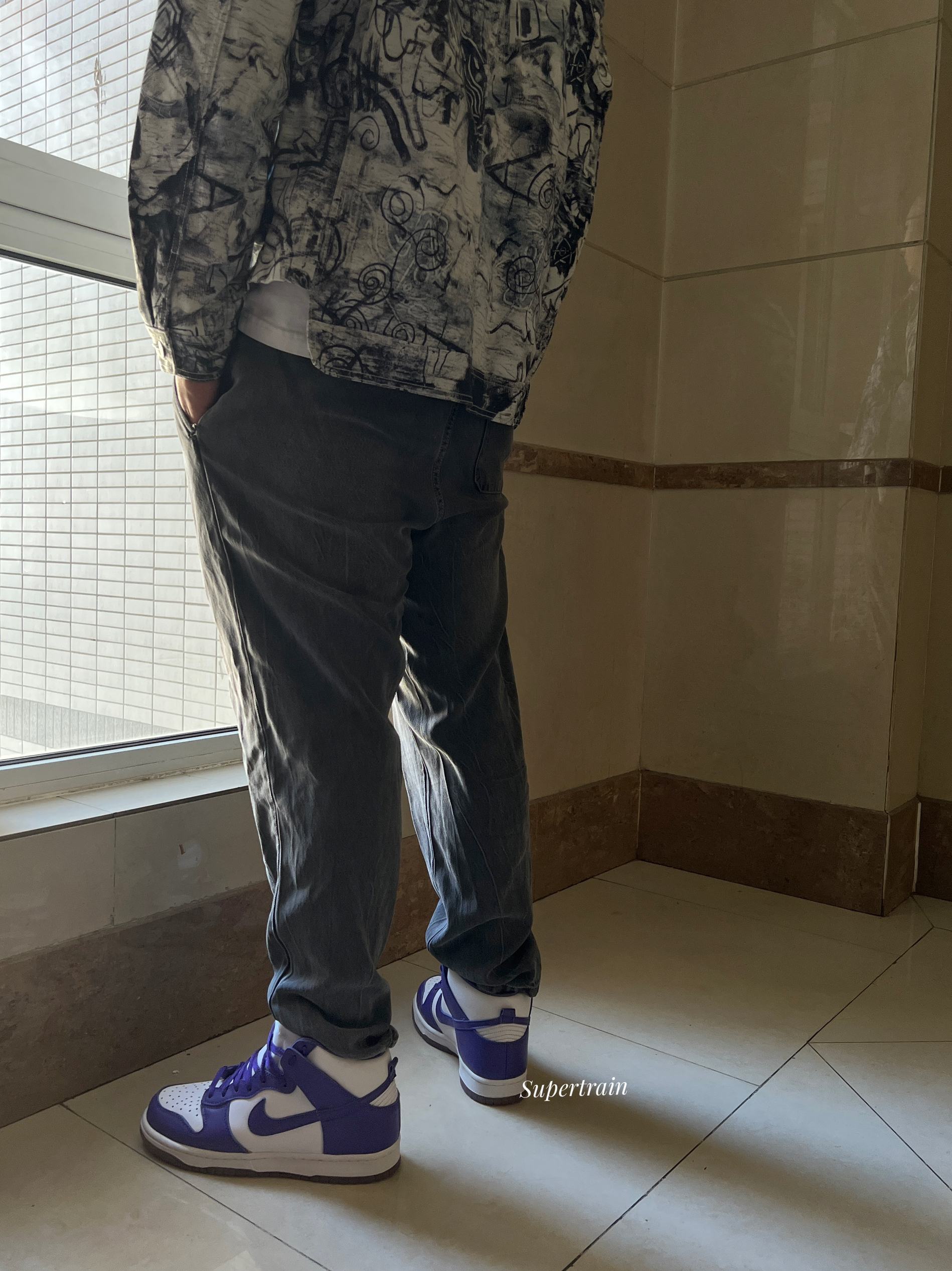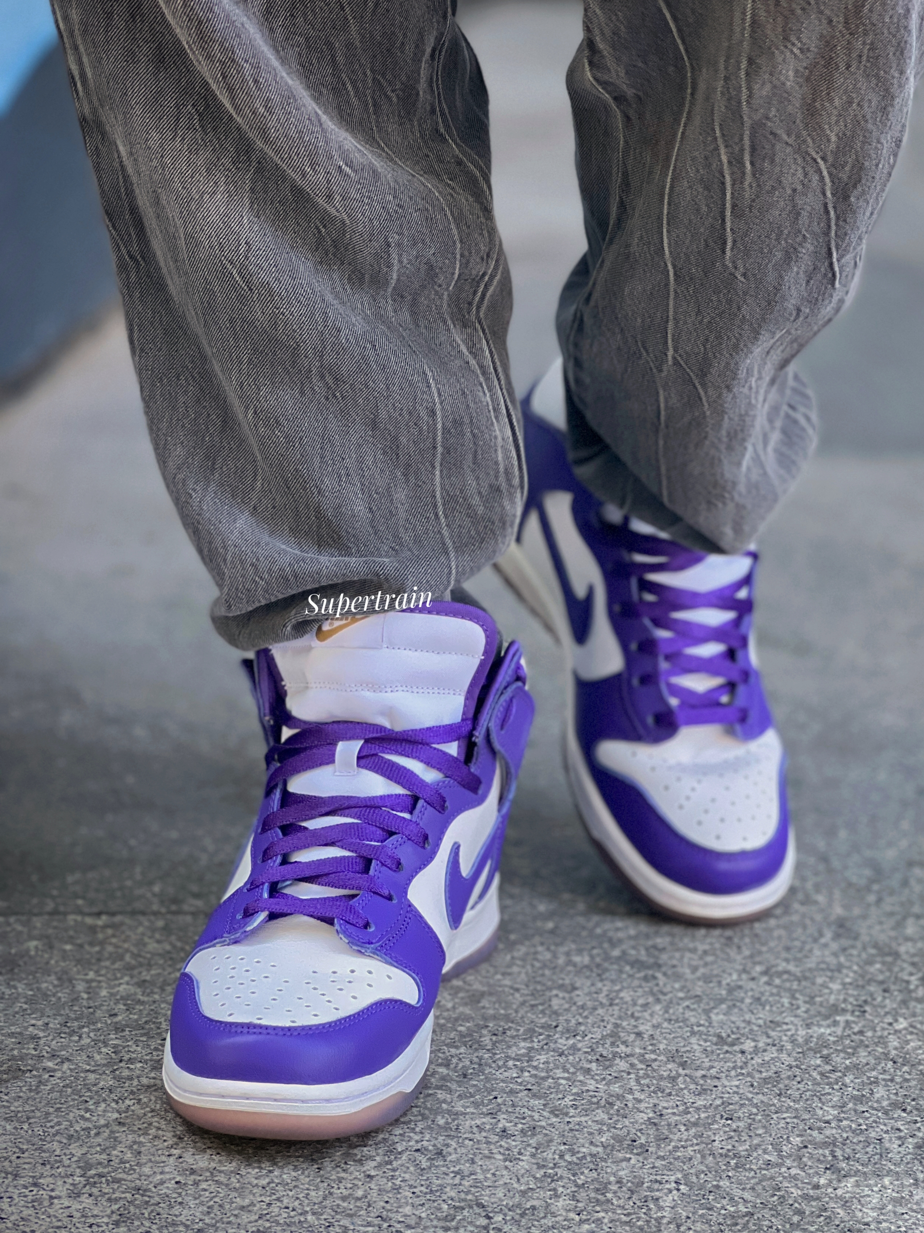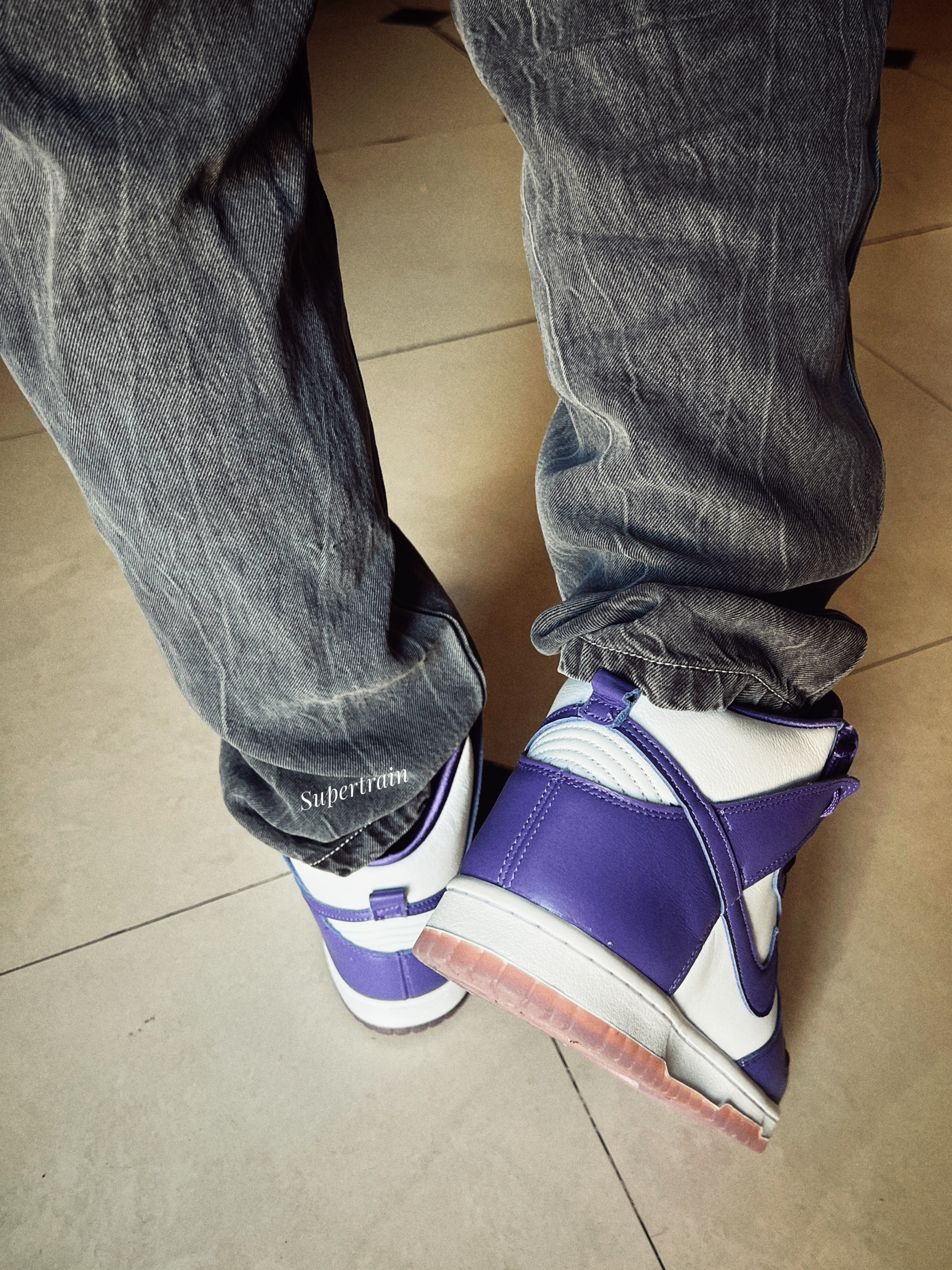 入秋以后色彩渐渐不再鲜艳 一身低调的灰白色调出行 怎么少的了一双出挑亮眼的好鞋? DUNK HIGH也算是秋季常备款了 白紫配色永远都是吸引眼球的利器 淡紫色的水晶大底 颜值没得挑了~~ 目前自穿性价比是相当不错滴 尺码方面脚宽的建议选择大半码