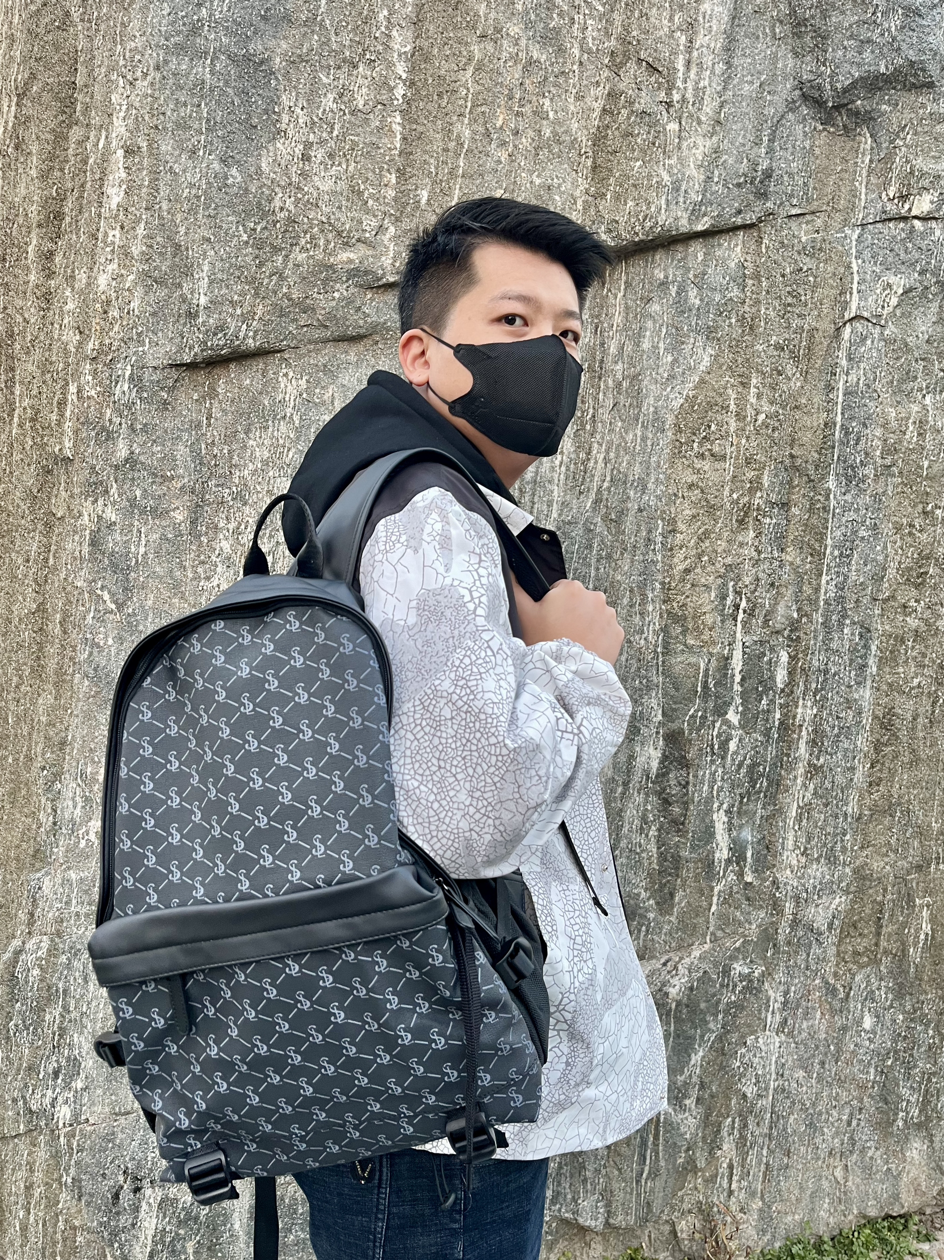 衣服的拼接色搭配很好看 平常通勤路上很方便选择 搭配牛仔裤和马丁靴 再加上一个背包很完美