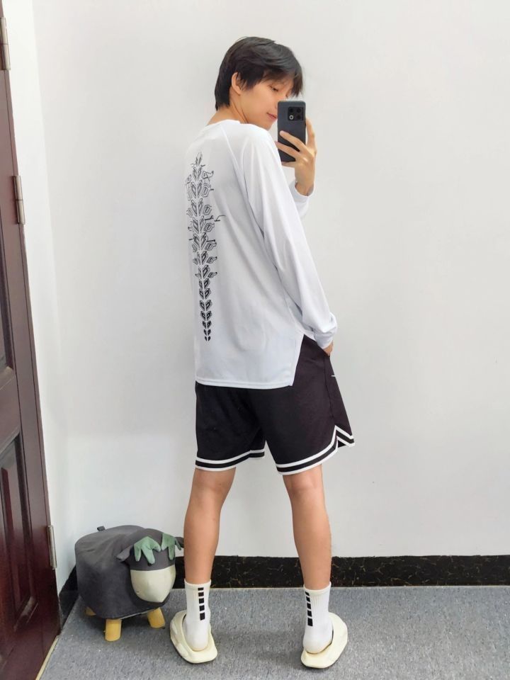 oversize的版型比较宽松,整体是网眼+速干的面料设计。 1.轻薄透气 不闷汗,运动打球穿着很舒服。 2.图案超有设计感,前面是芯片心脏,后面赛博朋克的机械脊柱帅呆了。 3.整体是黑白配色,颜值很高且百搭,日常通勤也可以穿!