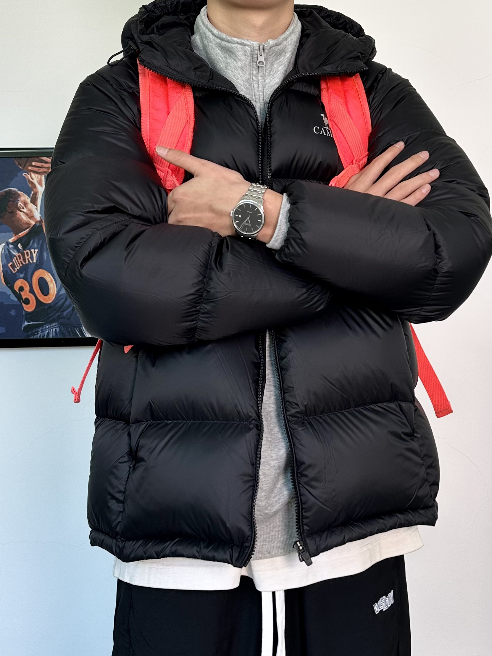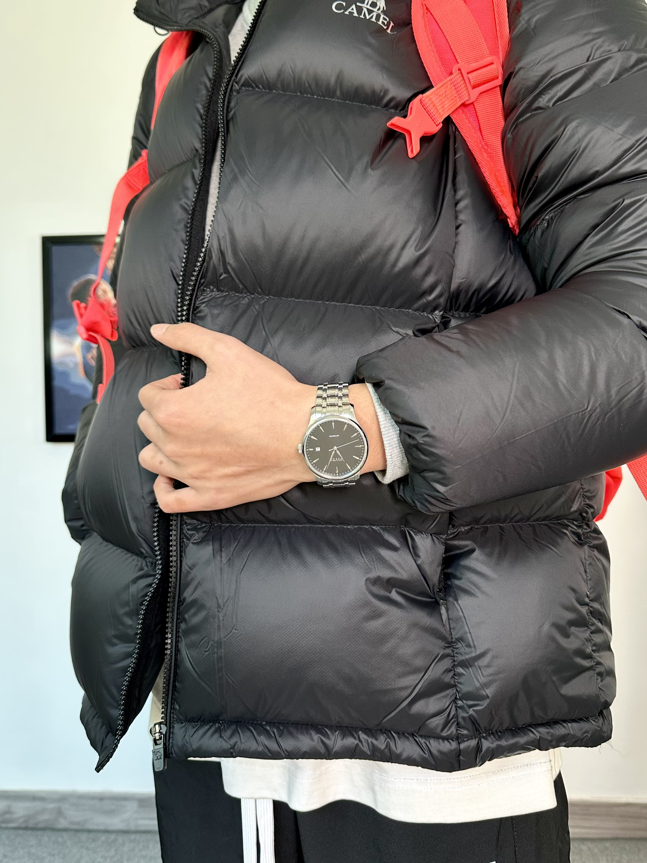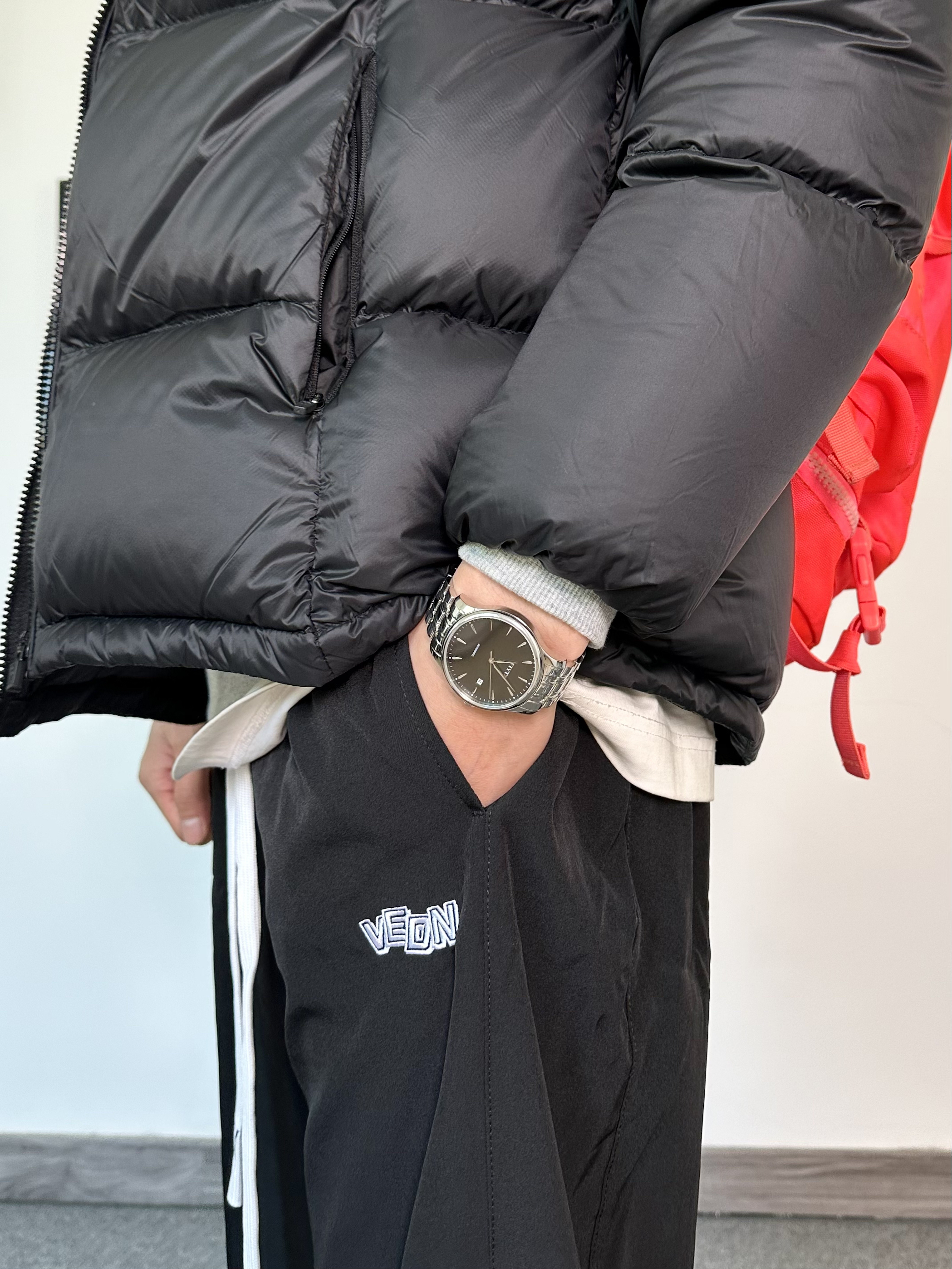 冬天来身美式穿搭活力满满 上身立体饱满黑色羽绒服 搭配上一条黑色束脚卫裤,运动氛围感拉满 腕表一定不能忽视了! 经典的黑色十银色的设计真的很爱 纯黑表盘走的就是极简风 机械表搭配上银色的钢带,黑白搭配yyds 作为日常穿戴的手表男款再合适不过了