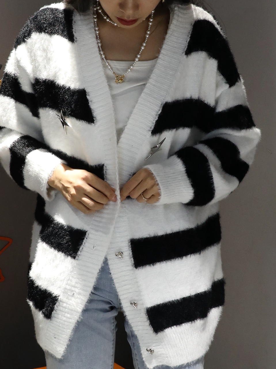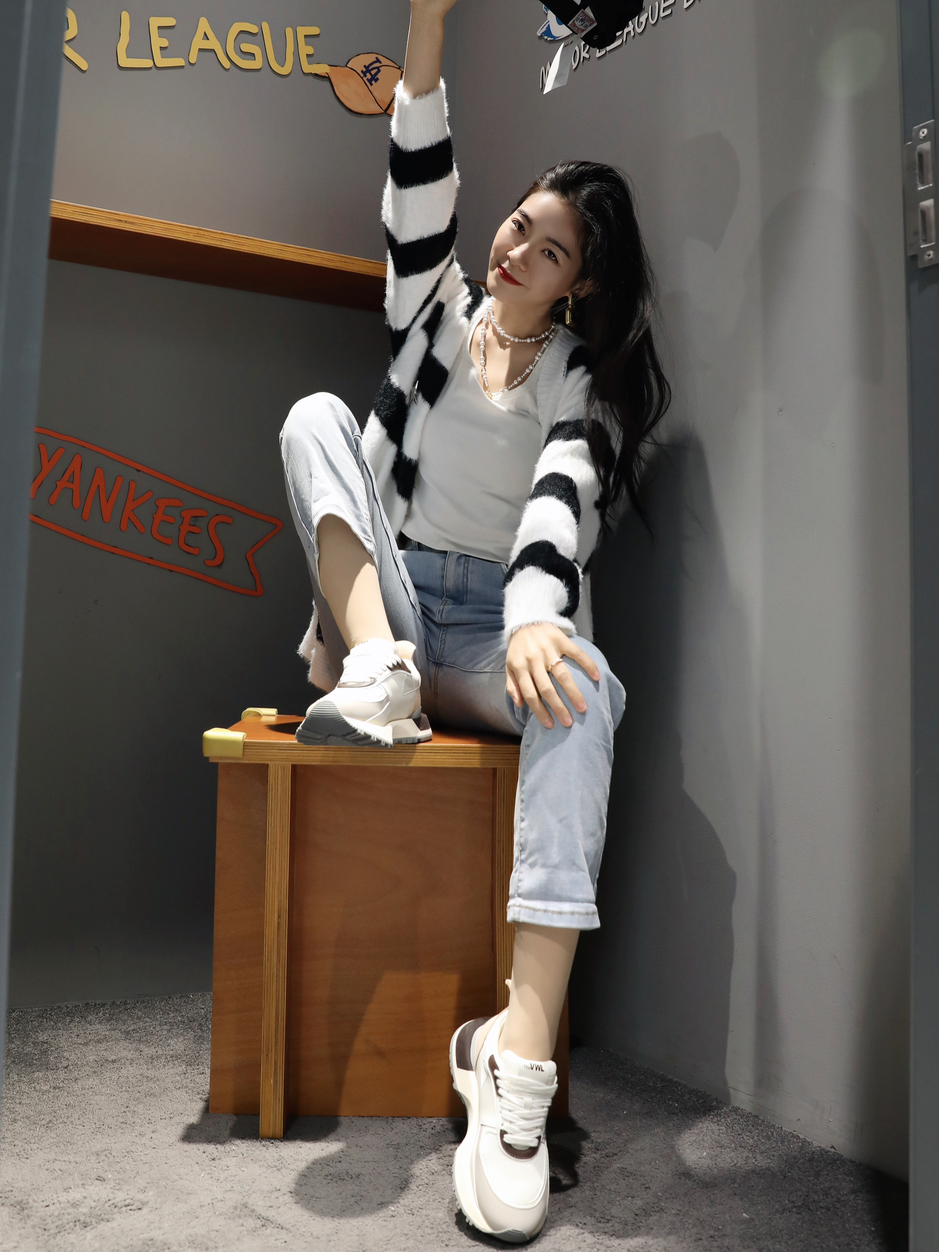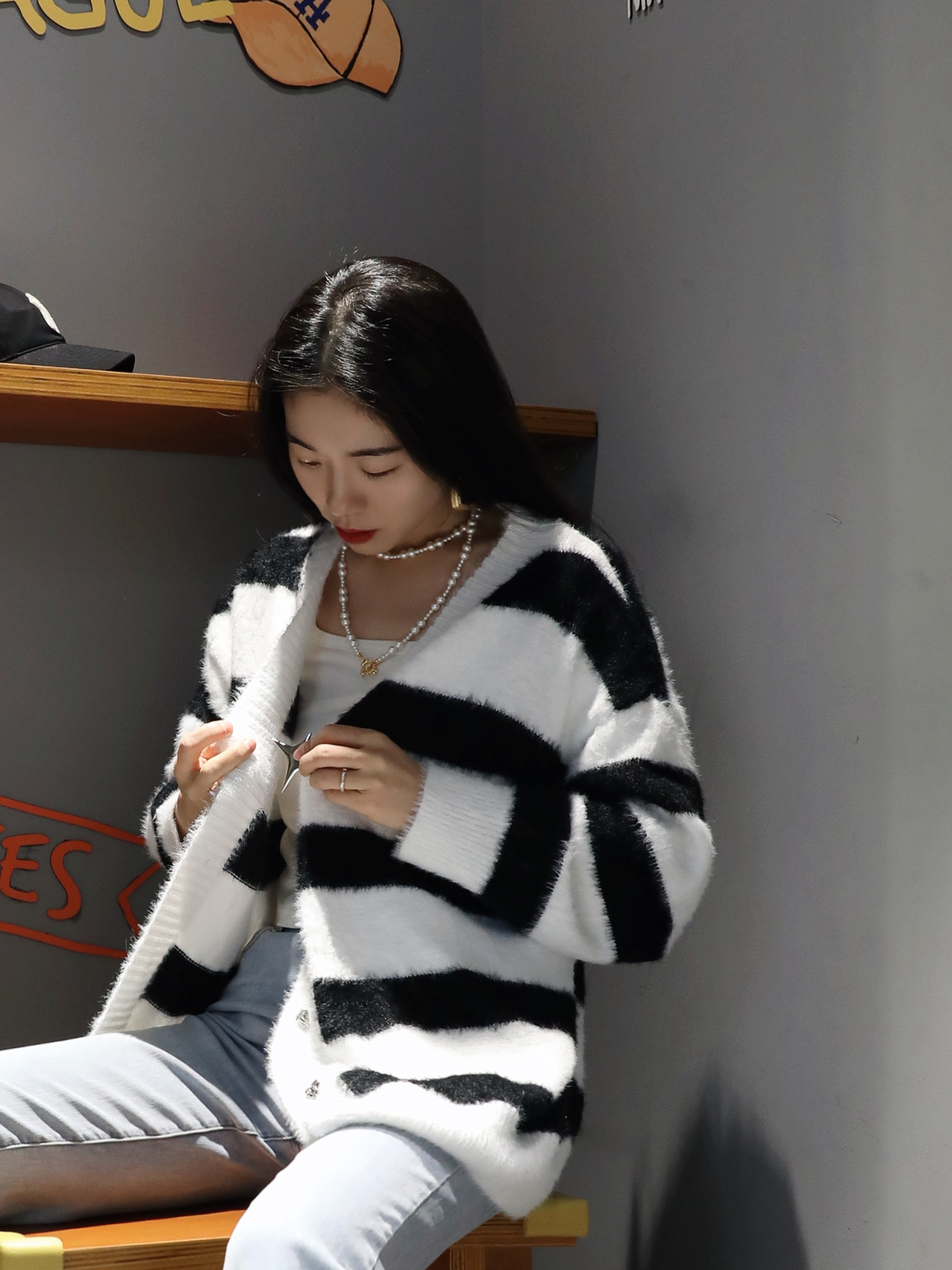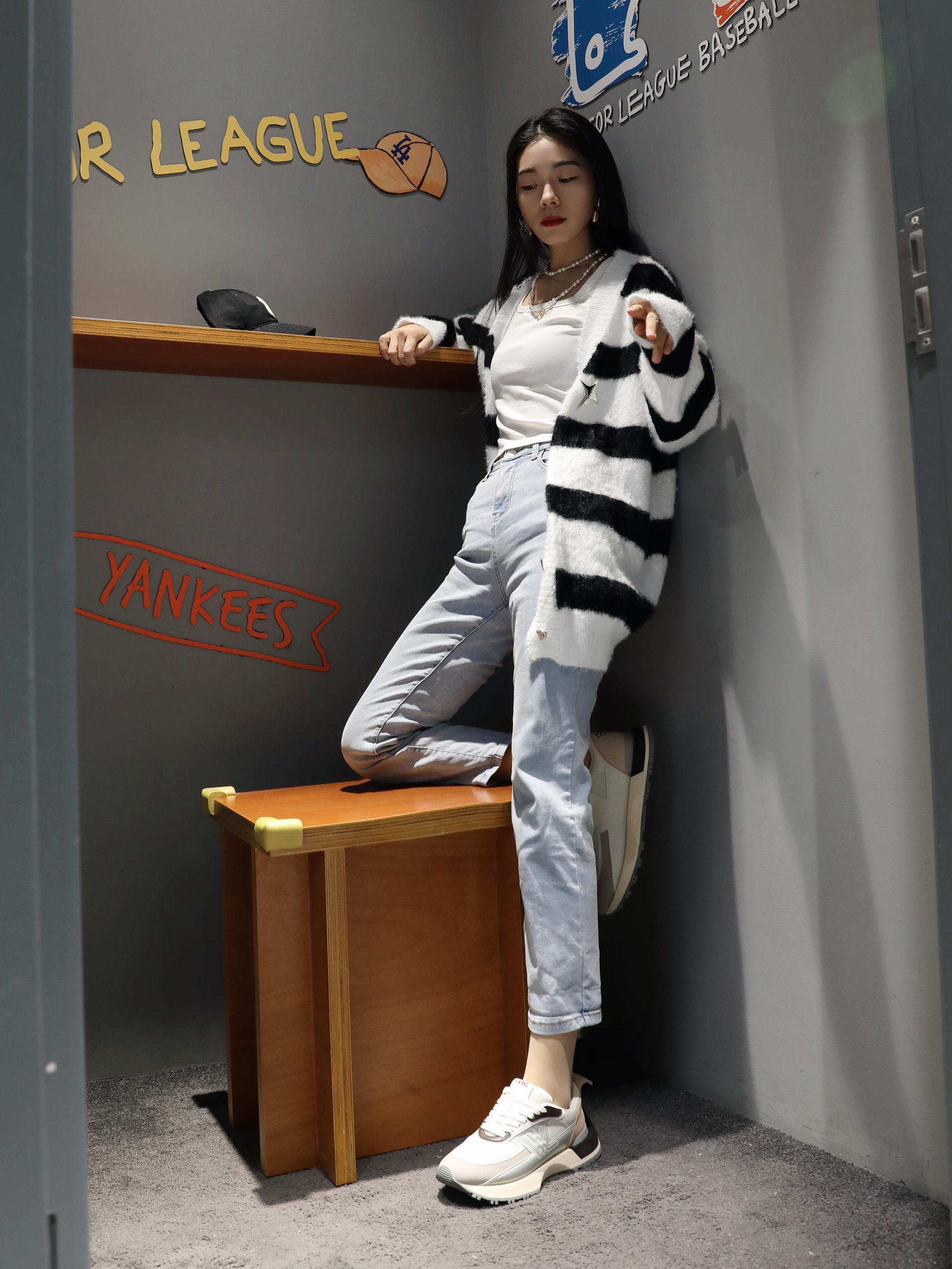 周末去买新衣~挑挑拣拣台 确实挑不到自己喜欢的~身上穿的 倒是格外满意FLIM家的开衫毛衣 软乎乎的傭懒又舒服 配色是我喜欢的黑自条纹 软软糯糯的好舒服,材质不扎人保暖的同时又很洋气 而且还有金属装饰,就显得与众不同了一些 我今天搭配相对来说比较休闲一条牛仔裤 搭刺探者的运动鞋白色内搭 很清纯洋溢哦~像个女大学生豆啊哈哈