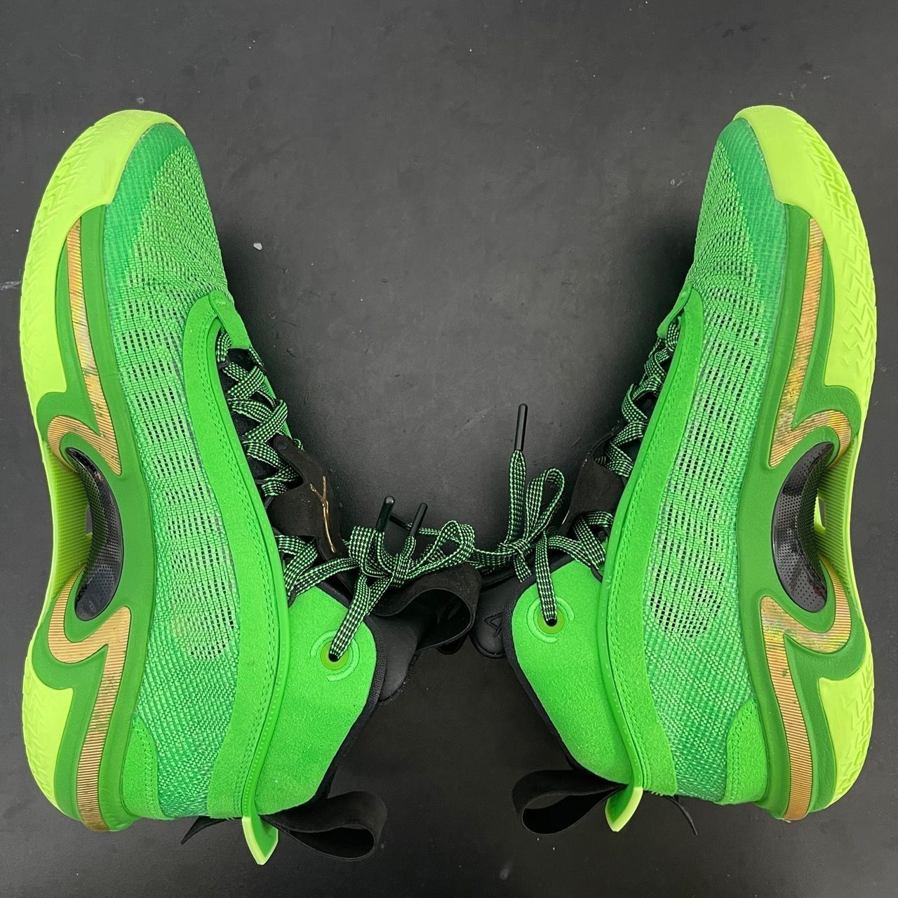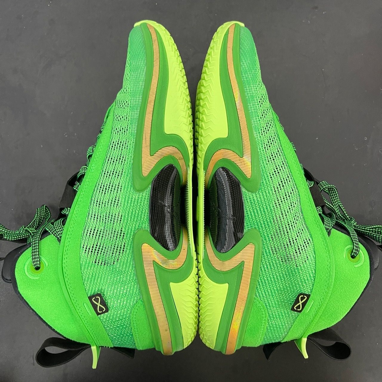 一双绿色篮球鞋真的很吸睛 鞋面支撑力超强大,最新版定制面料吸汗耐磨据说面料撑开可承受高空铅球的落下!回弹力棒呆! 鞋底前后气垫都包裹在鞋内没有裸露 打消了气垫外漏被扎破的风险,哈哈哈哈哈