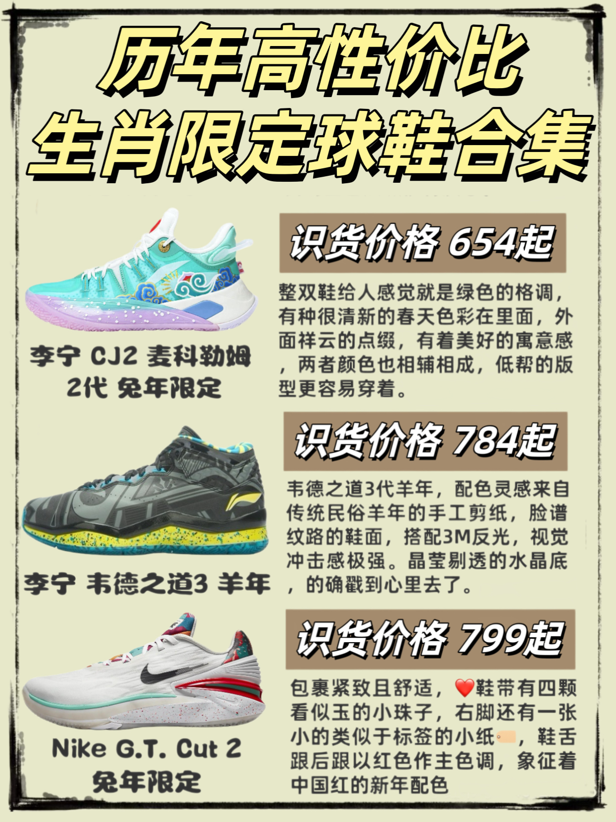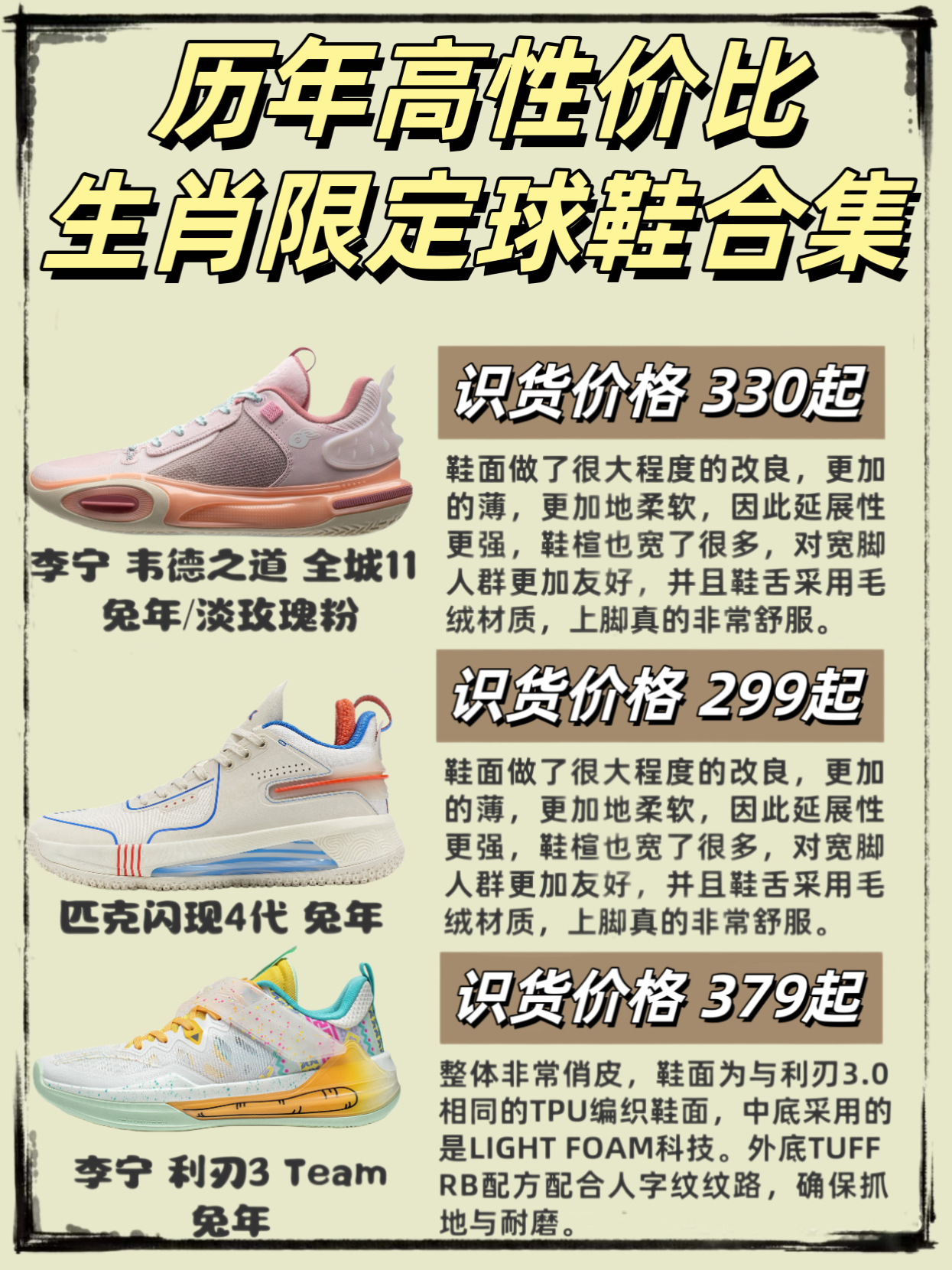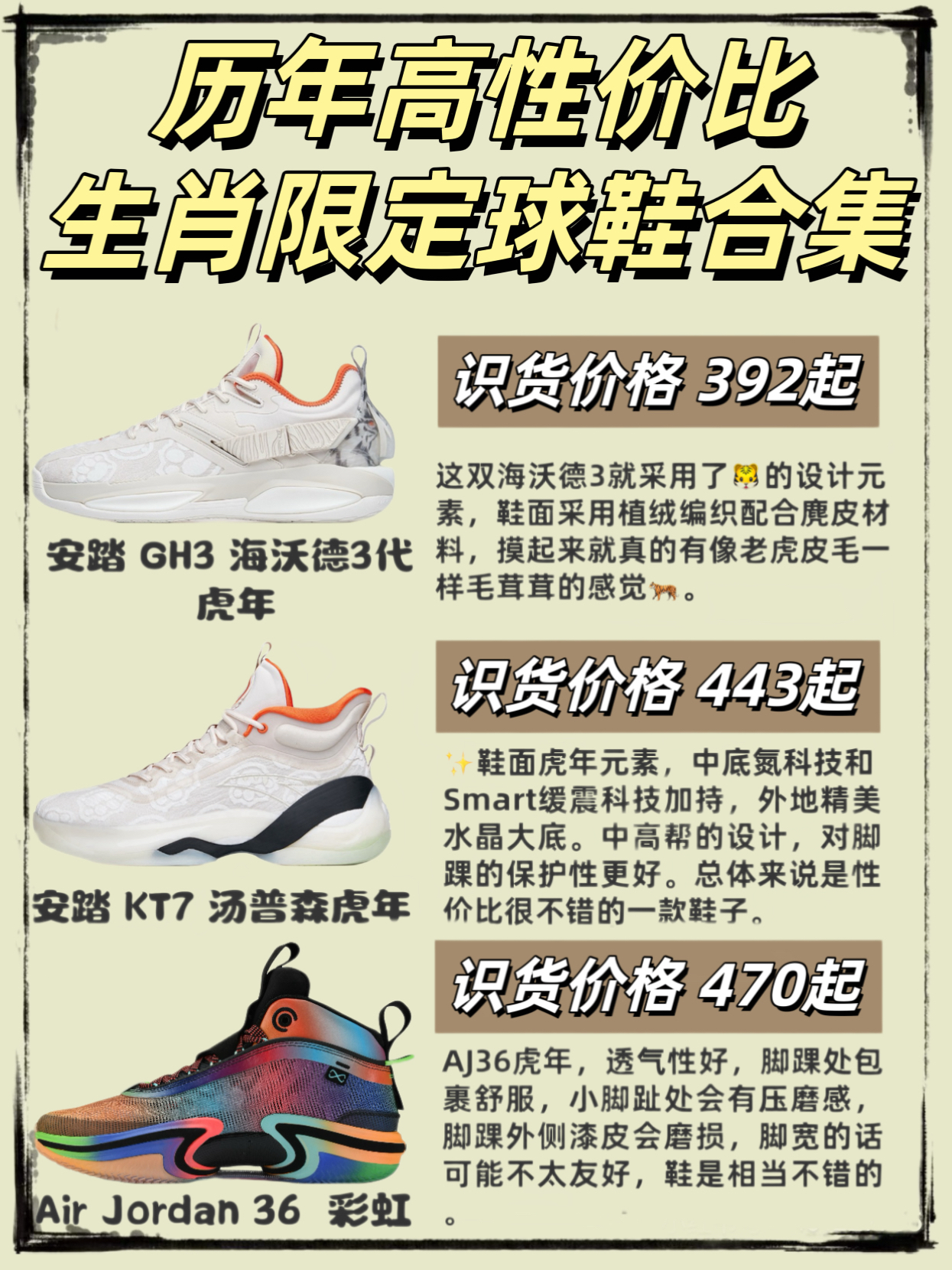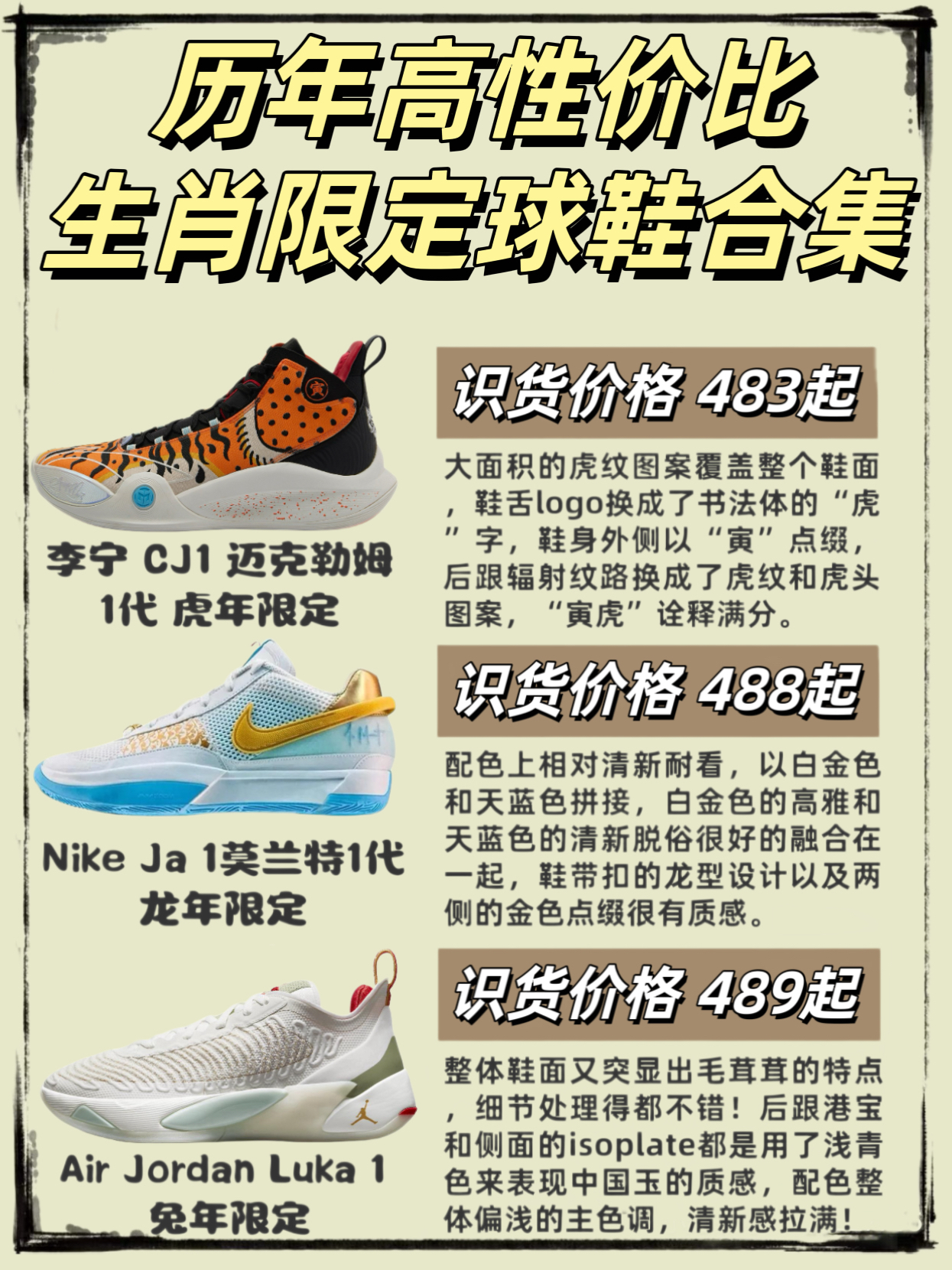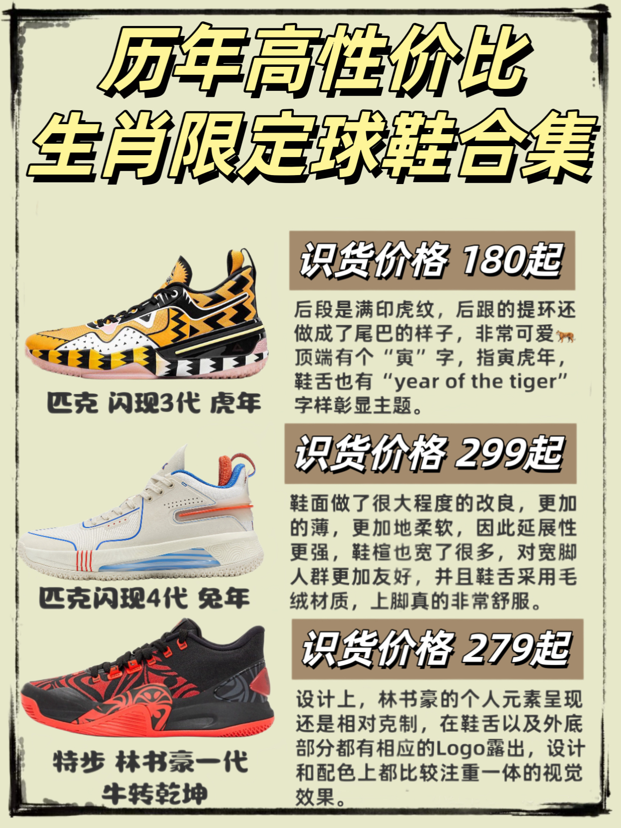 哈喽,亲爱的们💕,今天我来跟大家分享一下历年那些高性价比的生肖限定球鞋👟,不管你是不是球鞋控,相信看了这篇笔记,你一定会心动滴💗。 1. 匹克 闪现3代 缓震防滑耐磨 篮球鞋 虎年/萌虎 2. Nike Dunk 时尚百搭 轻便透气 板鞋 God of Wealth 高帮/虎年限定/财神/虎纹 3. 特步 林书豪一代 减震防滑耐磨 实战 篮球鞋 牛转乾坤 4. 李宁 韦德之道 全城11高回弹 ...