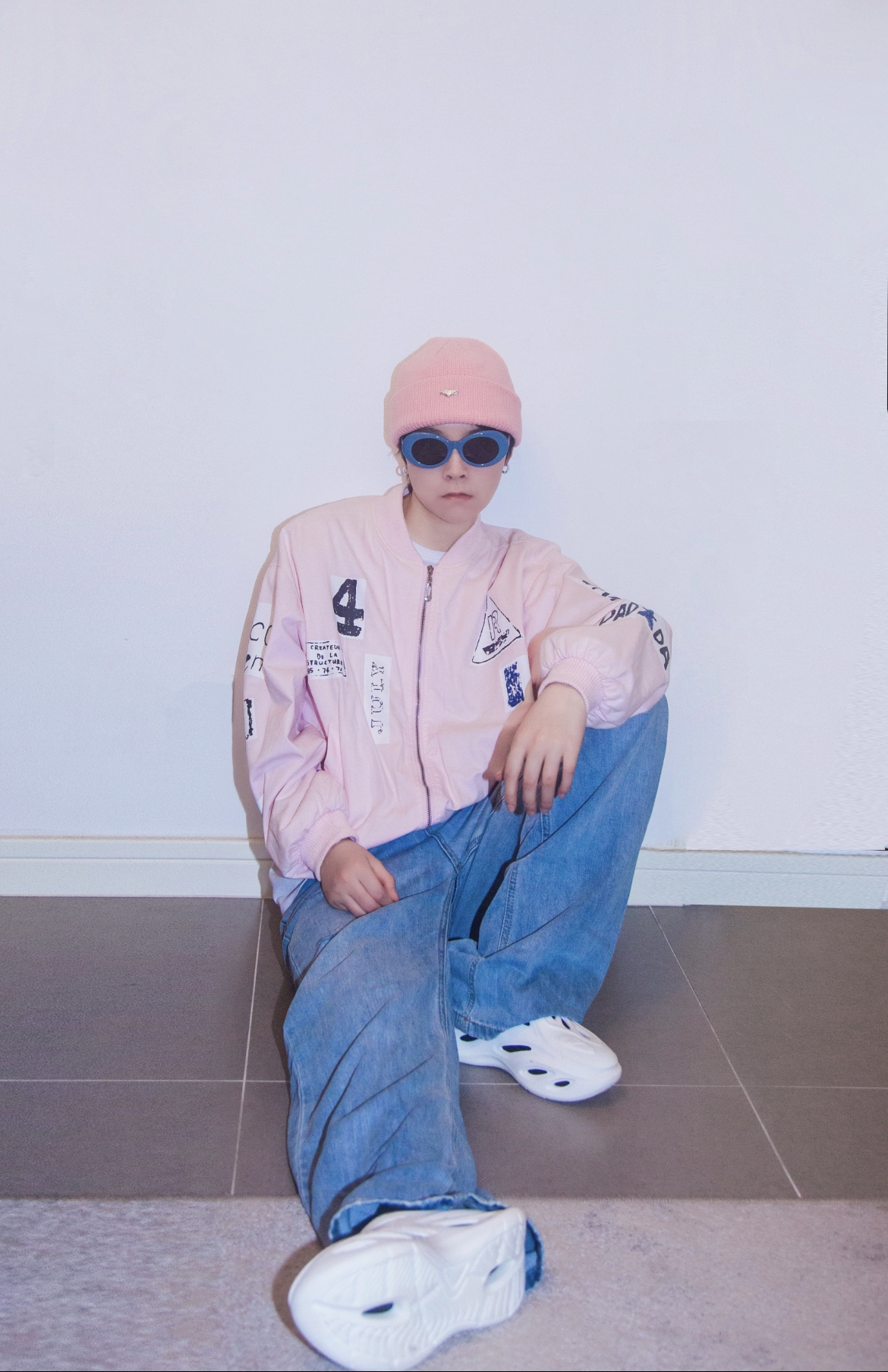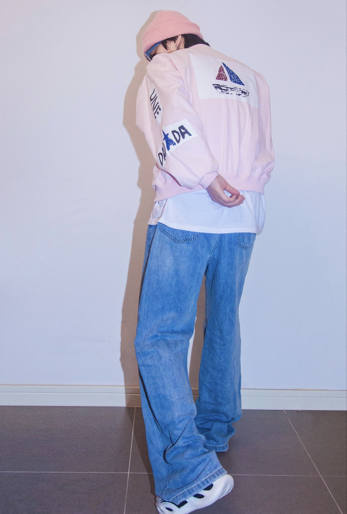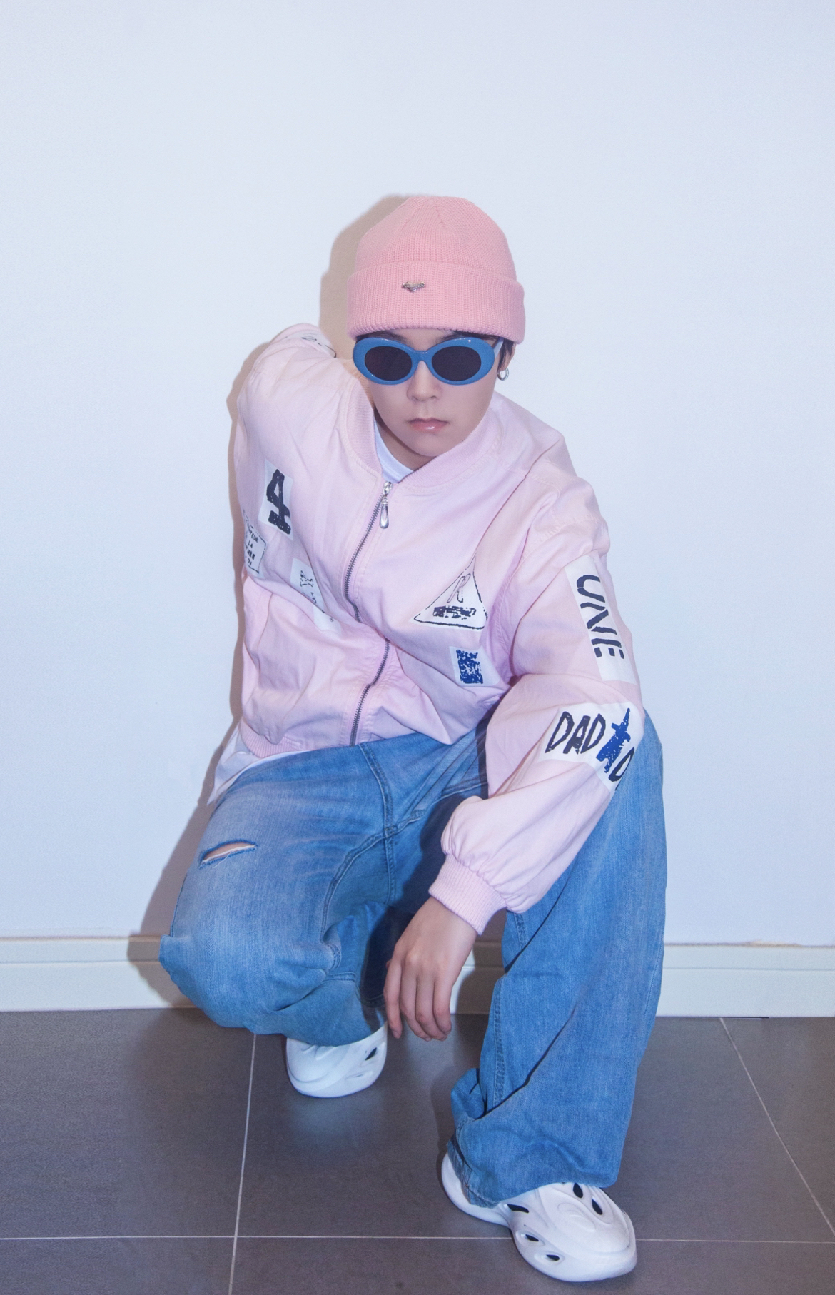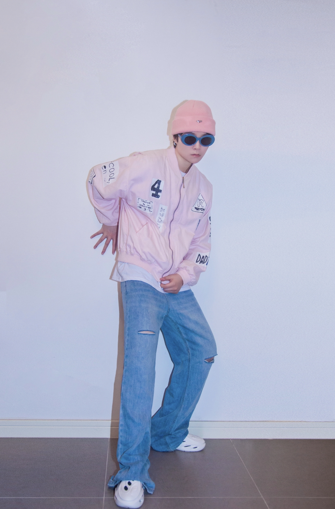 穿搭指南: 粉色已经成为一种中行的流行色了 无论是猛男还是小公主都能驾驭~粉色棒球外套也太减龄太有活力了! 这个季节破洞裤也可以开始穿起来啦 破洞越多越时尚哈哈哈 蓝色水洗牛仔和粉色不能更配 最后玩转色彩最简单的一步就是颜色呼应 我选了粉色针织帽和蓝色镜框的墨镜来分别呼应上衣和裤子的颜色 这样整个一套既能说缤纷色彩 又不会眼花缭乱了