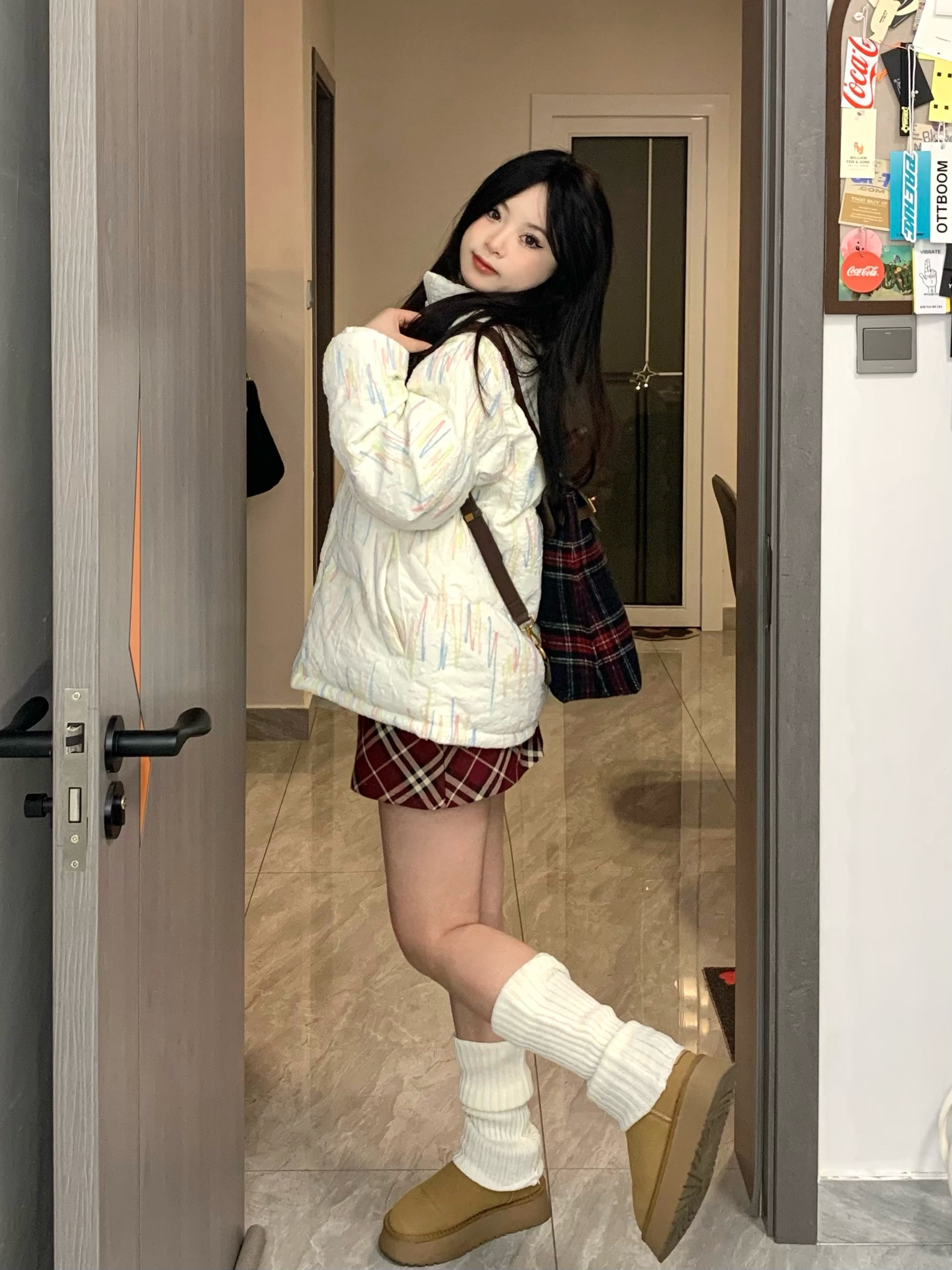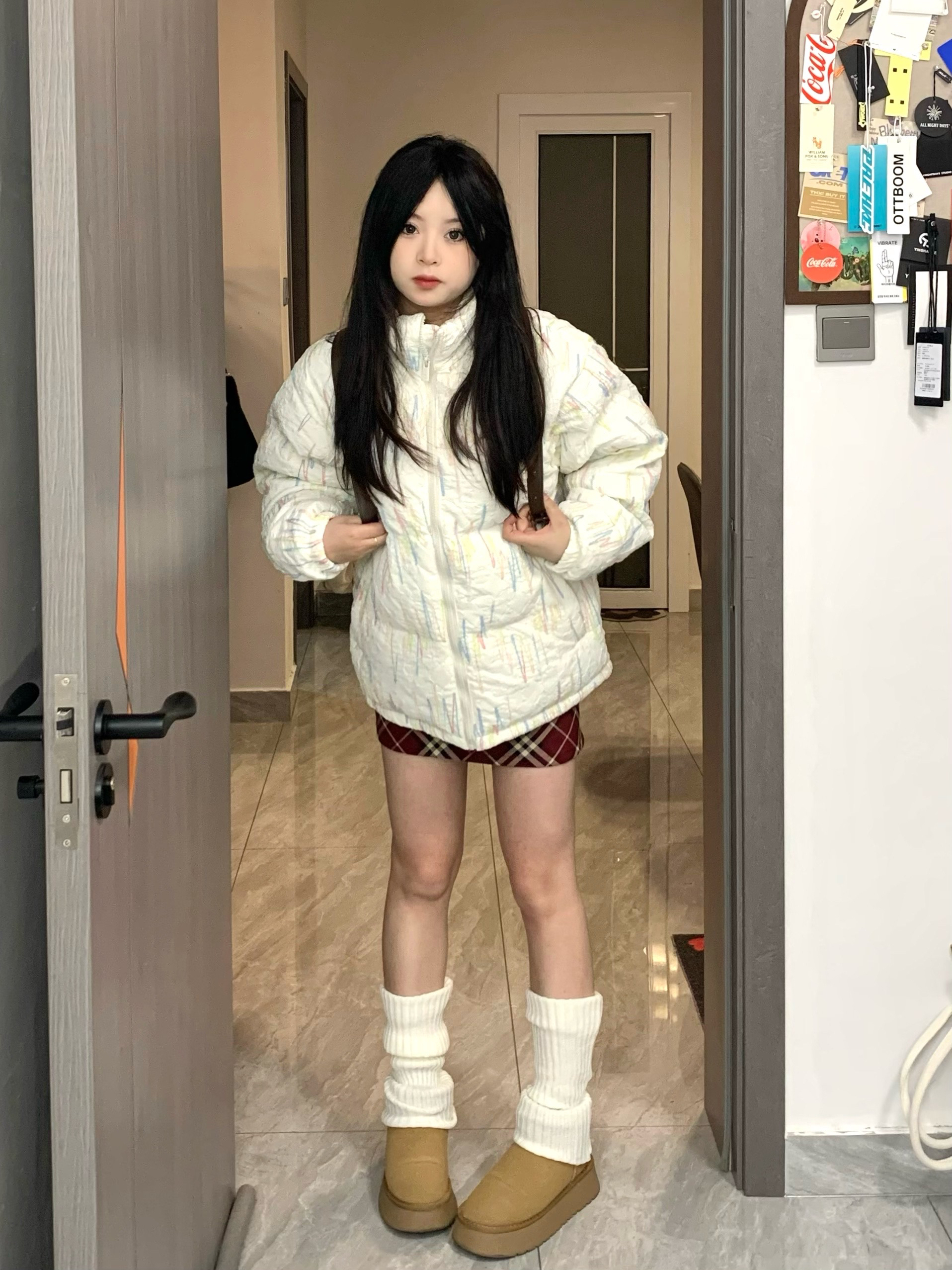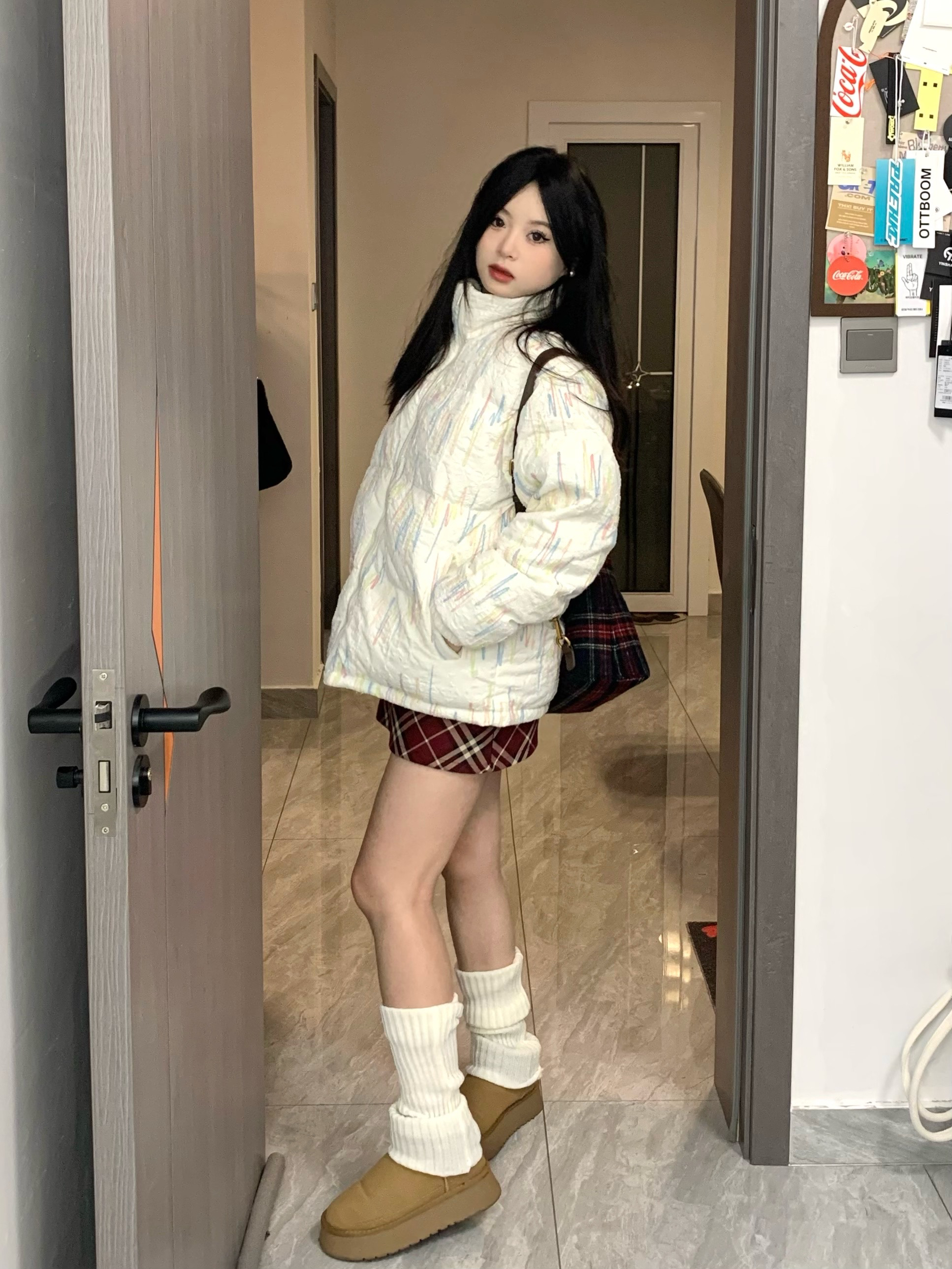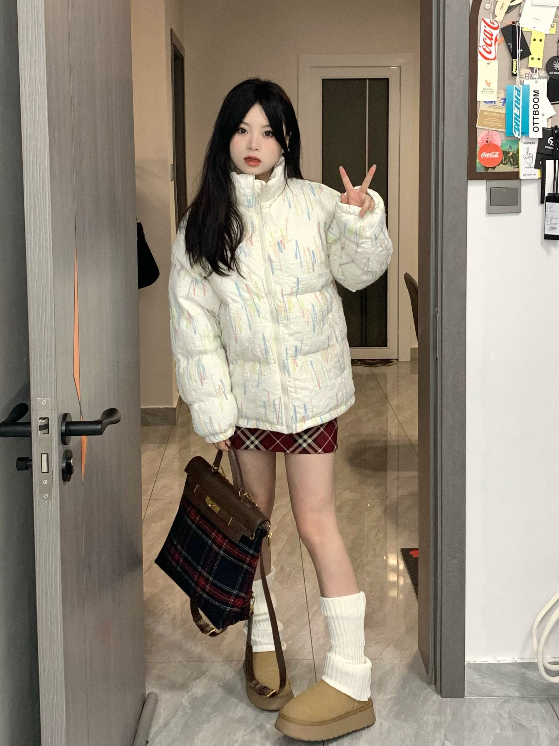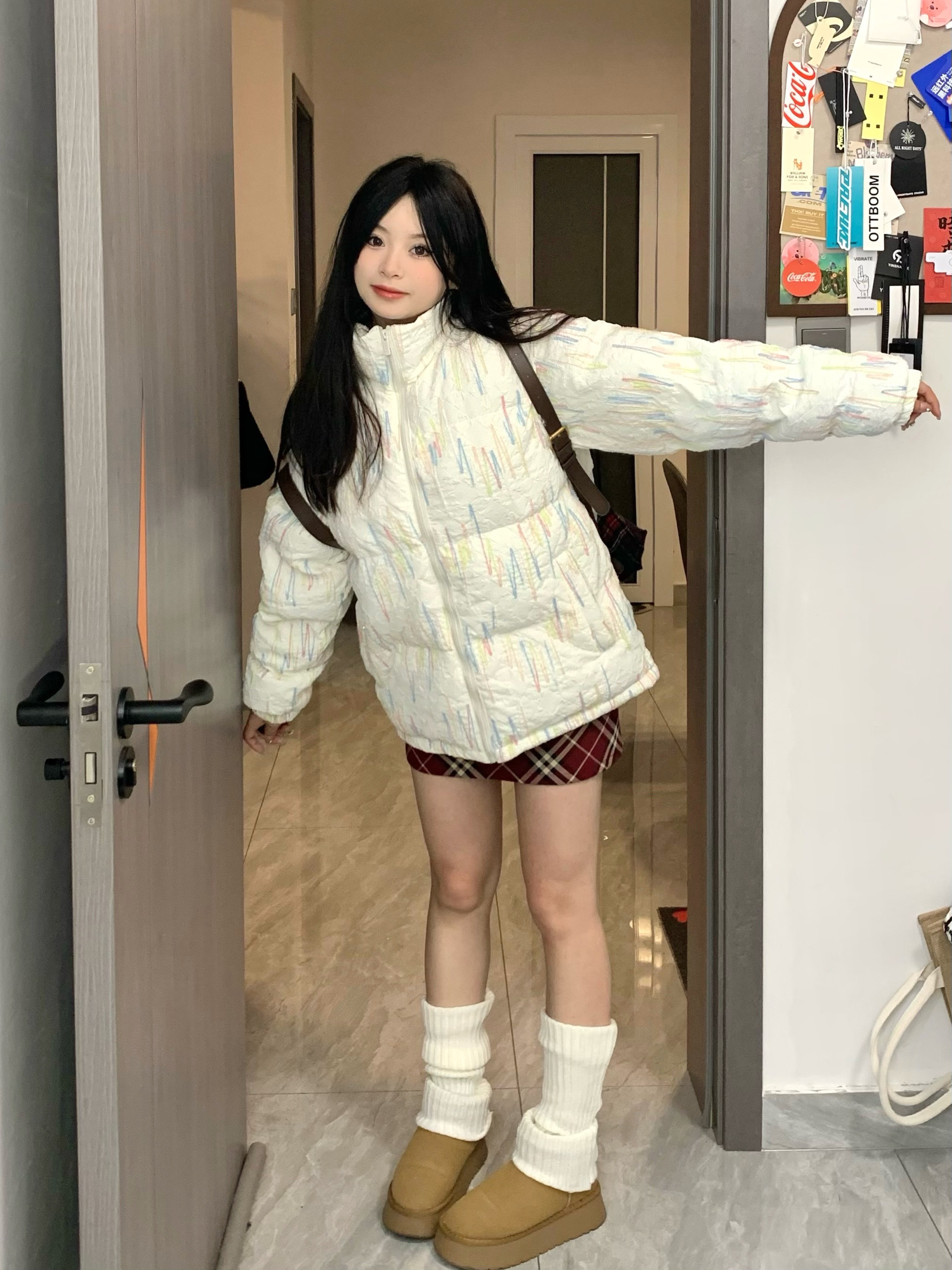omg真真真的好喜欢这一套☃️☃️ 这件棉服尊嘟好好看!整体有彩虹编织立体刺绣 穿上奶呼呼的感觉~也太可爱了!搭配了红色格子短裙和袜套~一套搭配下来甜美又温柔~