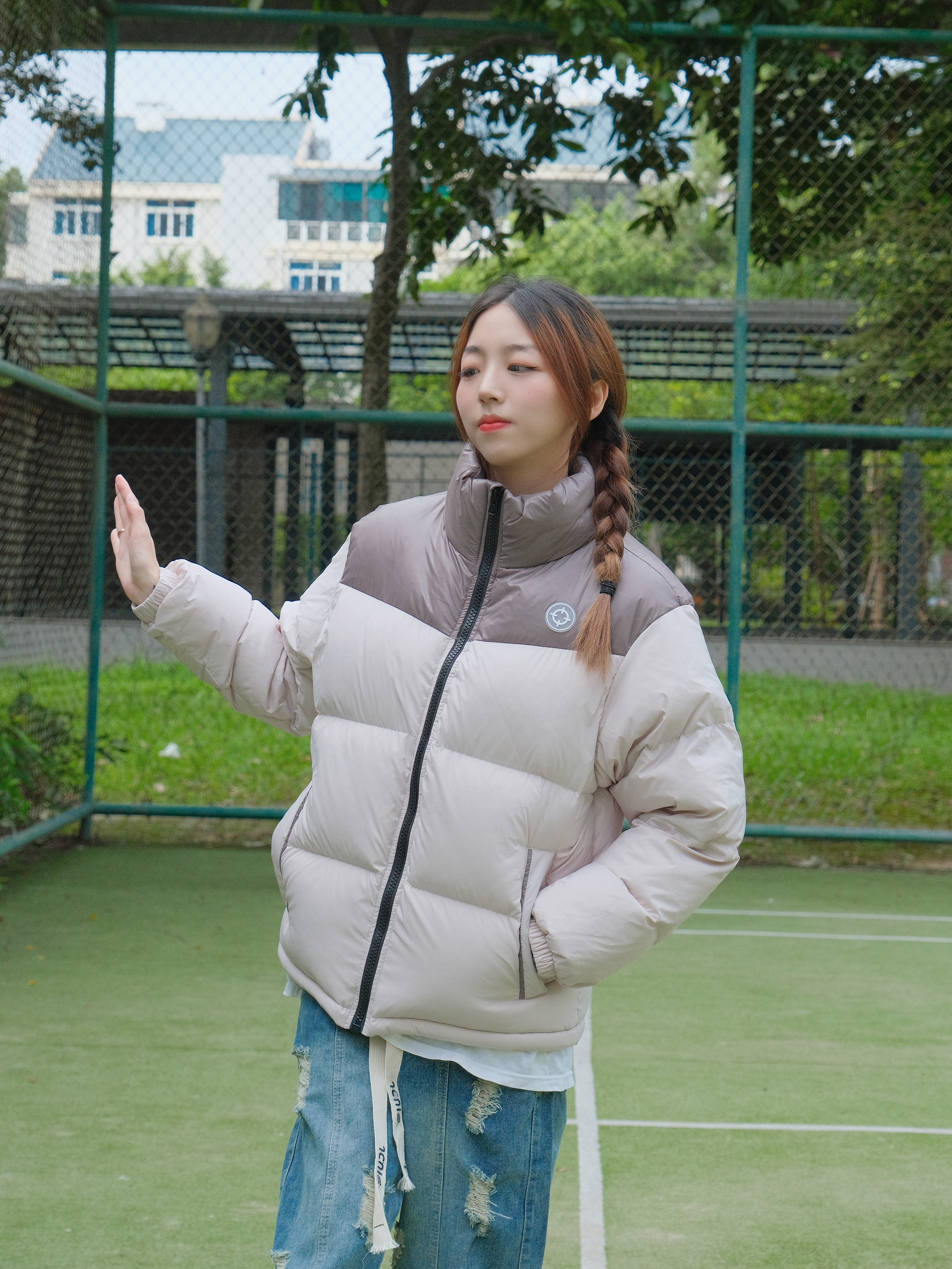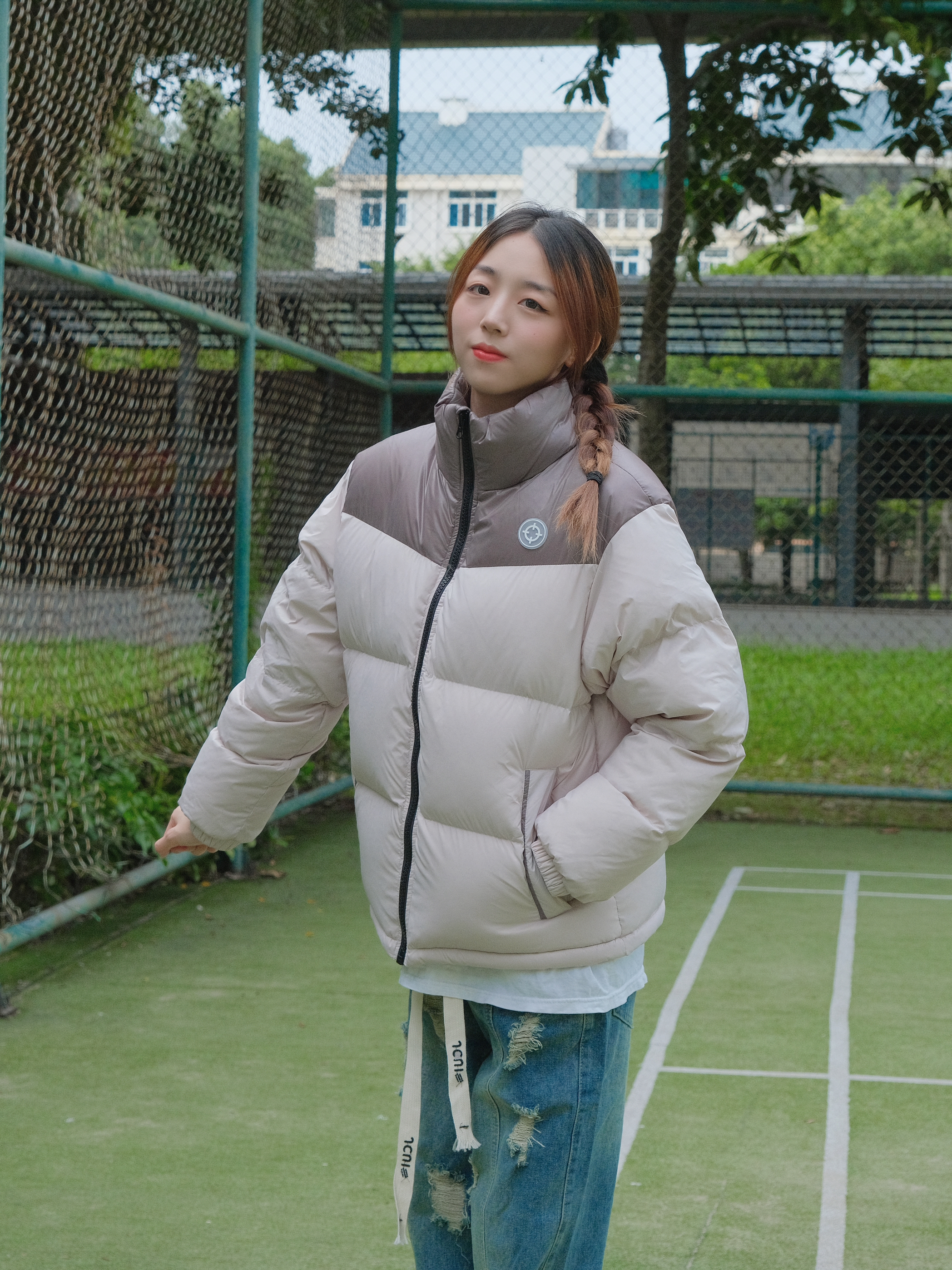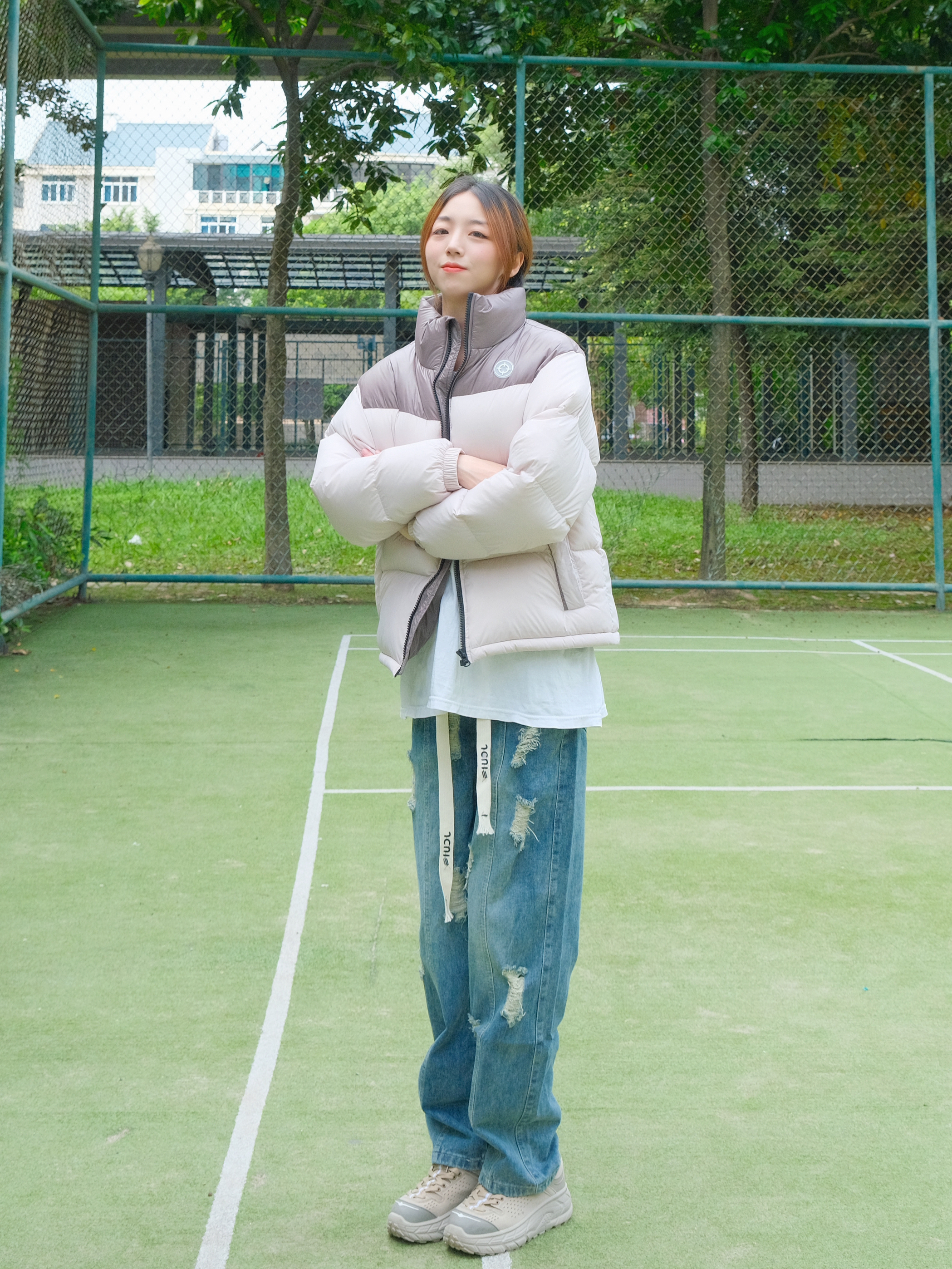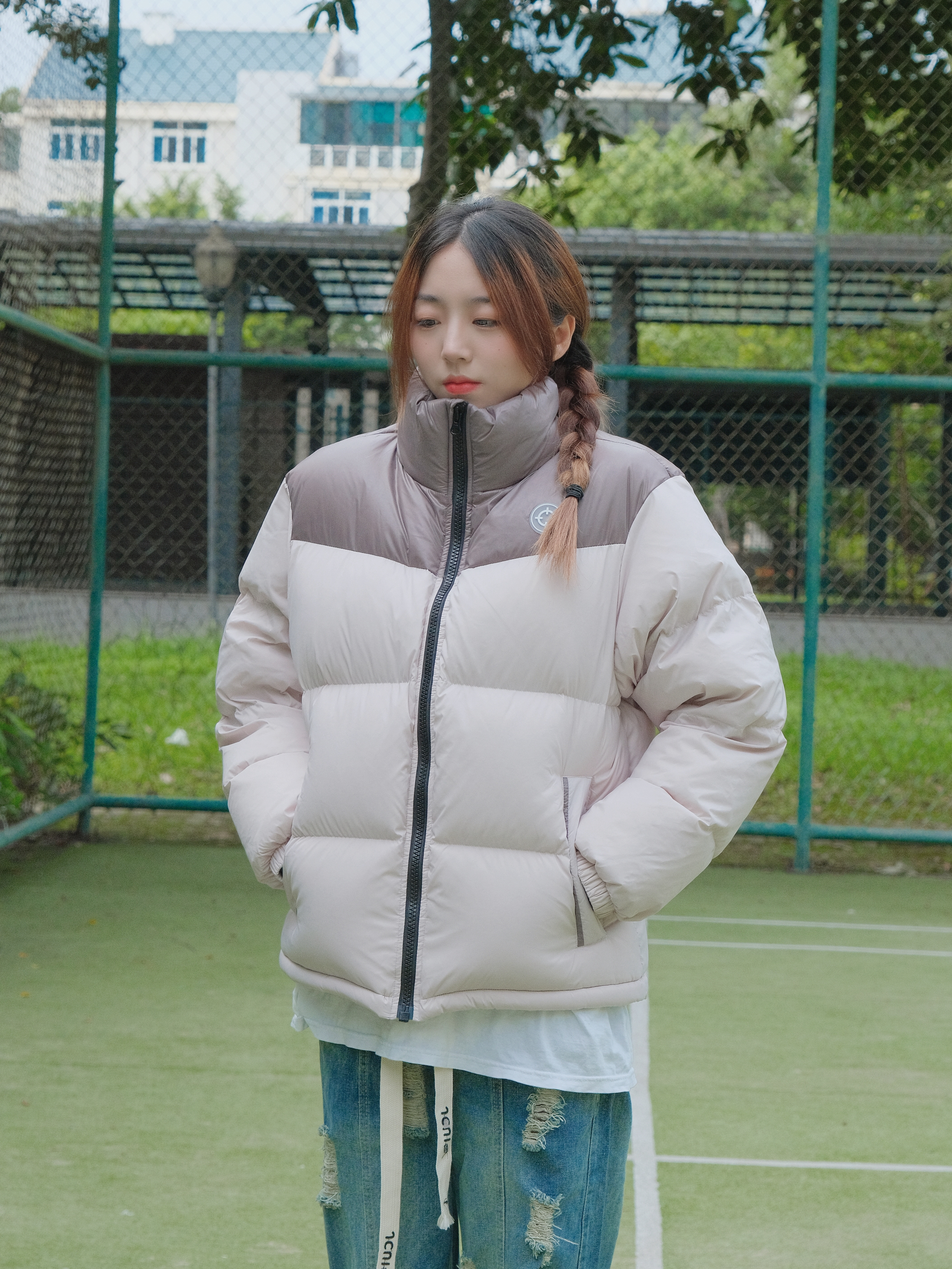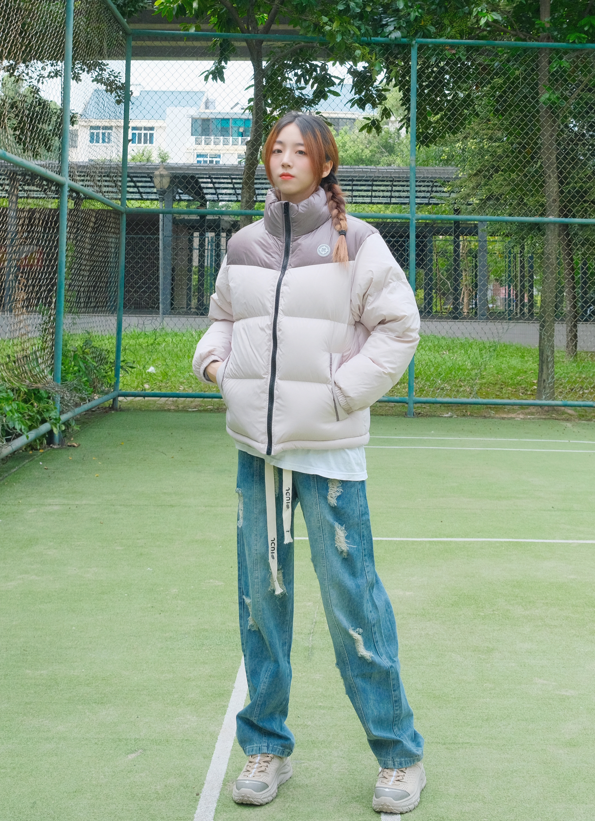 Halo!这里是小铭同学的穿搭分享频道身高:168 体重:44 来点不一样的羽绒服~ 浅色系也照样可以搭配hin好看呀再搭配一条破洞宽松牛仔裤 門做冬日最酷保暖女孩念~