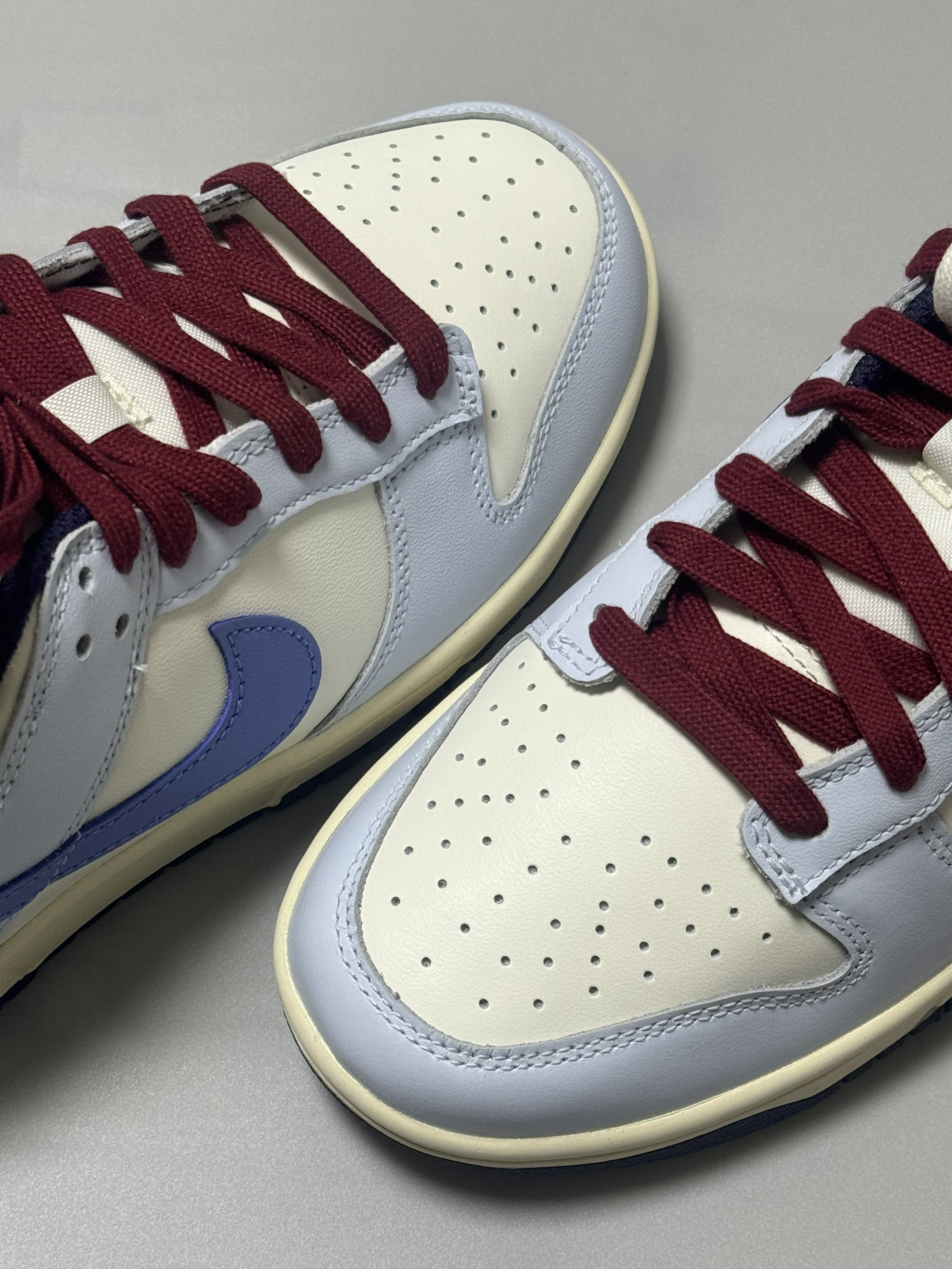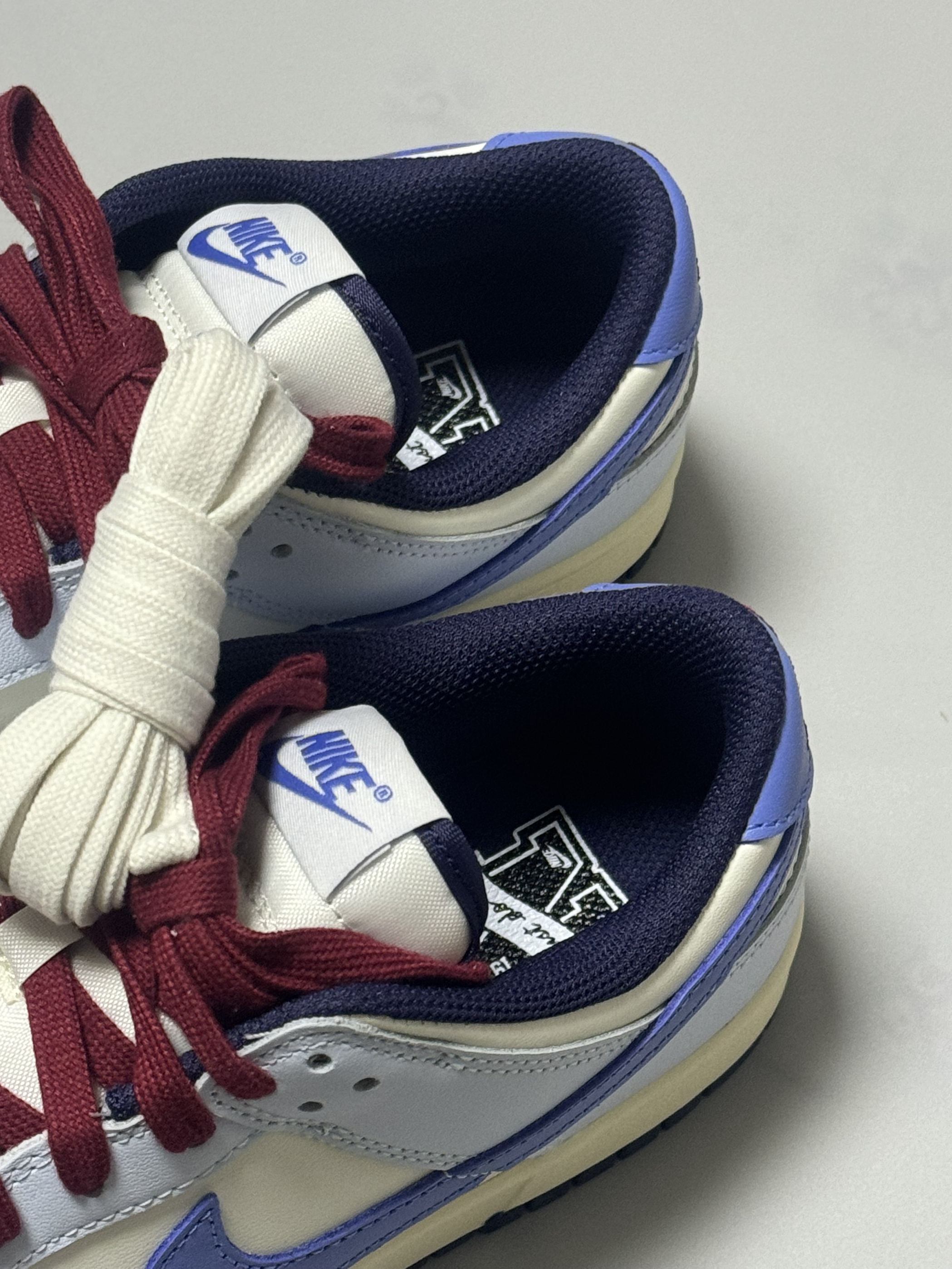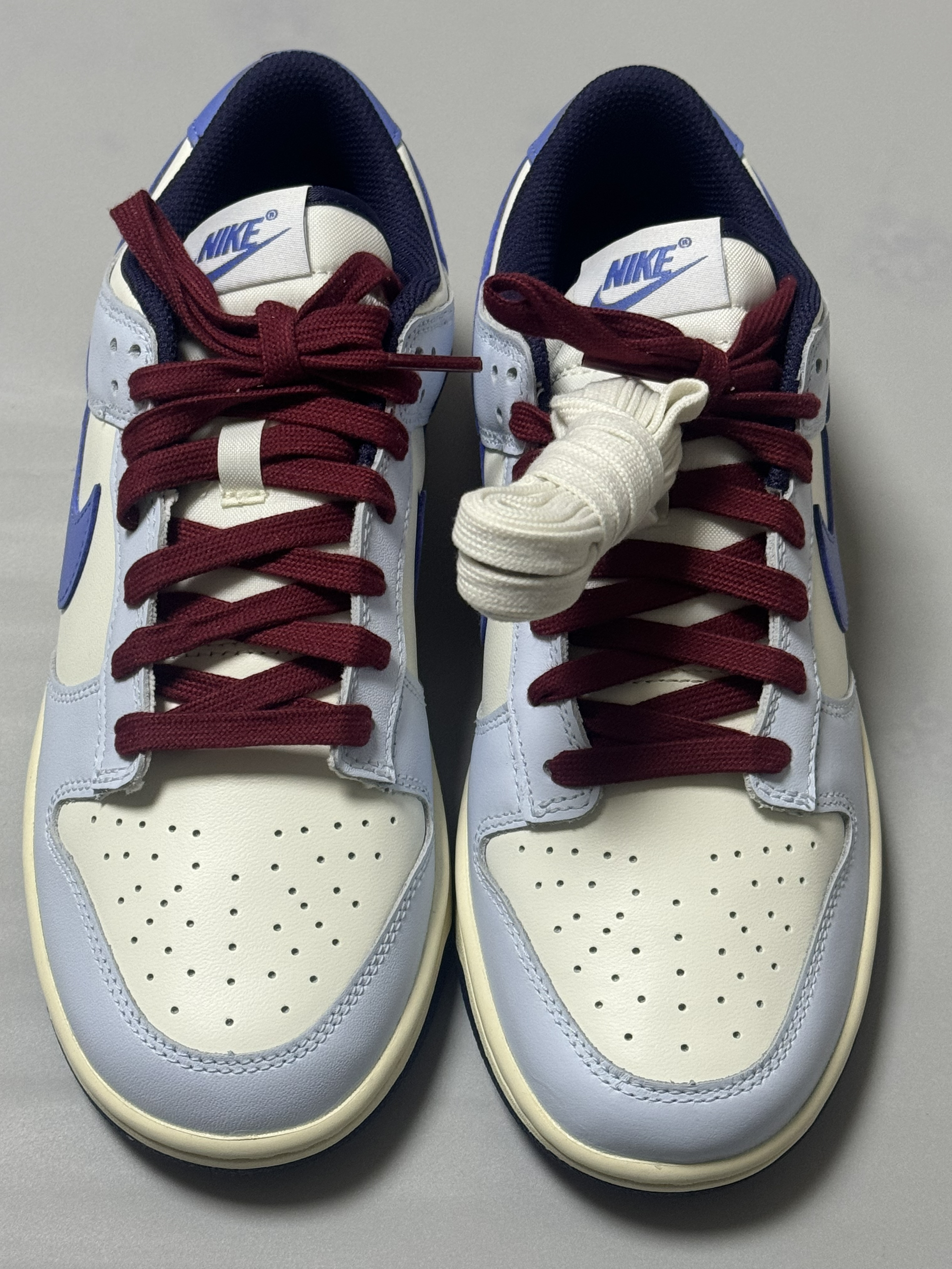 halo 阿迪来了,马上圣诞节就要到了,本期和大家分享一双我个人最近入手非常好看的一双dunk low! 没错,就是这款米蓝配色的dunk low,整双鞋以米白色为主调,搭配雾霾蓝鞋身框架,视觉效果简约大气。 鞋身采用荔枝纹皮革,而 Swoosh及后跟则采用淡紫色点缀,极具视觉冲击力。 最后酒红色的鞋带虽然非常的拉风,但是可能会觉得有些不太协调,不过好在🈶一个赠送的米白色鞋带! 总的来说,这双鞋颜...