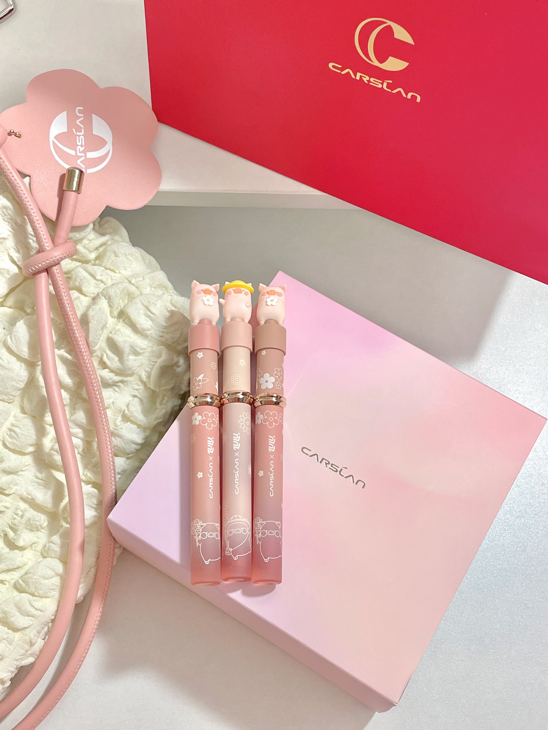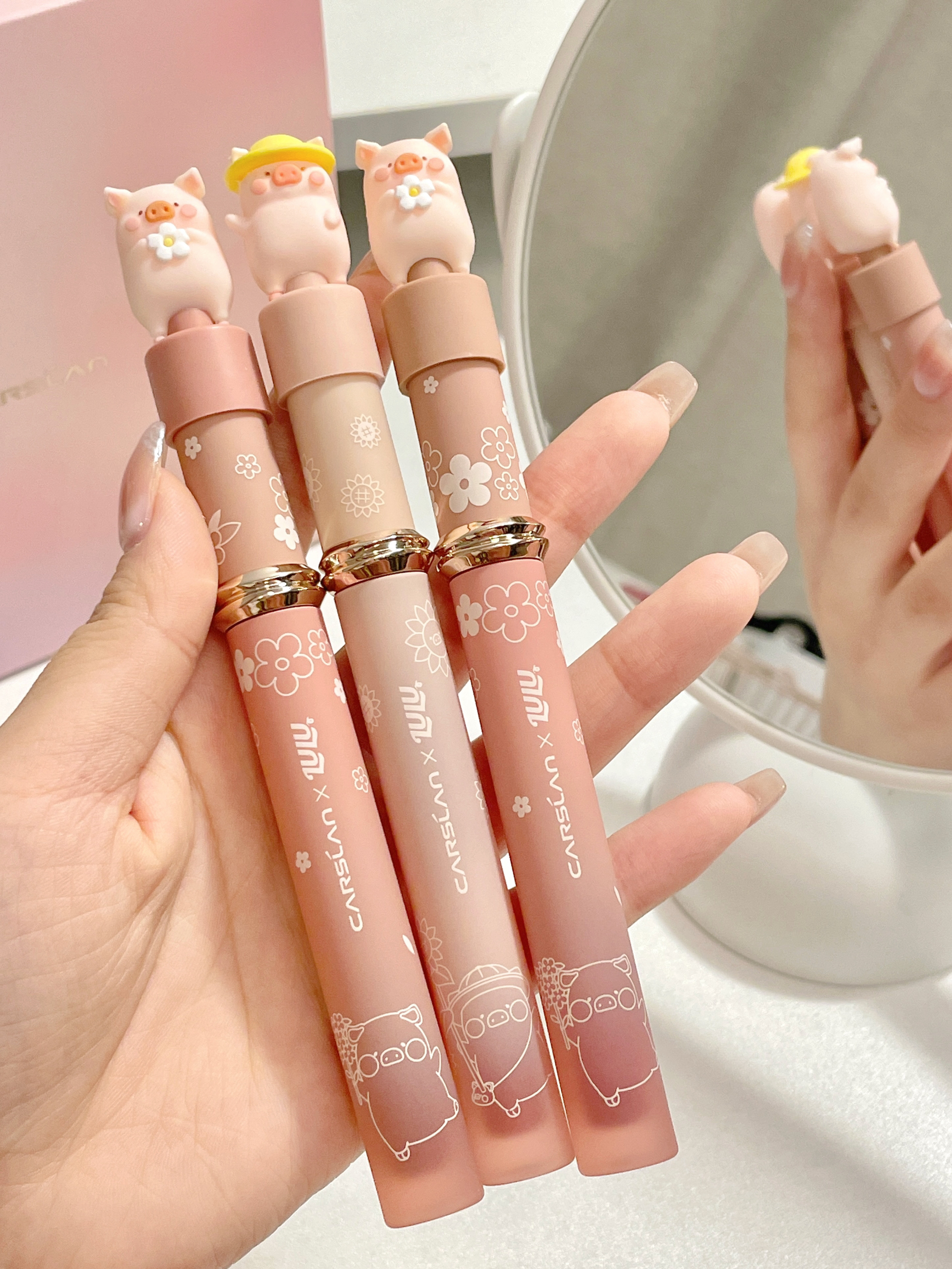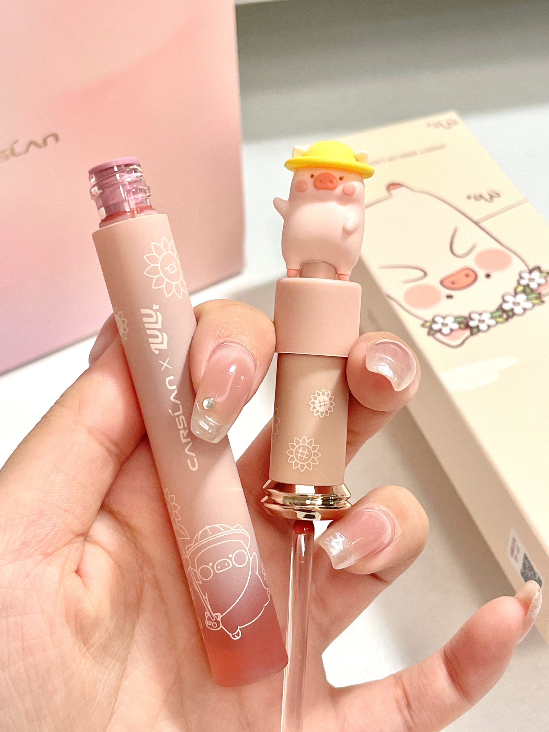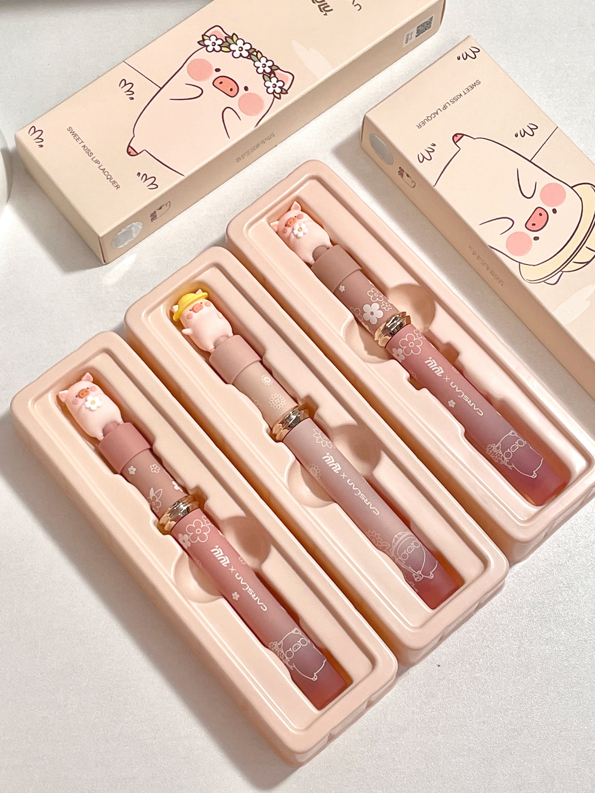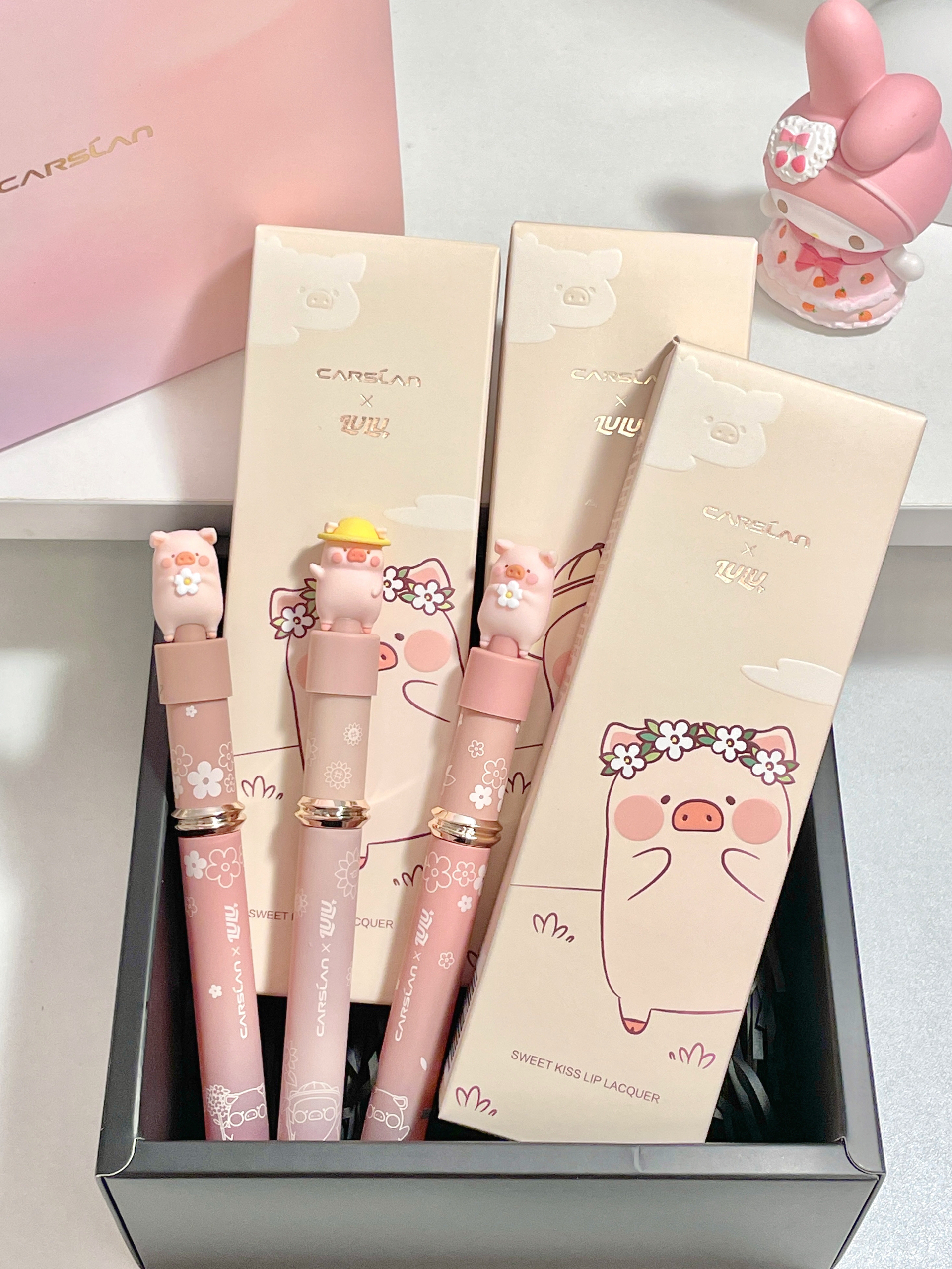 好可爱!!居然是和lulu猪联名的口红 礼盒里面有三只唇釉+包包👛 粉粉嫩嫩的上面还有可爱的猪猪 颜色日常又百搭 两只丝雾的一只镜面的 可以随意搭配妆容!太贴心了~ 呜呜!这么漂亮的礼物到底是谁在拥有呀! 收到不得幸福晕咯😭