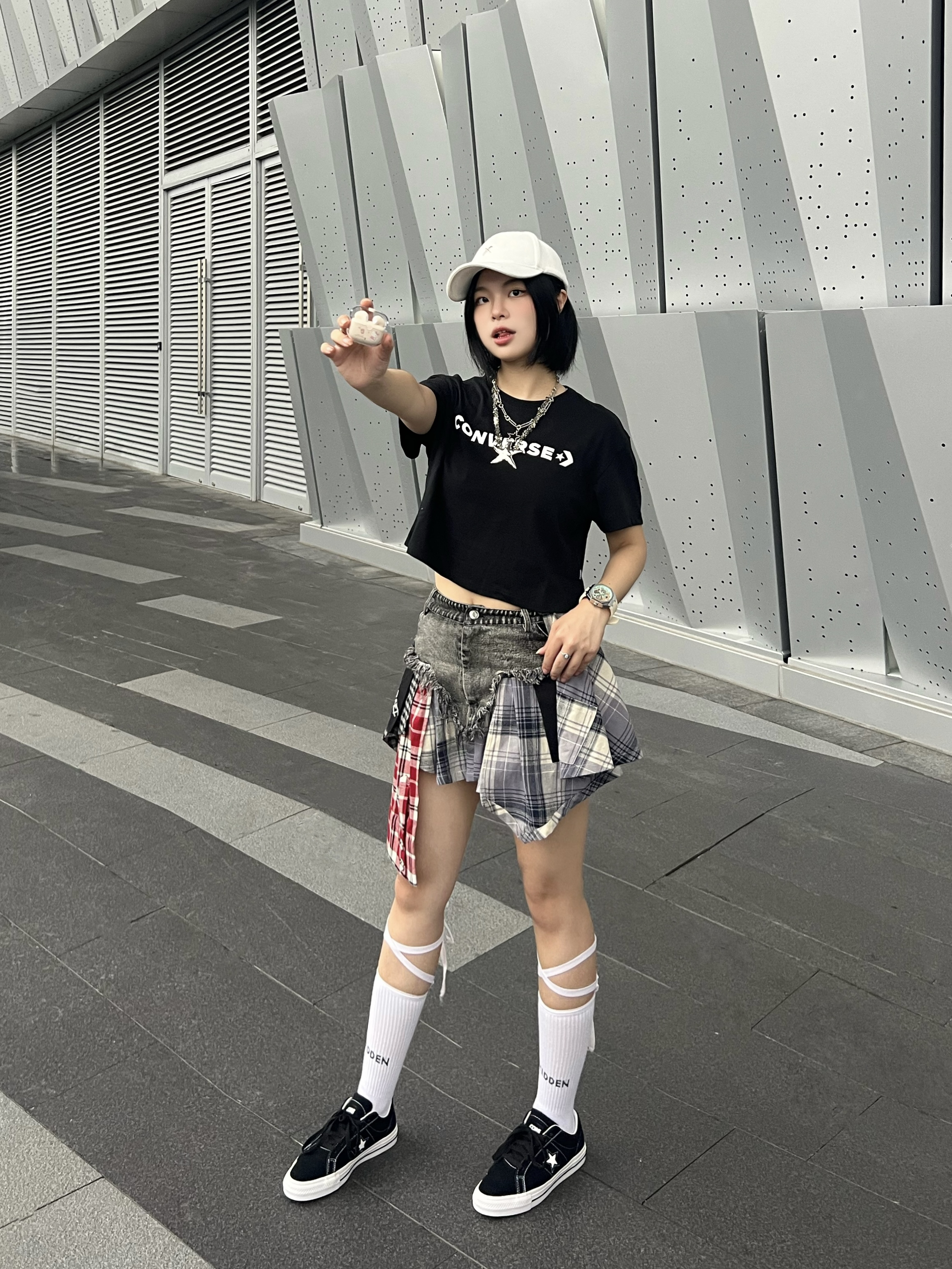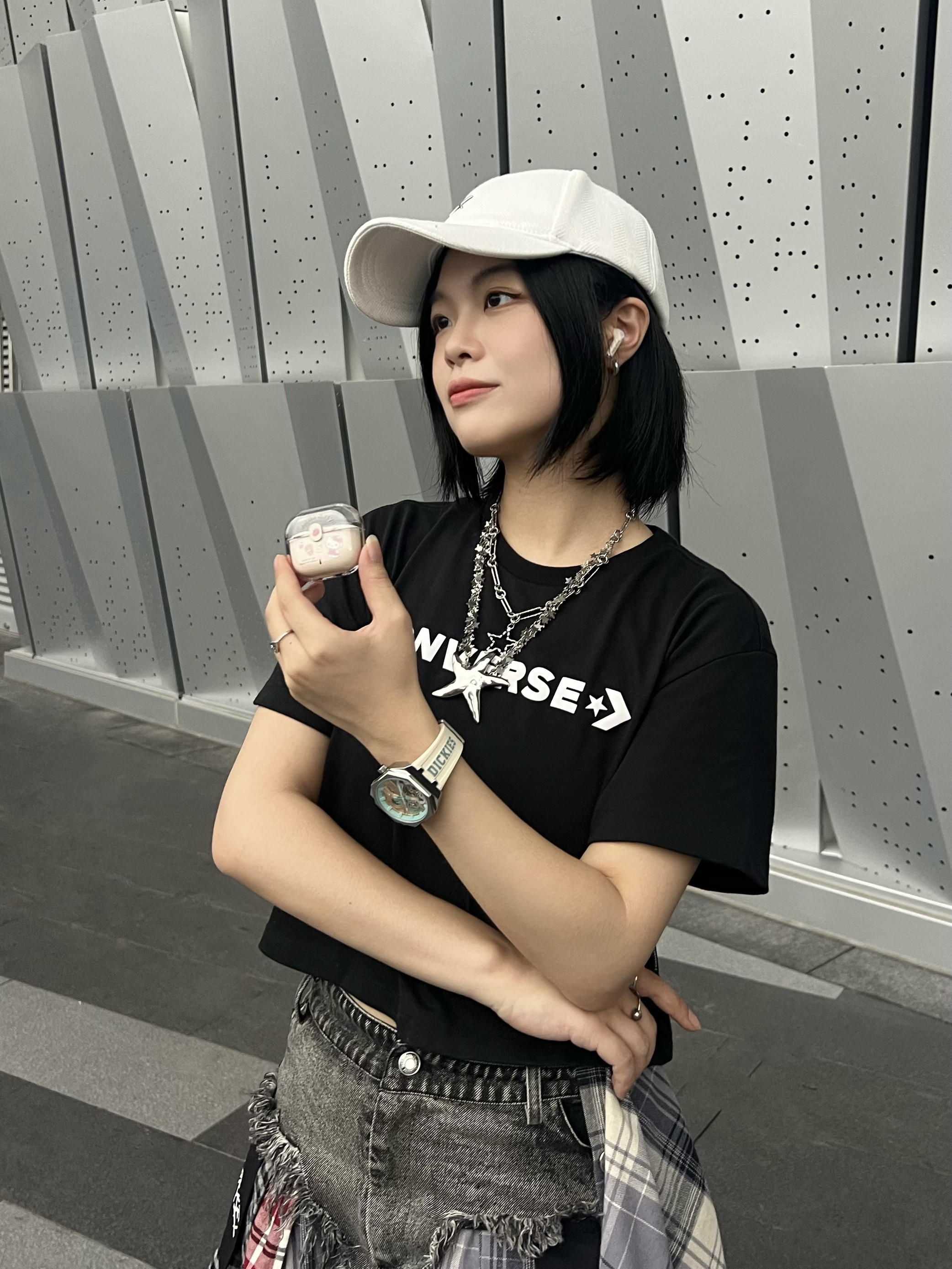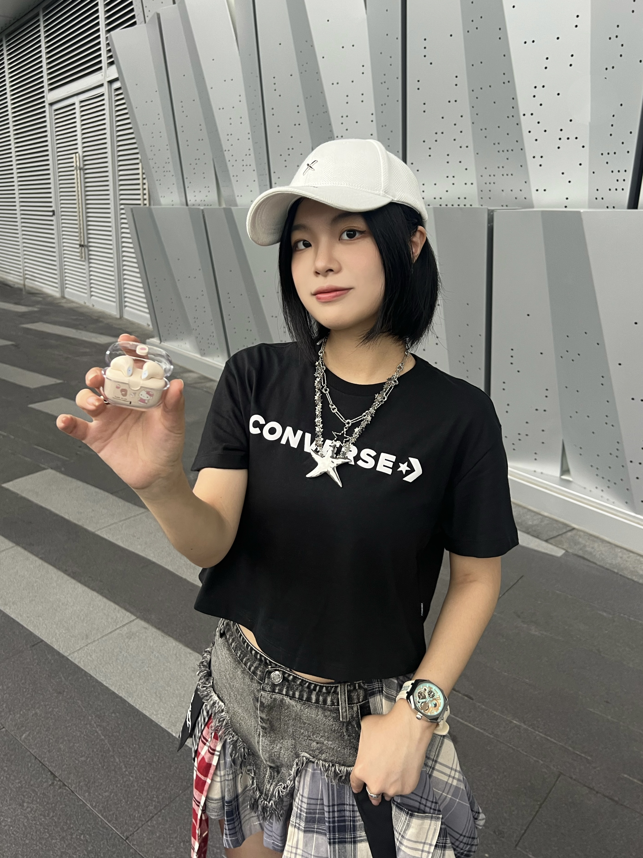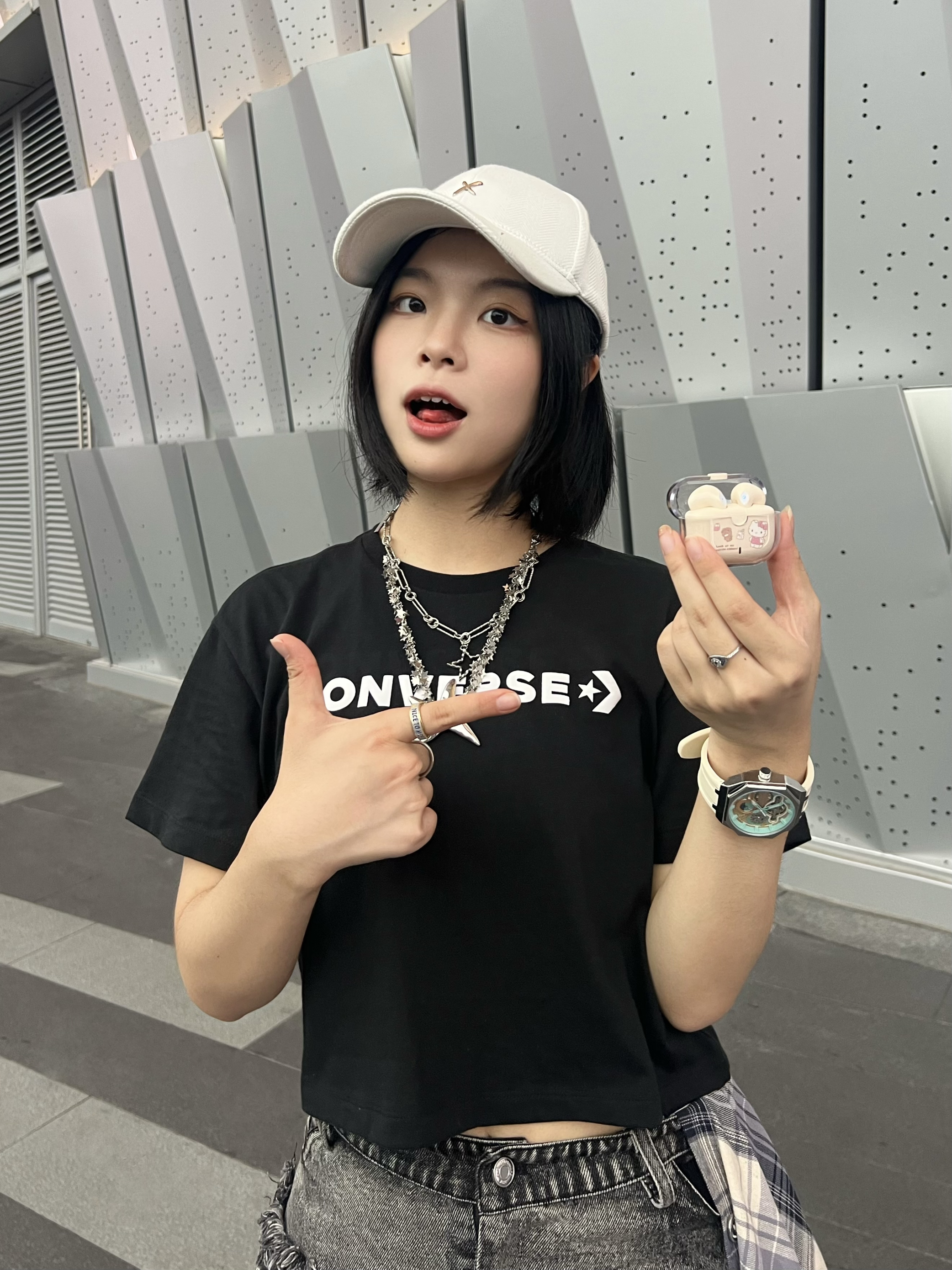 今天是元气满满的运动风女孩👧 短款T恤搭配一条不规则牛仔裙美式风满满✌️ 搭配棒球帽🧢氛围感十足😉 - 手表⌚️也是我很爱的配饰 特别是穿短袖的时候 戴上手表就比较有质感🤣 还很显手腕细 这款白色的机械表就很深得我心💕 白蓝配色清新淡雅 硅胶表带戴上很舒服 还有不同颜色送礼也很适合✌️ - 耳机也是我平时出门必不可少的单品 凯蒂猫少女感满满 外观颜值高 音质也不错👍