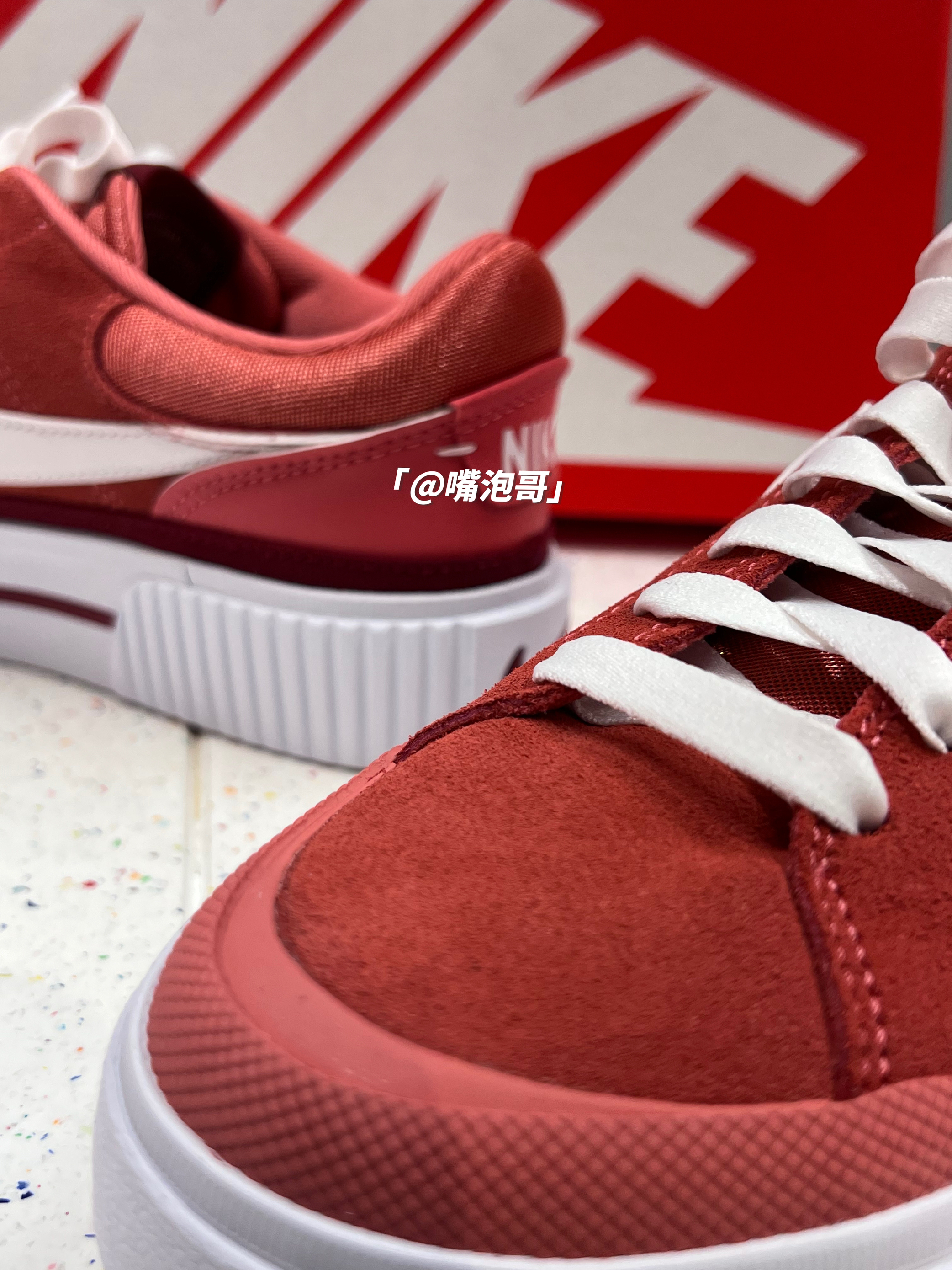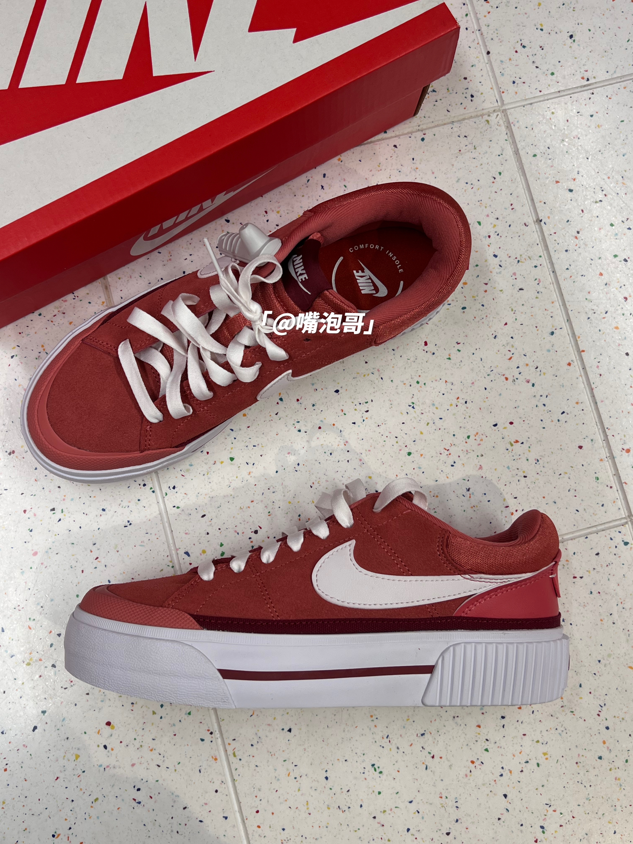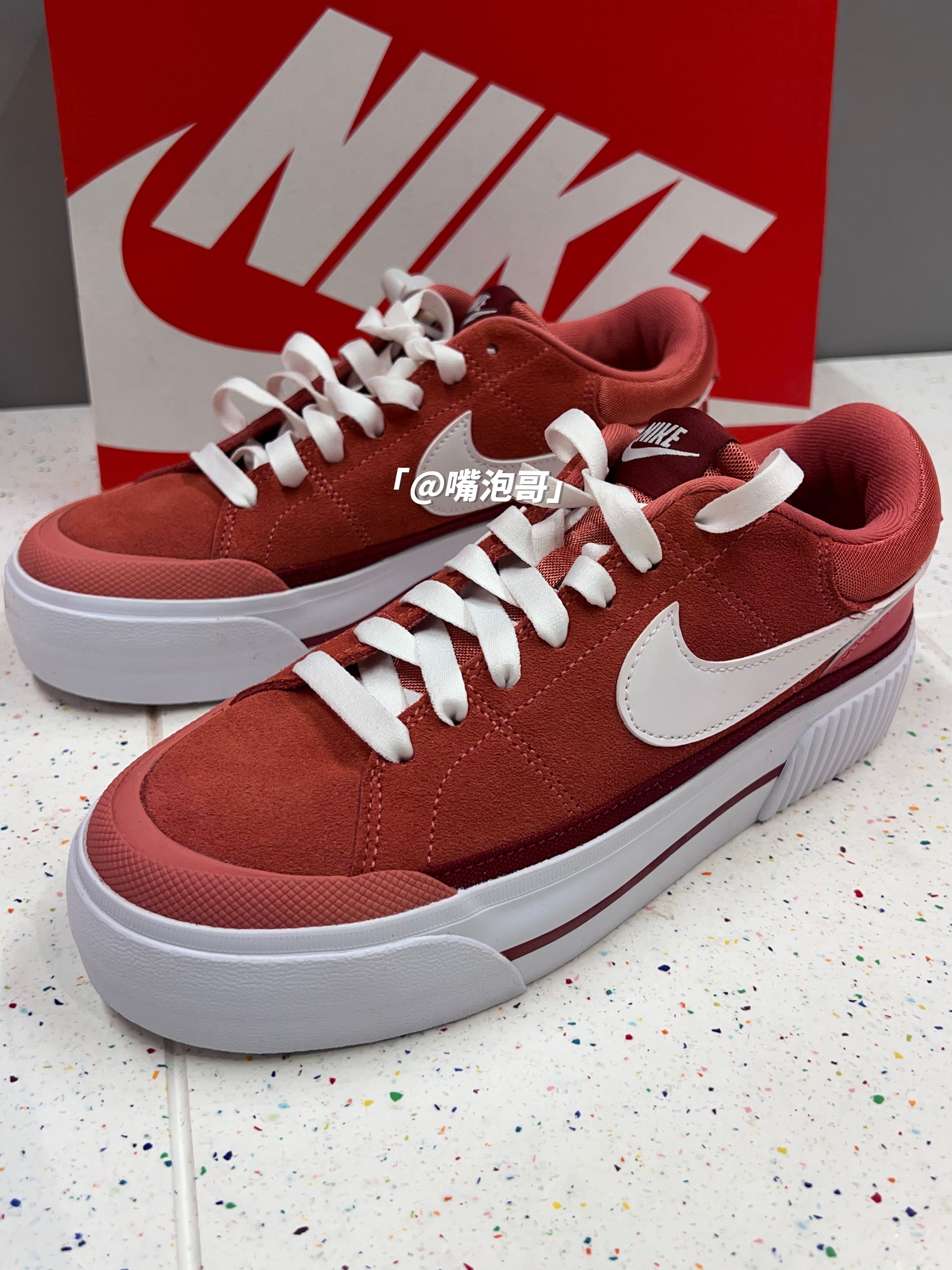 👟:Court Legacy 红色 简介: 鞋款从外观就能辨别出来是一双厚底增高的板鞋,整双鞋子用了红色作为主色调,同时又使用白色相搭配,穿搭起来比较亮眼,鞋面运用的麂皮,又使质感提升。 细节: 鞋面大面积采用麂皮材料制作,同时在后跟位置又加入了帆布及光面皮革,使鞋面具有层次感,两侧的swoosh选用了白色皮革打造,与红色鞋面对比鲜明,鞋舌采用织物帆布,保证了透气性,中大底是加厚的设计...