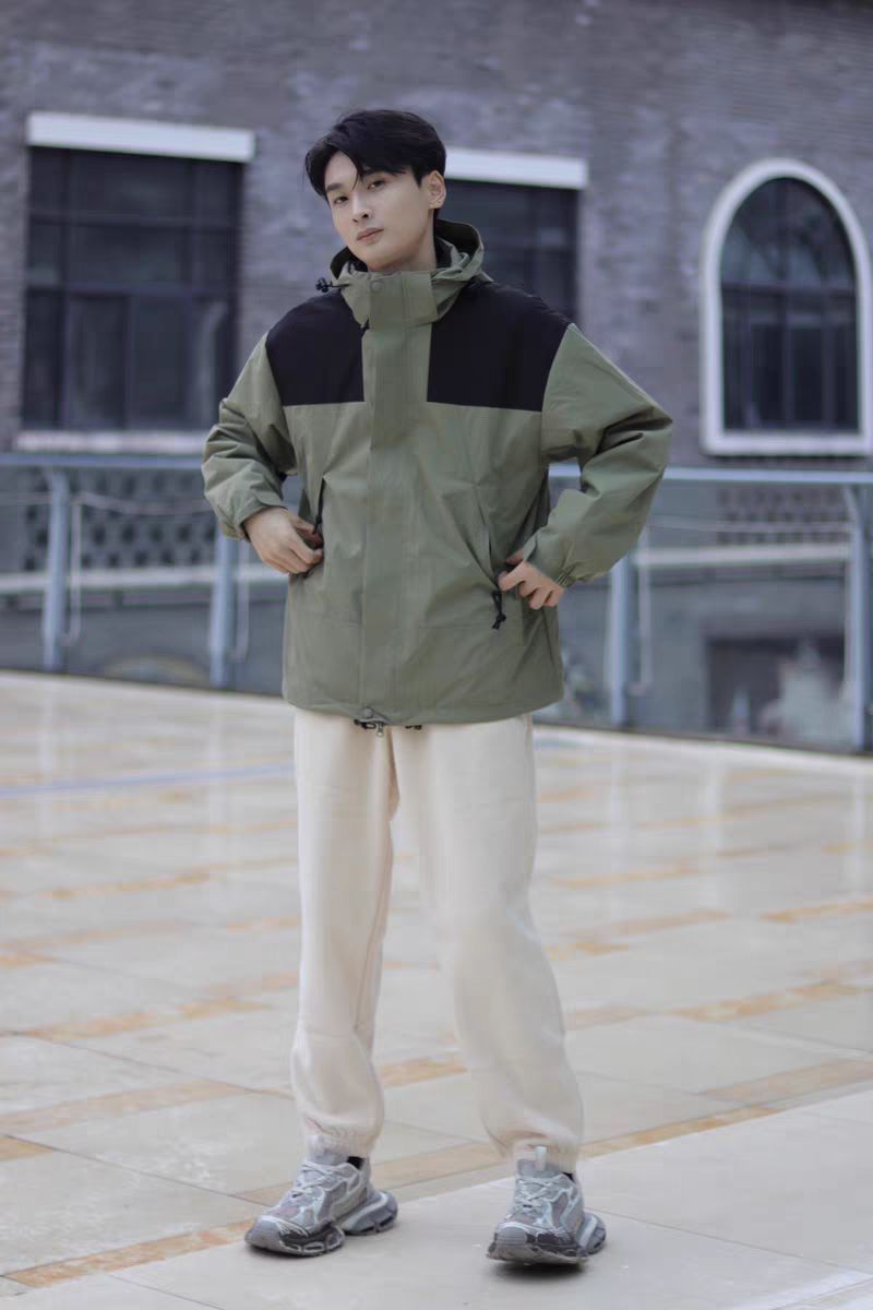 快来喊你男朋友过来抄作业了! 军绿色冲锋衣搭配米白色束脚运动裤,不要太帅了!裤子版型偏直筒修身,很显腿直,上身效果非常好,显得人挺拔精神 内里加绒,零度左右的天气都可以不用穿秋裤啦 价格:129元,学生党,上班族都可以看看这条裤子哦
