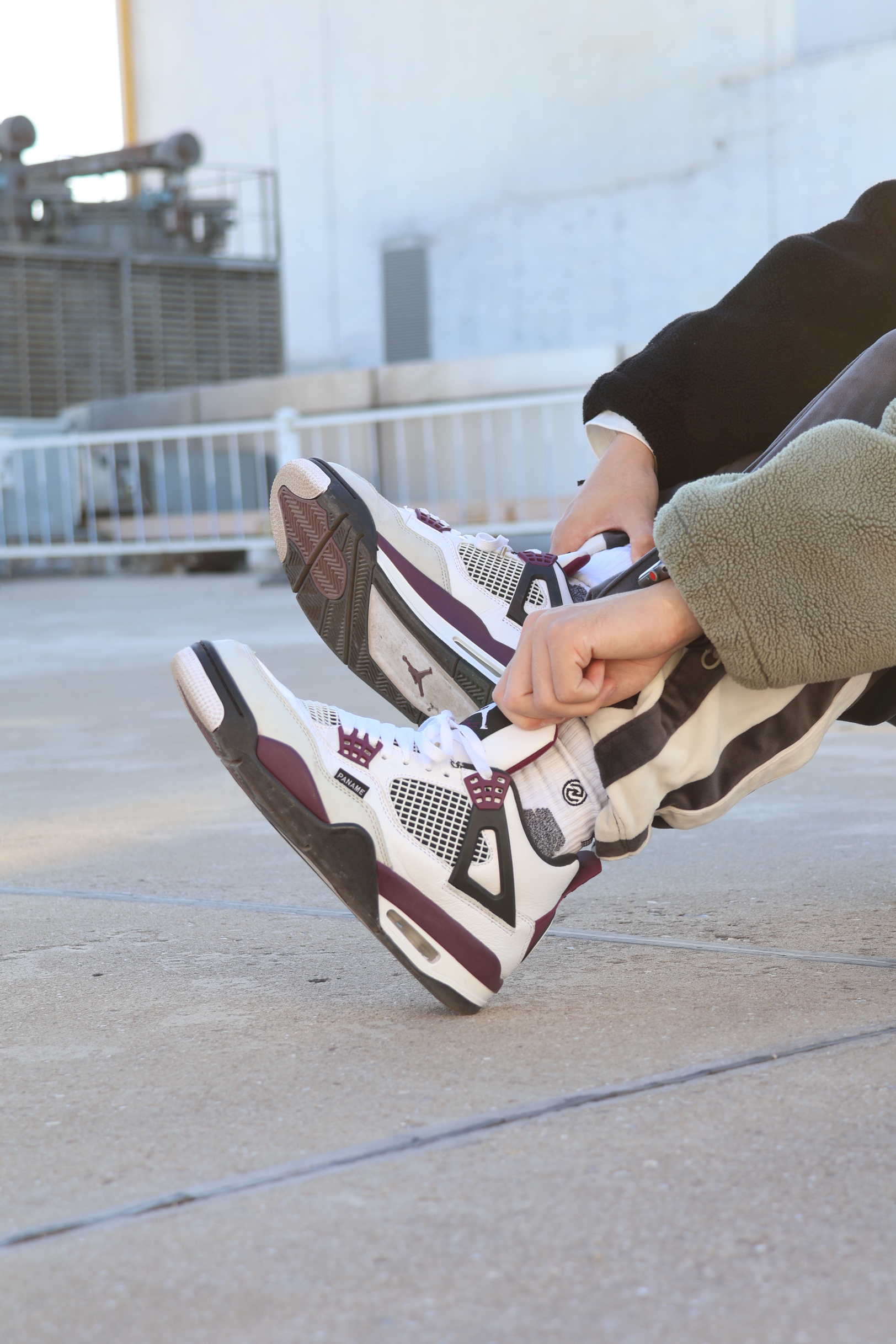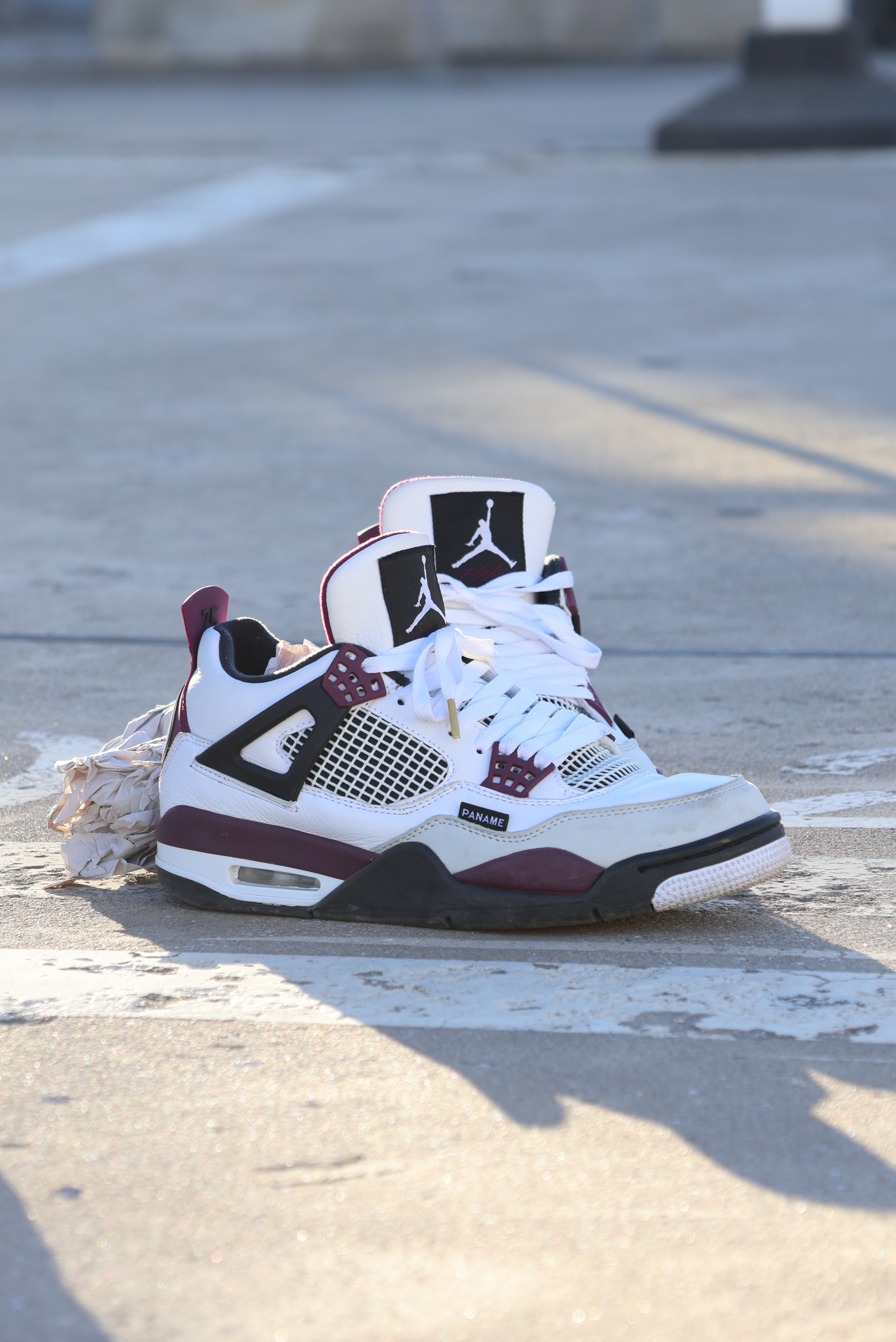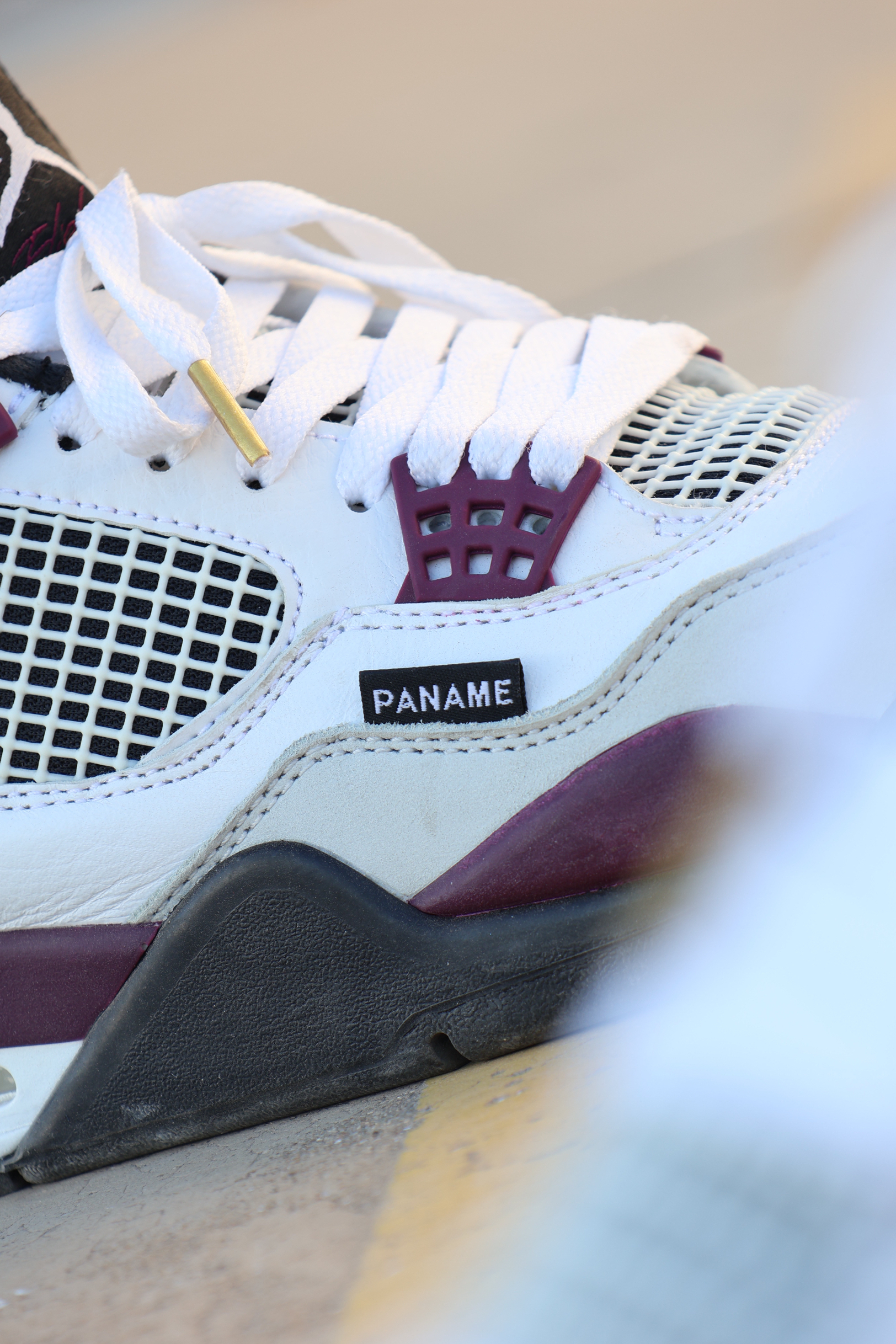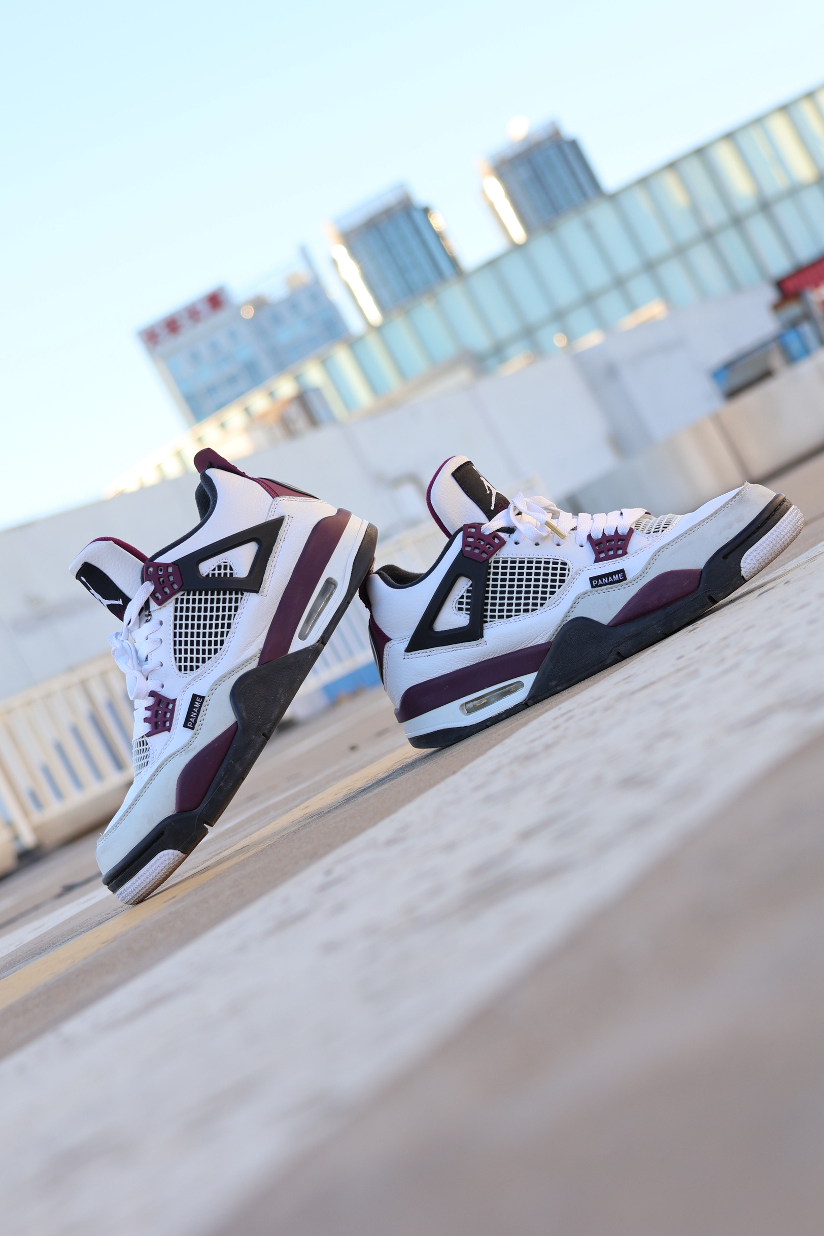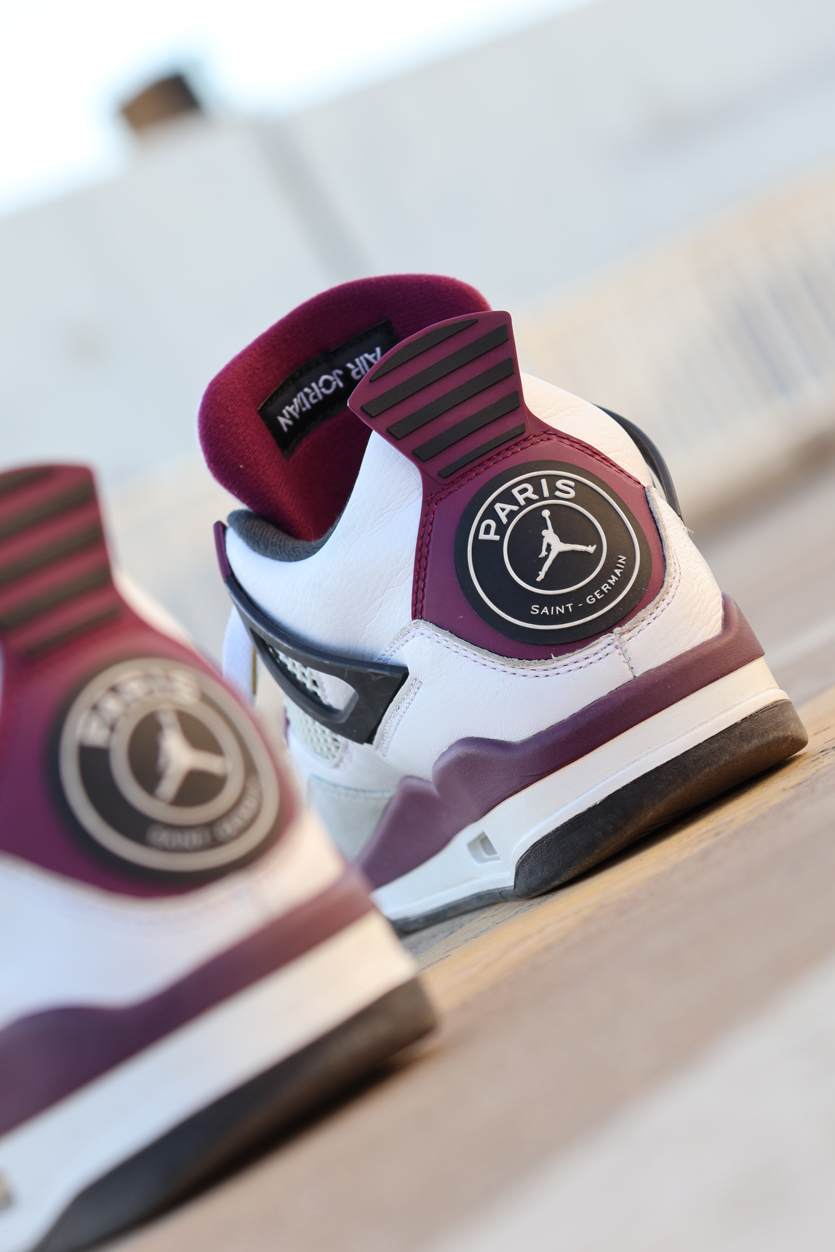 Air Jordan 4 Paris Saint-Germain 大巴黎!🗼 Aj4联名大巴黎,去年发售的很有设计的一双! 个人感觉从色彩到皮质变化都是可以的! 鞋身白色头层皮加米白色翻毛皮! 颜色换上了波尔图红色调的紫红色! (逼疯我一个严重色弱的人)说错了别骂我! 但是不管怎样很好看很好看! 侧面PANAME!PANAME! 后跟这一块,沿袭5和6的大巴黎队标!