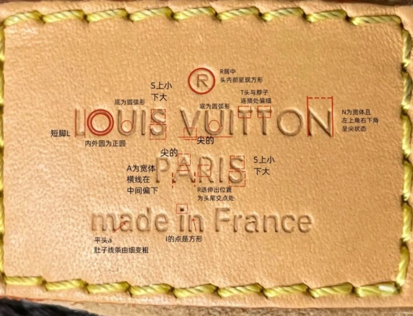 LV的logo在LV品牌鉴定当中具有举足轻重的分量。今天就在这里为大家详细的分析LV皮标logo的详细鉴定细节。 首先看到LV的皮标分为四排,每一排的字体都是经过LV特殊设计的字体。这里进行拆解后逐步分析。 1、第一排:第一排很简单,R标R居中,R头部内不呈现一个大致的矩形形状。 2 、第二排:第二排的知识点比较多。需要进行在拆分去学习。OL字母的脚与正常字母比起来是比较短的。LOUIS和VUIT...