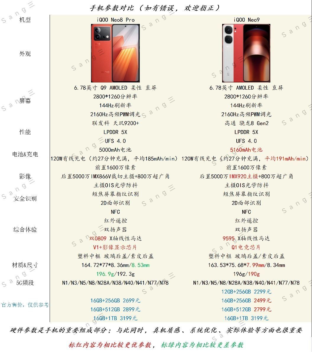 ☞#手机对比# ——Neo8 Pro🆚Neo9☜ 【#iQOO Neo8# Pro】 双X轴线性马达、V1+影像显示芯片…… 【#iQOO Neo9# 】 更大的电池容量、更快的充电速度、更好的后置主摄镜头、更好的线性马达、Q1电竞芯片、更薄及更轻的机身、更低的官方售价…… 【二者的相同之处】 屏幕尺寸、柔性直屏、分辨率及刷新率、高频PWM调光、内存及储存规格、前置相机、后置超广角镜头、防抖...