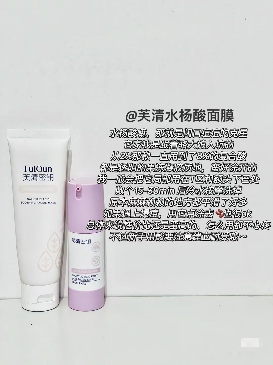 本篇笔记关联了FulQun/芙清 水杨酸祛痘焕肤涂抹面膜 控油去角质 经典版、Alpha Hydrox 阿尔法果酸洗面奶 洗卸合一 177ml/瓶、FulQun/芙清 水杨酸果酸祛痘控油闭口Plus面膜 去角质清洁痘痘 8%进阶-酸酸管plus等商品,为用户提供真实的使用体验和购买参考。