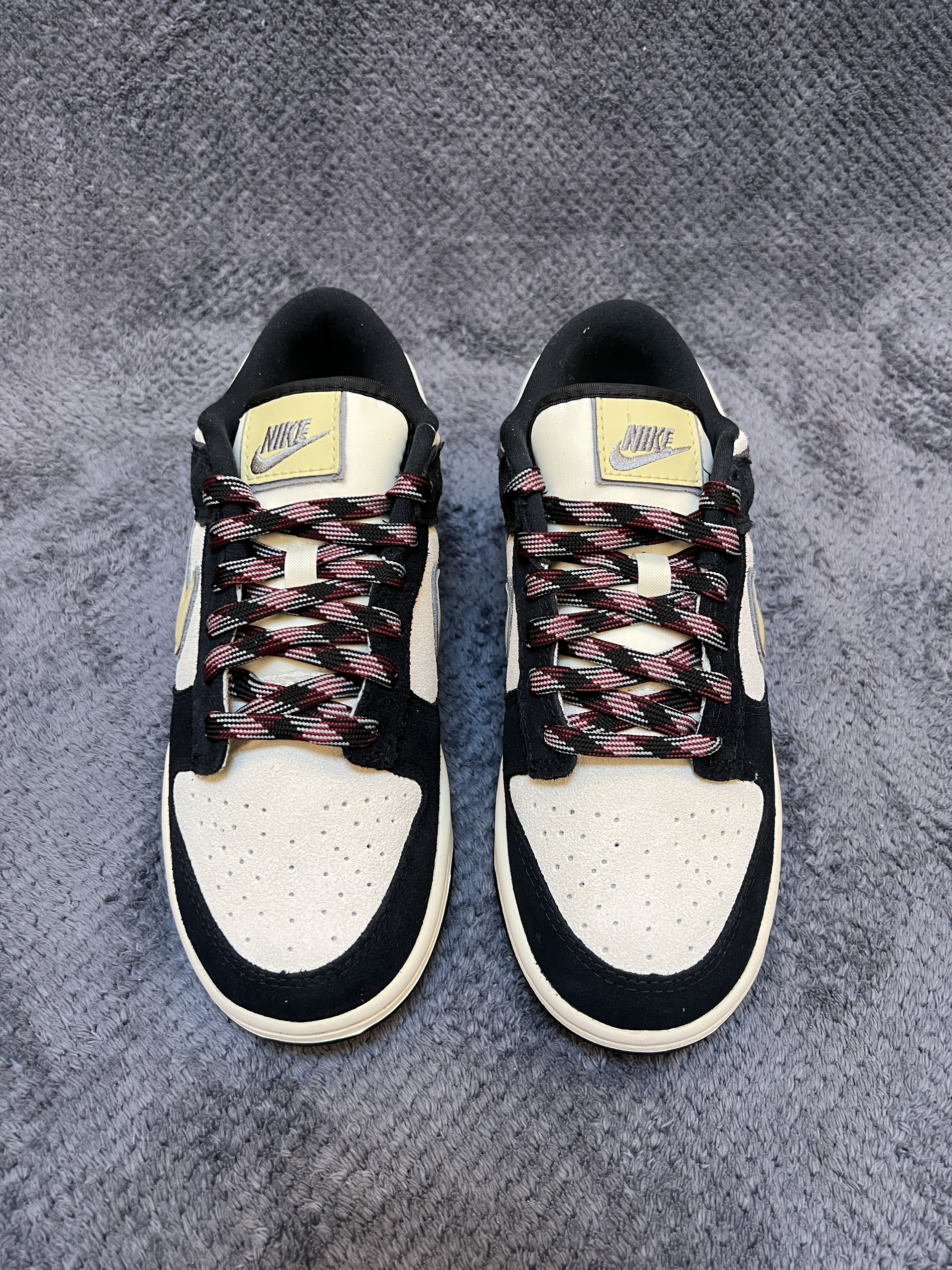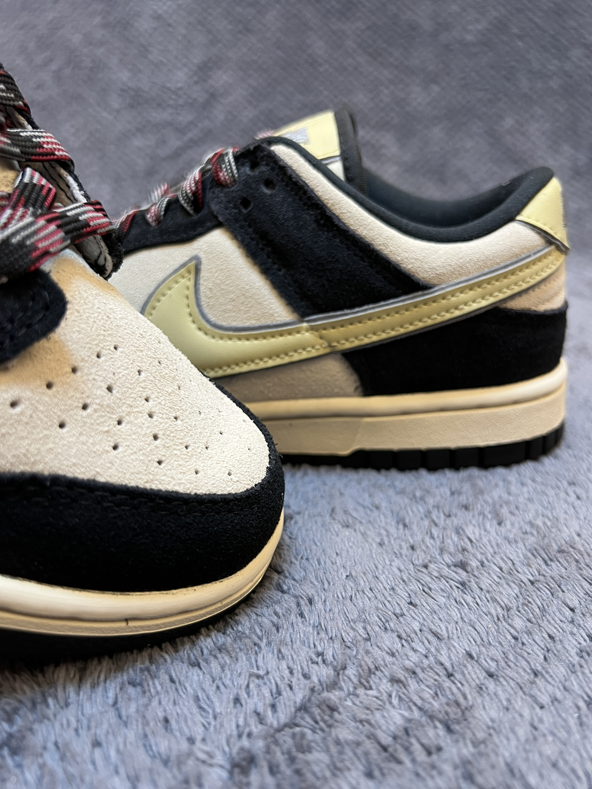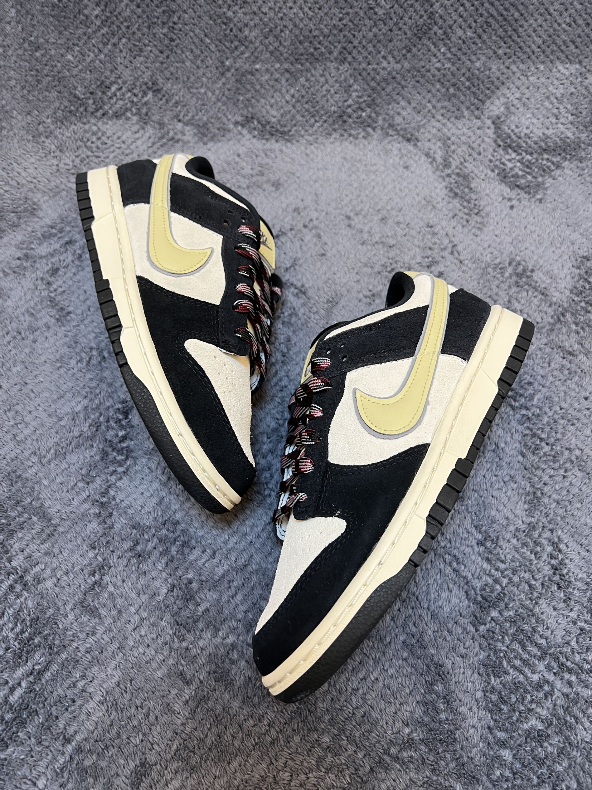 🤔🤔🤔又是一双百搭dunk,质感还很不错 🍀🍀🍀这双奶黑熊猫dunk配色上鞋面为米白色,框架为黑色。侧面swoosh为淡黄色延伸到后跟。中底米黄,大底黑色。配色好看,上脚百搭 🍀🍀🍀材质方面:鞋身以牛皮革材质为主,做成了麂皮状。上脚舒适有质感。不过麂皮材质在打理方面不如皮革,特殊天气穿搭需注意。脚感方面无特殊,就是普通dunk脚感 🍀🍀🍀尺码方面:dunk鞋型板正,不偏码,正码购买就行